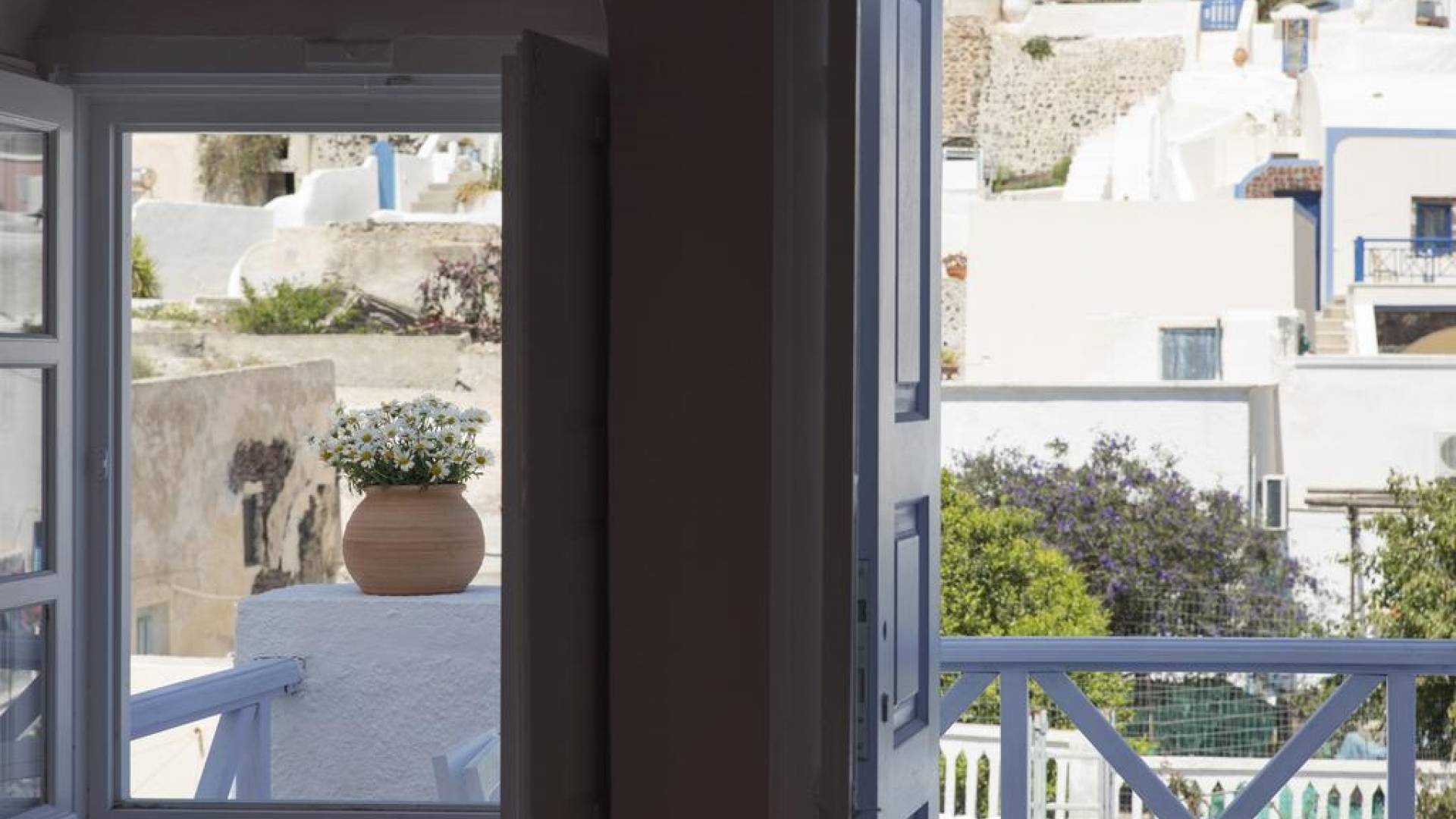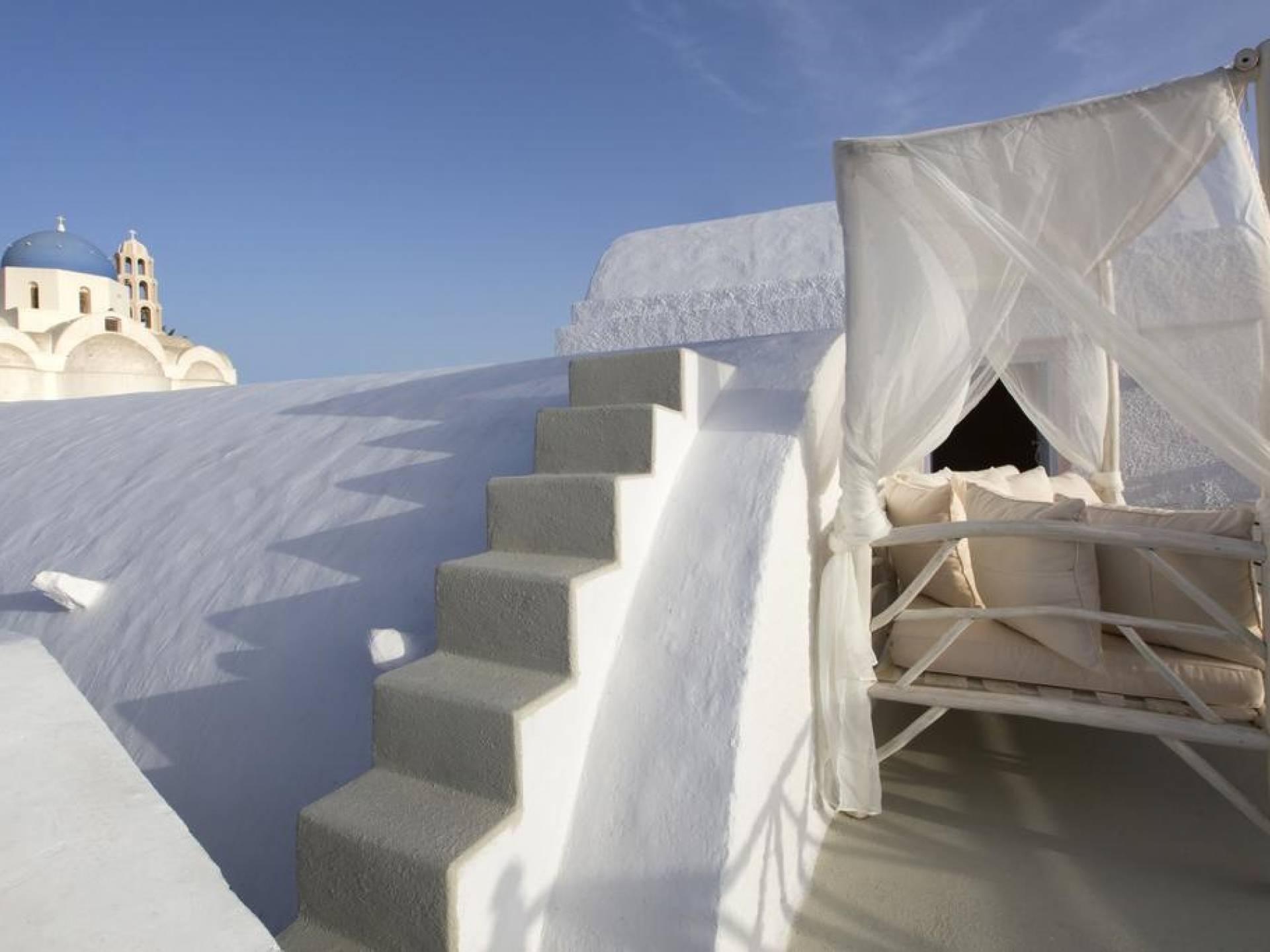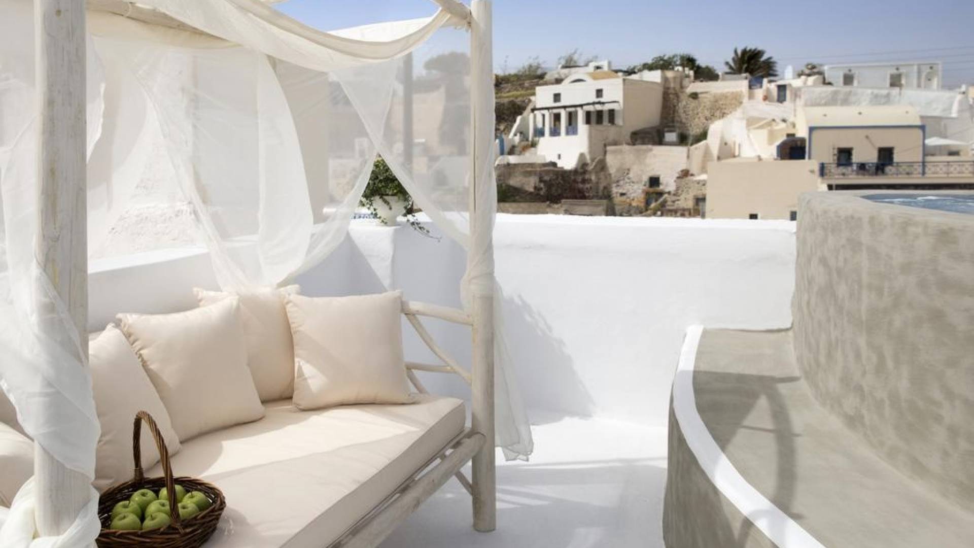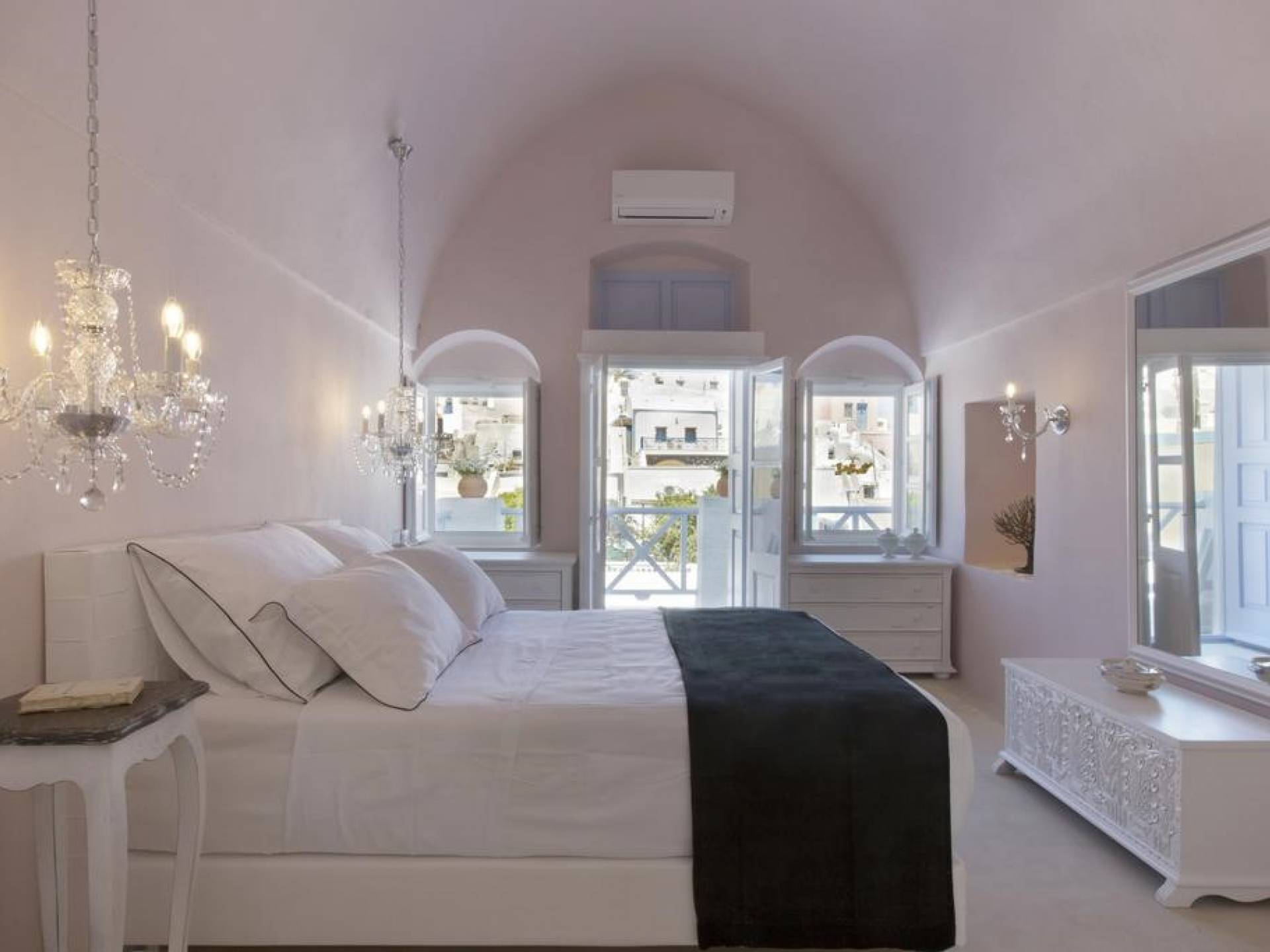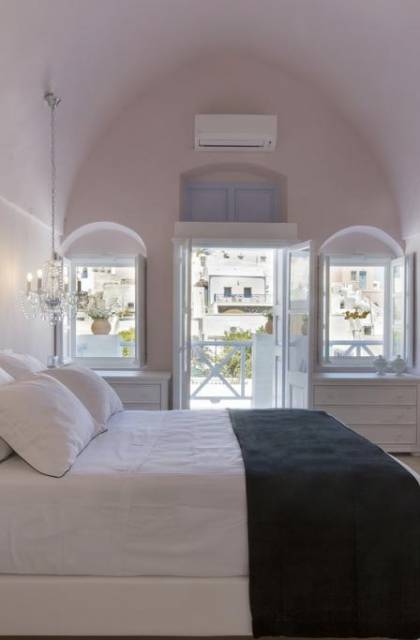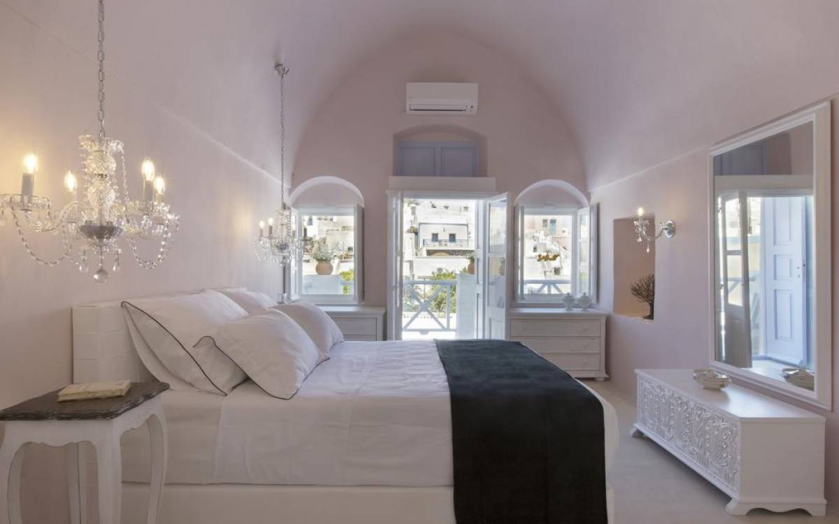 The Pink Residence accommodates up to 6 persons over two levels, with one main entrance on the lower floor. Interior decoration combines antique furniture with modern amenities and romantic lighting. At night, the residence transforms into a private heaven under the stars, amidst scenic night views of the village, illuminated church domes and romantic sea views of the aegean far in the distance. The residence is accustomed for all seasons.