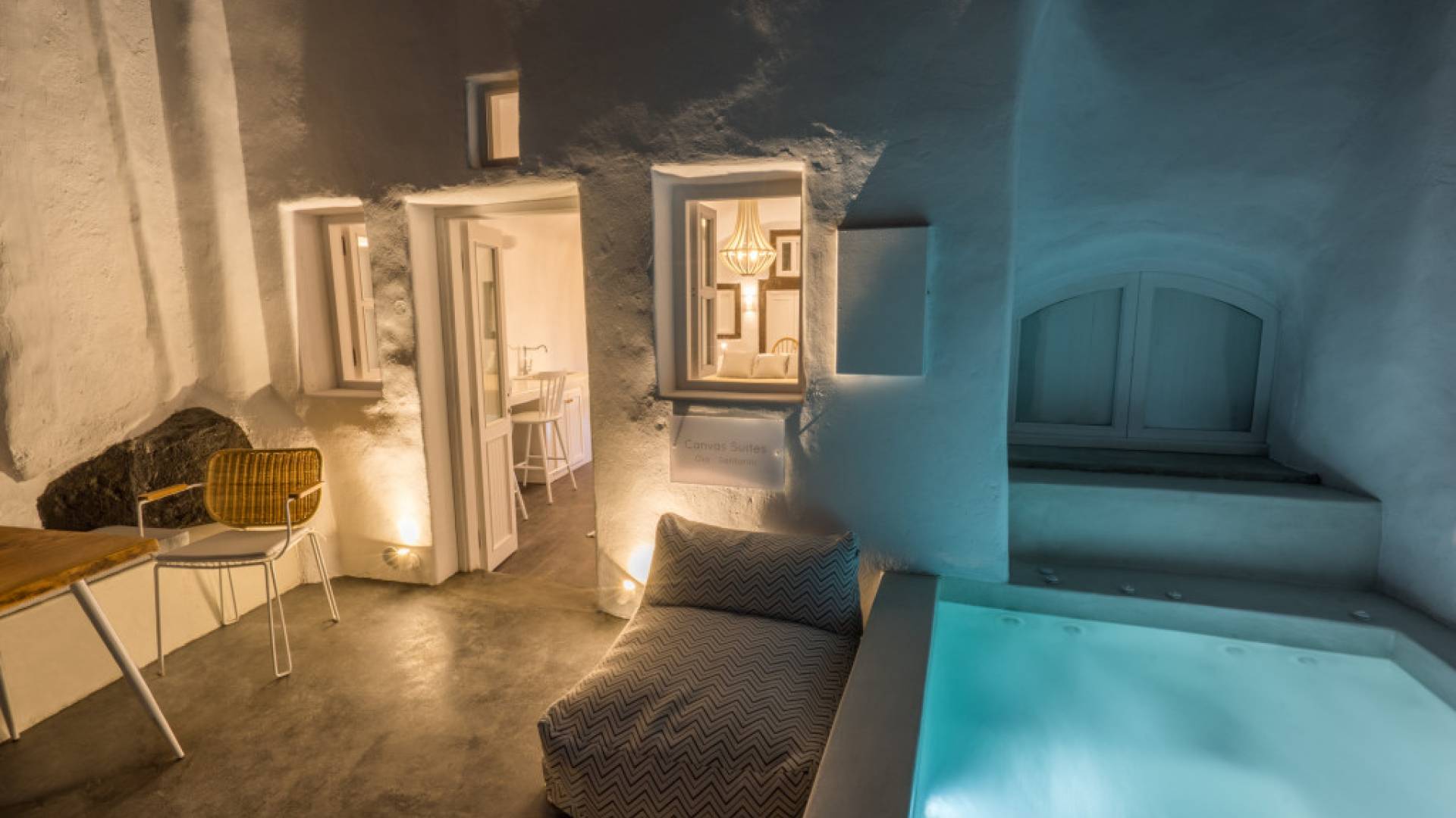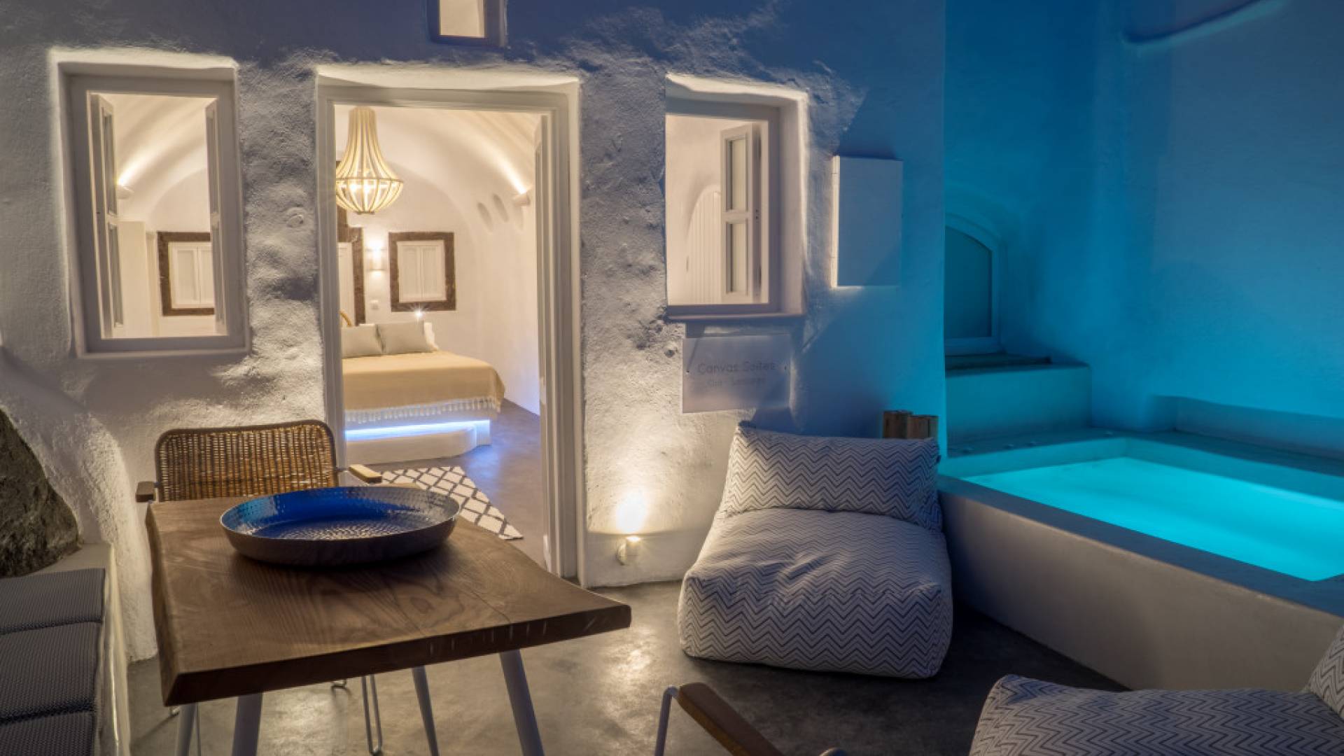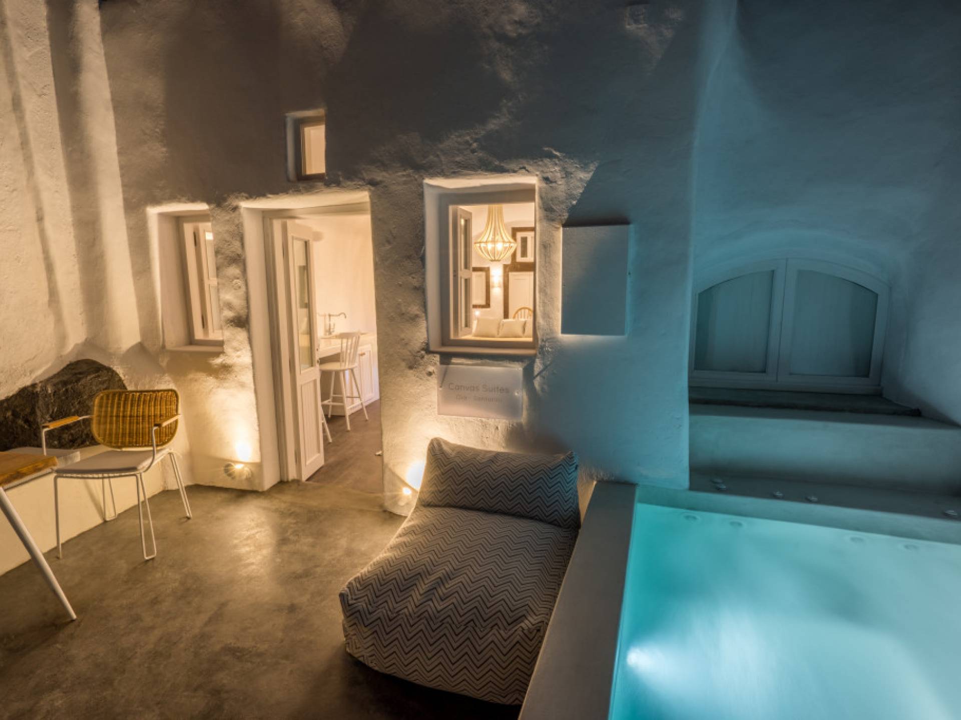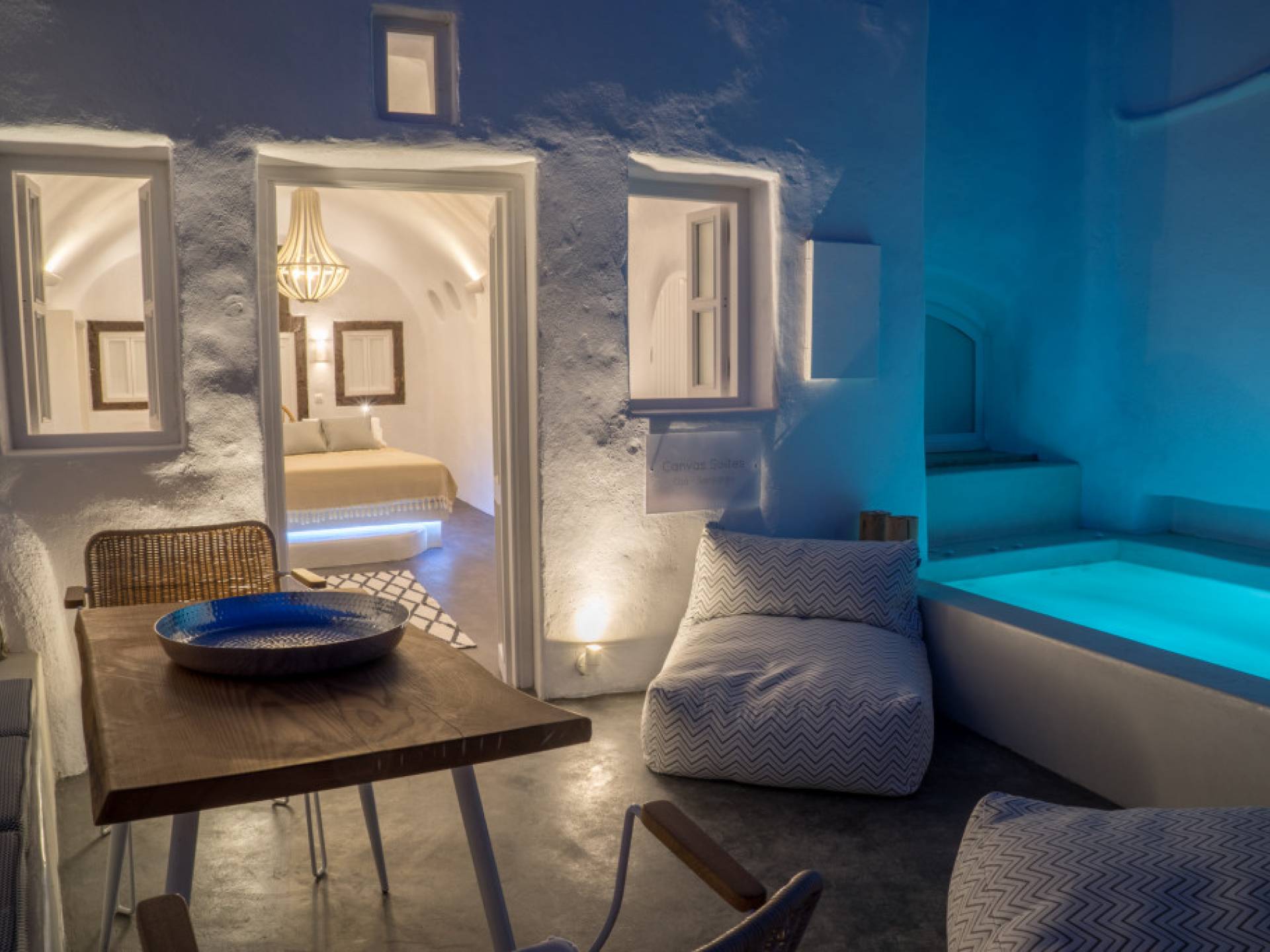 Canvas Suites in the Caldera of Oia Santorini offer minimalist luxury accommodation surrounded by the world-famous breathtaking views of the island. Canvas Suites is a complex of 7 Luxury Suites, built according to the traditional Cycladic architecture, providing comfort, functionality, discretion, while respecting the environment. Hanging on the famous caldera cliff of Oia, all Suites are perfectly orientated to the Aegean Sea, overviewing the Volcano of Santorini.