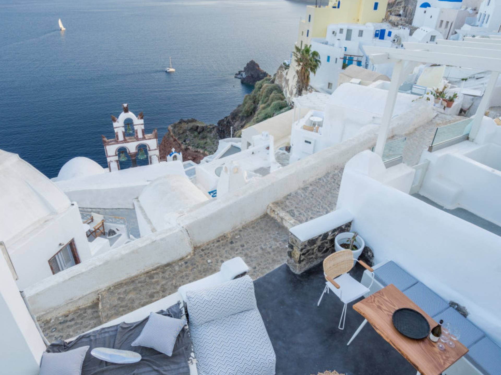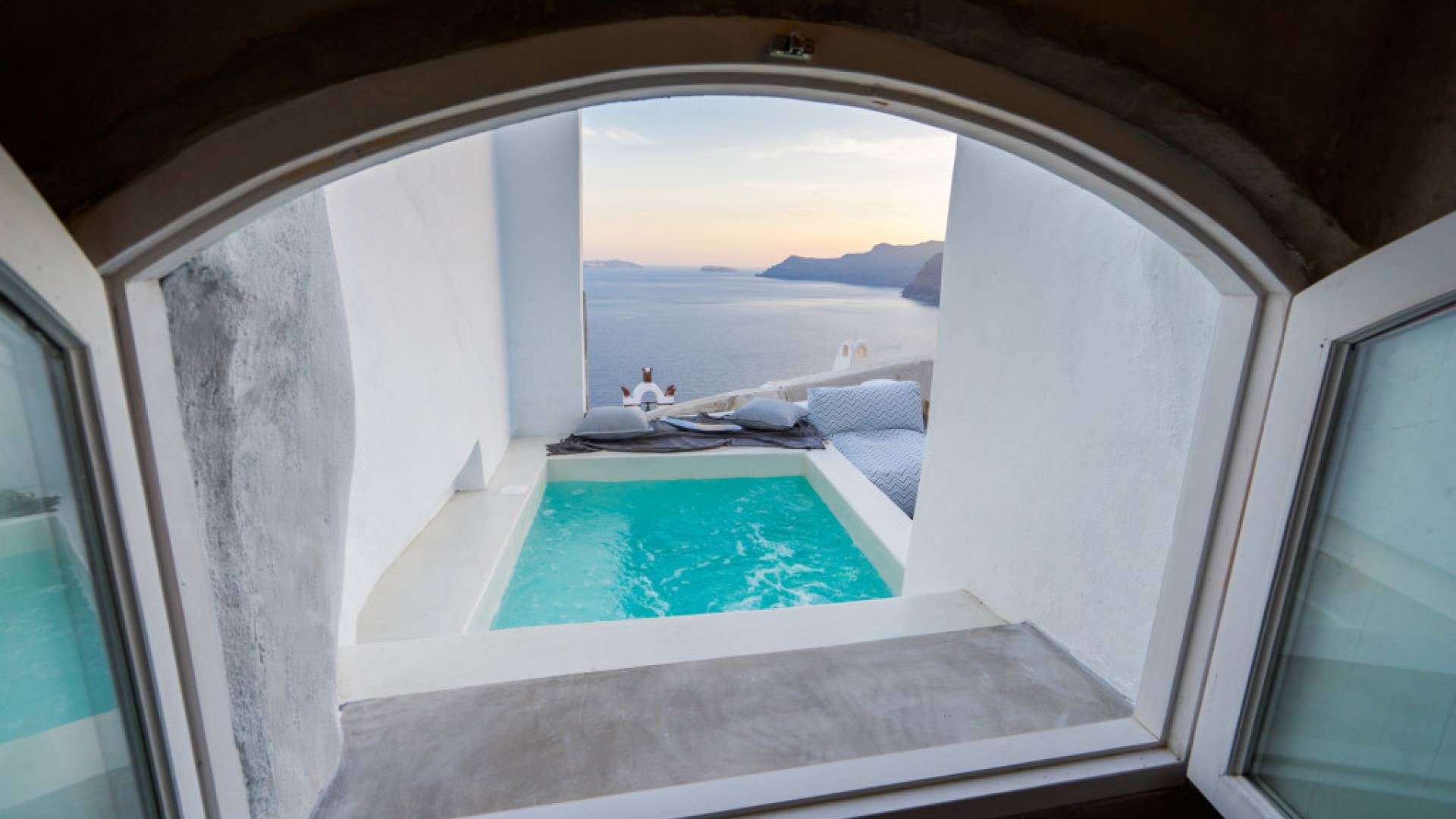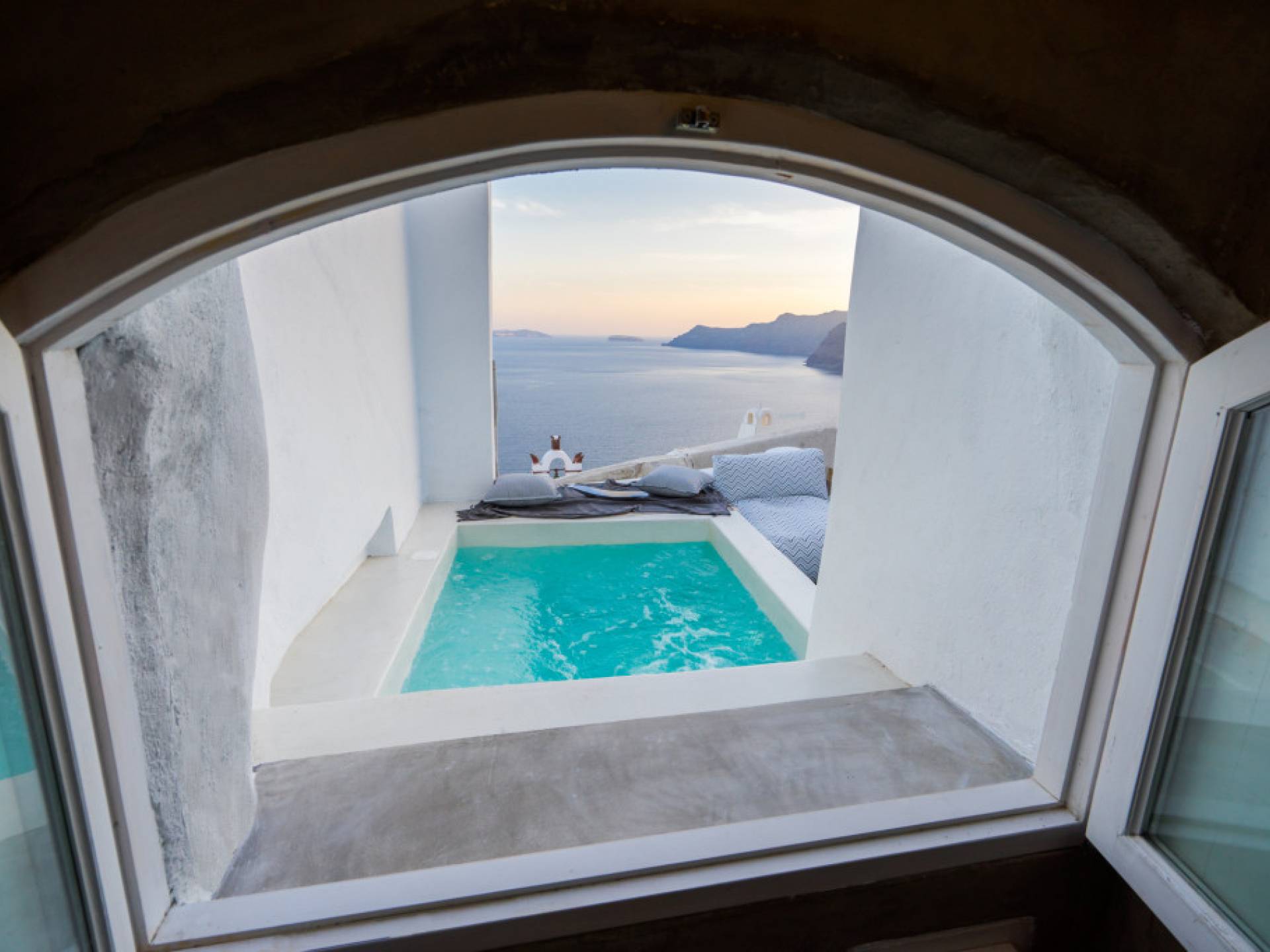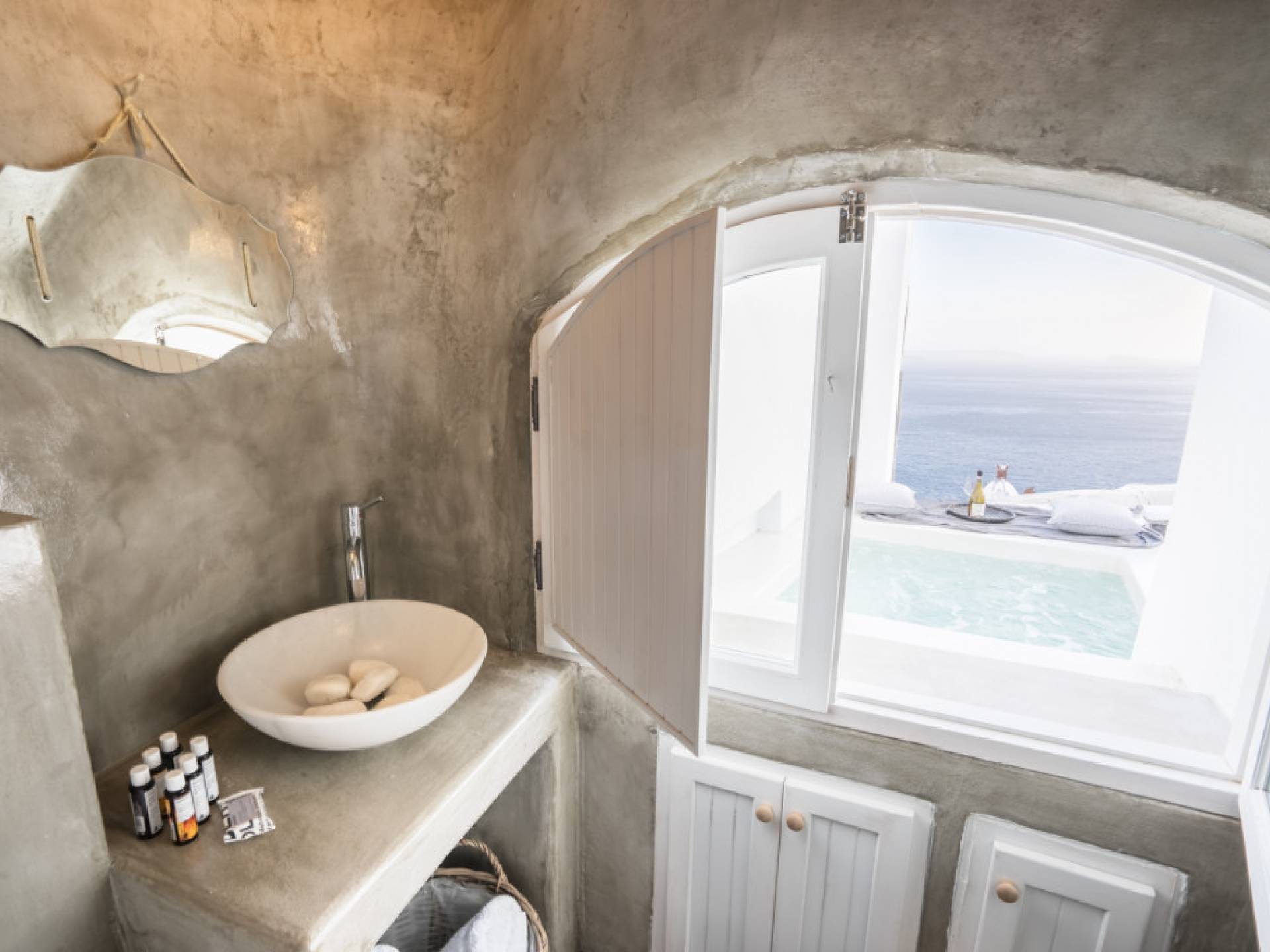 Canvas Suites in the Caldera of Oia Santorini offer minimalist luxury accommodation surrounded by the world-famous breathtaking views of the island. Canvas Suites is a complex of 7 Luxury Suites, built according to the traditional Cycladic architecture, providing comfort, functionality, discretion, while respecting the environment. Hanging on the famous caldera cliff of Oia, all Suites are perfectly orientated to the Aegean Sea, overviewing the Volcano of Santorini.
