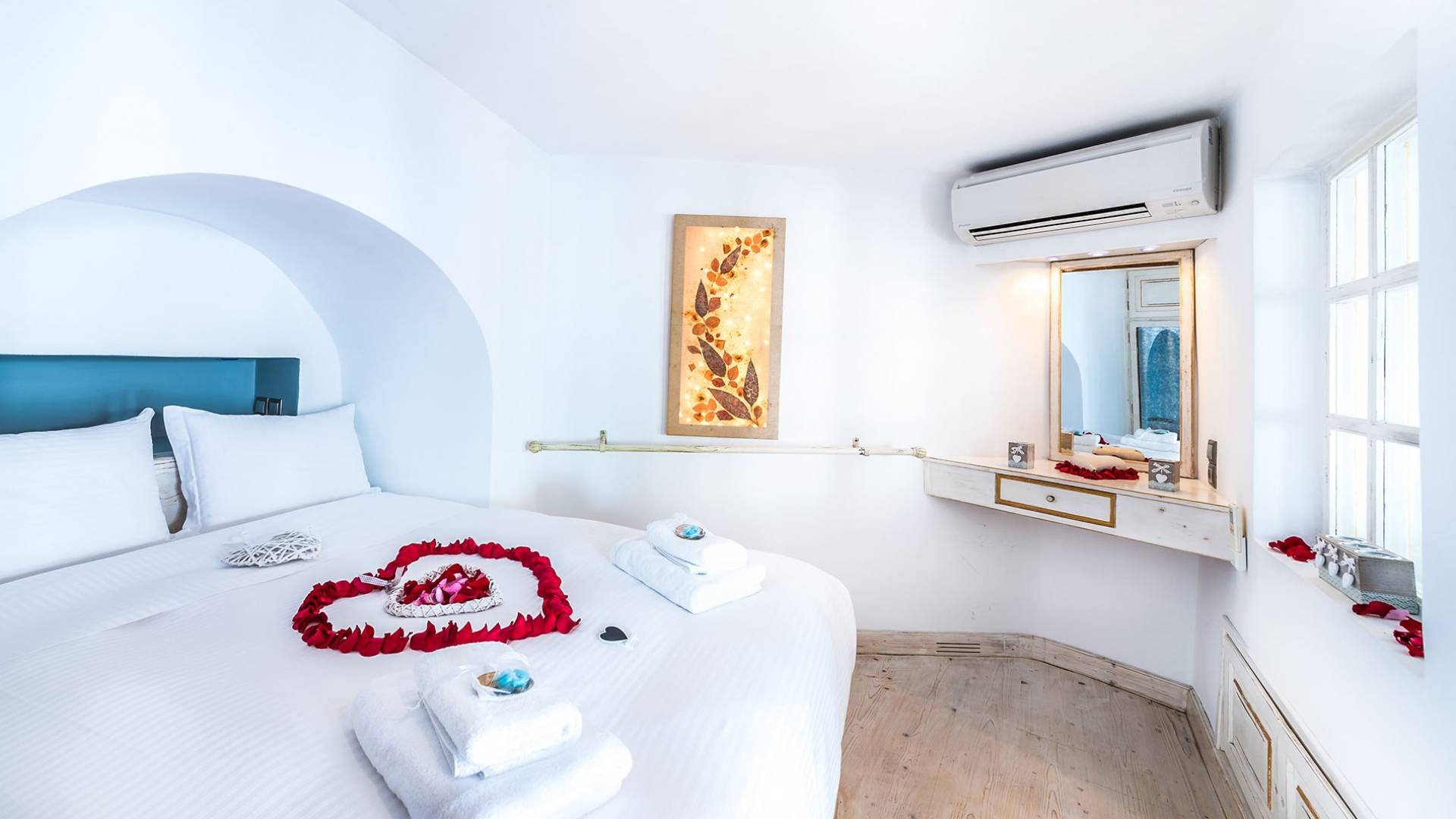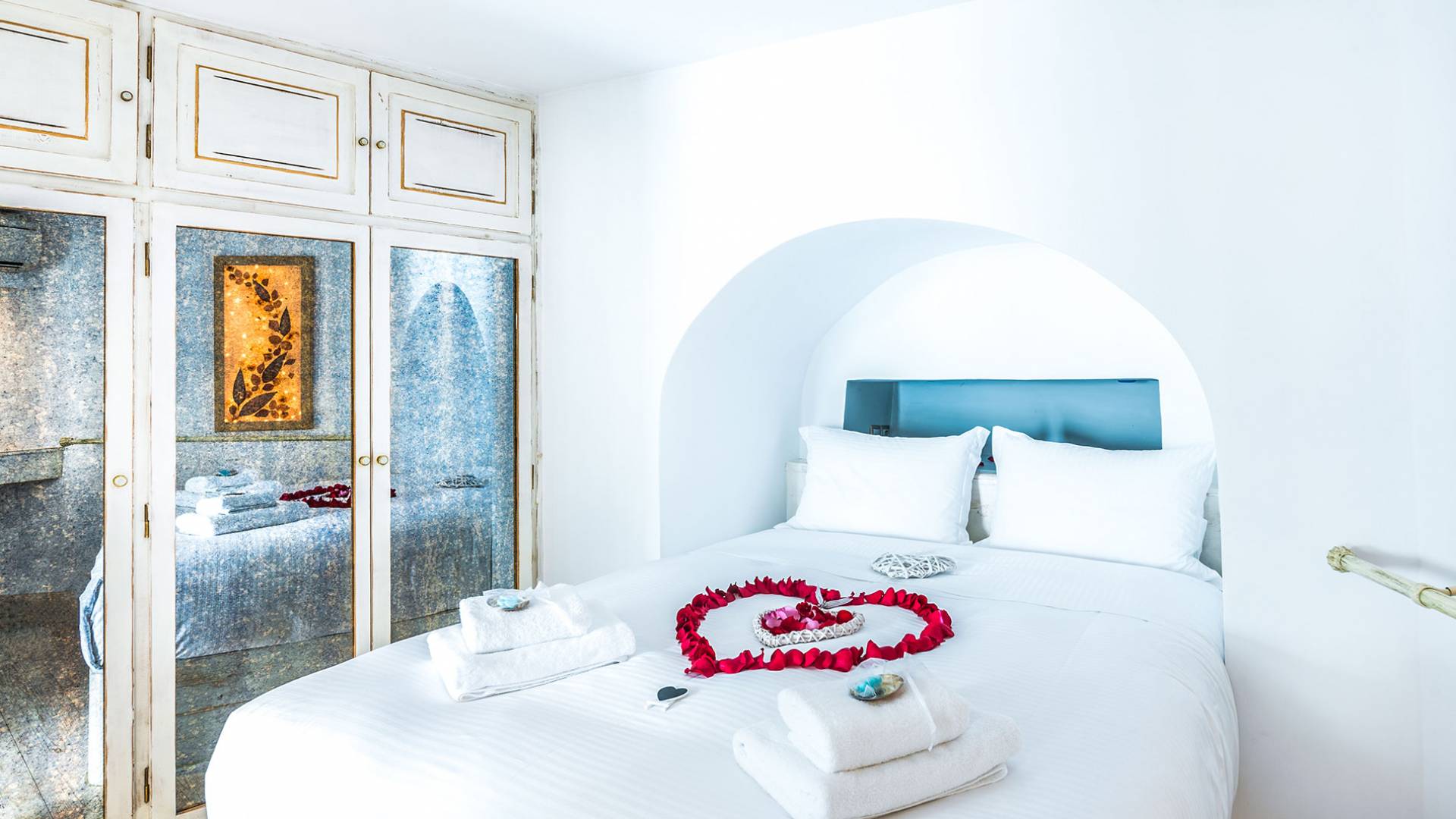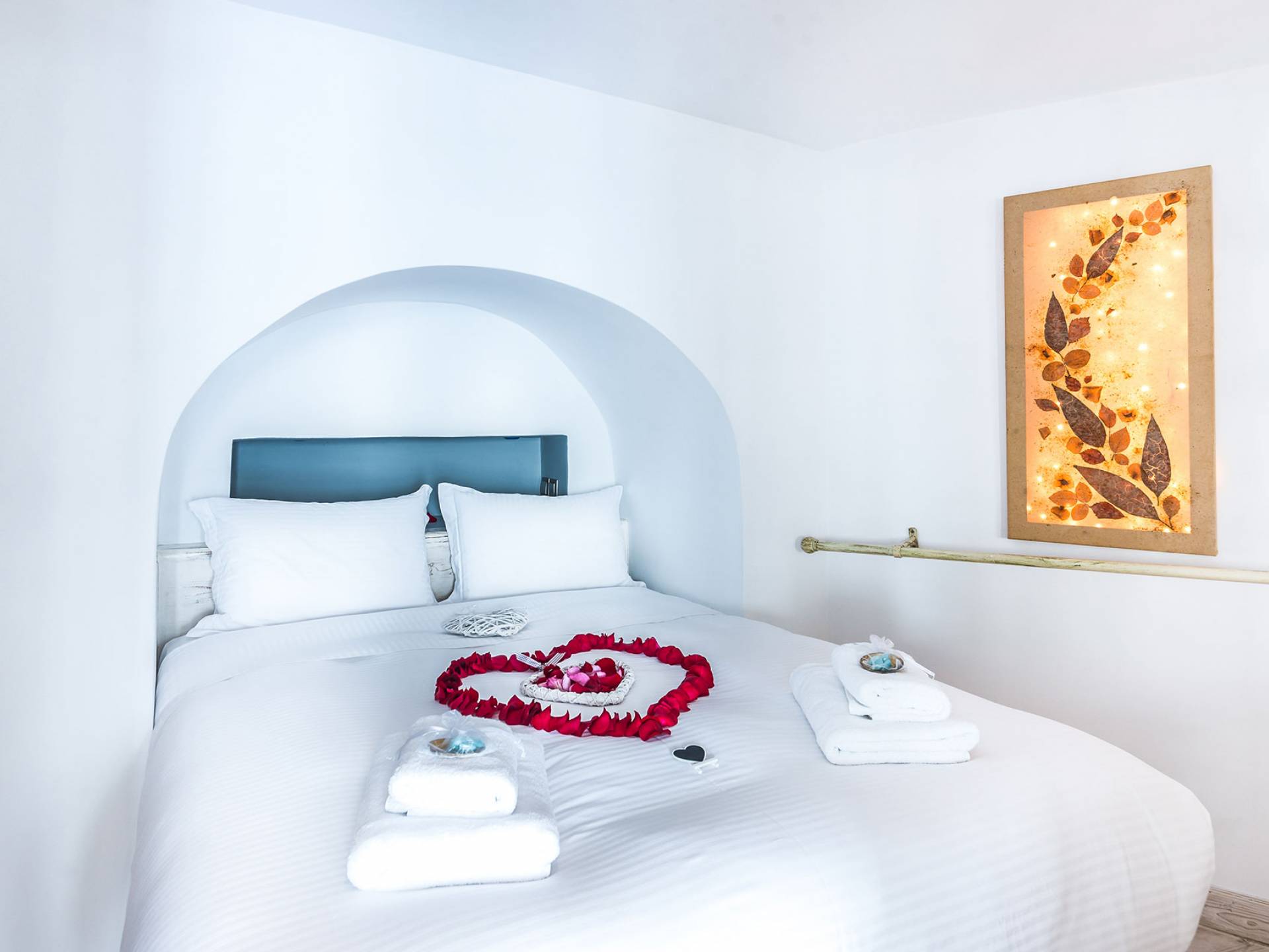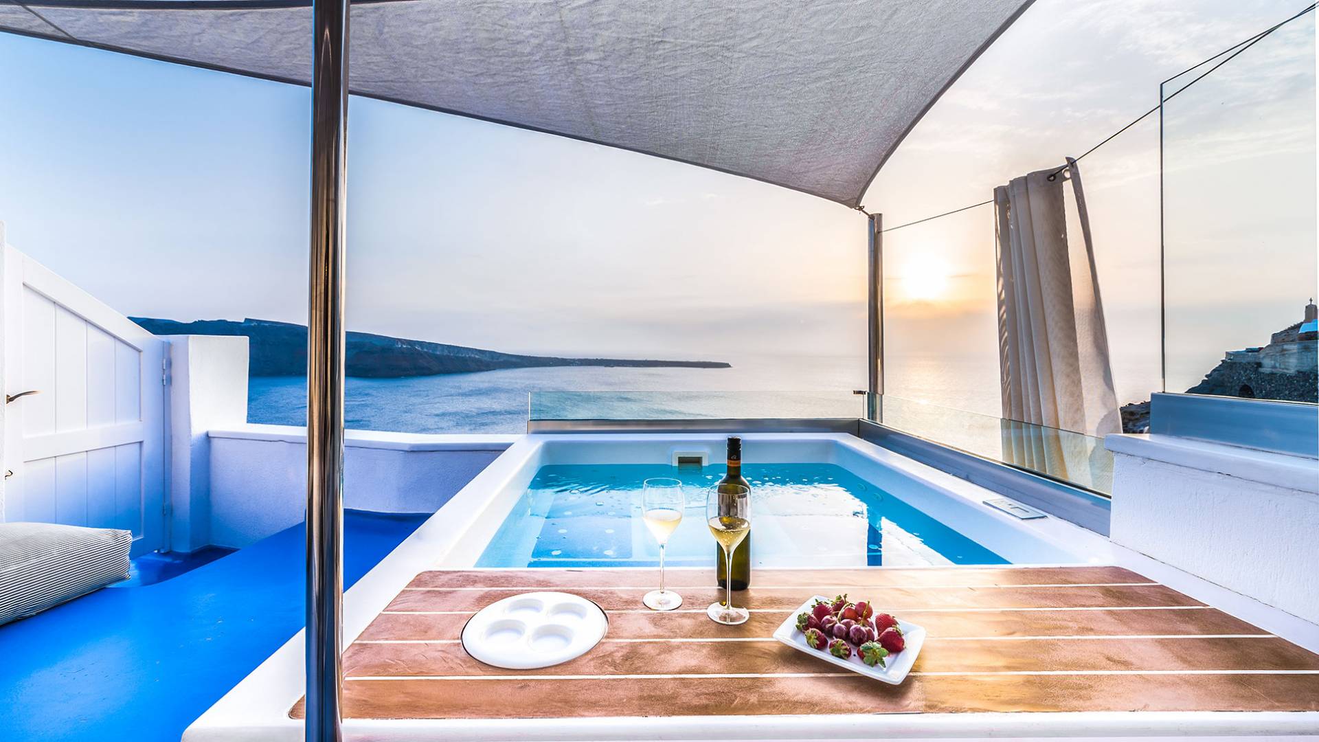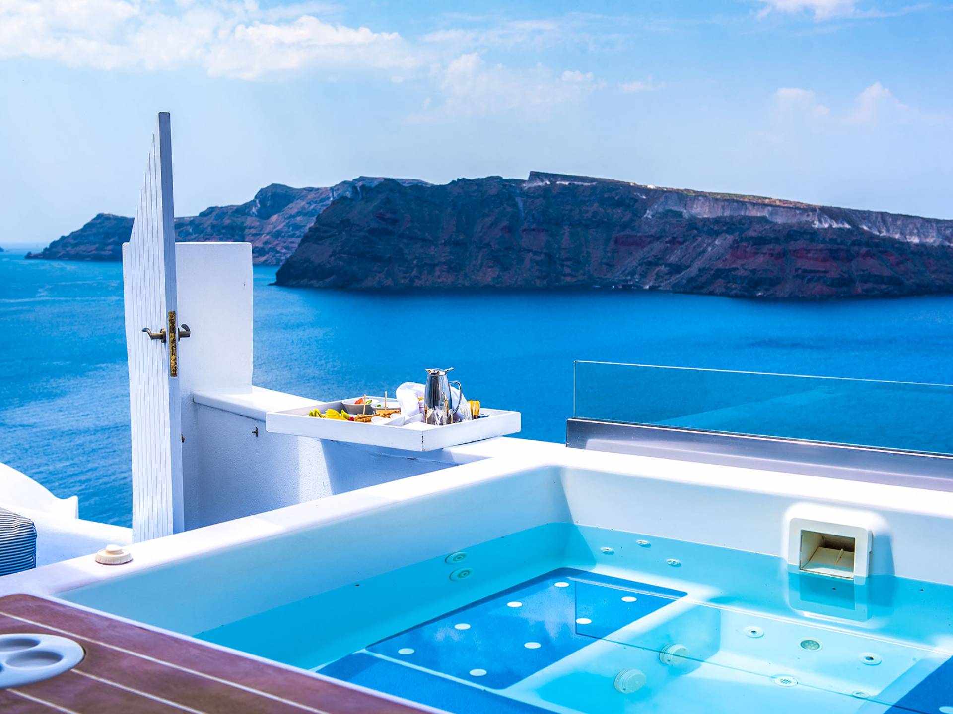 Honeymoon Villa Selini was specially designed for the most romantic time of your life in mind, your Honeymoon. Located at the original site where the movie «Summer Lovers» was filmed, guests are bound to feel like stars as they enjoy their fantasy holidays. Enjoy the breathtaking view from your large balcony and celebrate the direct sunset view while you soak in your outdoor Jacuzzi, the prime sunset viewing location.