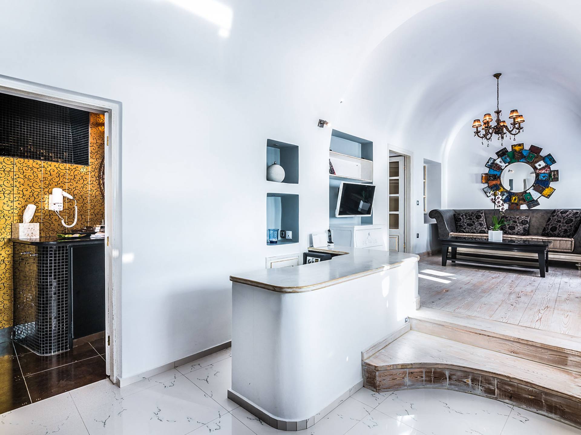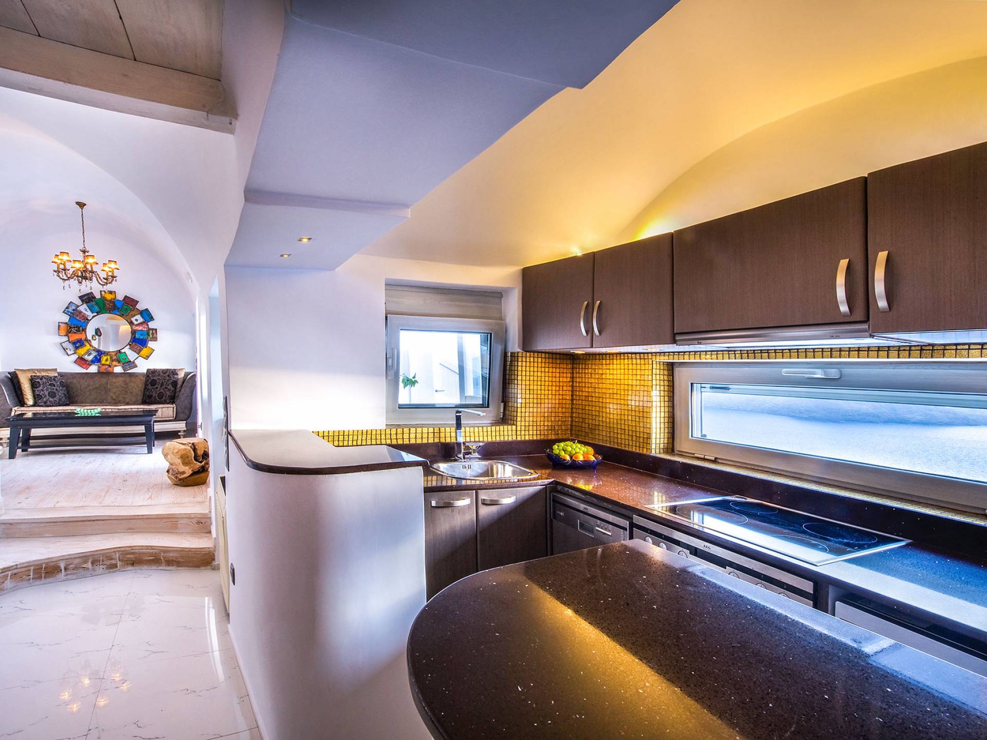 Honeymoon Villa Selini at Hyperion Oia Suites Santorini is a generously spacious villa in Oia facing the sea, Caldera, and a direct sunset view. Located on the Caldera above the picturesque perfect Ammoudi Bay, in a privileged location to watch the sunset and away from the crowds. Due to its privileged location on the edge of the cliff under the picturesque windmills, the Honeymoon Villa features a spacious balcony with an outdoor Albatros Jacuzzi, a spacious living area and dining area, kitchen, bedroom, and spacious, luxurious bathroom.