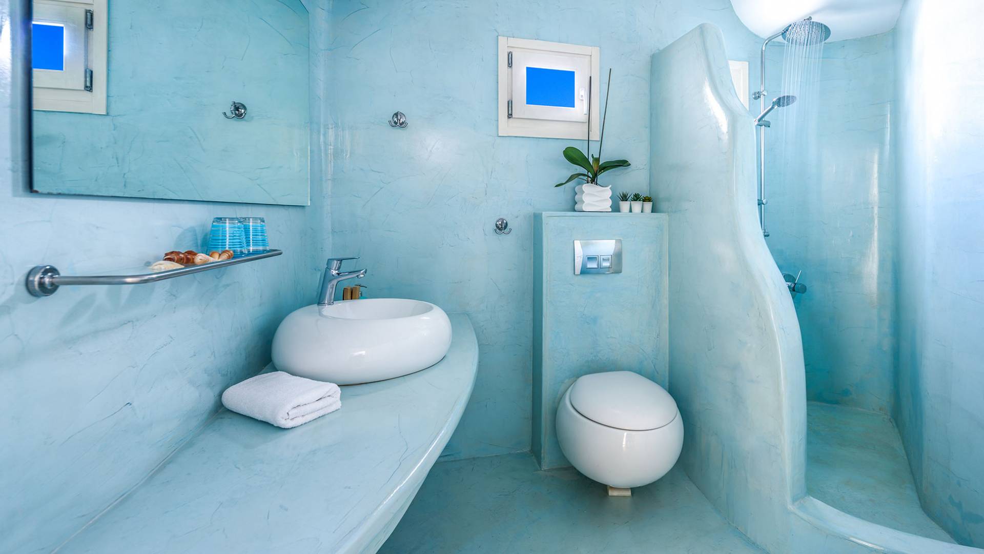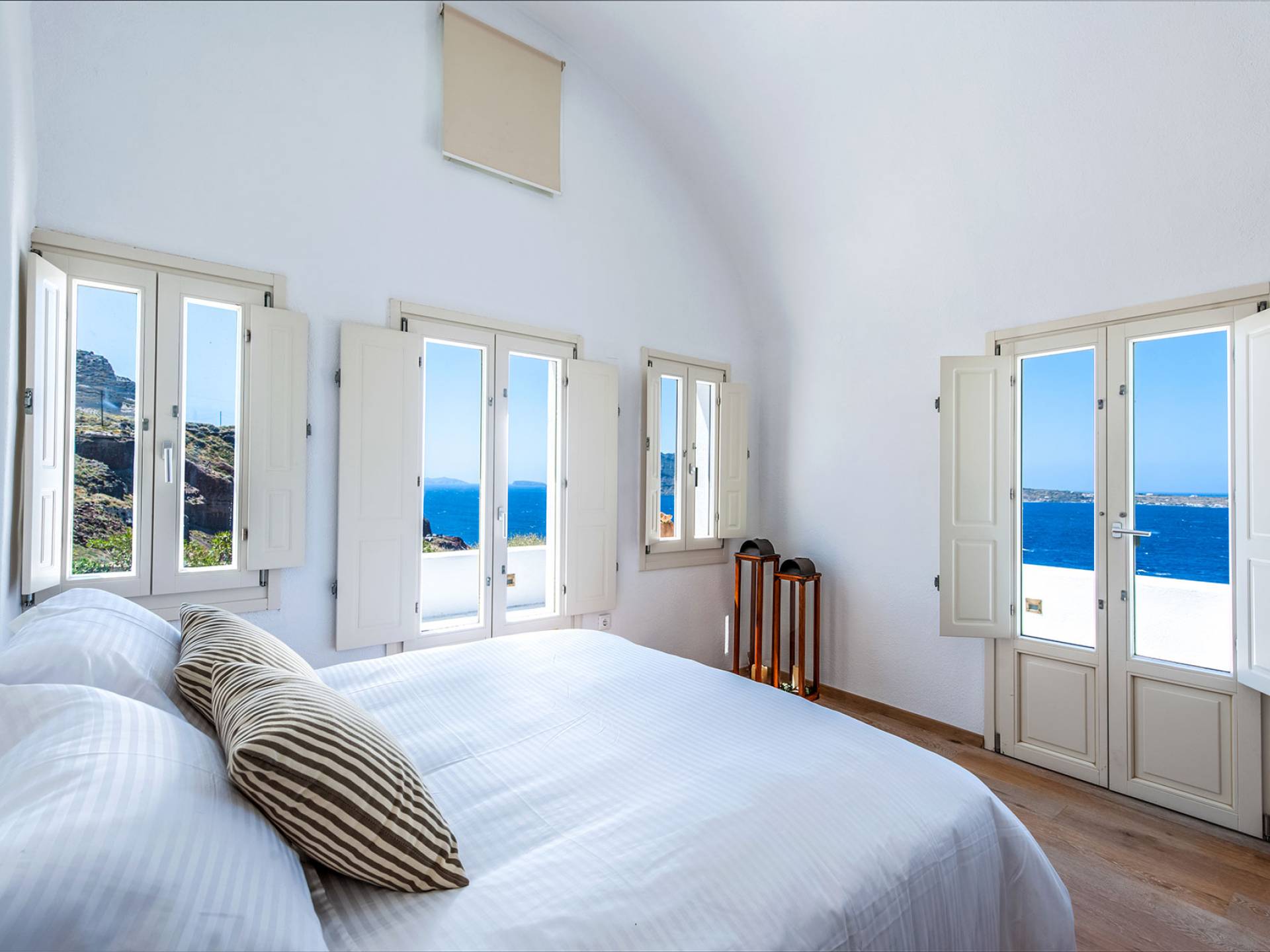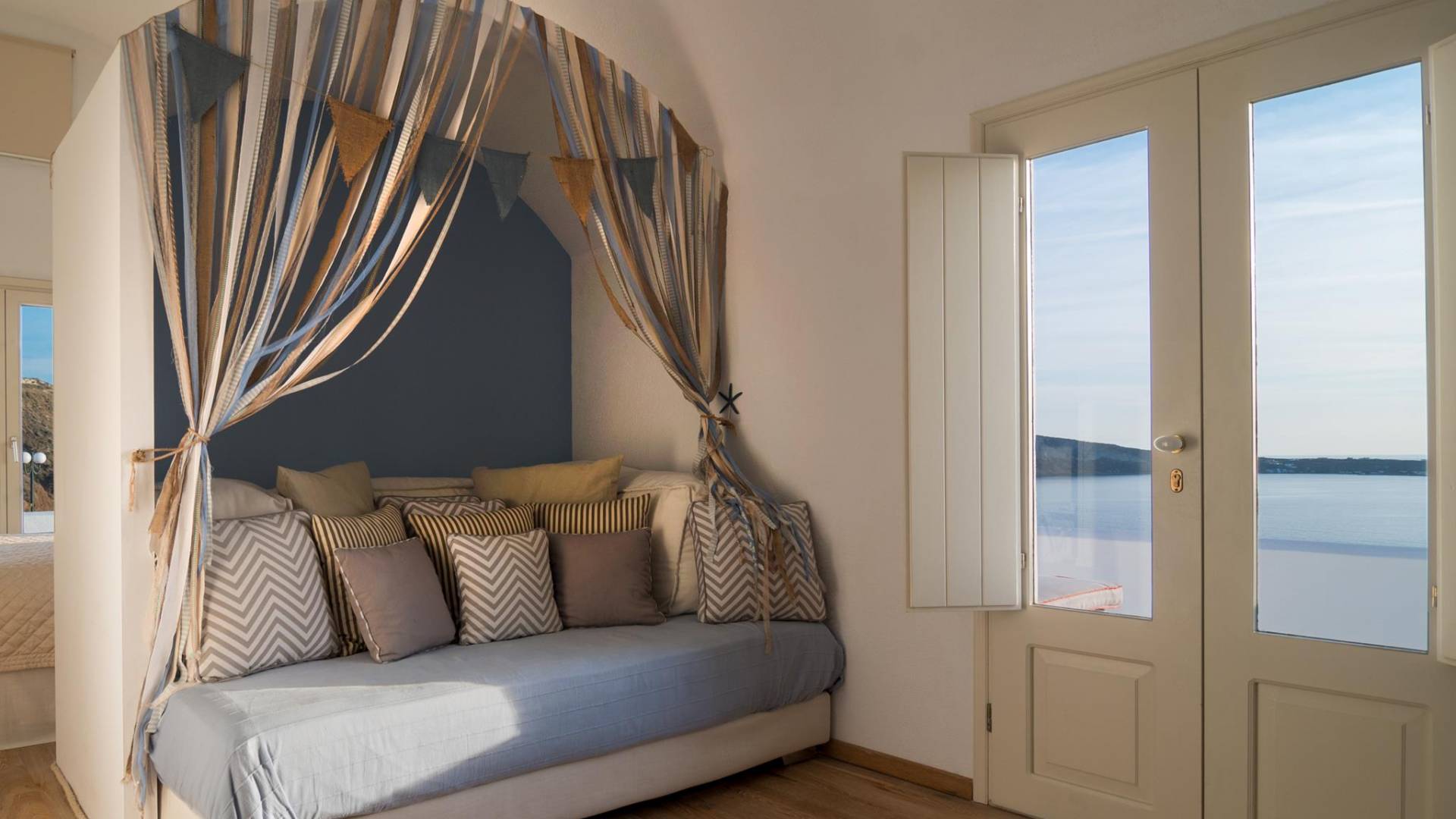 In the bedroom, with the king-size anatomic bed, you can enjoy the magnificent view of the blue Santorini sea. And in the living room, underneath a beautiful arch, there is another double anatomic bed, suitable for adults, which can be converted into a sofa.