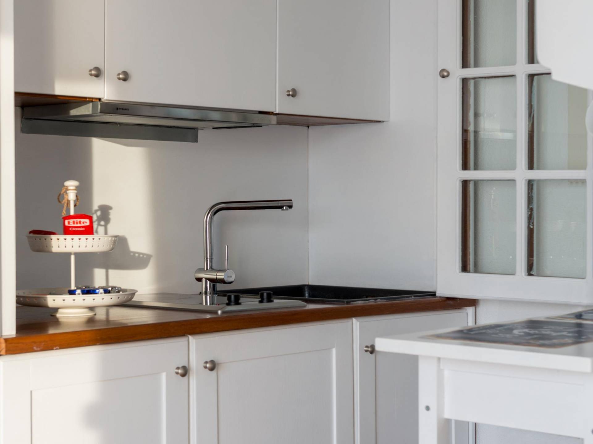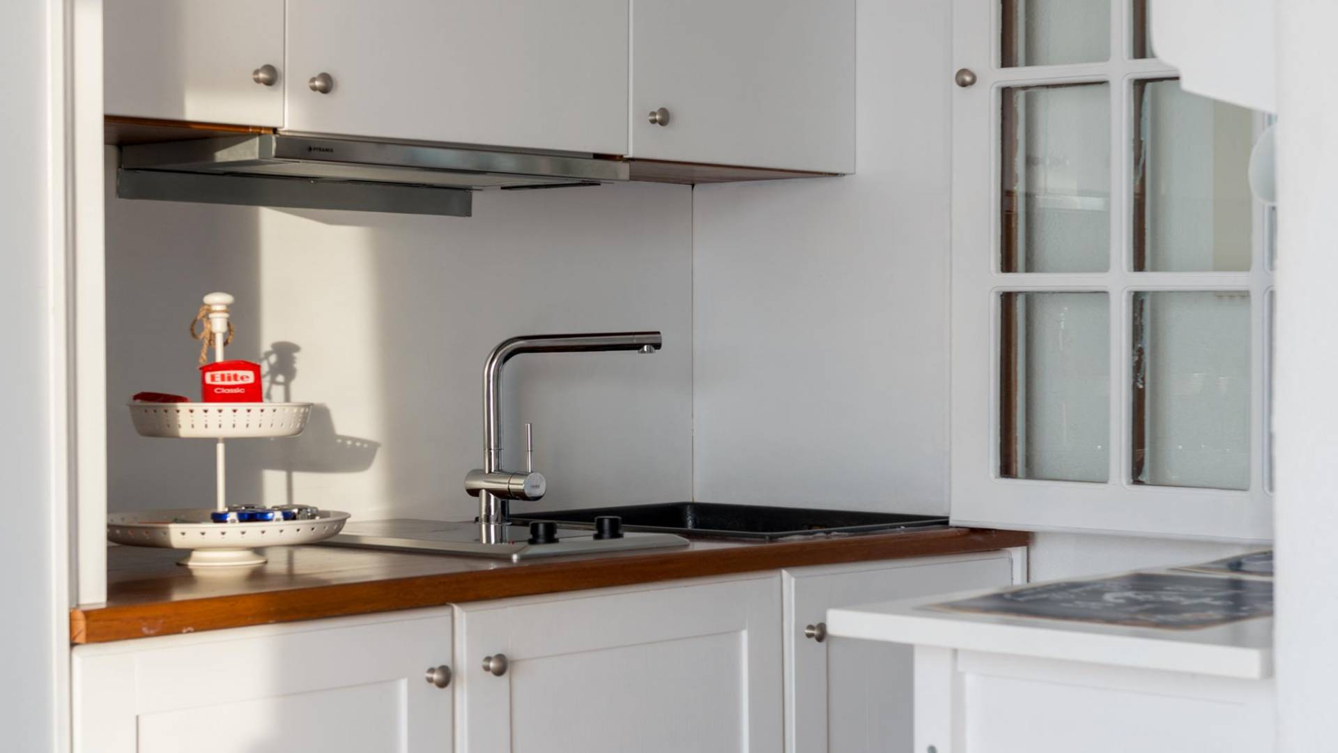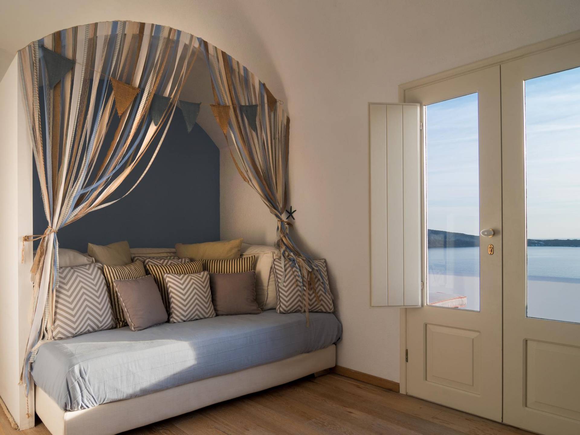 In the bedroom, with the king-size anatomic bed, you can enjoy the magnificent view of the blue Santorini sea. And in the living room, underneath a beautiful arch, there is another double anatomic bed, suitable for adults, which can be converted into a sofa.