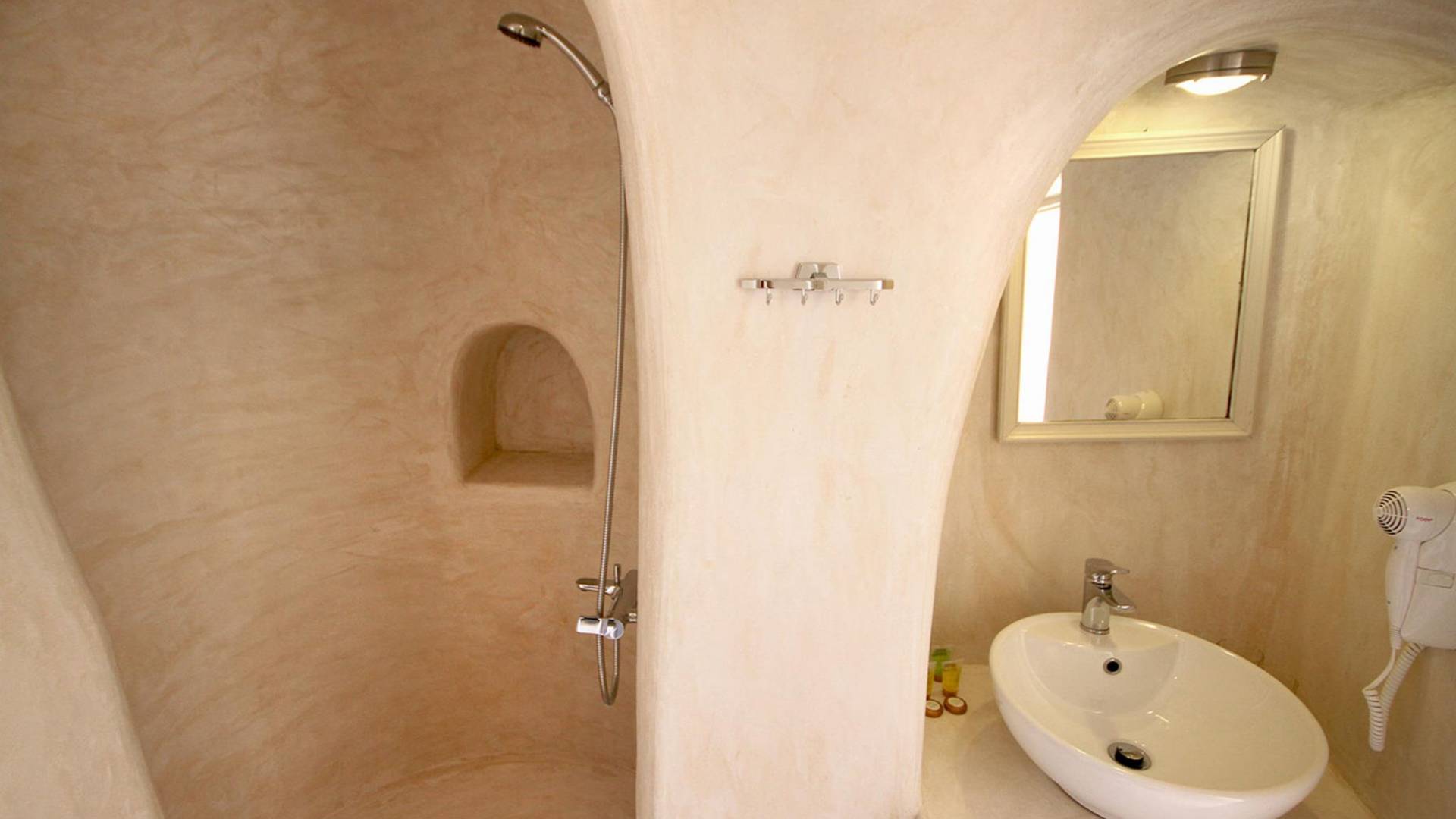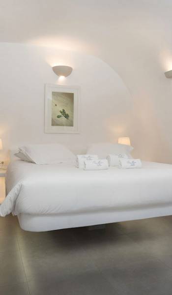 Cave Suite for 2 persons consists of a living room, a double bed, a bathroom, and a veranda with amazing views to the Caldera and Aegean sea.