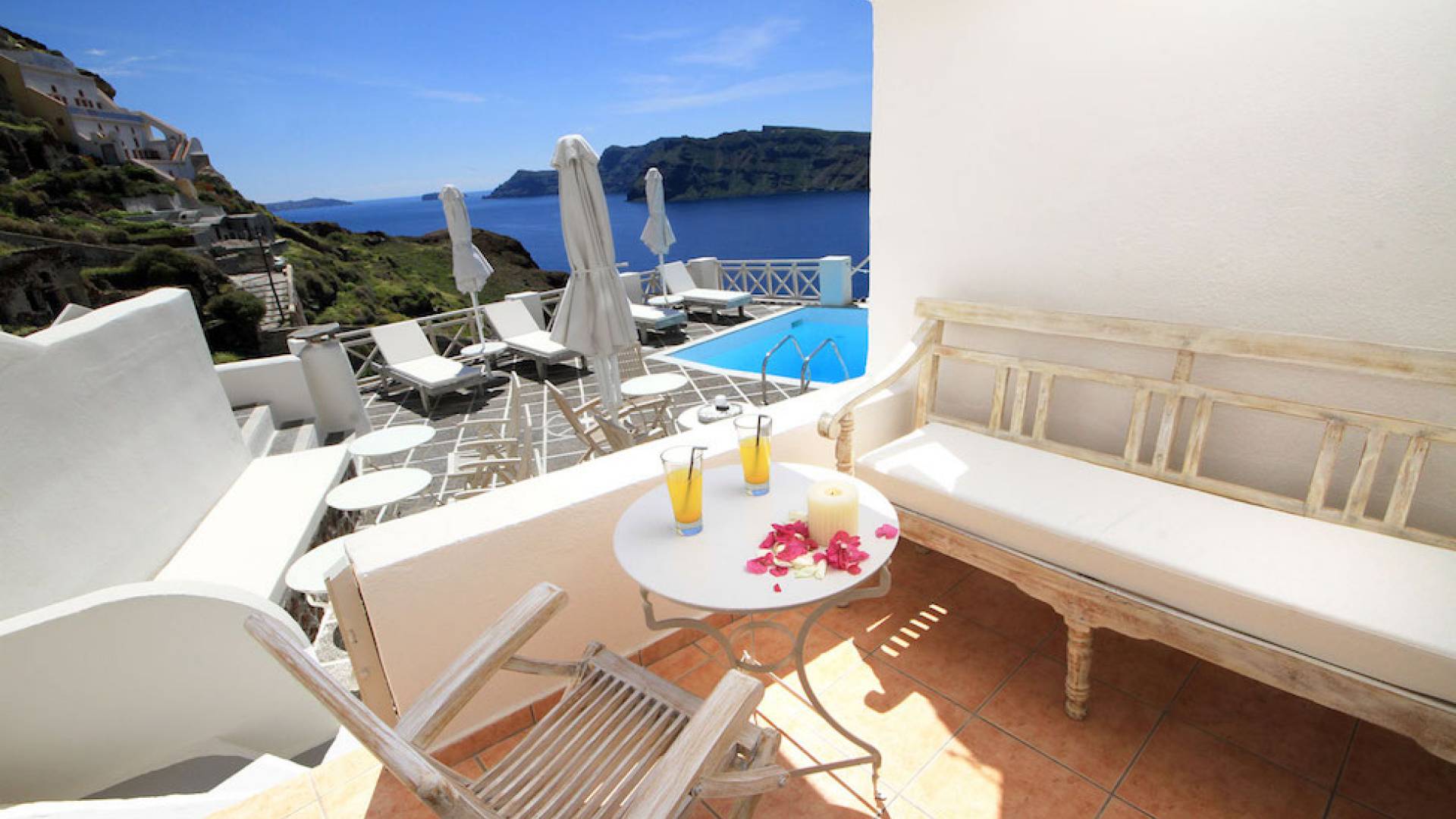 Oia Mare Villas offers Cave Suites with spectacular views of the Caldera and the Aegean sea. Each unit remains true to the style of the island featuring simple yet elegant.