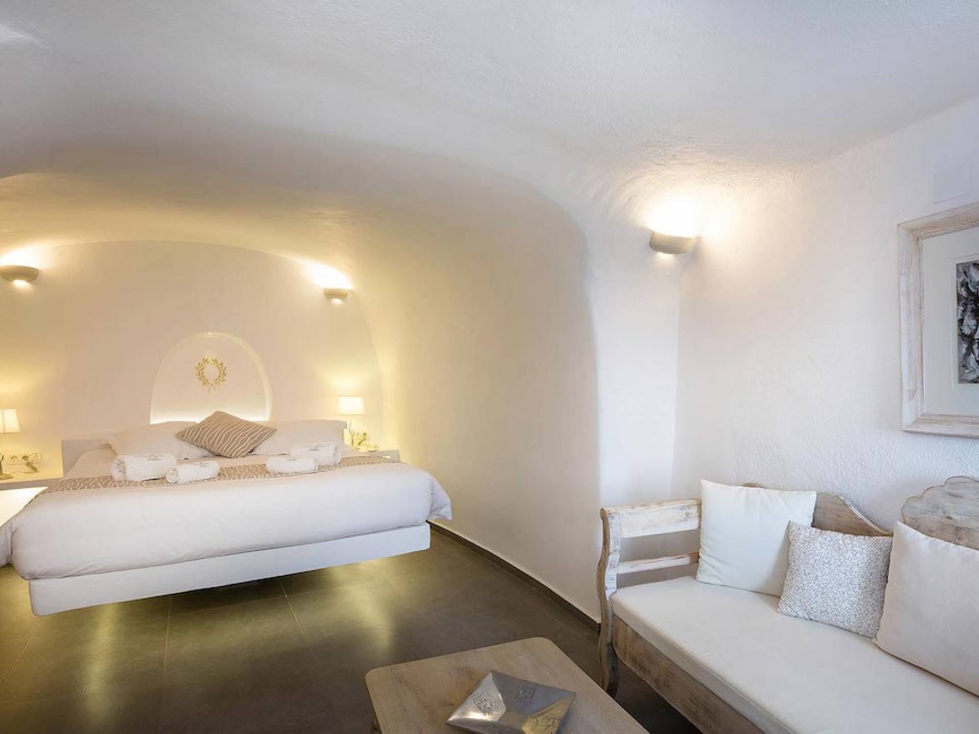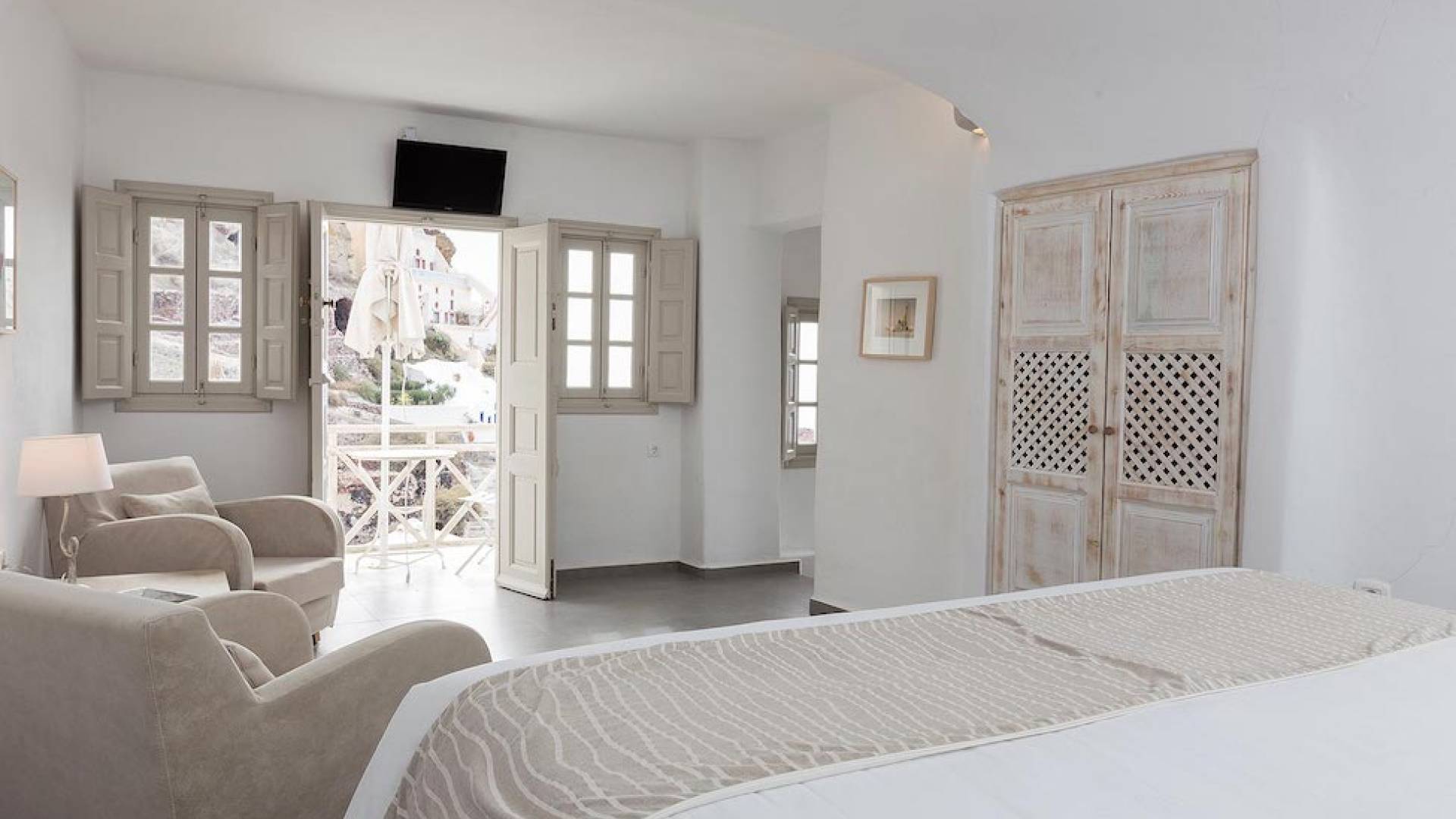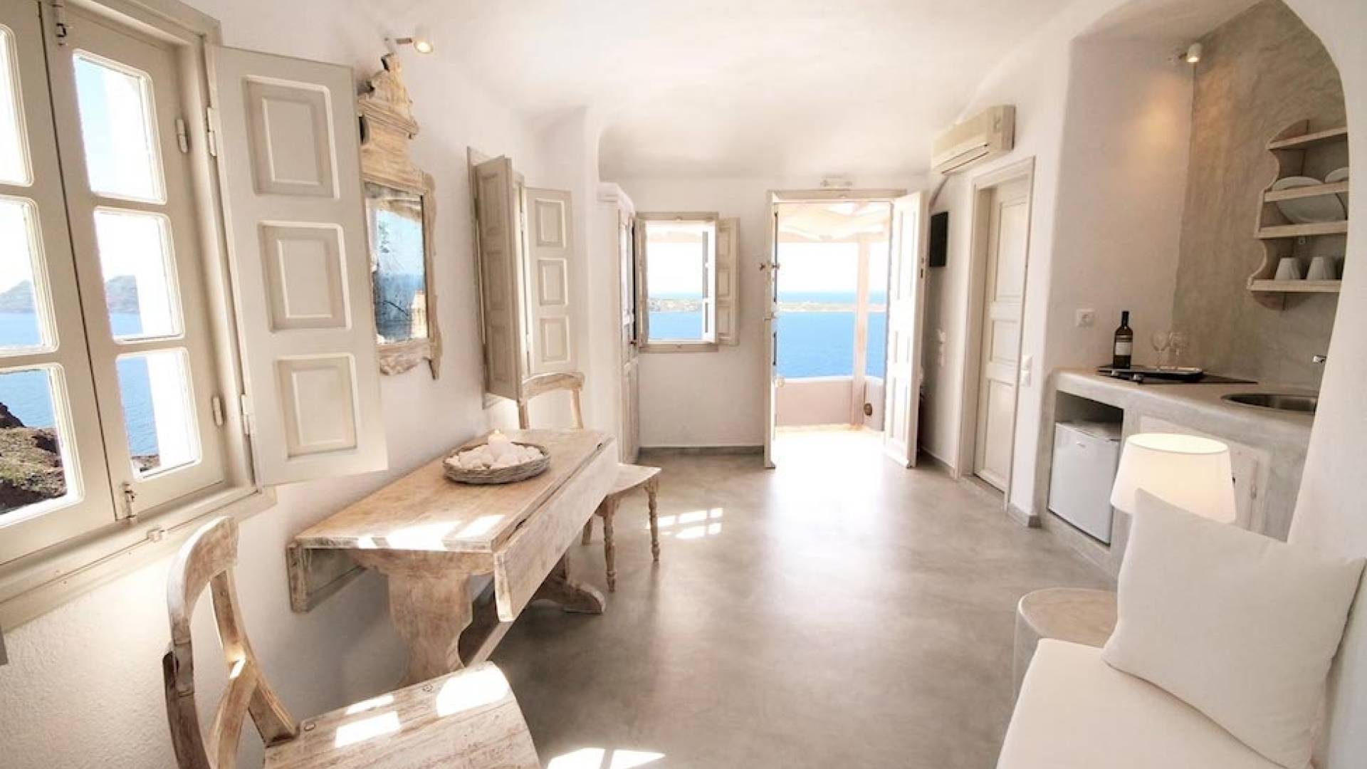 Cave Superior studio consists of a living area, the bedroom, the bathroom and a veranda with amazing views to the Caldera and Aegean sea.