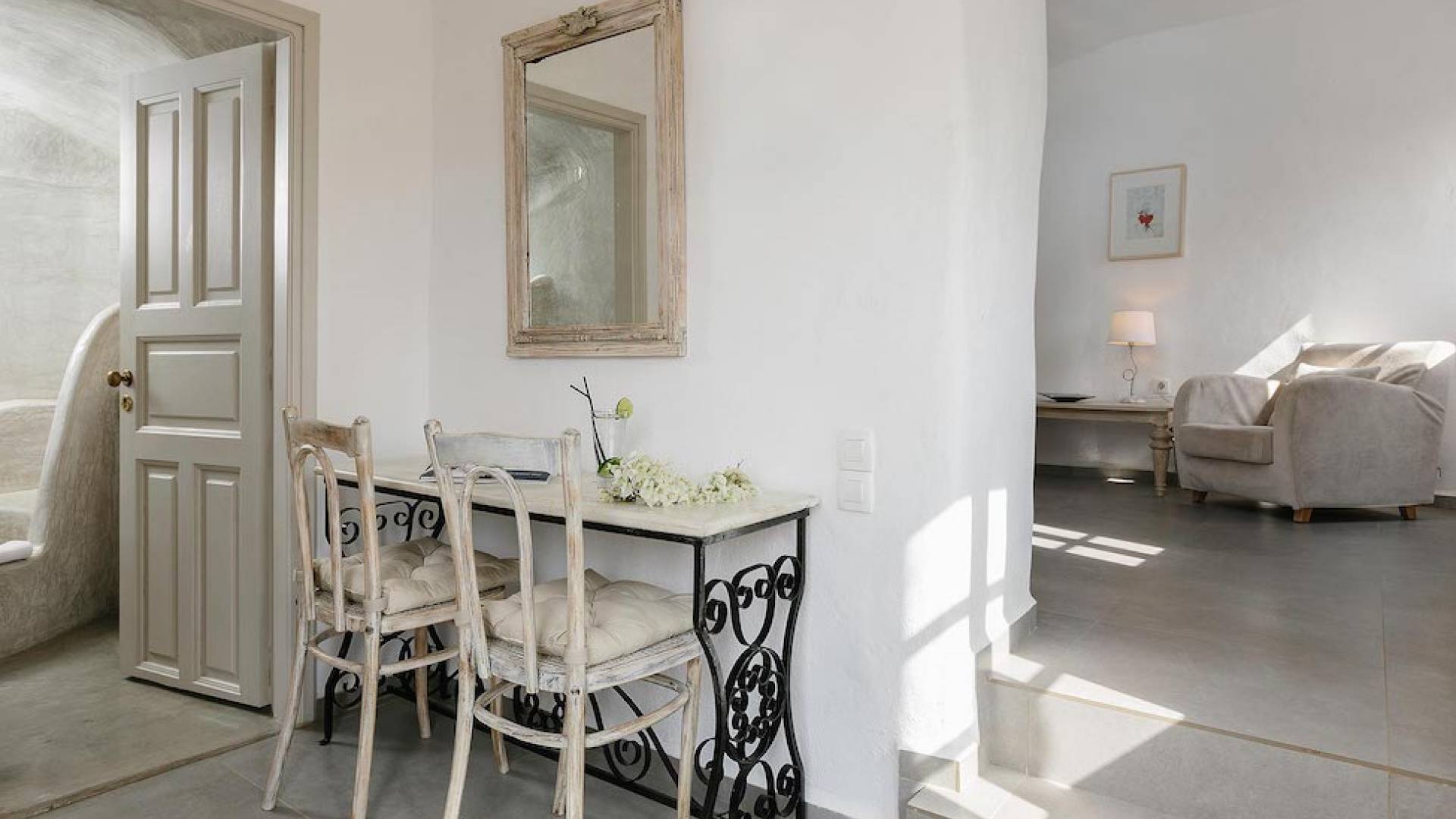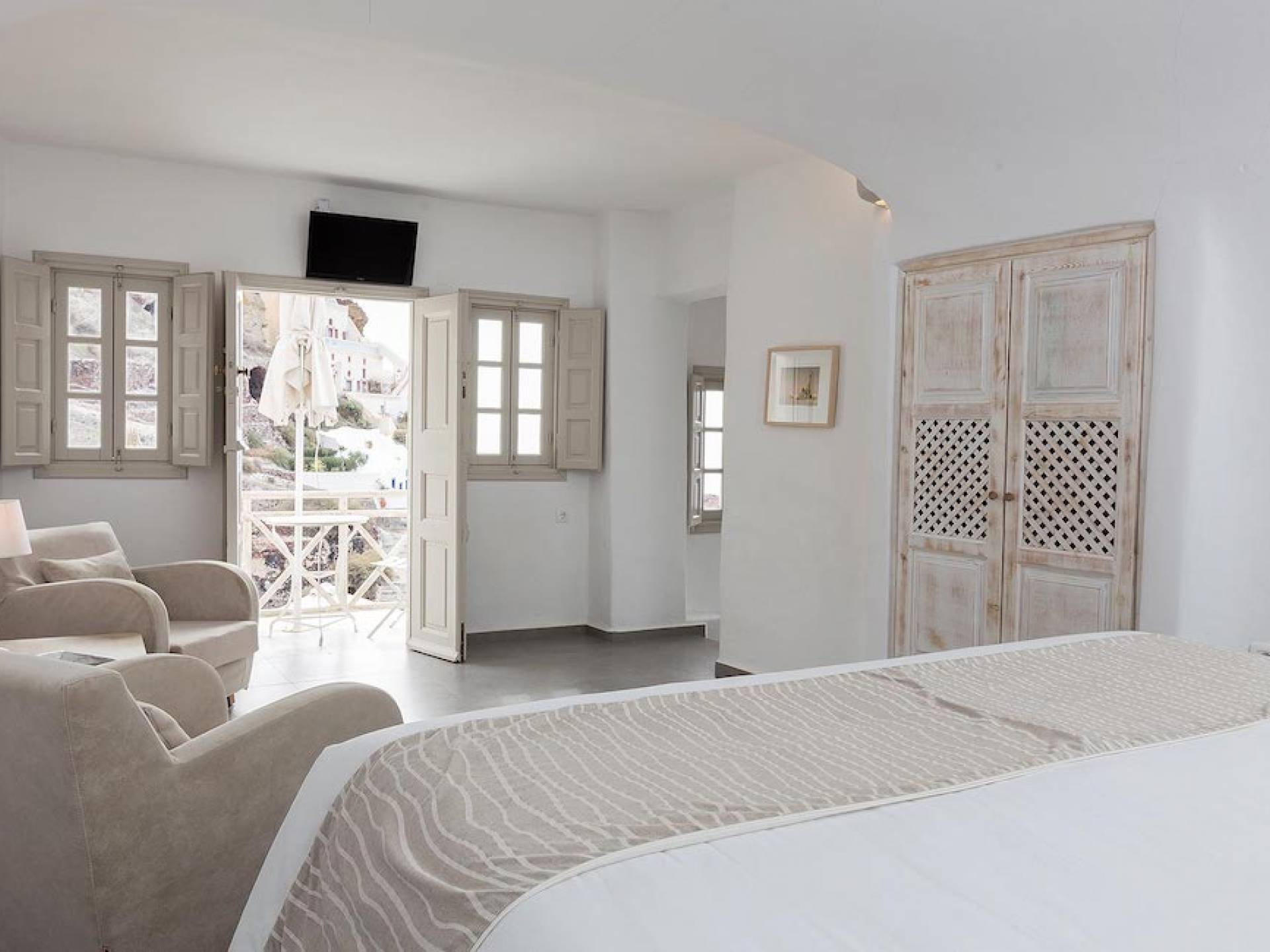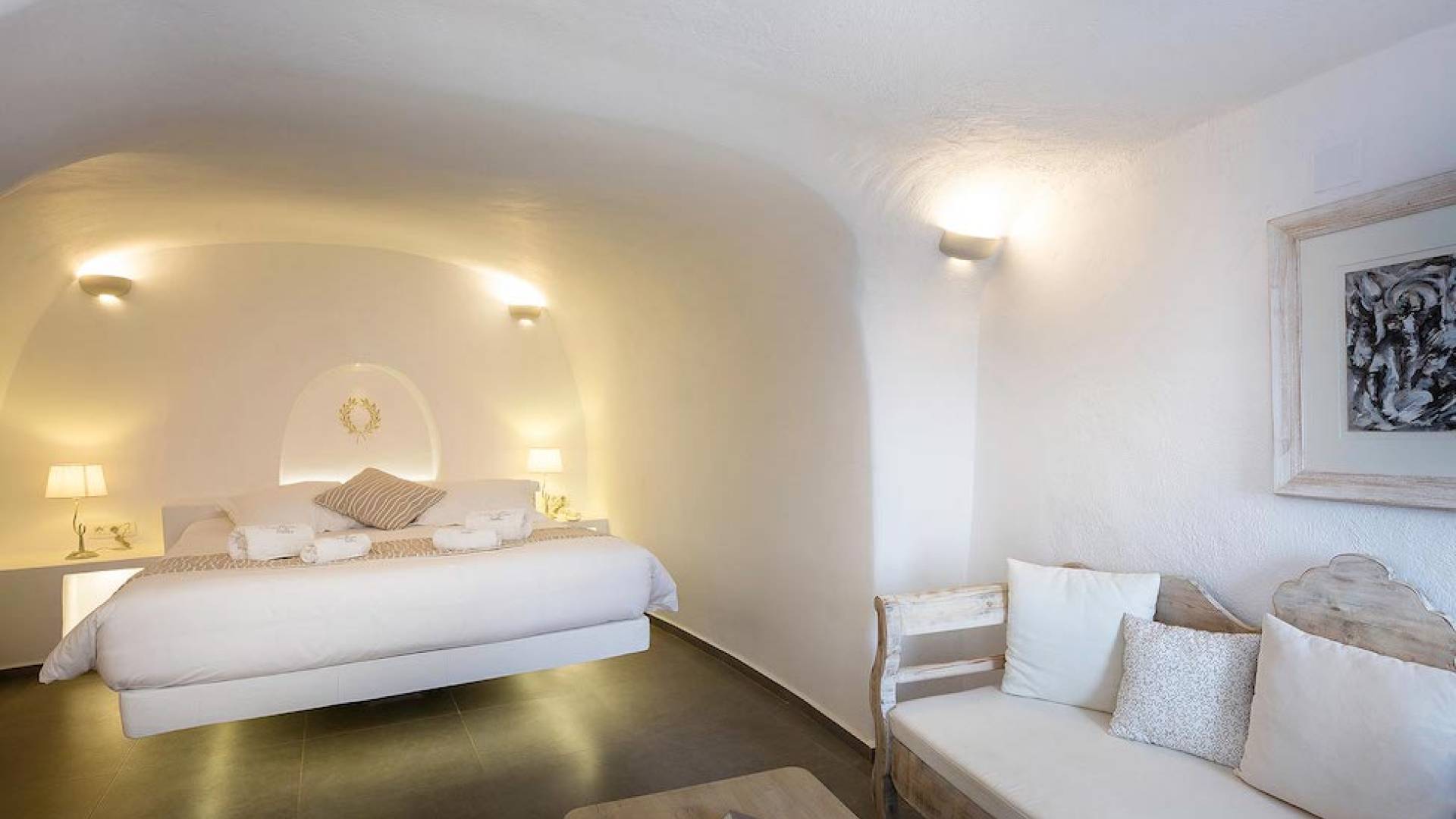Cave Superior studio consists of a living area, the bedroom, the bathroom and a veranda with amazing views to the Caldera and Aegean sea.