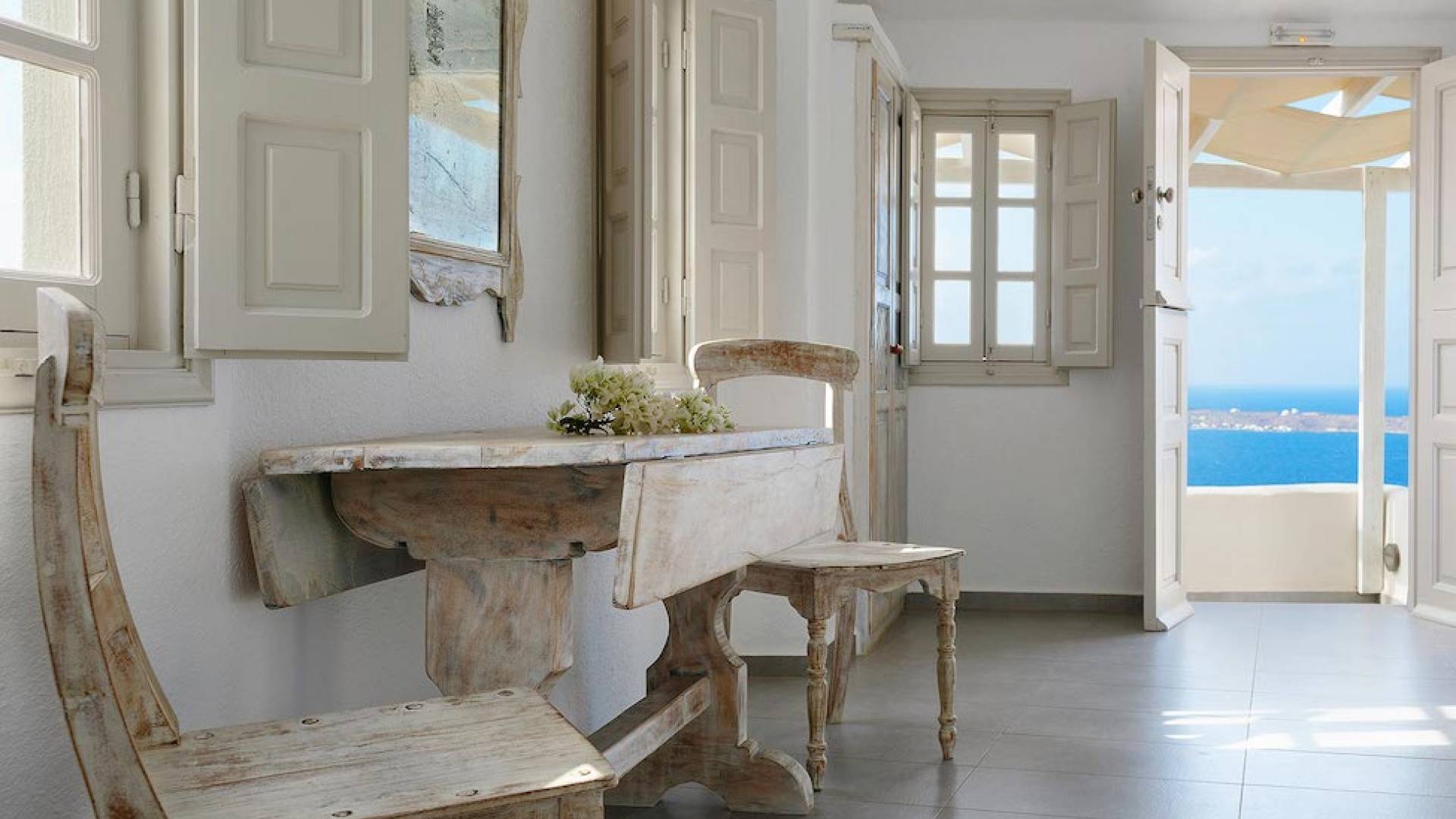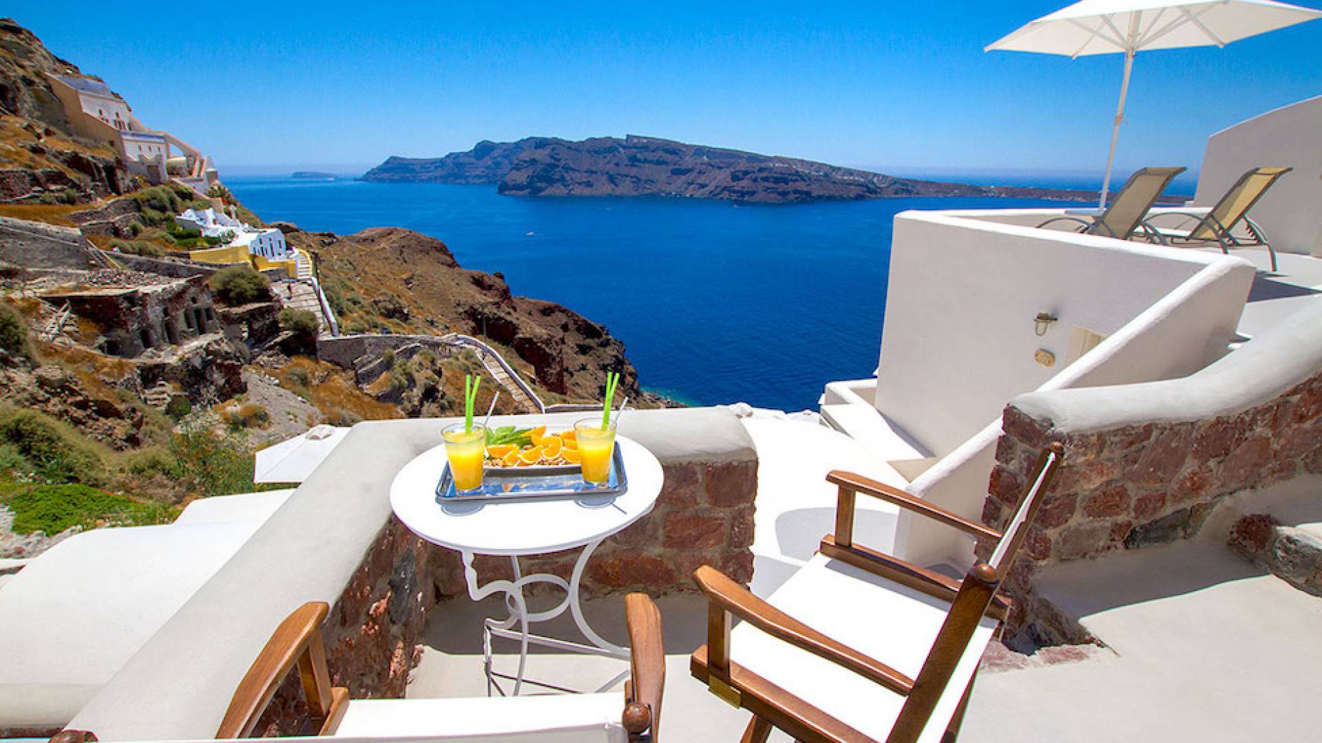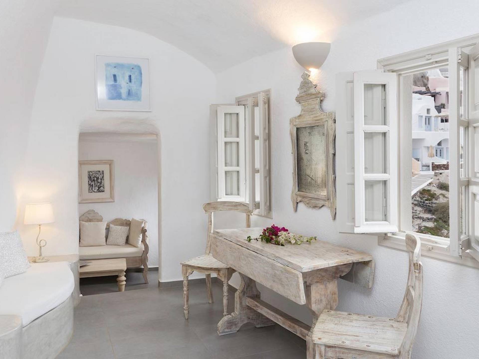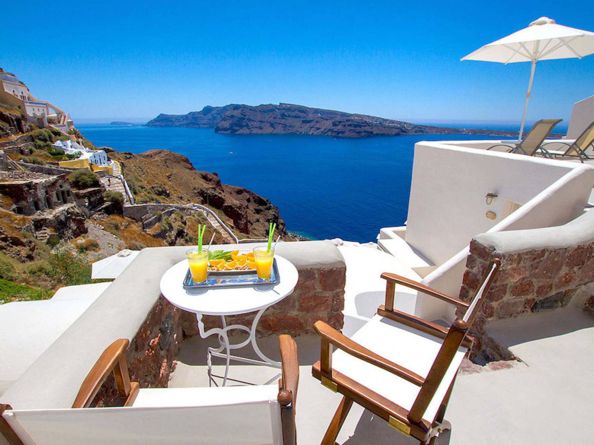 Oia Mare Villas offers Cave Suites with spectacular views of the Caldera and the Aegean sea. Each unit remains true to the style of the island featuring simple yet elegant.