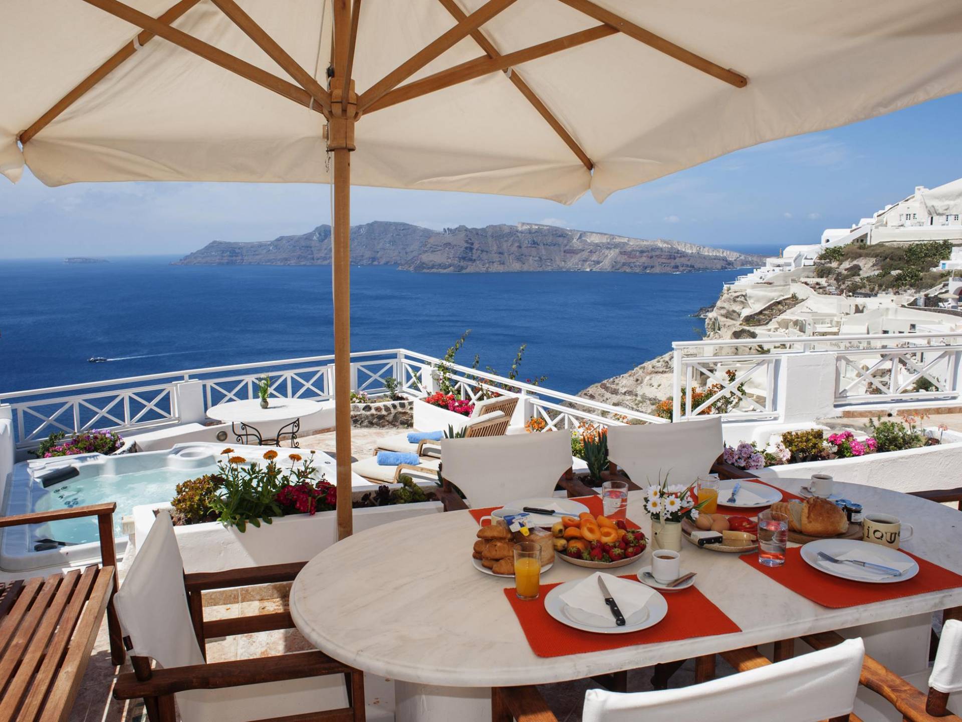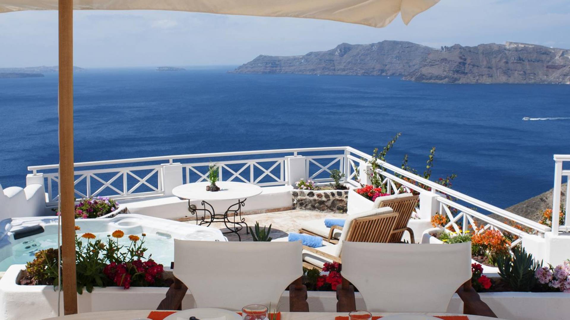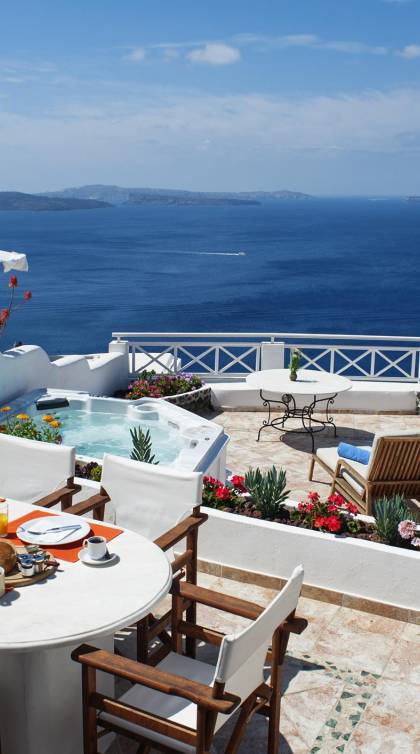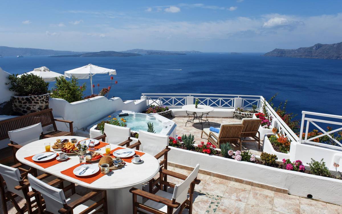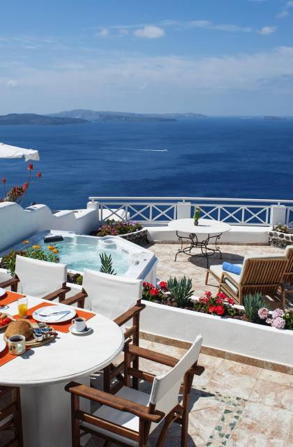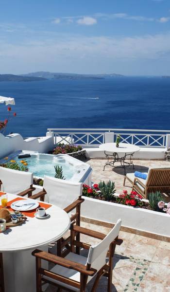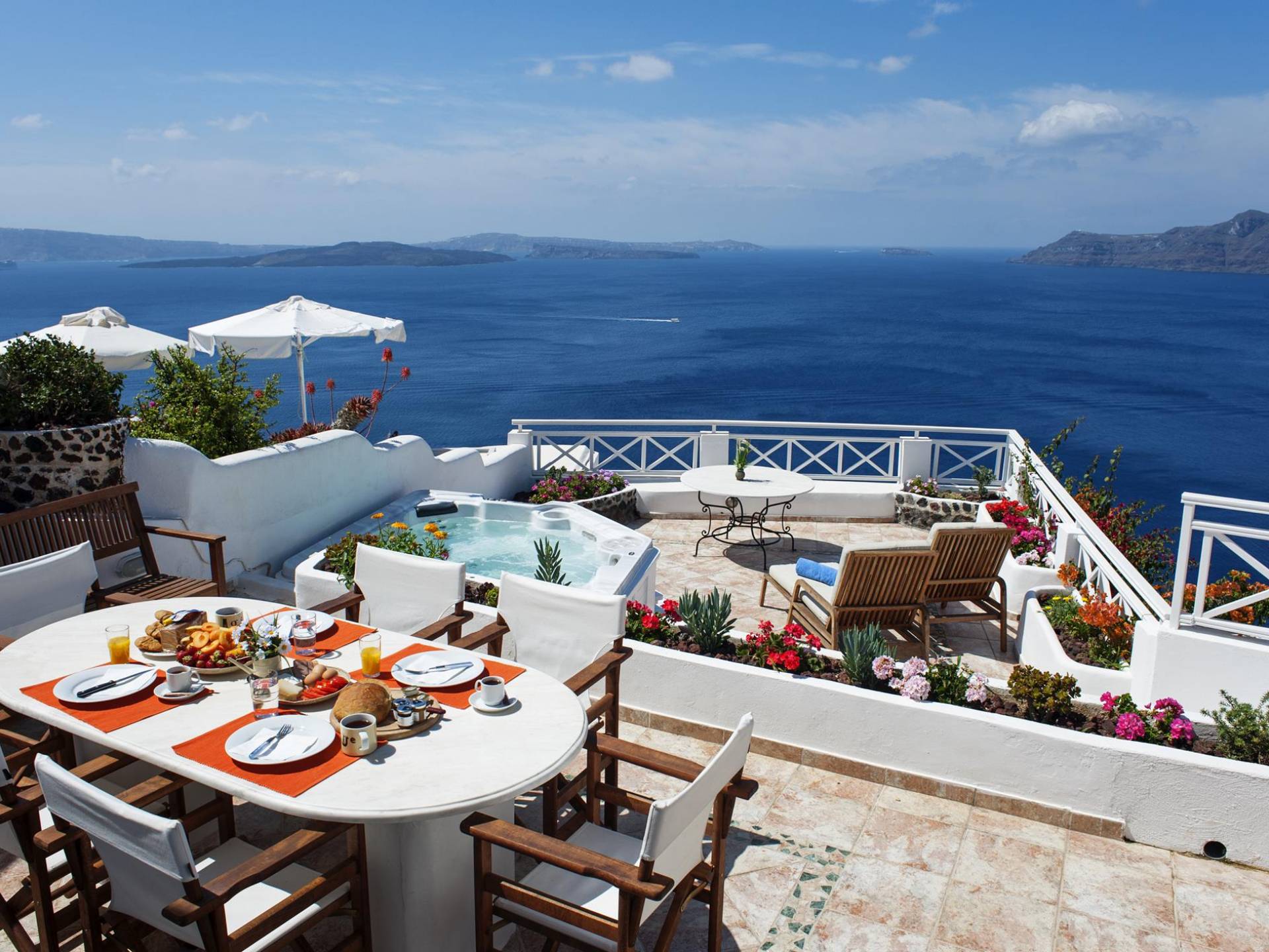 There are no steps to reach the villa from the main walkway enabling disabled access a rarity for the Caldera-facing villas. It has a heated hot tub and a large outdoor area with ample seating for guests to enjoy the lovely views.