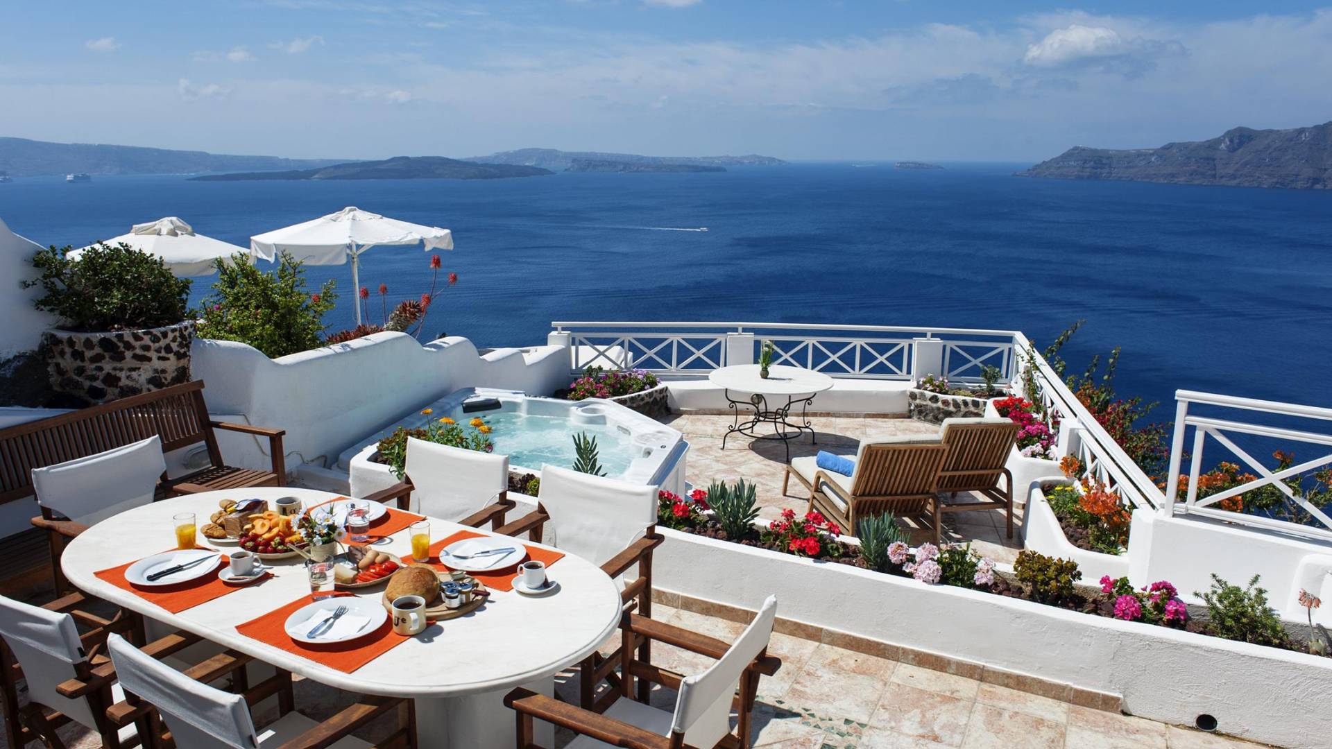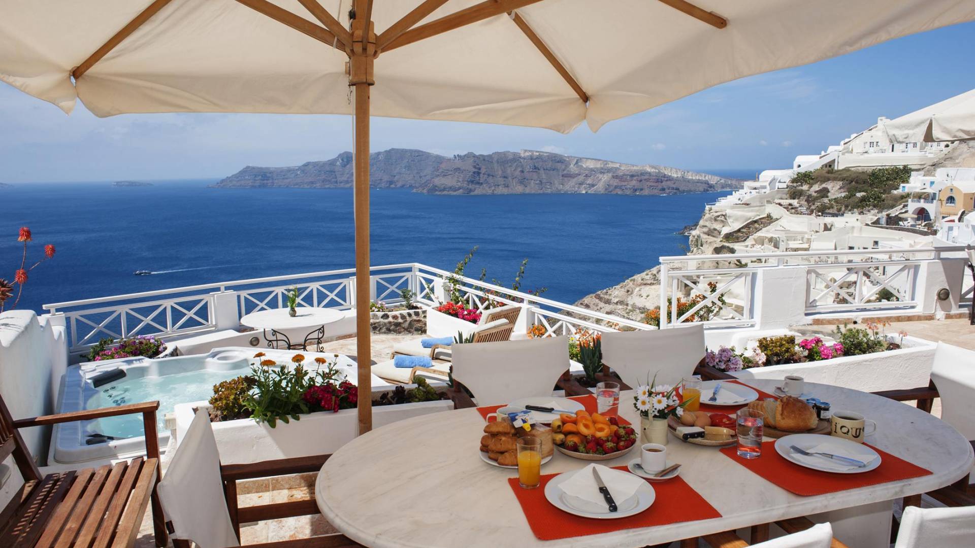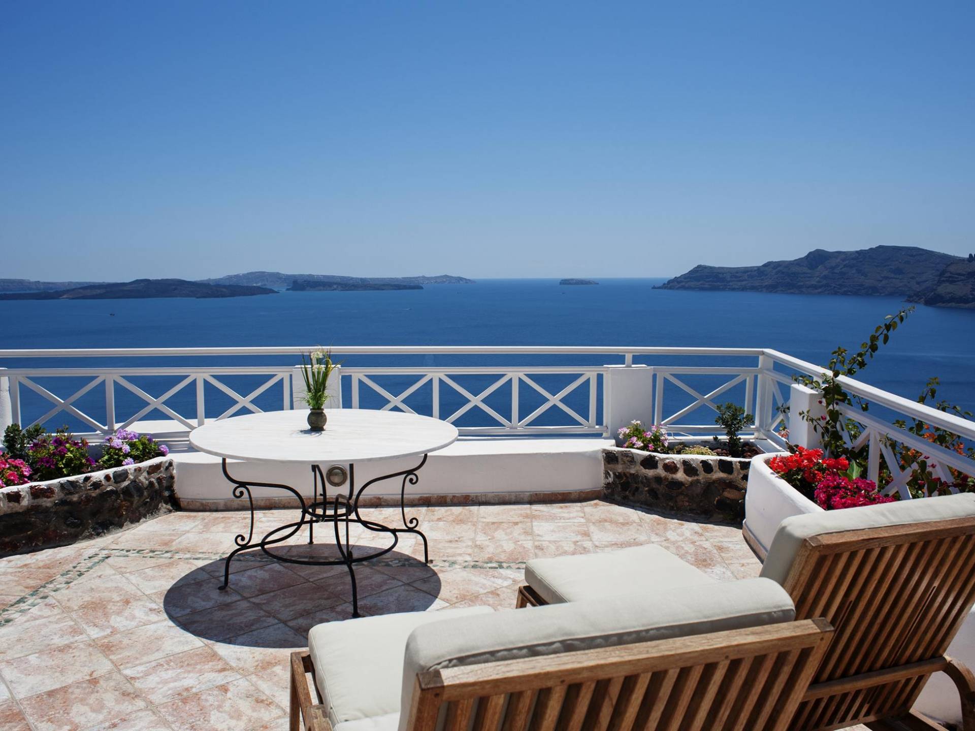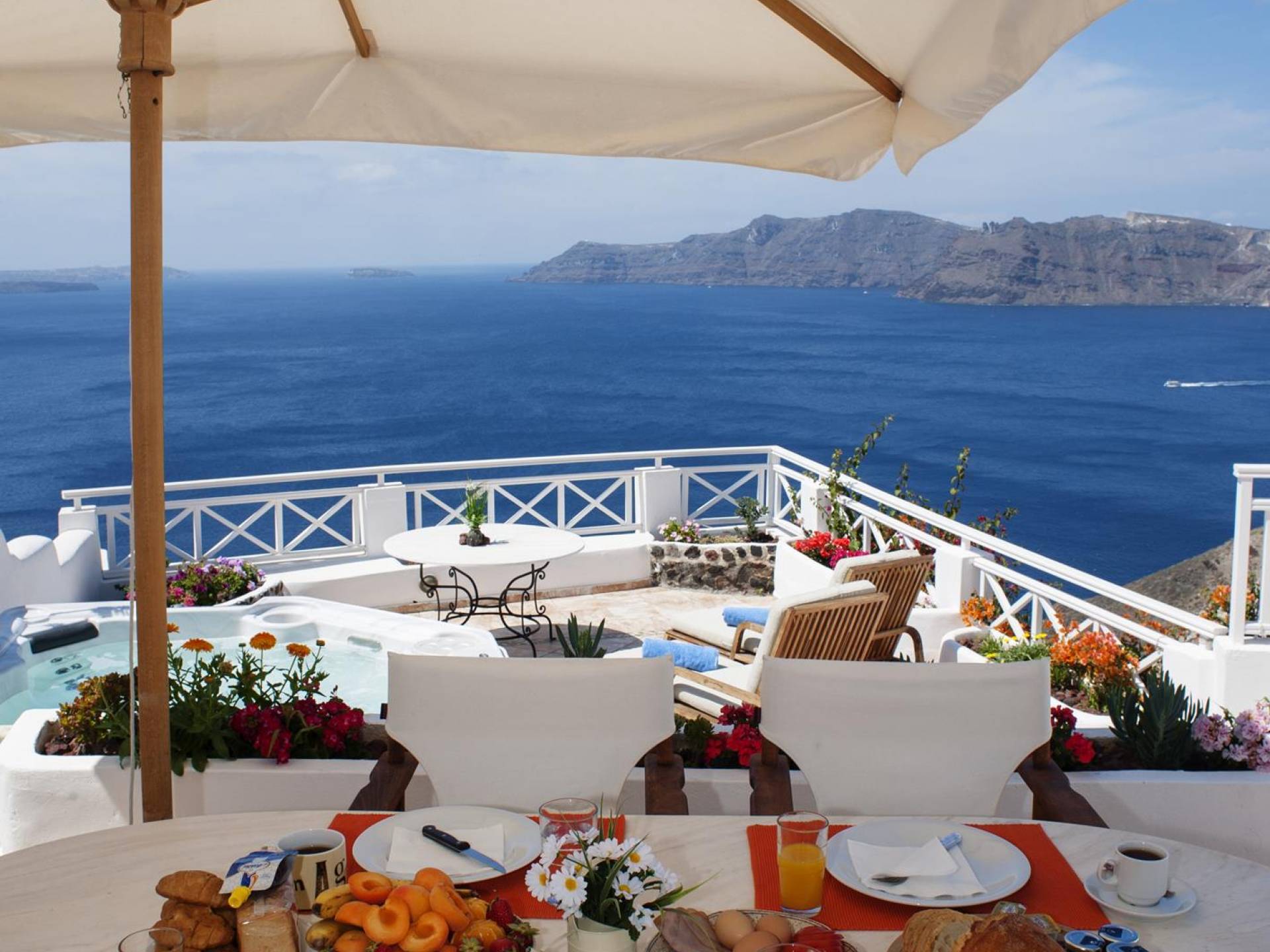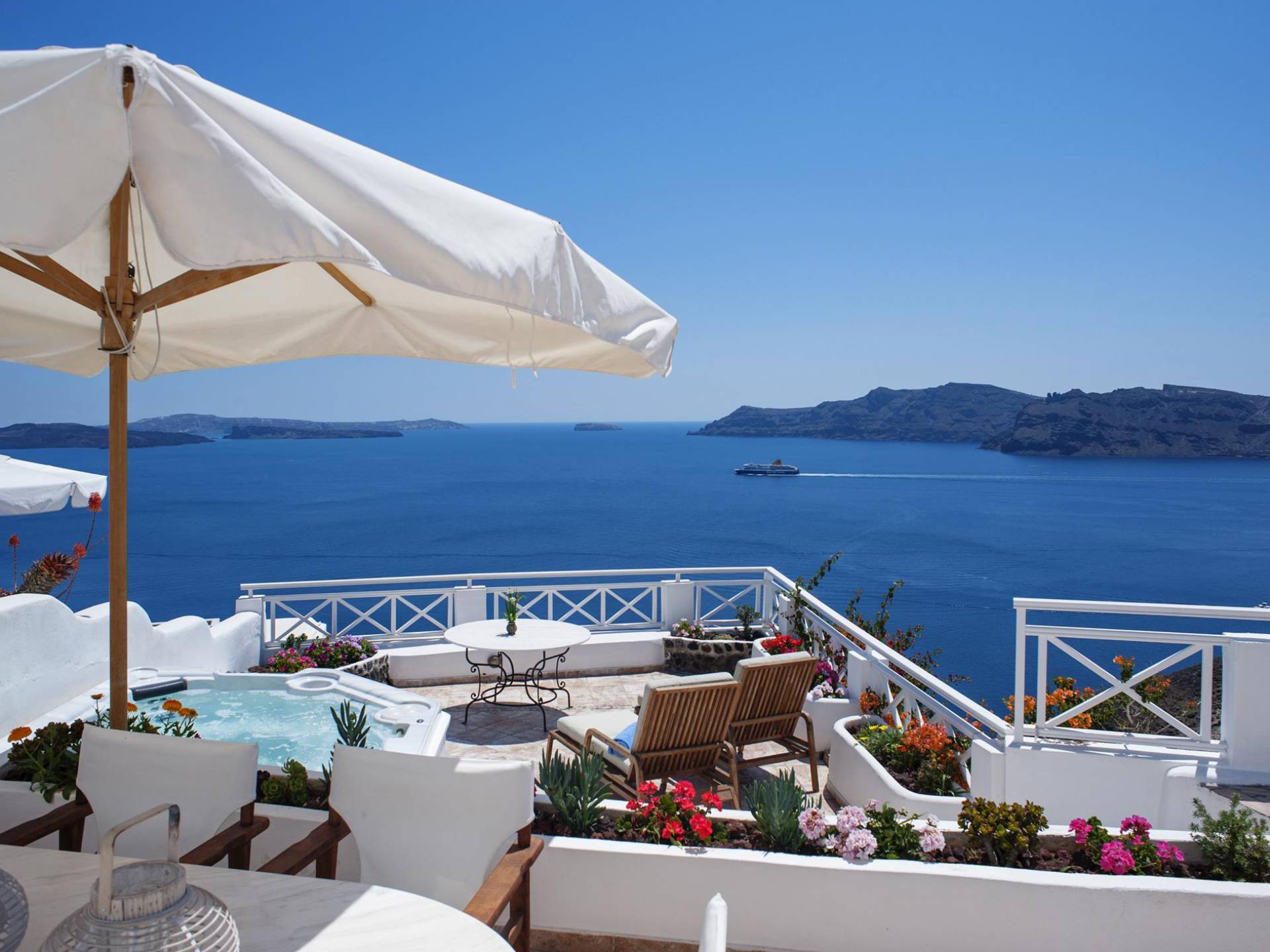 There are no steps to reach the villa from the main walkway enabling disabled access a rarity for the Caldera-facing villas. It has a heated hot tub and a large outdoor area with ample seating for guests to enjoy the lovely views.