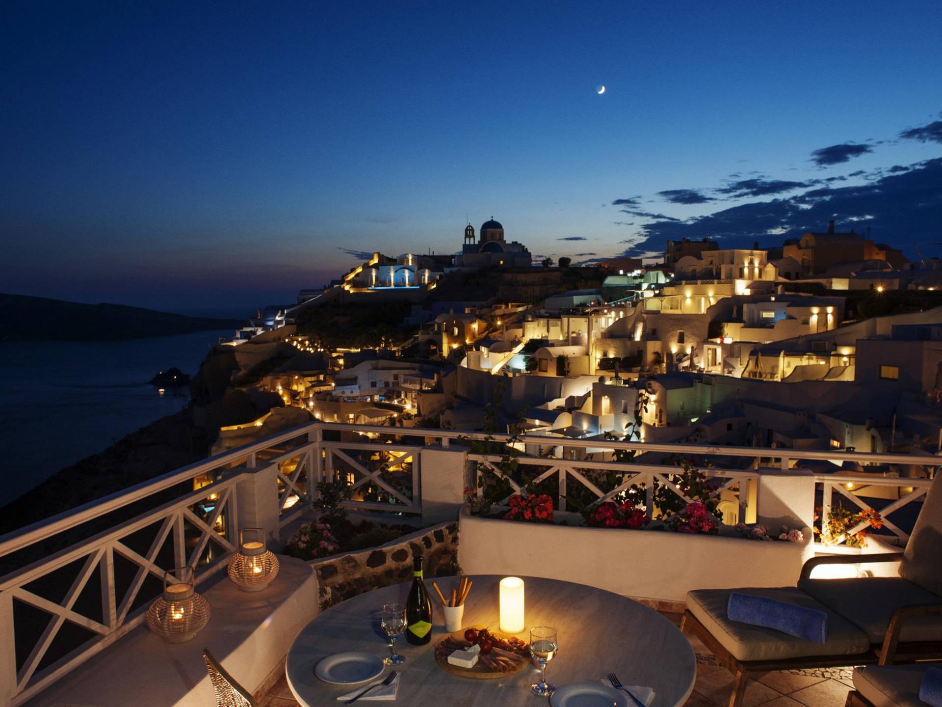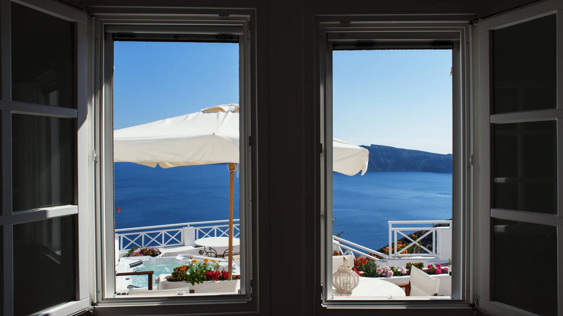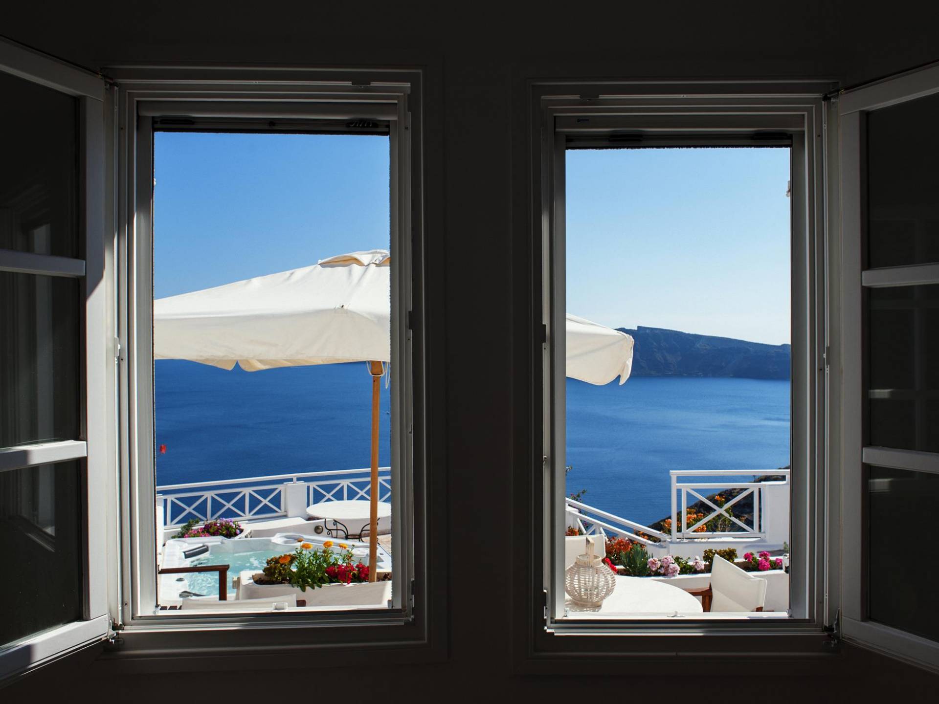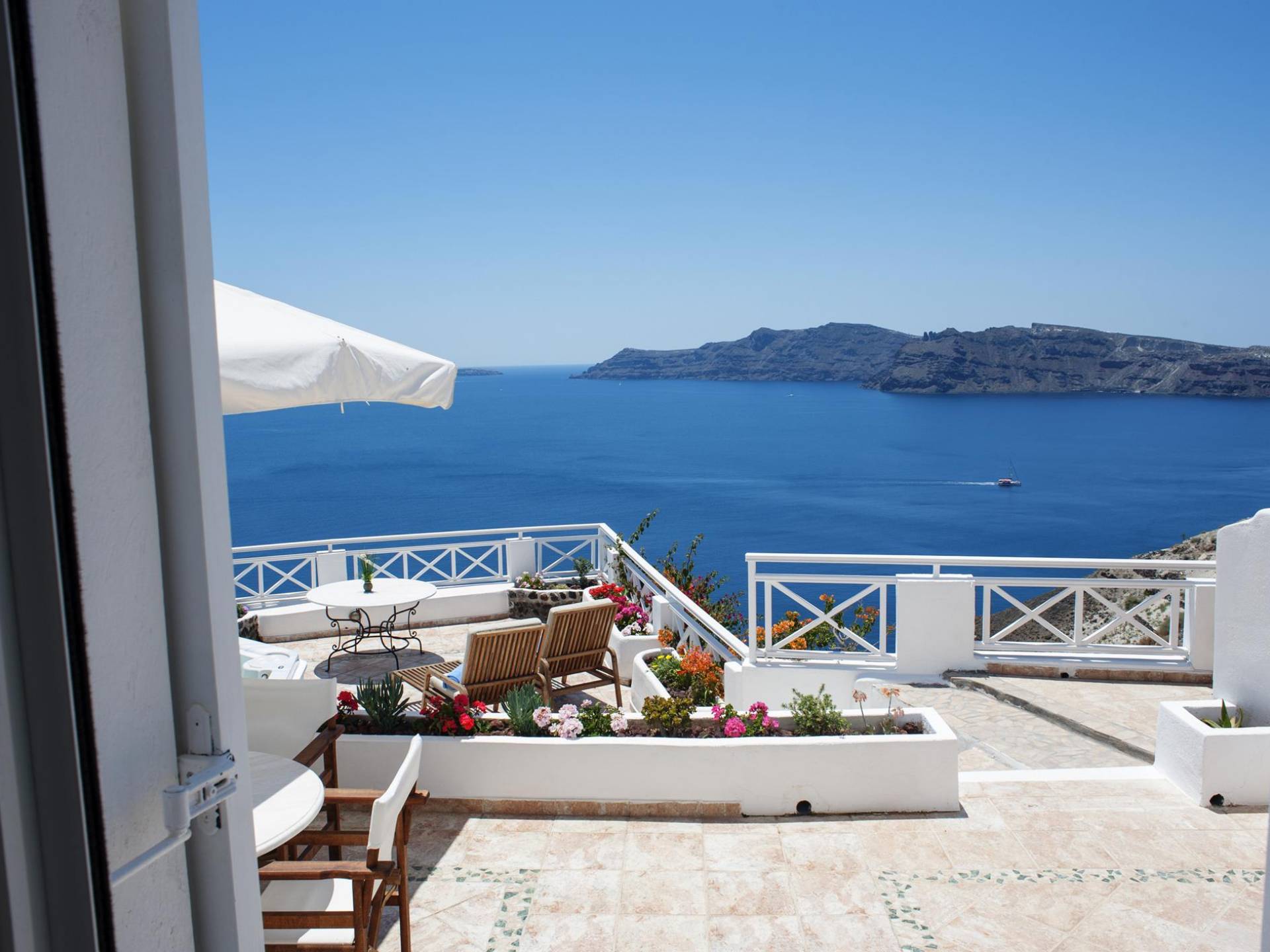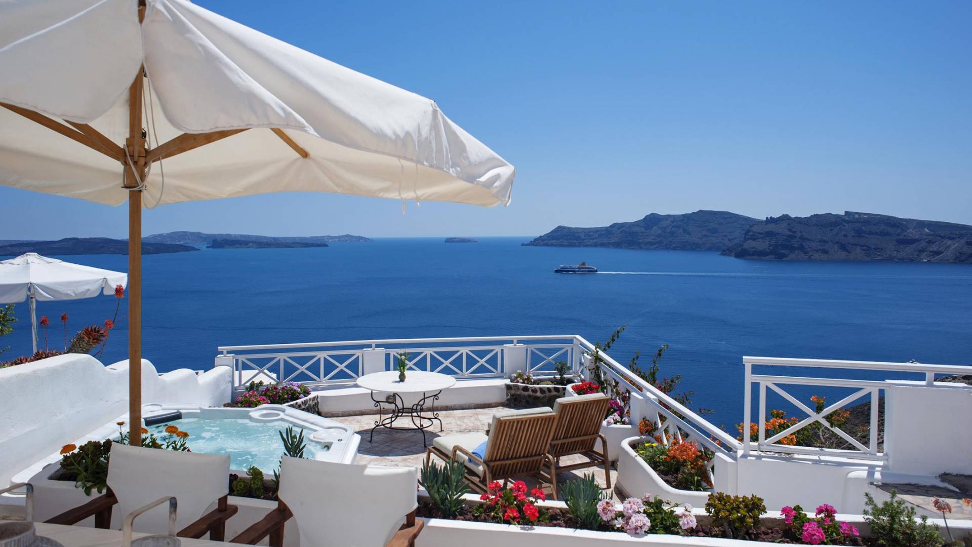There are no steps to reach the villa from the main walkway enabling disabled access a rarity for the Caldera-facing villas. It has a heated hot tub and a large outdoor area with ample seating for guests to enjoy the lovely views.