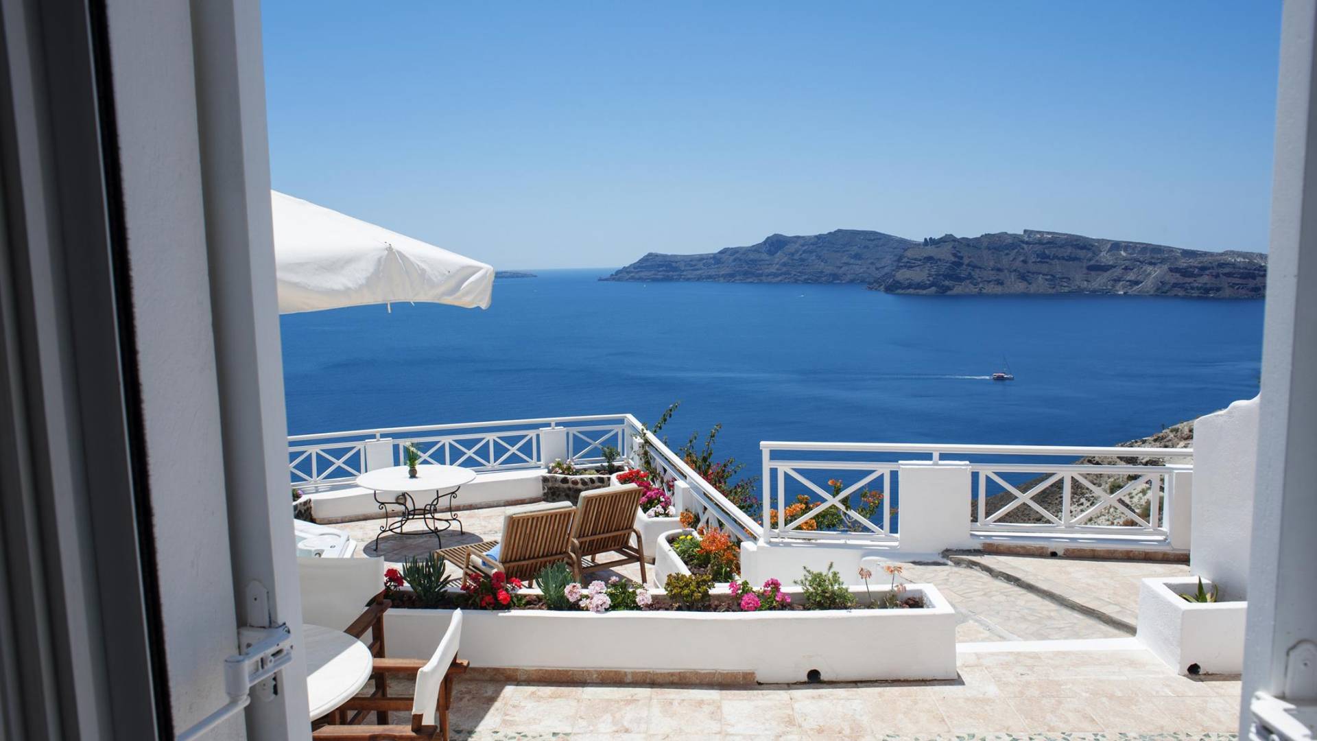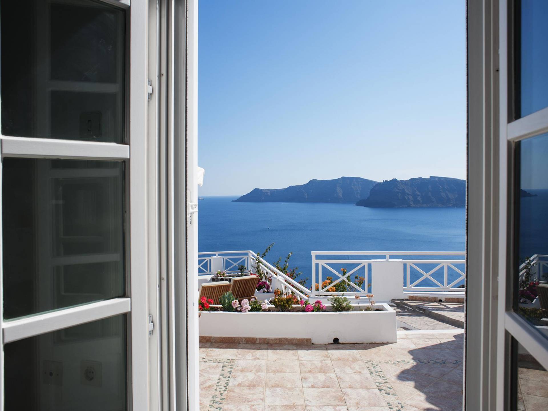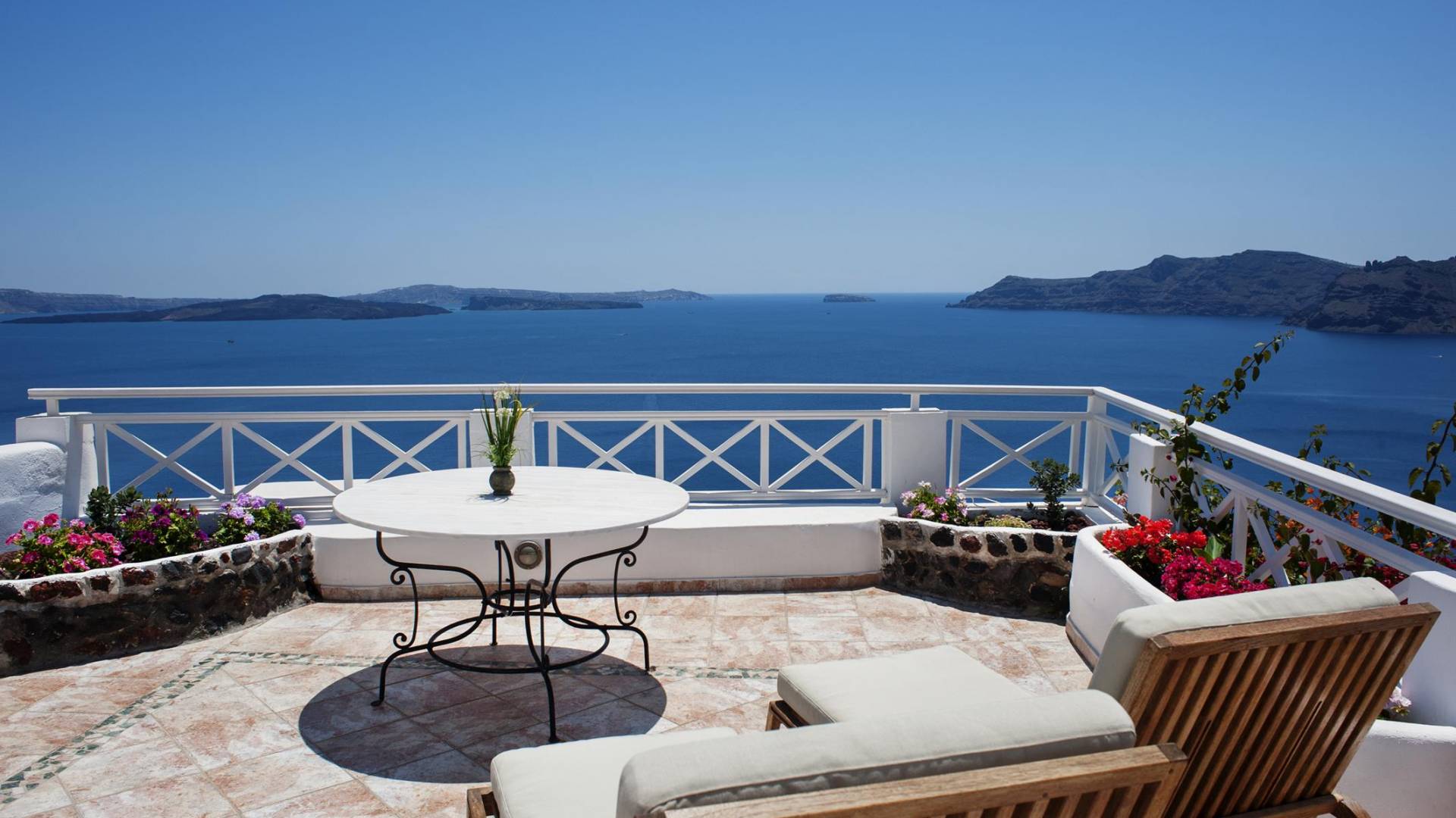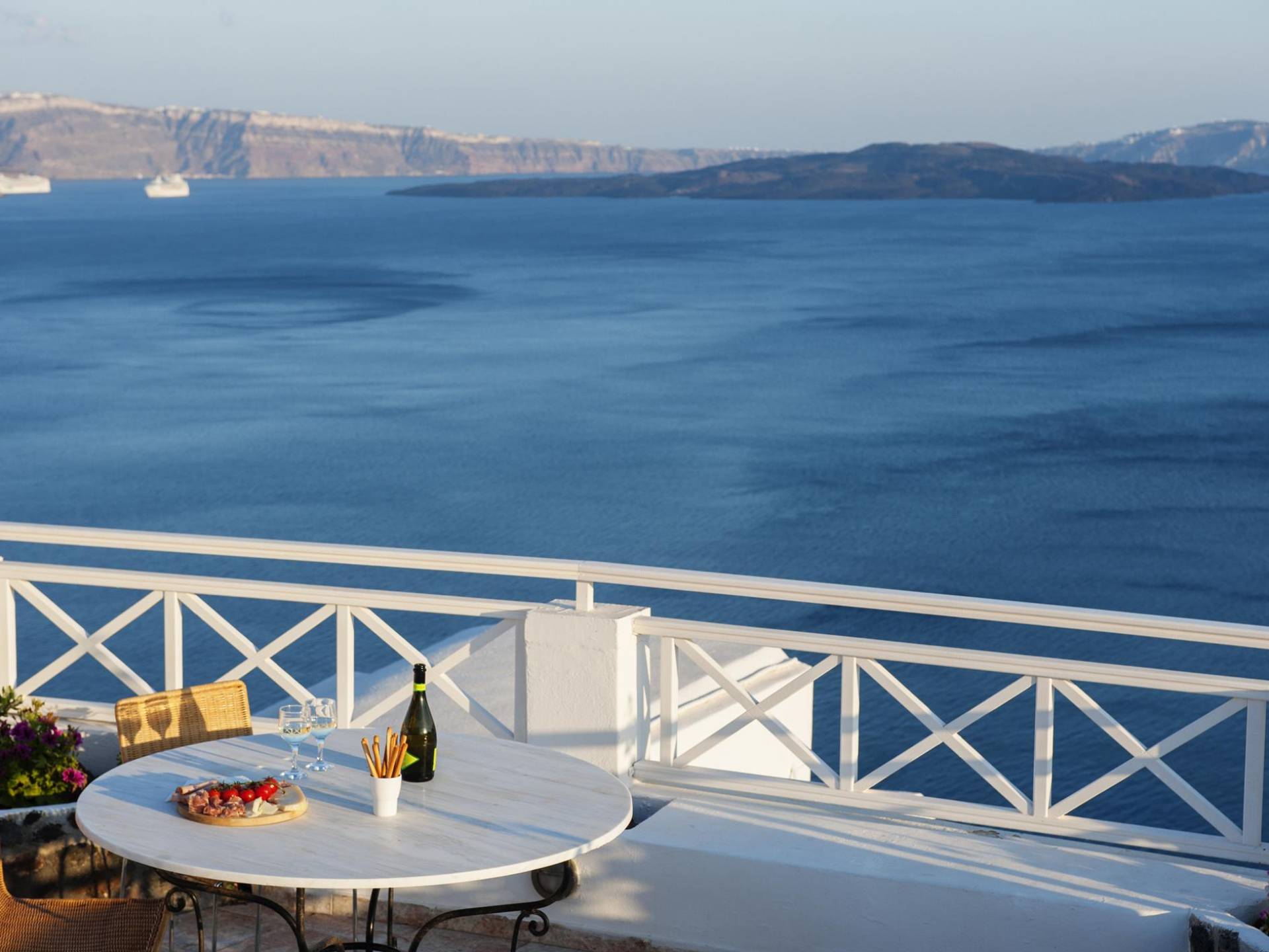 There are no steps to reach the villa from the main walkway enabling disabled access a rarity for the Caldera-facing villas. It has a heated hot tub and a large outdoor area with ample seating for guests to enjoy the lovely views.