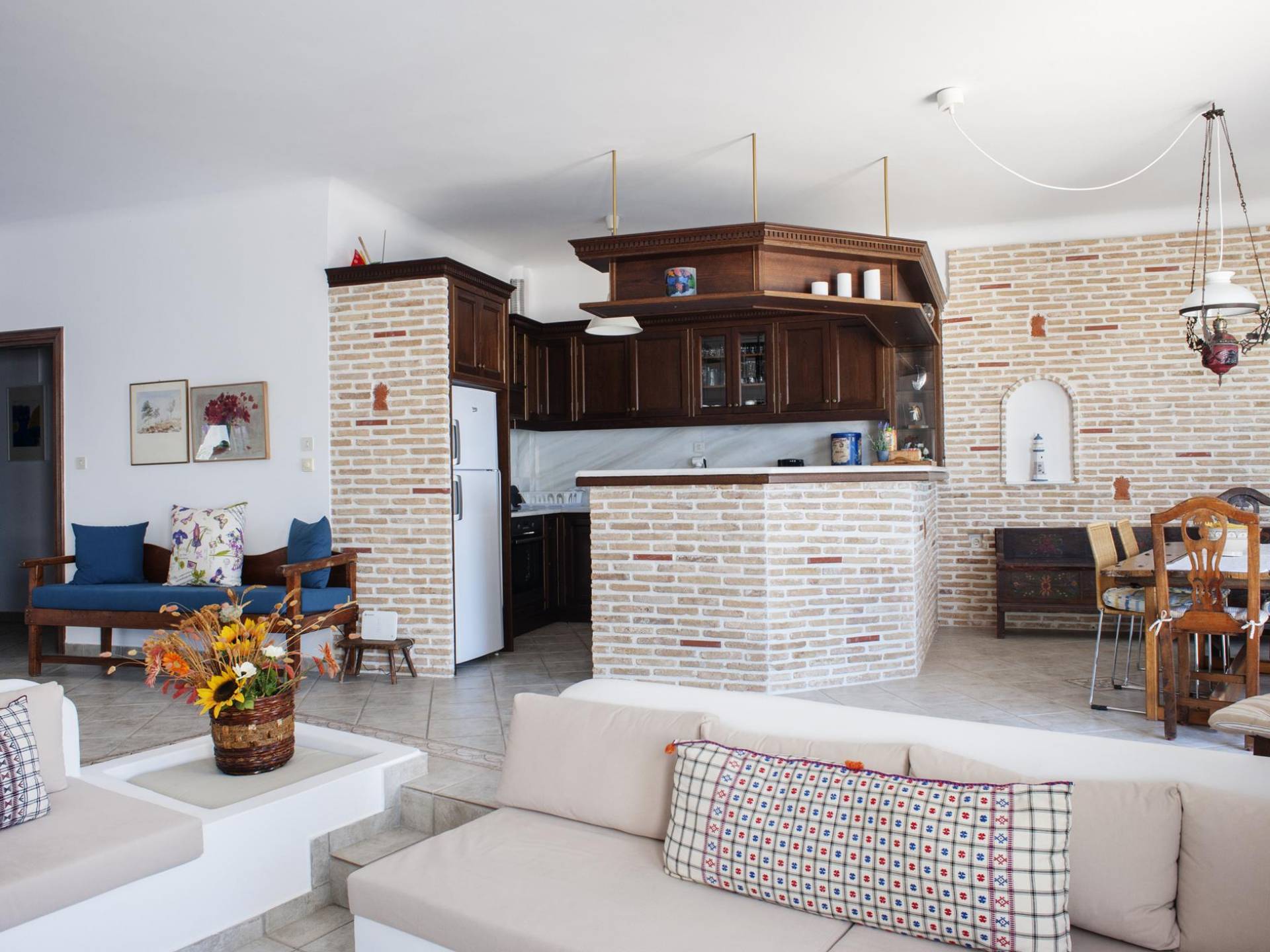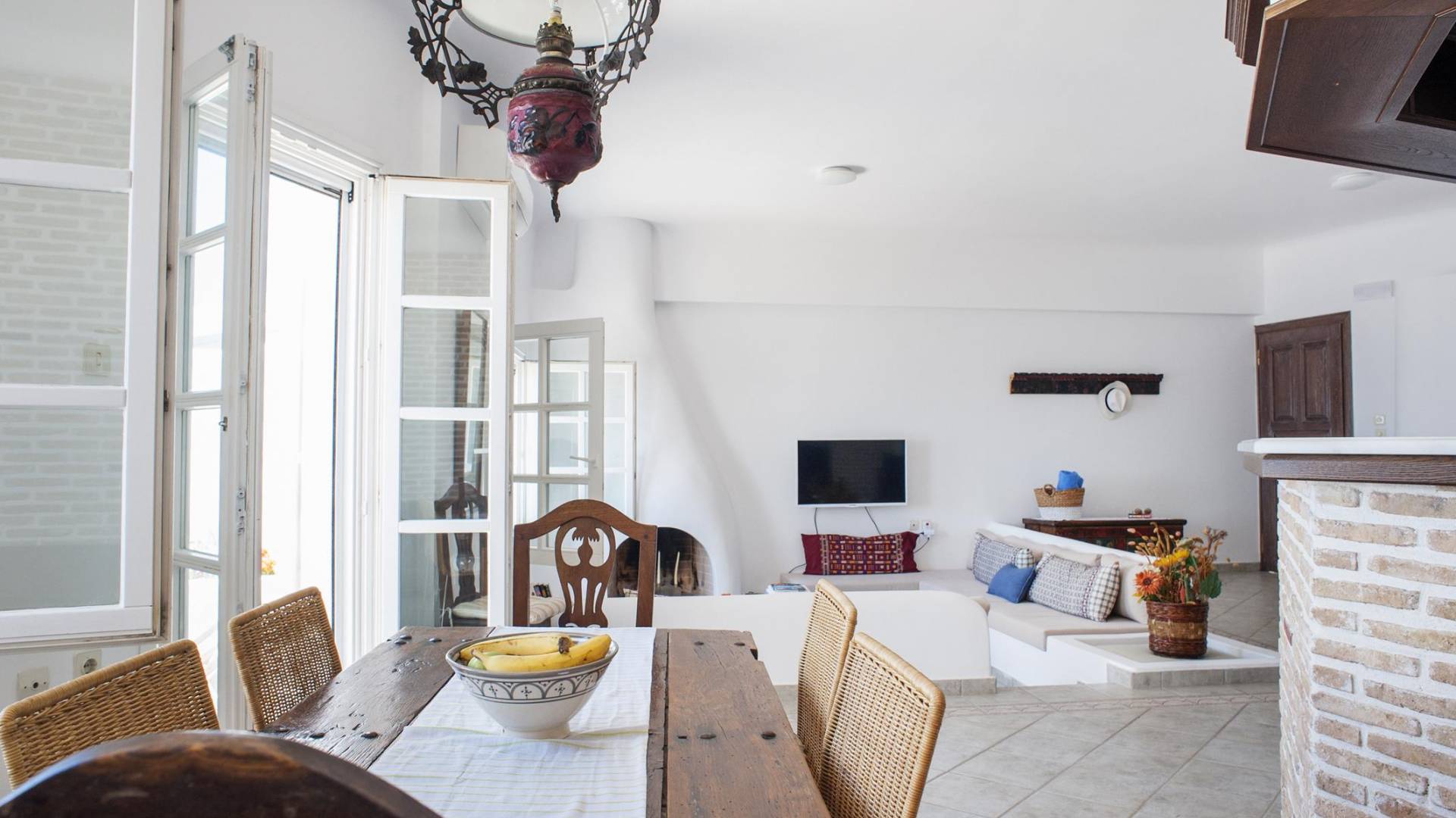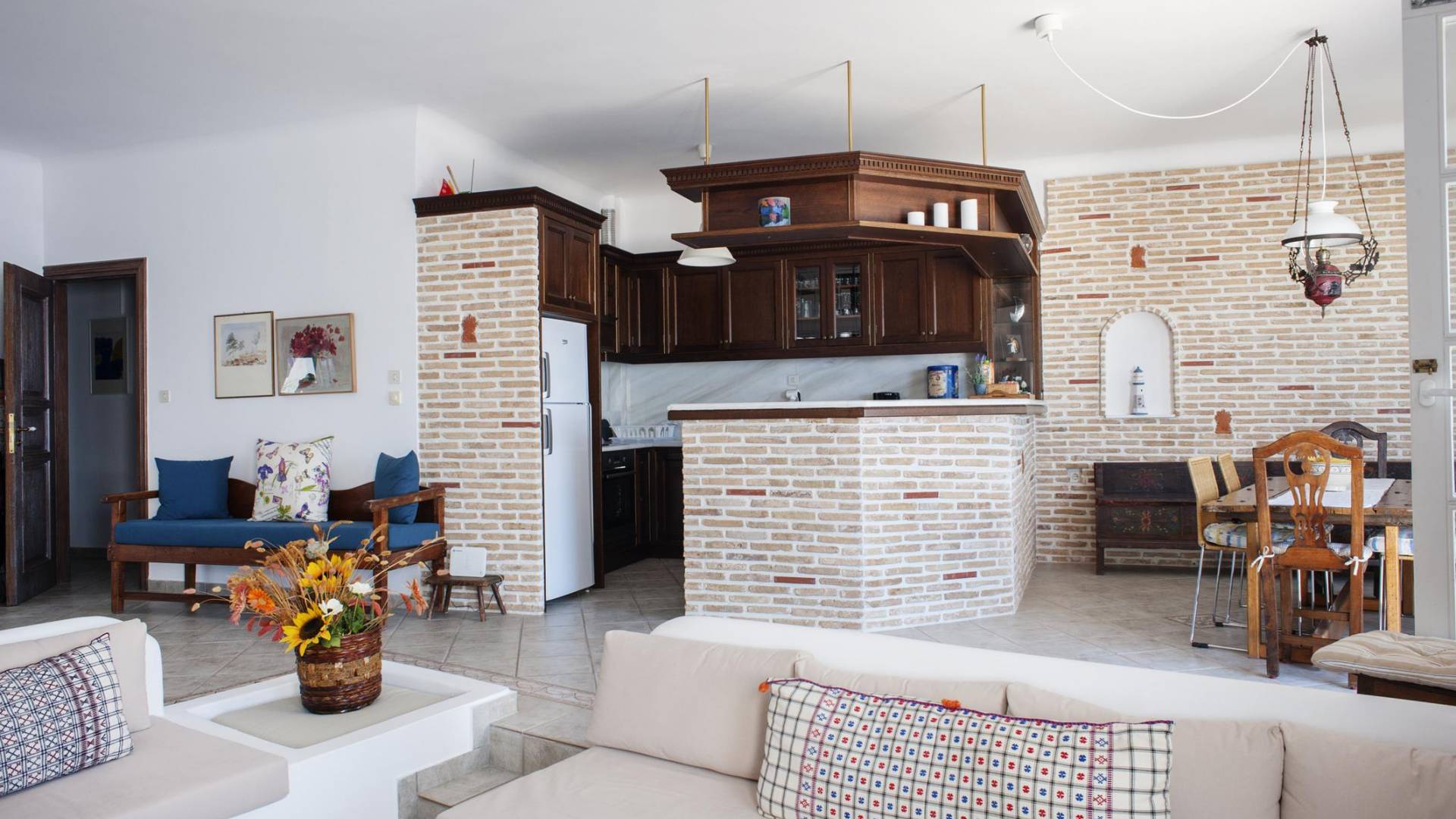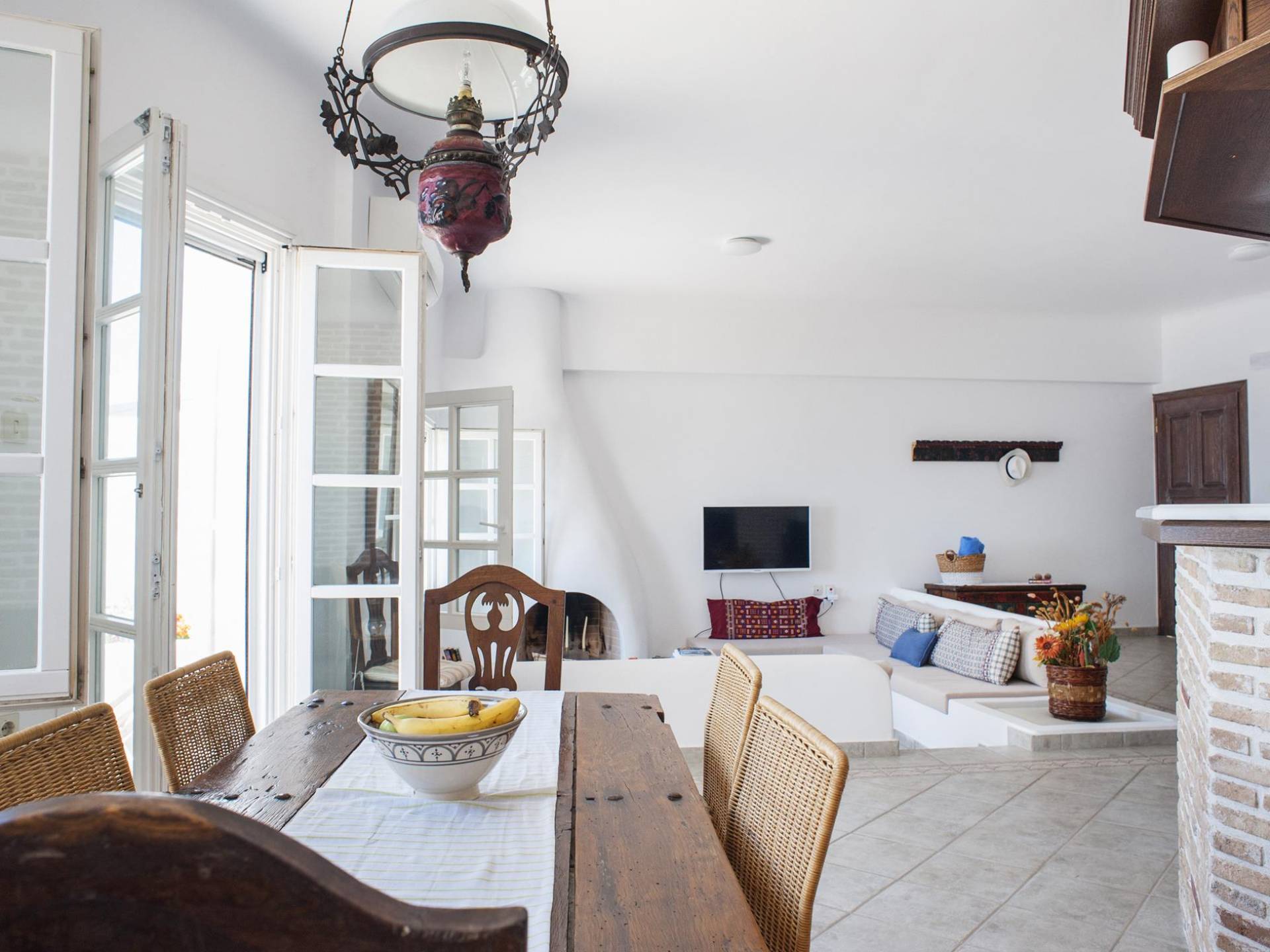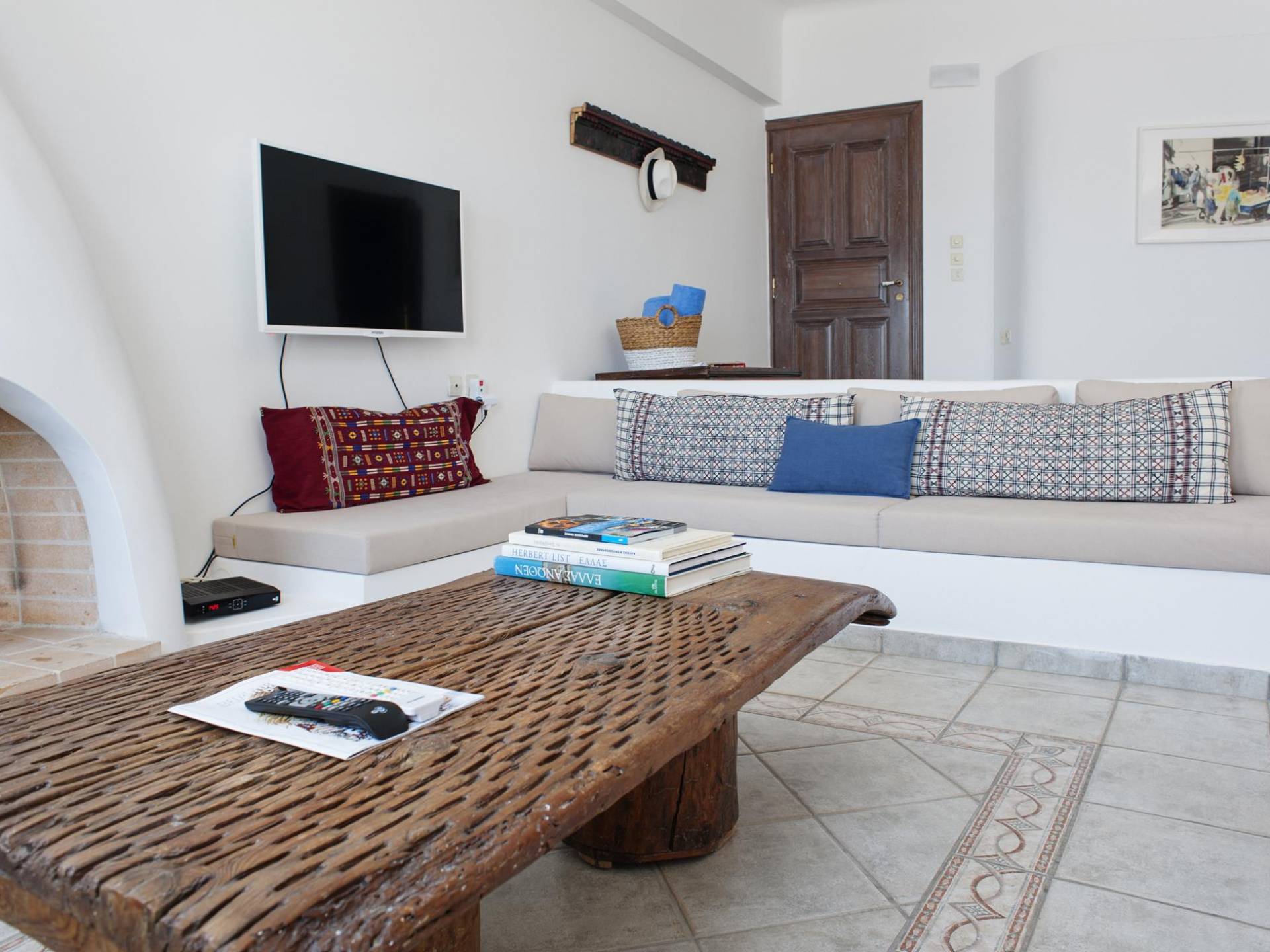 Oia Villa Clio Santorini is a large and spacious villa with vintage traditional furniture and fixtures. It was converted in the late ’70s from what used to be stables located on the cliffs of the Perivolas district, just a few steps from the main pedestrian walkway of Oia village. The large living space and 2 level balconies offer unobstructed panoramic views of the Caldera, the volcano, and Oia village, Santorini.