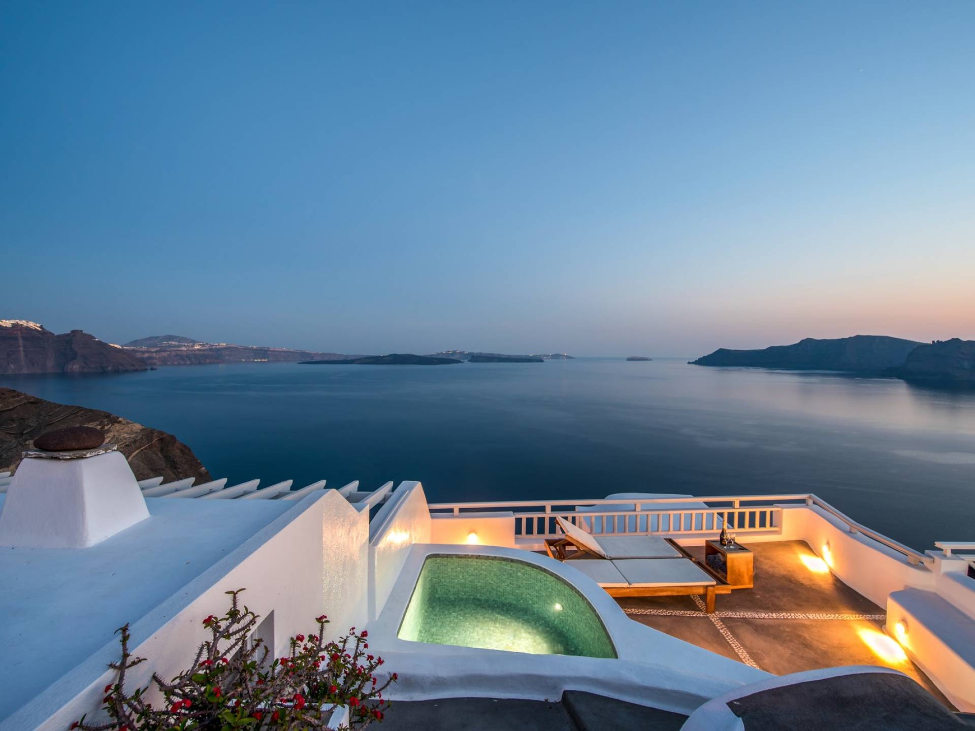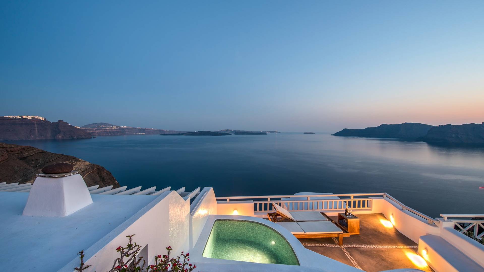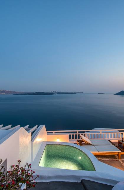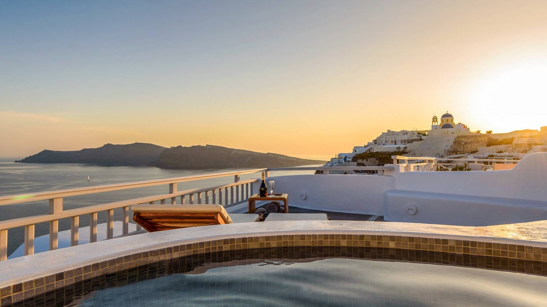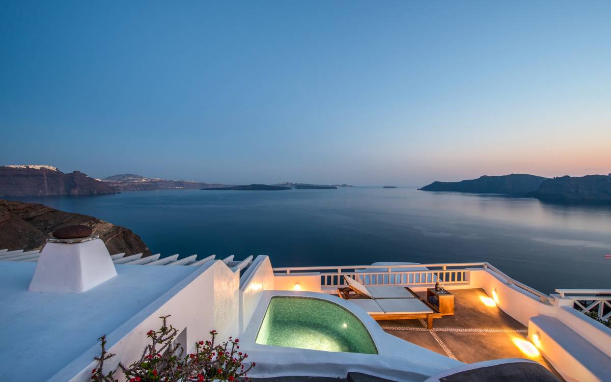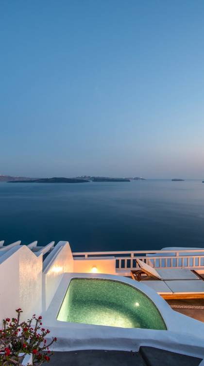 The stunning views, ultimate comfort, delicate elegance, and an air of nostalgia are the main characteristics of the Strogili Hot Tub Villa at Santorini.
