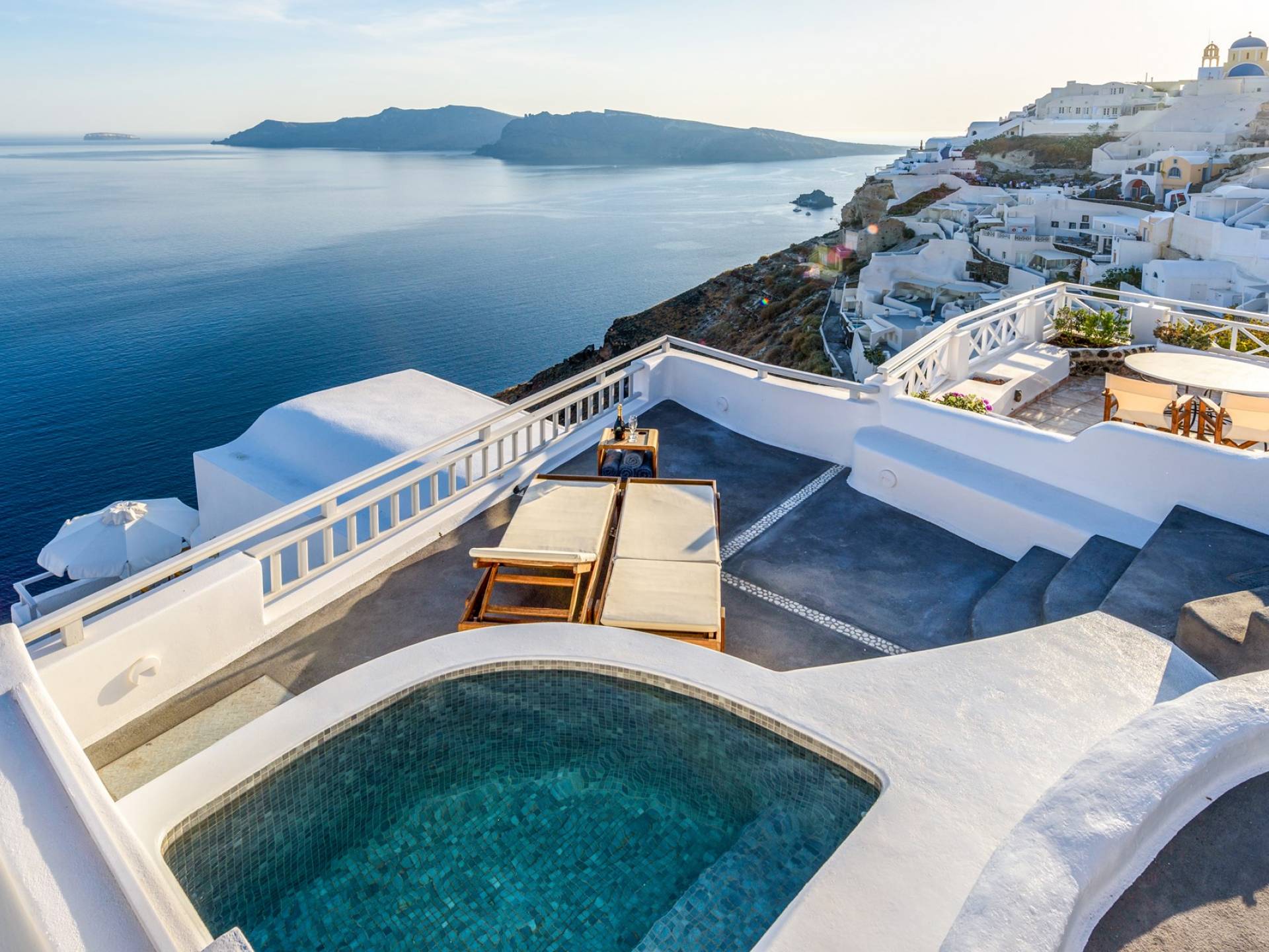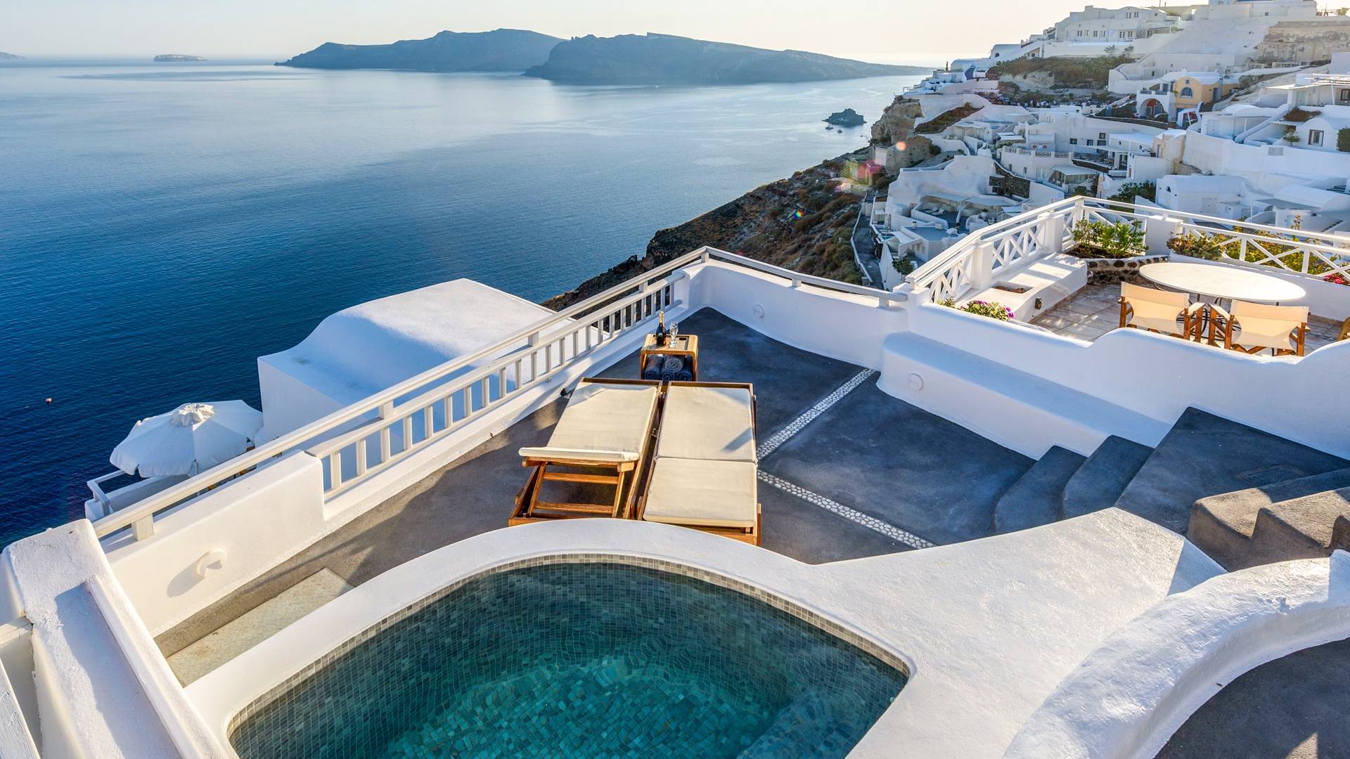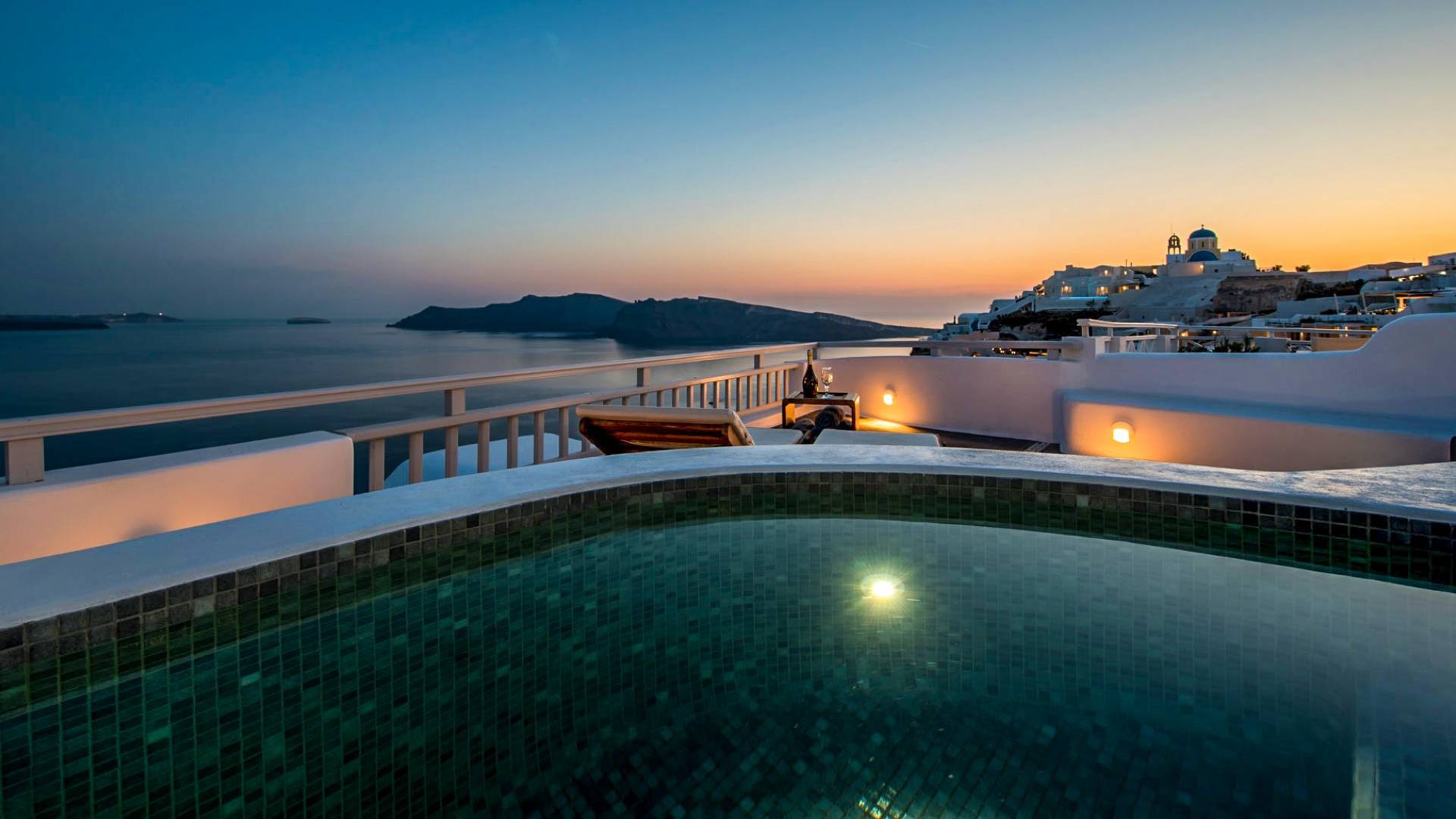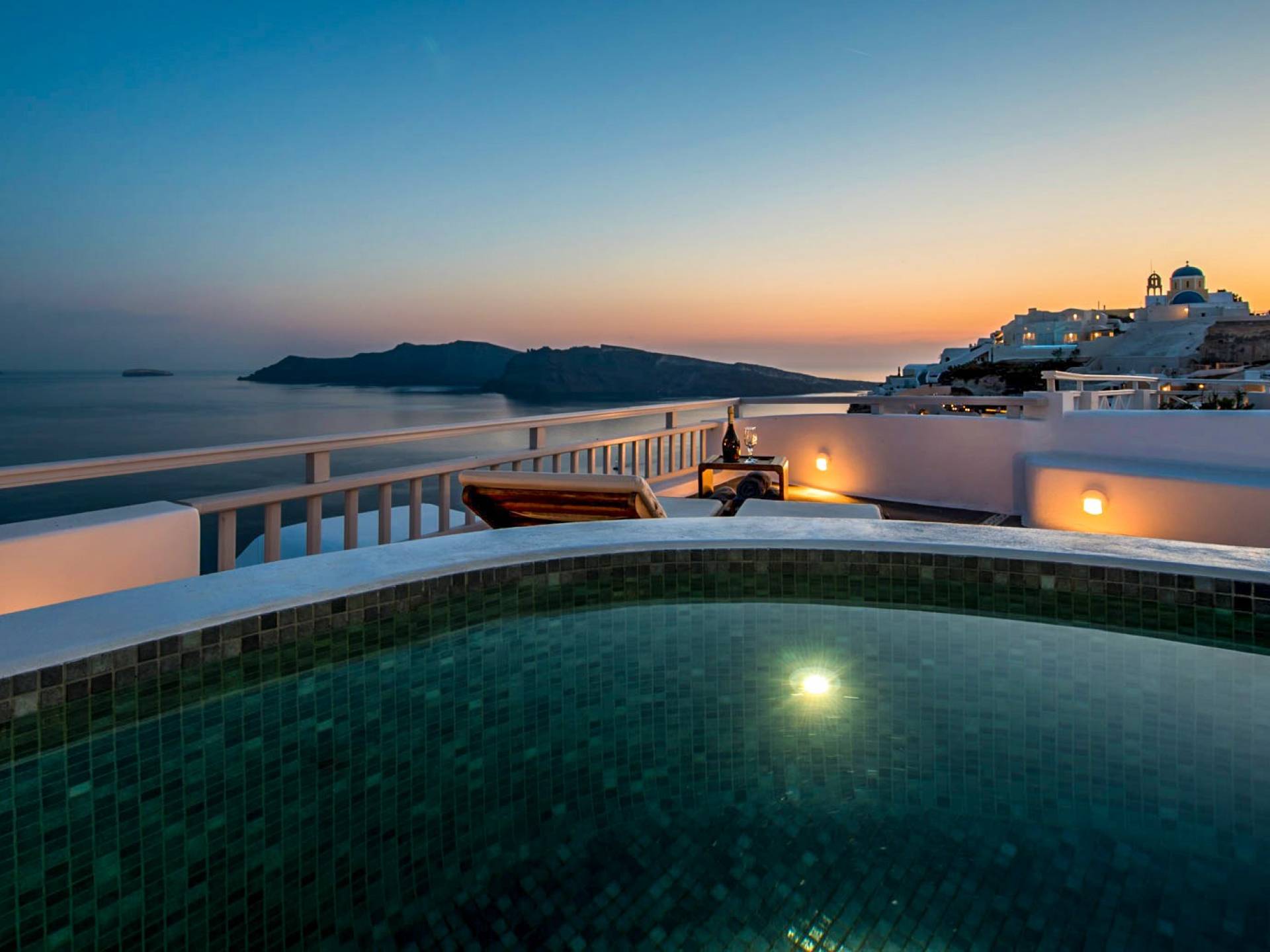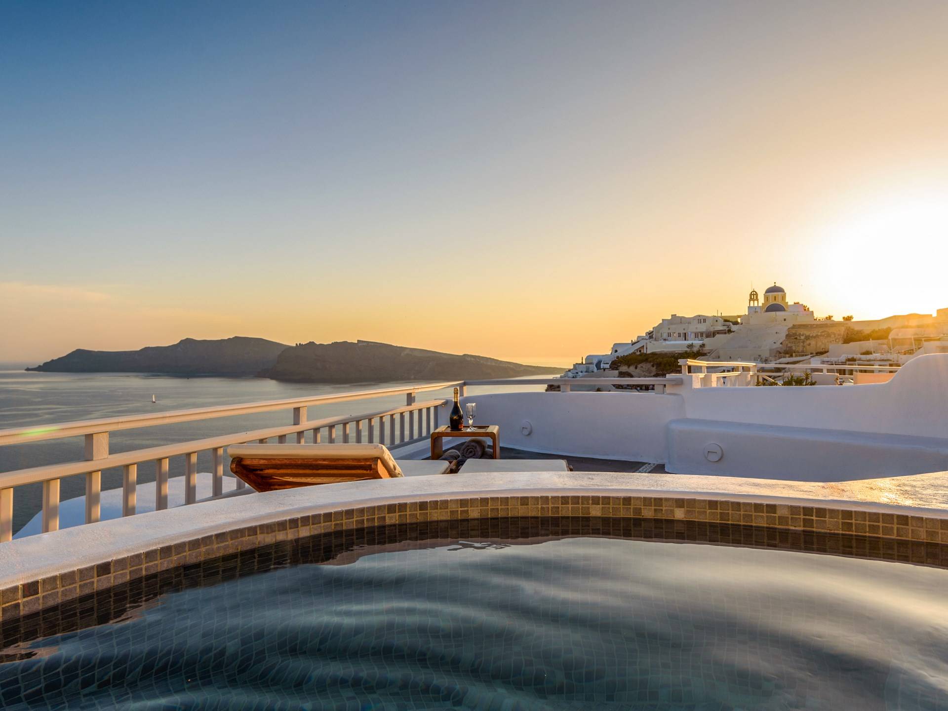 The stunning views, ultimate comfort, delicate elegance, and an air of nostalgia are the main characteristics of the Strogili Hot Tub Villa at Santorini.