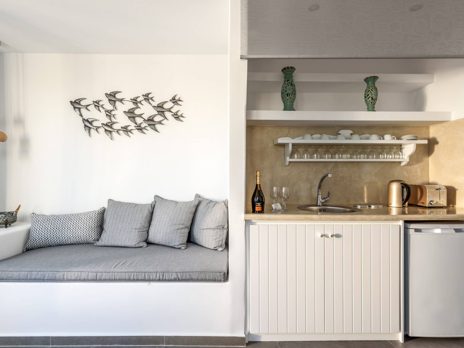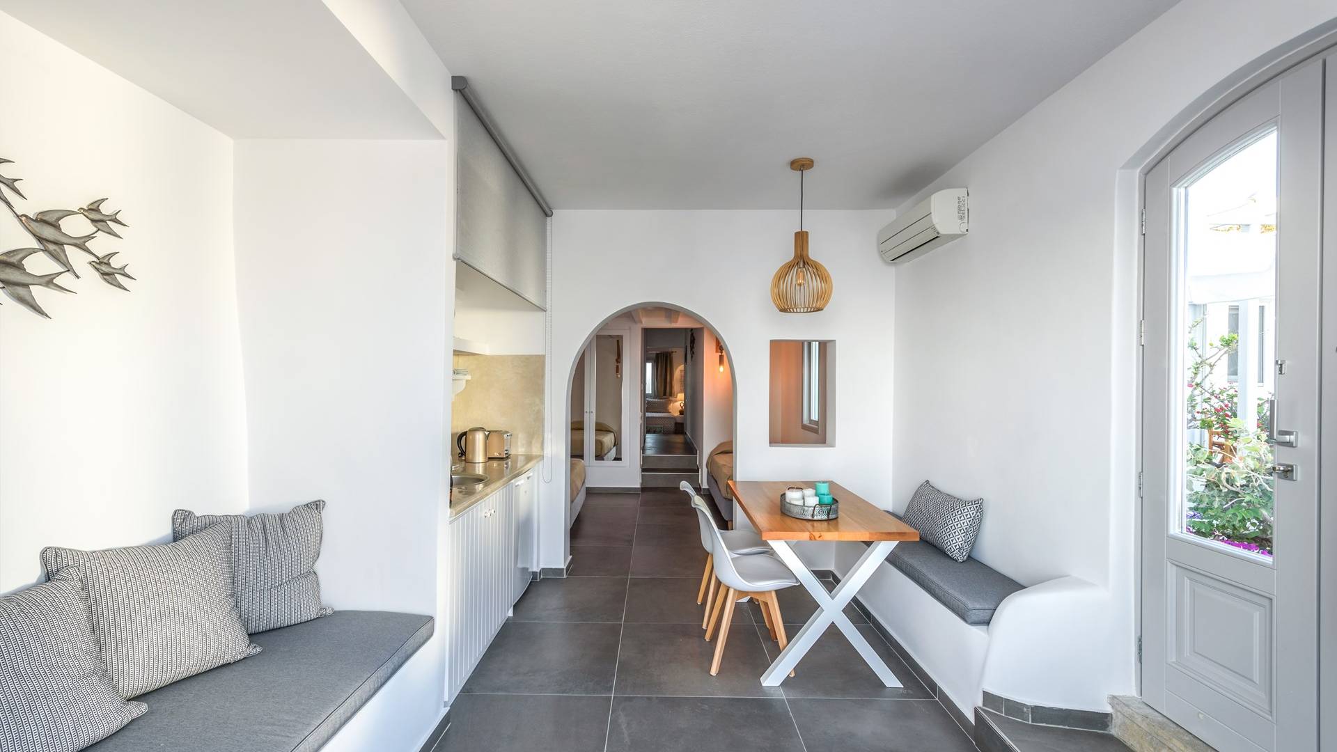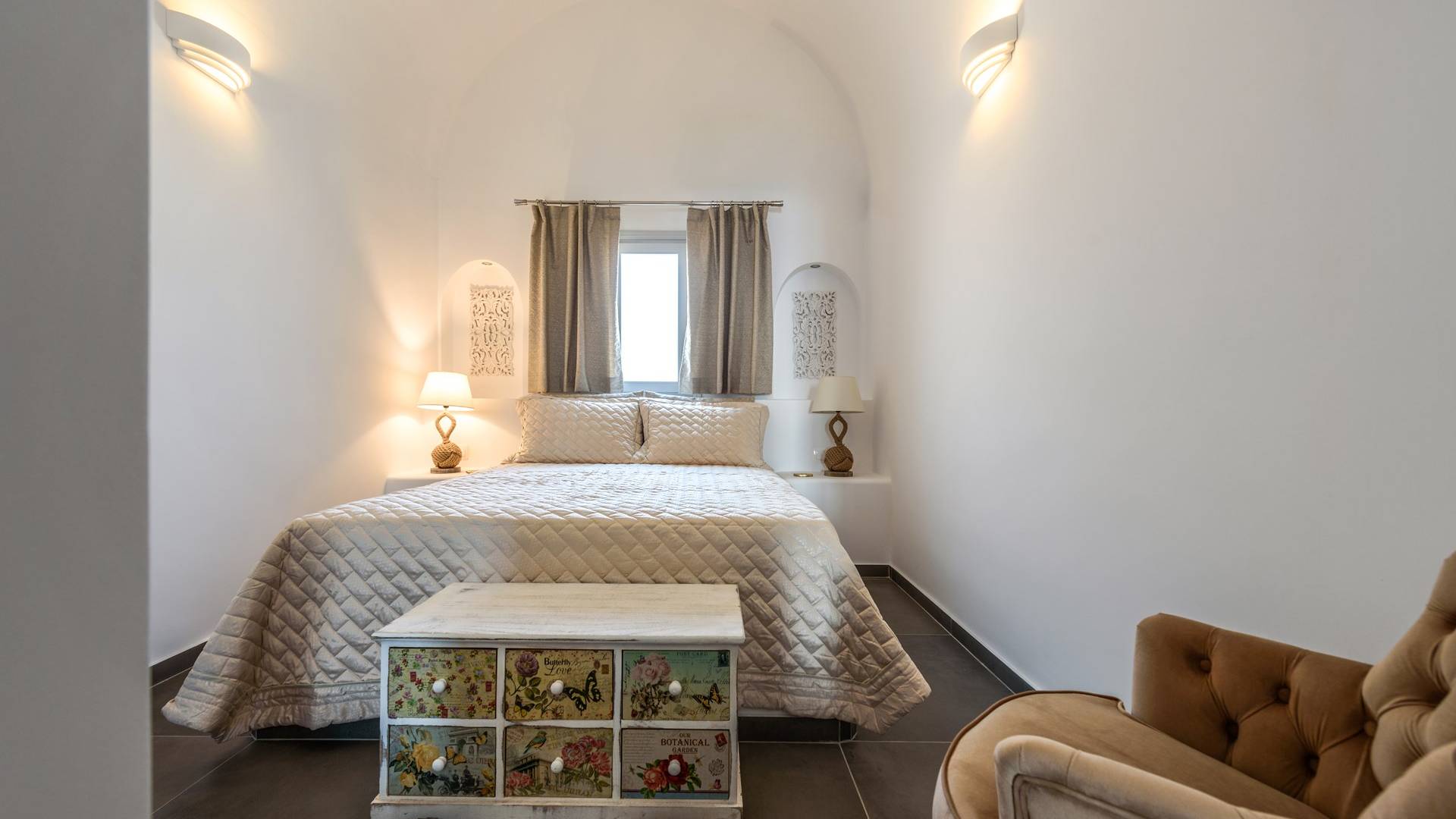 The villa can accommodate up to 4 people, consisting of an excellent layout, providing you with the absolute harmony and tranquility you desire during your Santorini Villa Holidays in Santorini. It boasts a family room/living room with two sofas, a table, and chairs, a sleeping area with two single beds, a bedroom with a double bed and a bathroom with a shower.