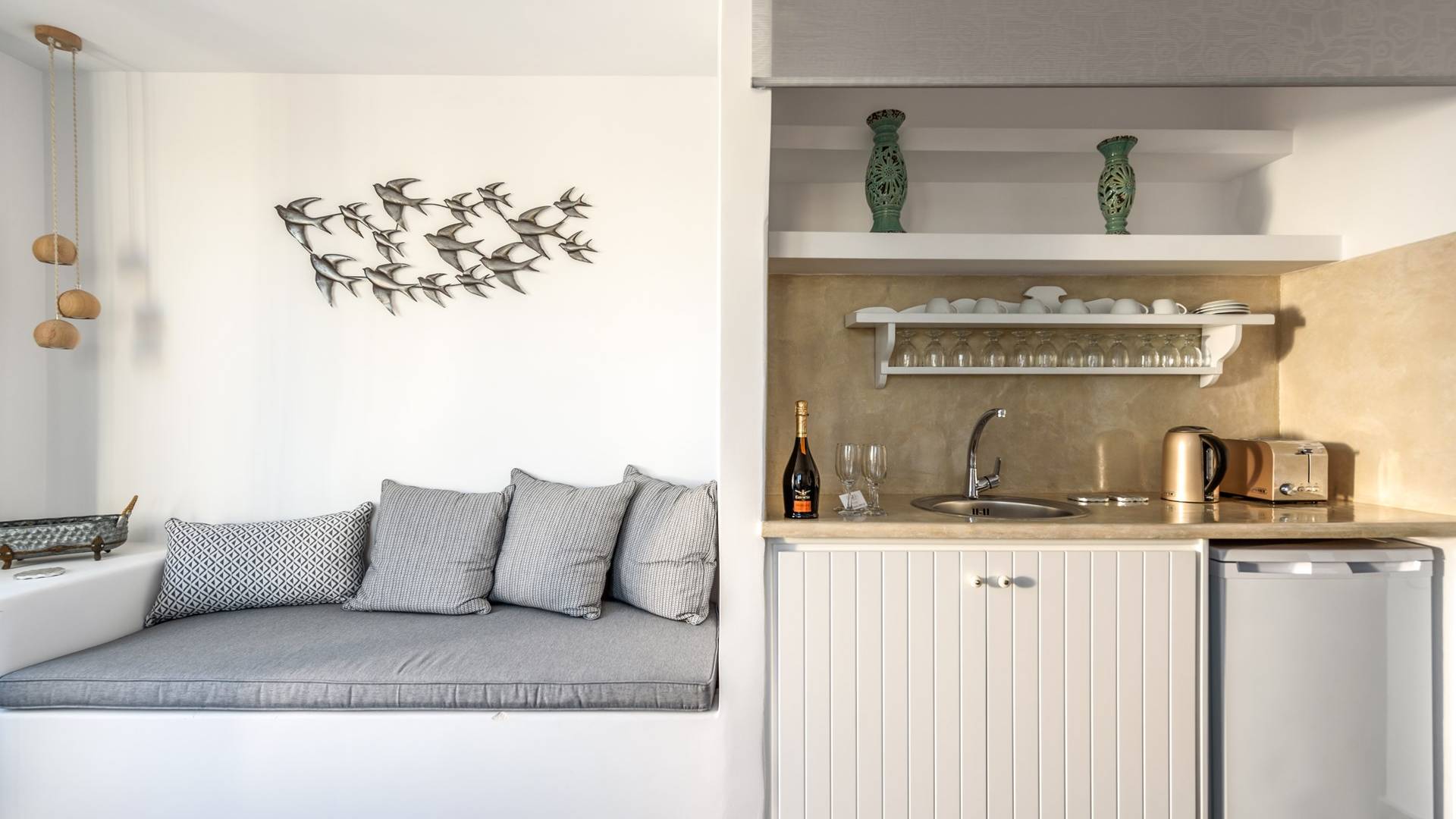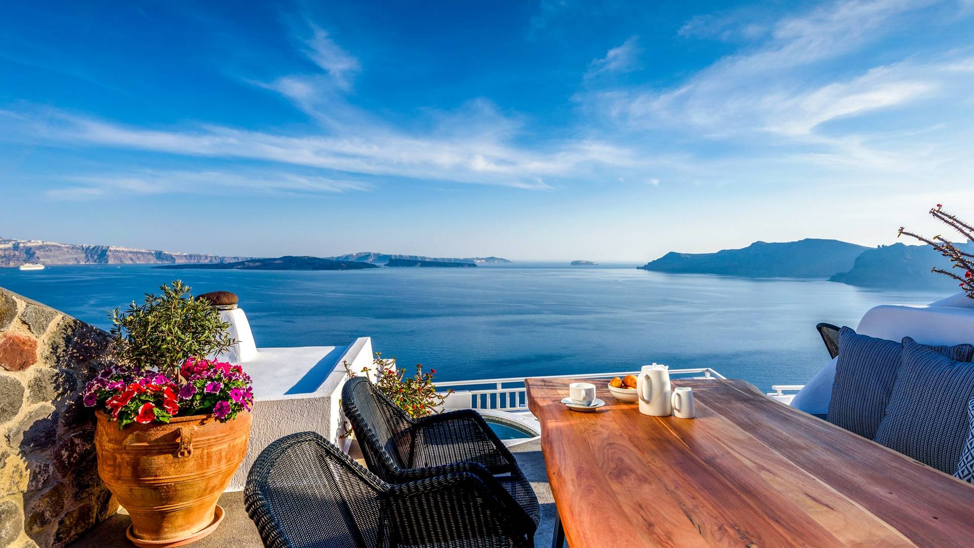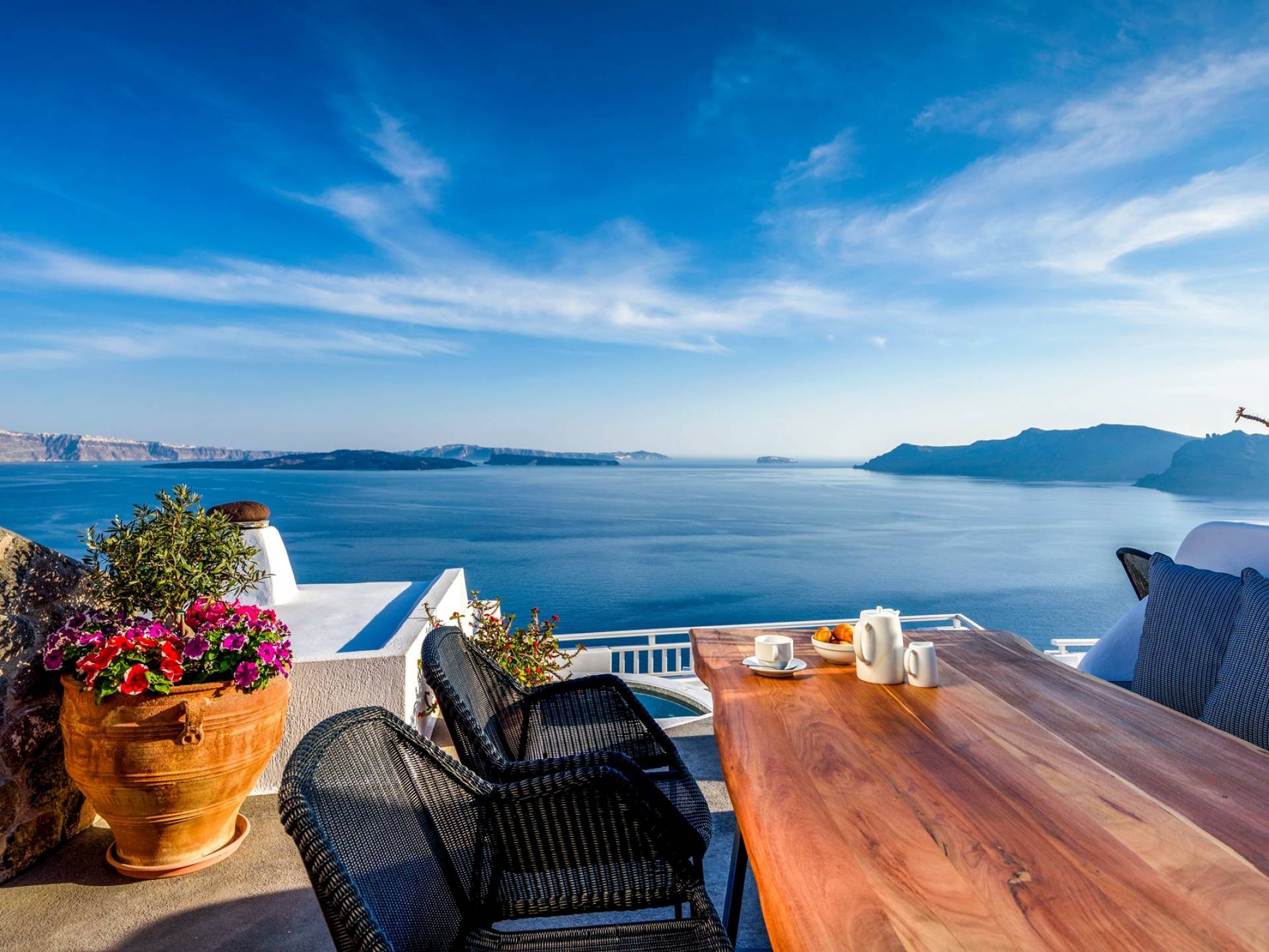 The villa’s veranda is furnished with sunbeds, a table & chairs, featuring an outdoor, hot tub, offering you ultimate relaxation while you are enjoying the magnificent sea views during your Santorini Villa Holidays.