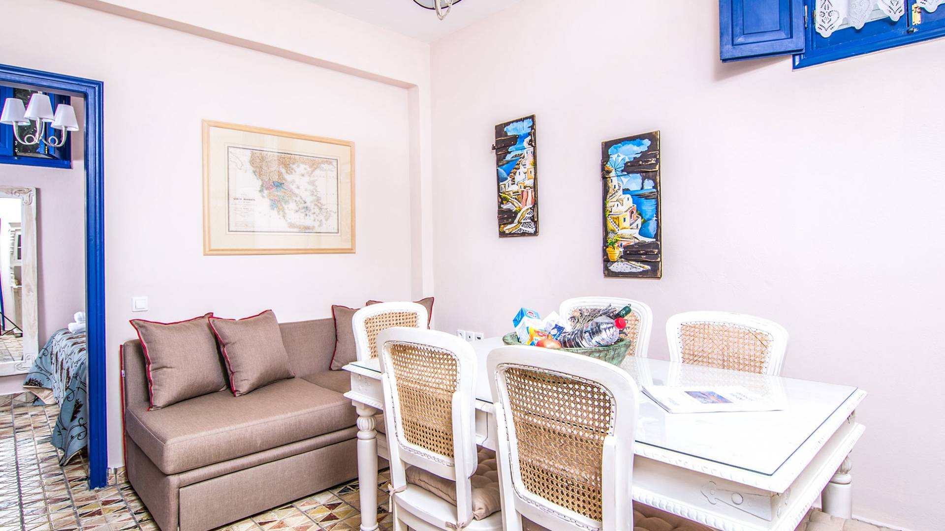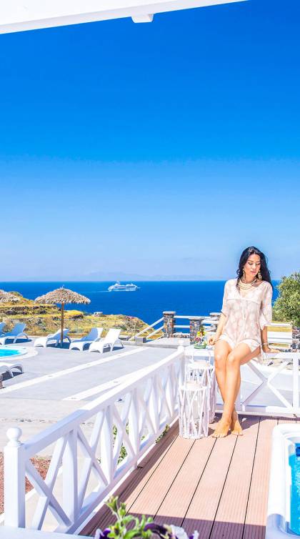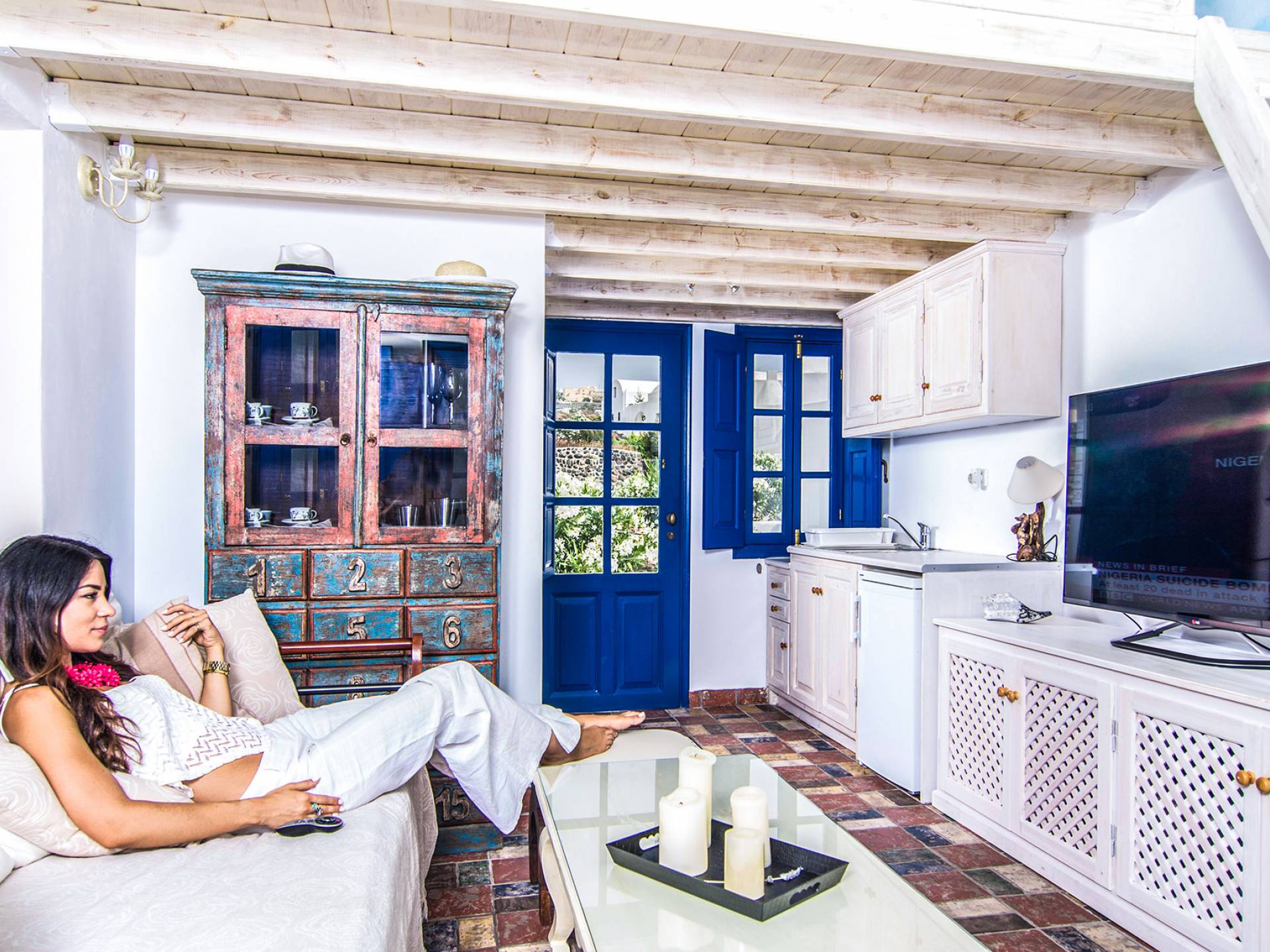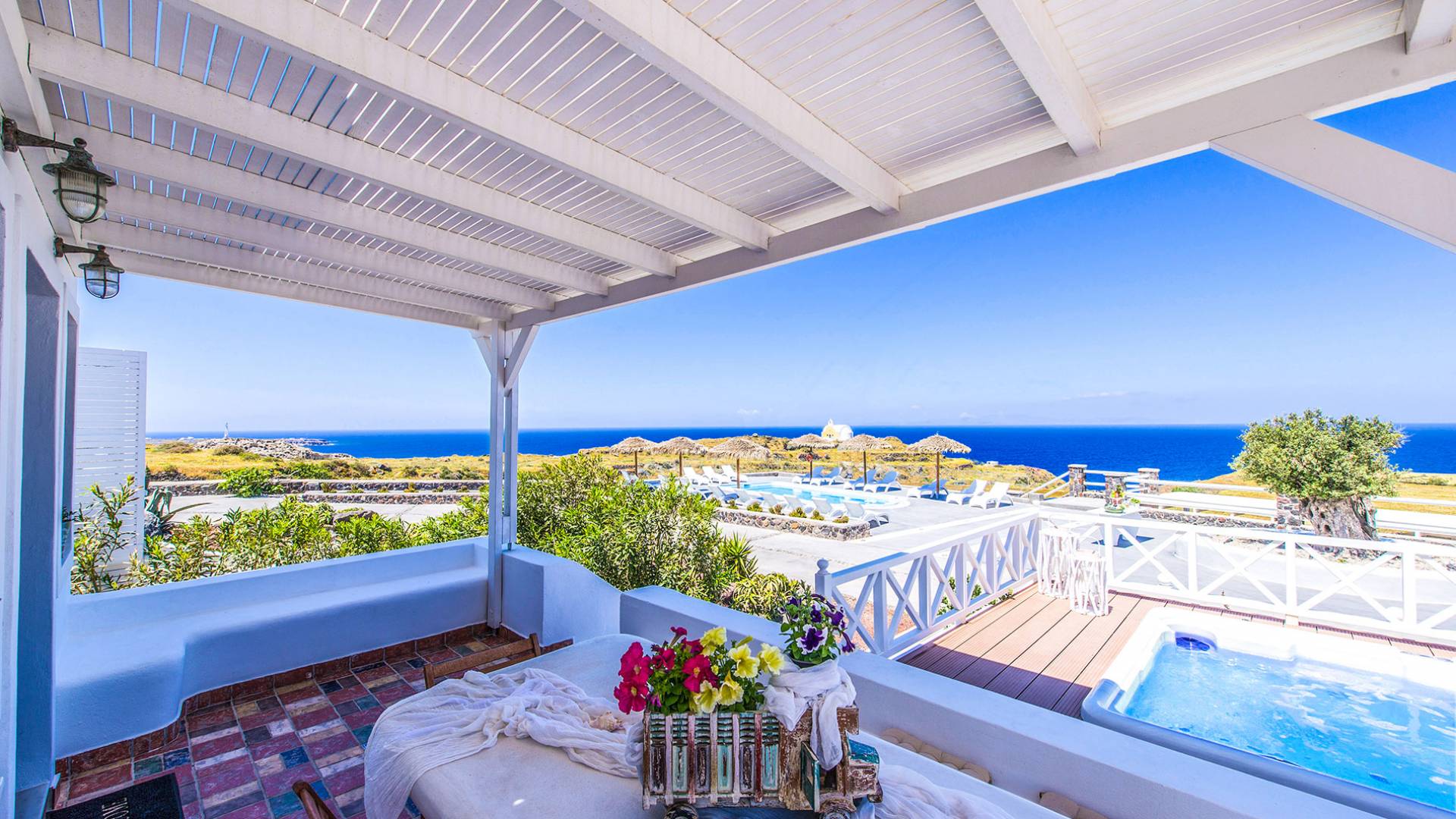 Outside there are a private yard and a balcony, overlooking the Aegean Sea and the most famous sunset, with a dining area for 8 persons to enjoy alfresco dining. Also, there is a private outdoor heated hydro massage spa (for 5 persons) and two communal use swimming and sunbathing pools, which combined with the perfect sea view, will keep you there the whole day. The luxury combined with the ultimate privacy offers you an unforgettable stay and a unique experience.