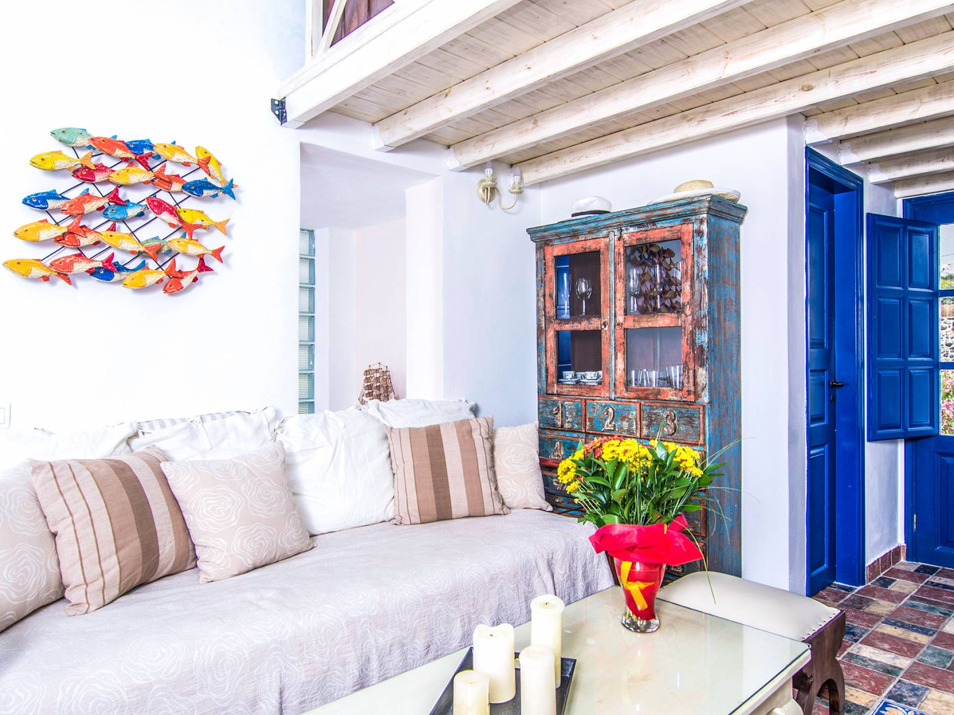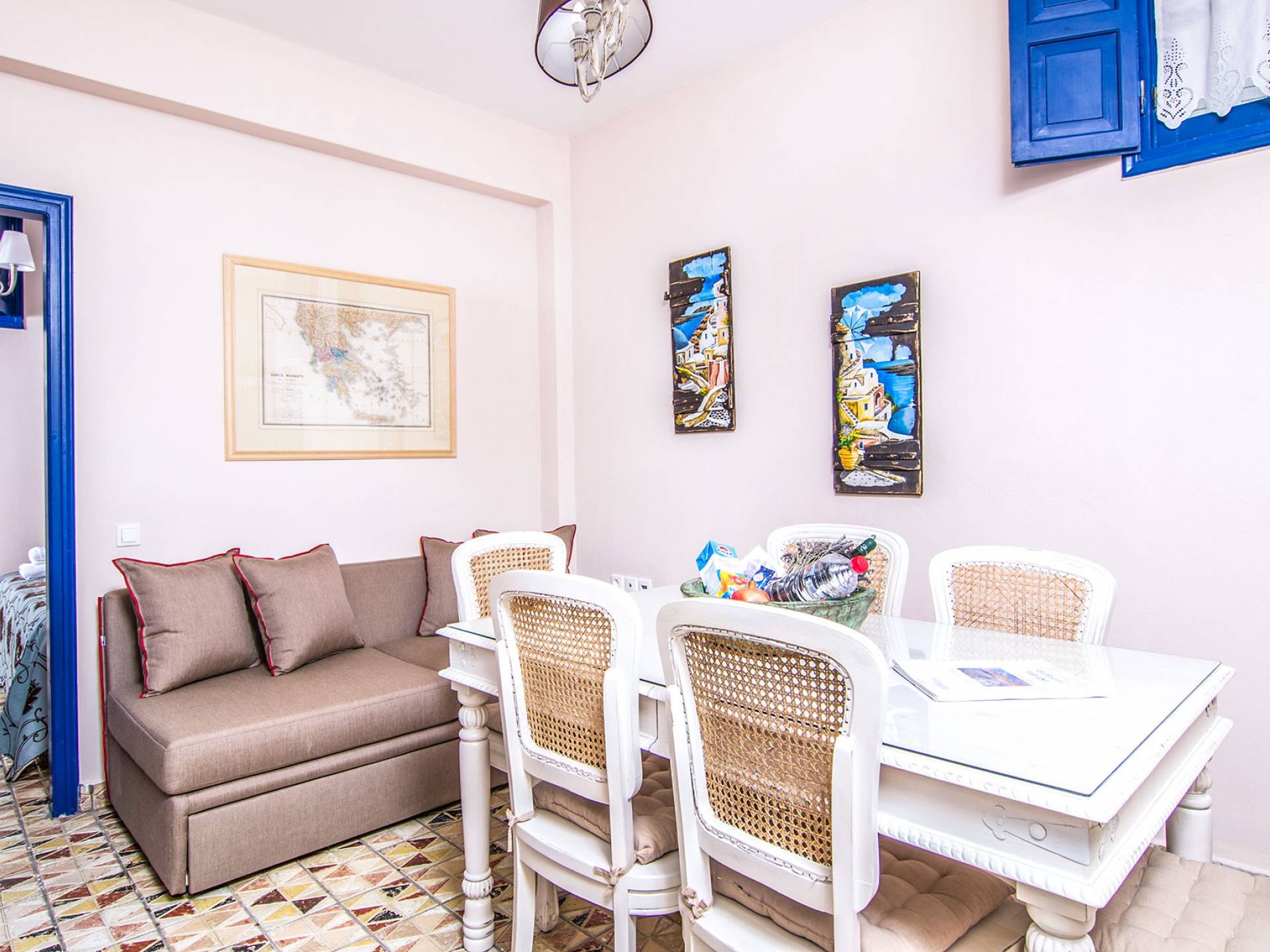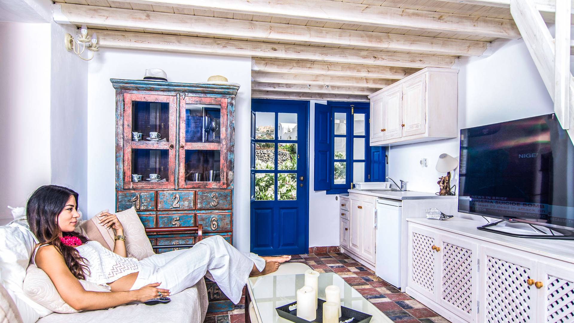 Outside there are a private yard and a balcony, overlooking the Aegean Sea and the most famous sunset, with a dining area for 8 persons to enjoy alfresco dining. Also, there is a private outdoor heated hydro massage spa (for 5 persons) and two communal use swimming and sunbathing pools, which combined with the perfect sea view, will keep you there the whole day. The luxury combined with the ultimate privacy offers you an unforgettable stay and a unique experience.