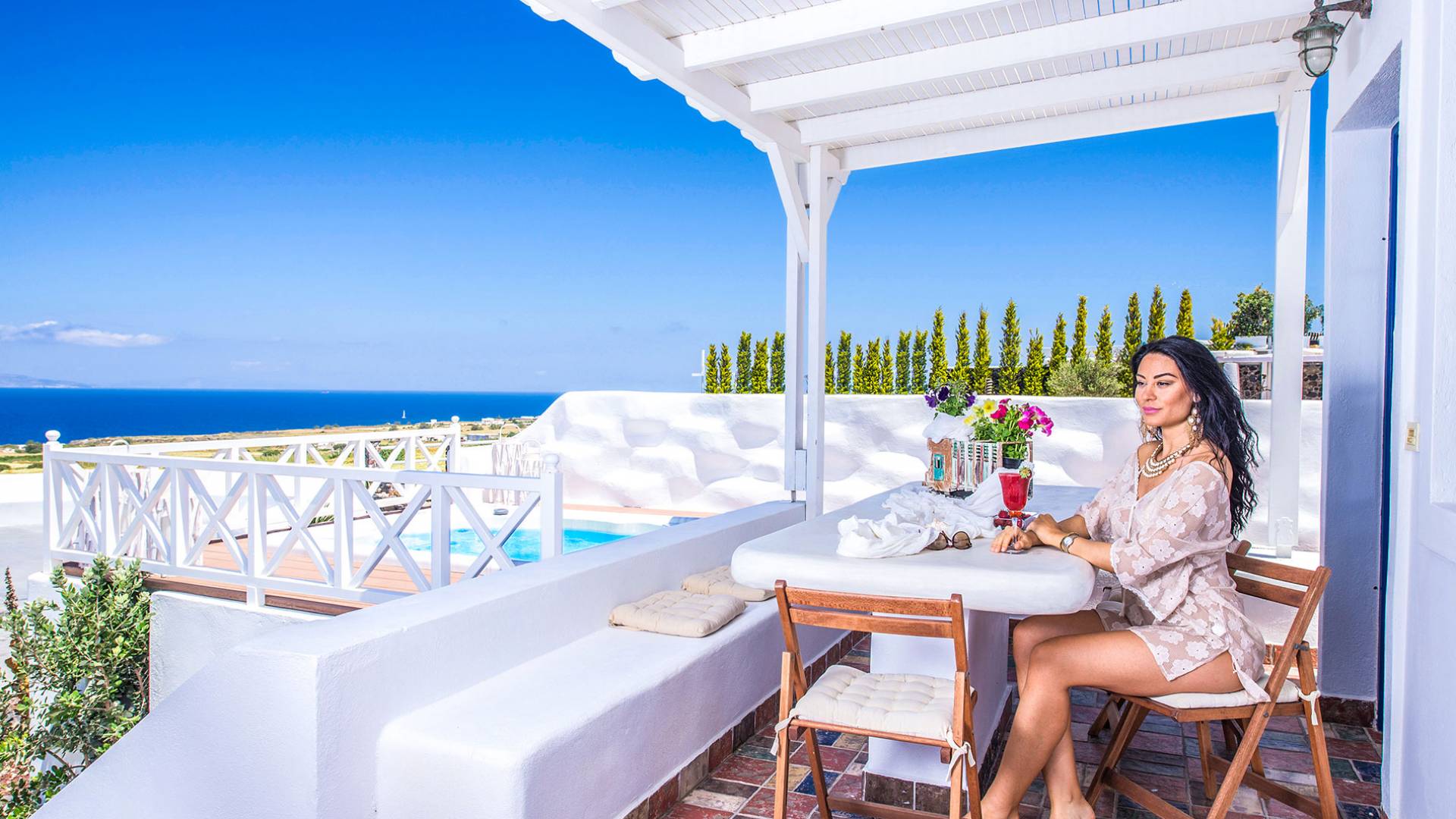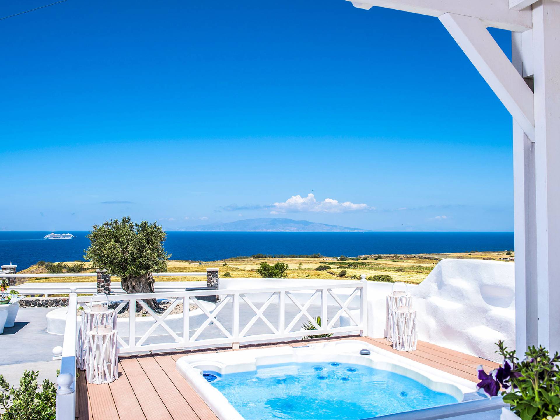 Villa Emerald at Oia Sunset Villas Santorini is one of six traditional houses, elegantly decorated. Villa Emerald is located in the north of Santorini Island in the traditional settlement of Oia village. Villa Emerald at Oia Sunset Villas Santorini will appeal to those looking for a luxury home that is among peaceful Oia surroundings. The luxury combined with the ultimate privacy offers an unforgettable stay and a unique experience. Enjoy the traditional Cycladic architecture, the simple luxury, the experience of sunset views. Relax body and soul in a private outdoor heated Jacuzzi hydro massage spa. Luxuriate to the swimming and sunbathing pools with this splendid sunset view. While the sun sinks into the sea, its splendid colors spread throughout the sky. It literally takes your breath away! Get a front-row seat on the terrace of the villa and enjoy a drink, while watching the setting sun produce an array of colors beyond your imagination. Villa “EMERALD” is specially designed for persons and families, who want to live the extraordinary!