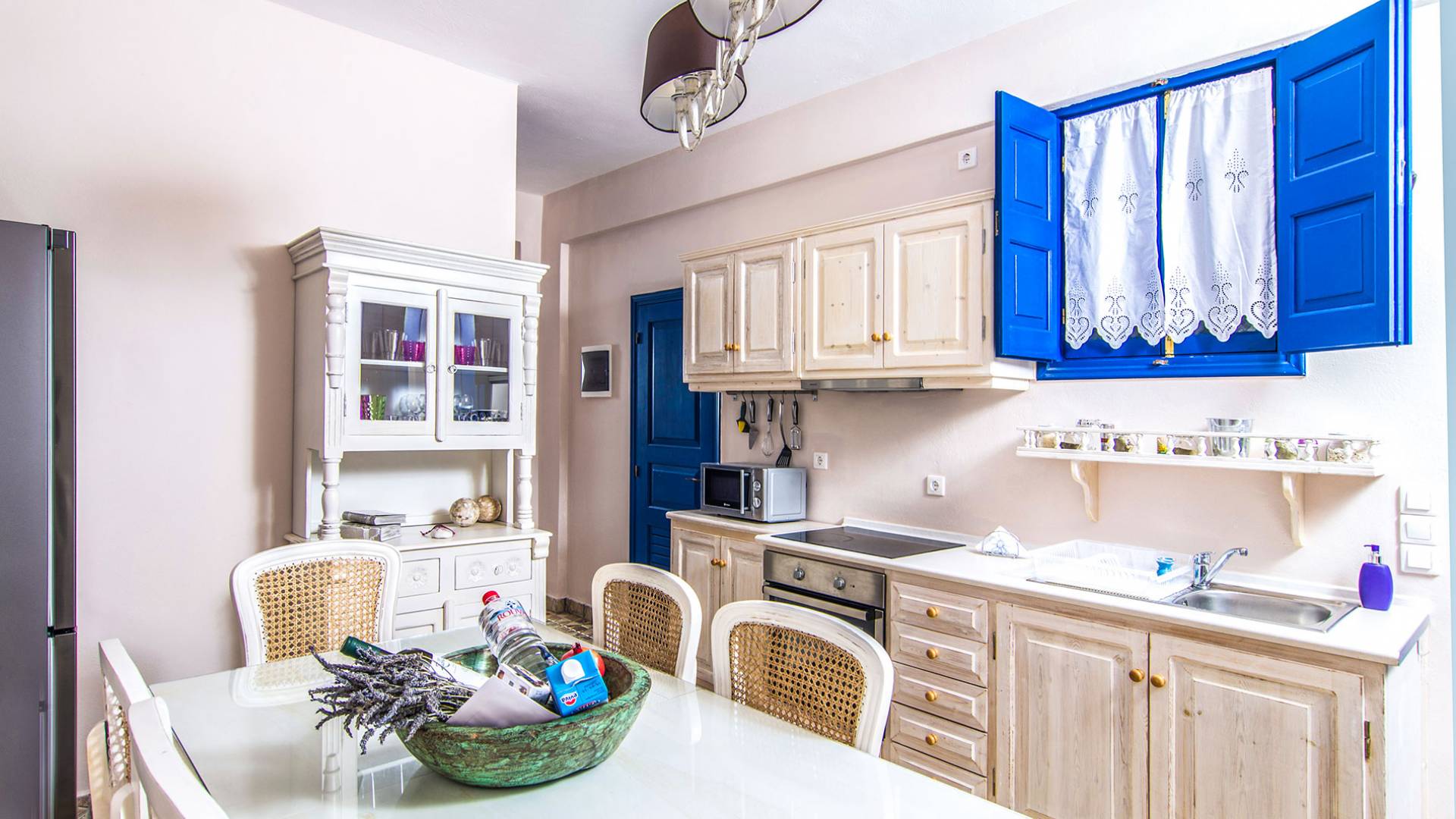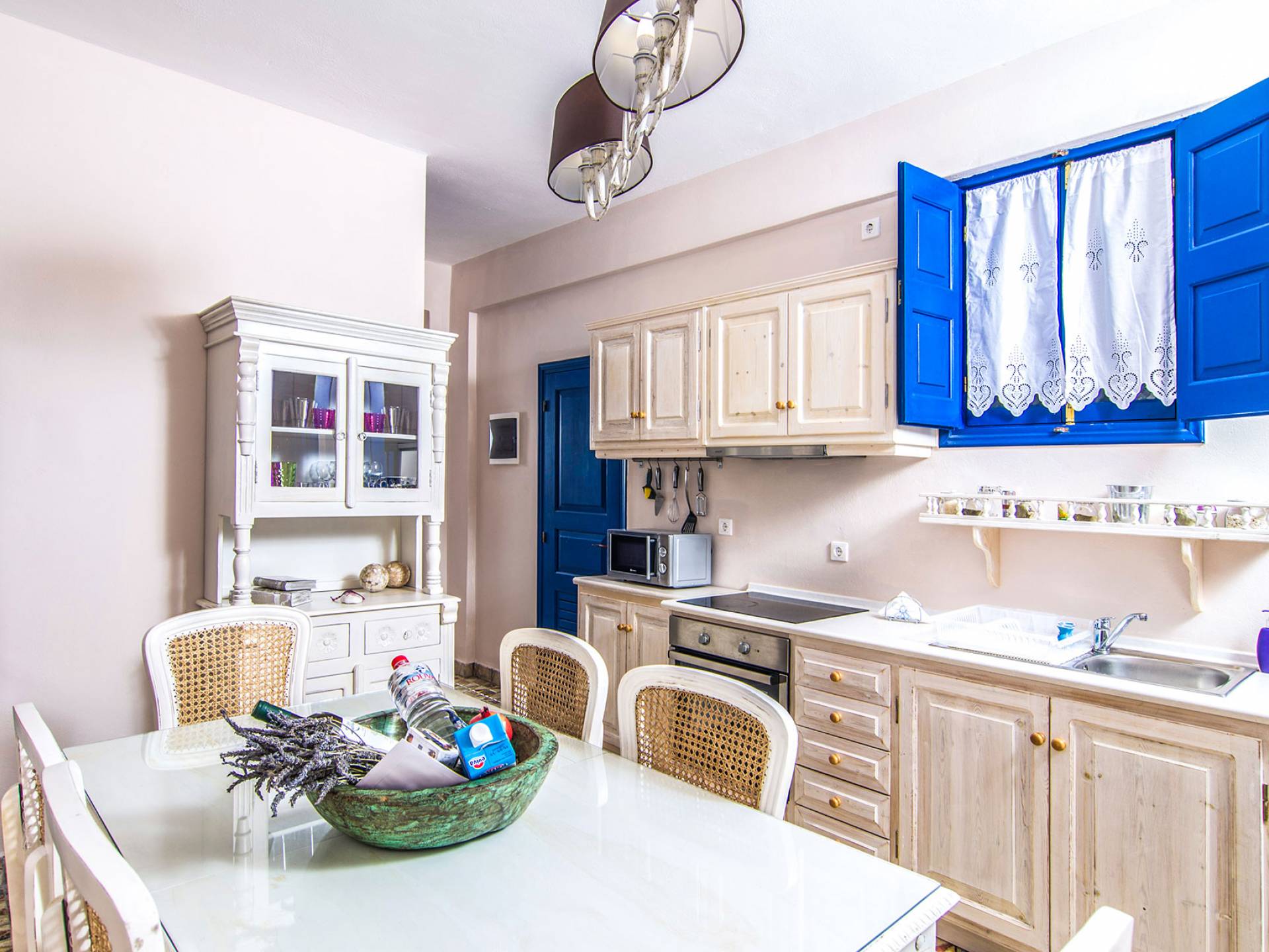 Inside there are 3 bedrooms (1 double king size bed, 2 singles extra size beds at the lower level, and 1 extra double king size bed at the upper-level loft, which is separate from the others, with its own bath & living room). In addition, at the lower level, there is a sofa, which easily transforming to a double queen bed. All bedrooms have wardrobes and air-conditioning. We provide you eco-friendly mattresses & upper bedclothes, as well as feathered pillows. Also, in case that you needed, there are a baby cot and an extra single folding camp bed. There is a full equipped kitchen with blender, electric Grill, electric Stove, refrigerator, toaster, filter and nespresso coffee maker, boiler, dishes, cooking utensils, pantry items, and other modern facilities as well as a kitchenette. Also, there is a comfortable dining room for 6 persons. There is a bathroom on each level, equipped with toilet, shower, bath towels, hypoallergenic shampoo and shower gel, hair dryer, 220V supply to shaver point and washing machine.