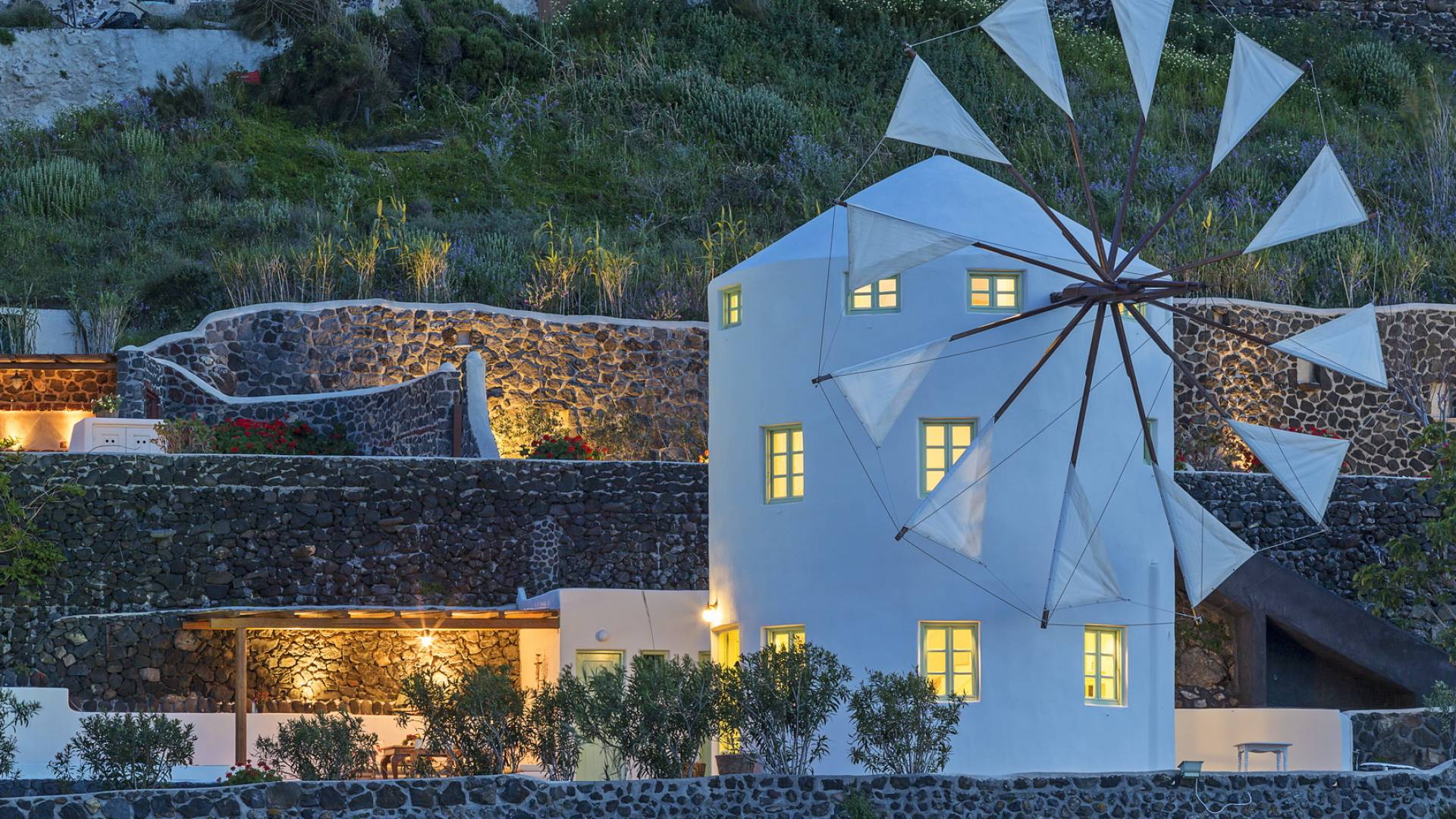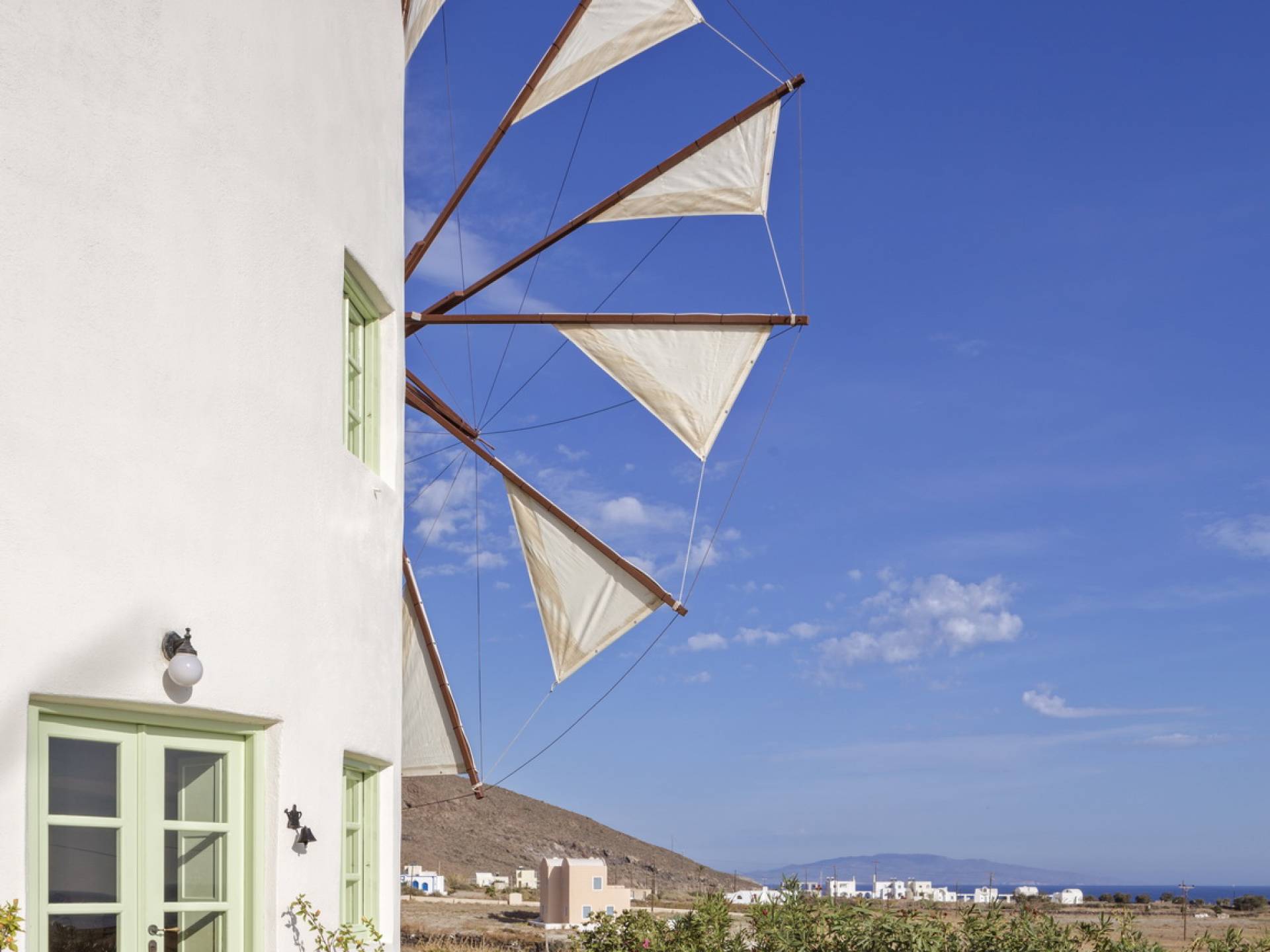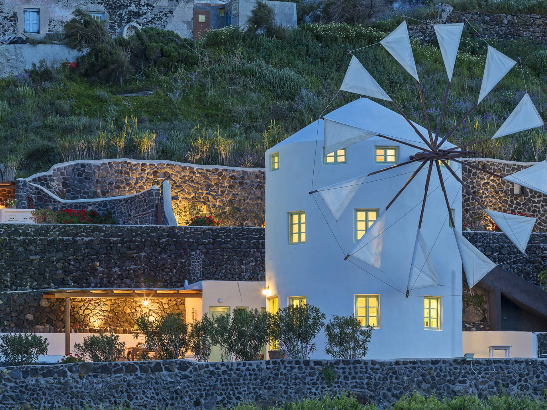 Santorini Windmill Villas is a complex of three new-built similar Luxury Windmills located at the beautiful island of Santorini. The unique, private location of the villas offers a panoramic view of the Aegean Sea and the sunrise reflections on the surface of the sea which are visible even from your bed.
