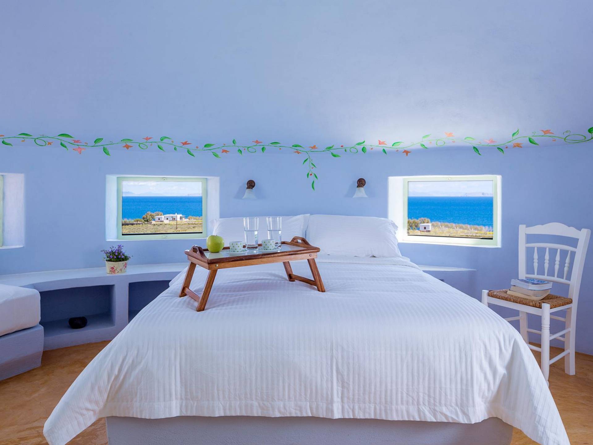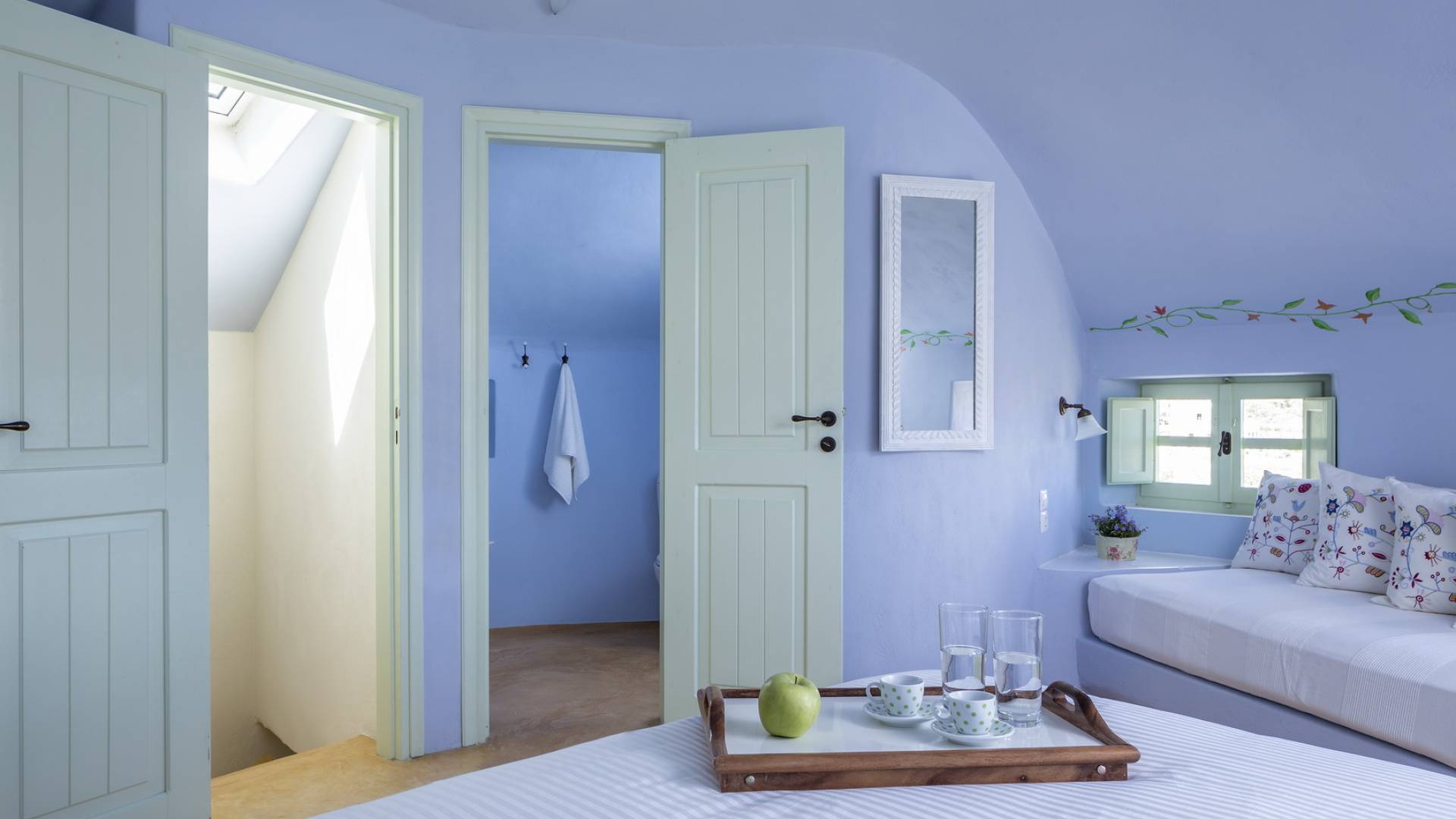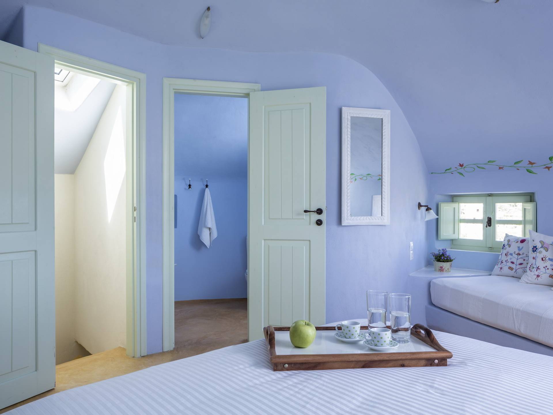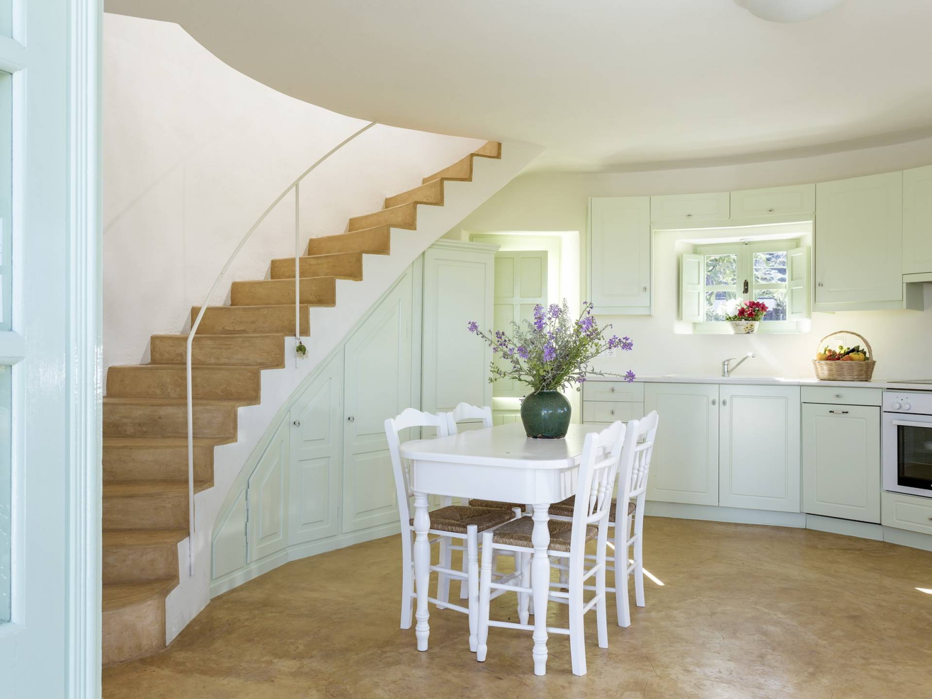 The ground floor with the small luminous windows and the panoramic view of the vineyards, the sea, and the swimming pool consists of a living room, a dining room, and a fully equipped kitchen. The first-floor bedroom with a romantic ambiance features a built double bed and a wonderful en-suite bathroom. The second-floor bedroom is a fabulous cone-shaped room with an en-suite bathroom. This room includes a double-built bed and a single one, which can be used as also a couch.