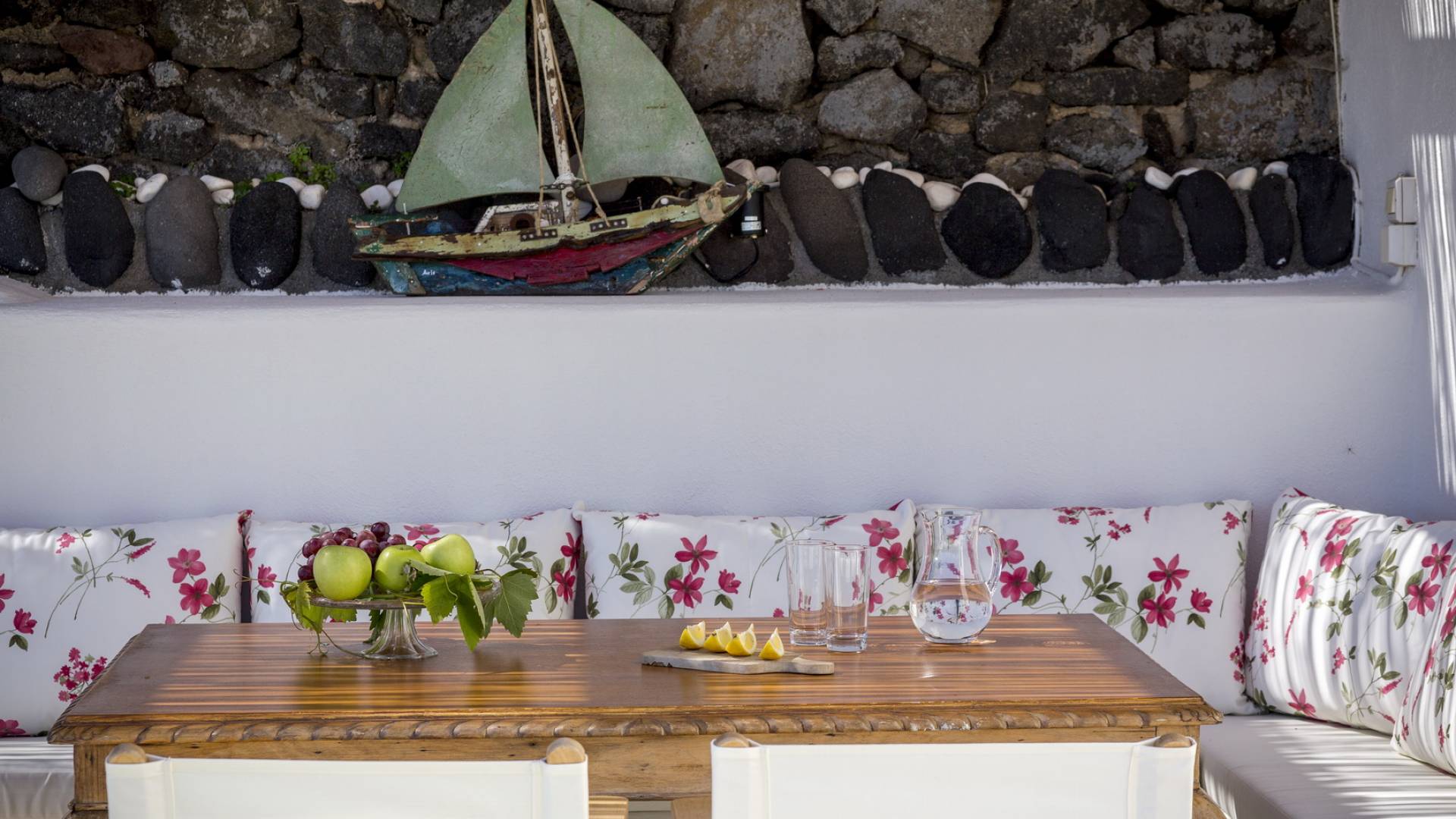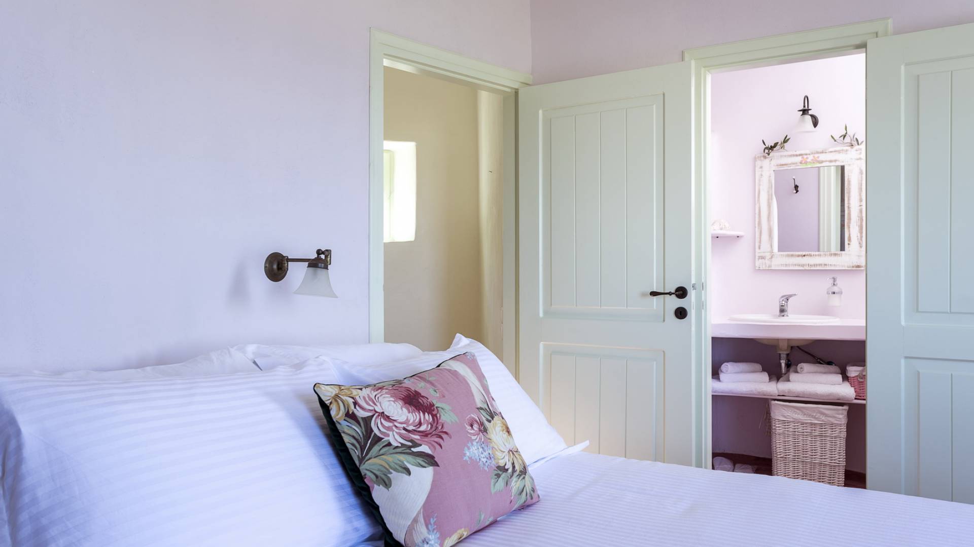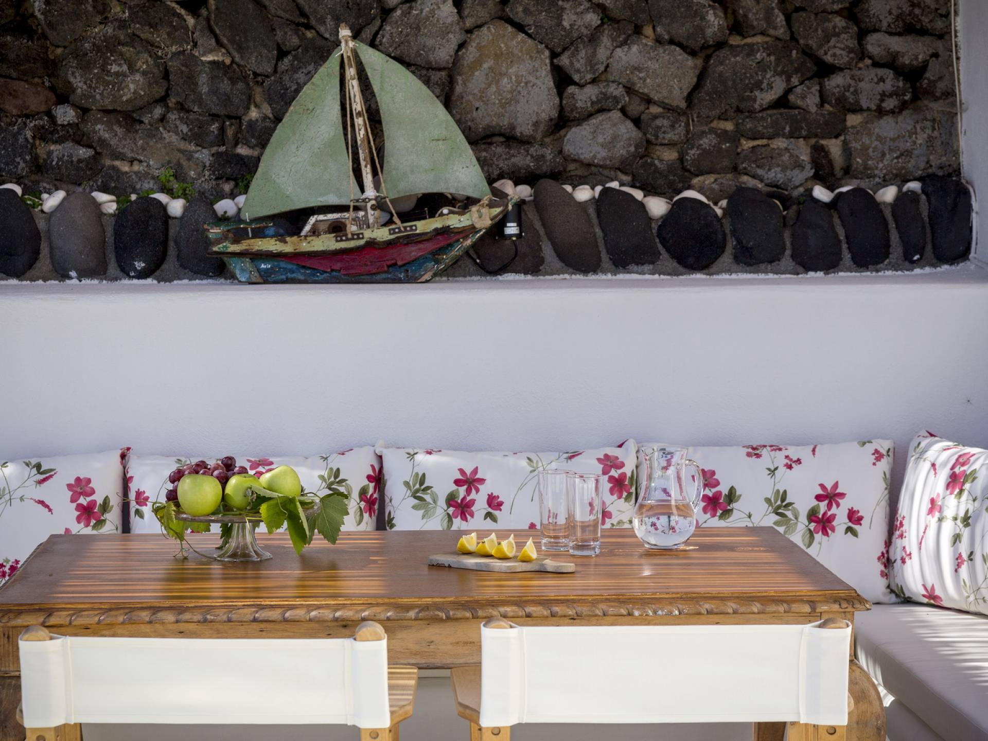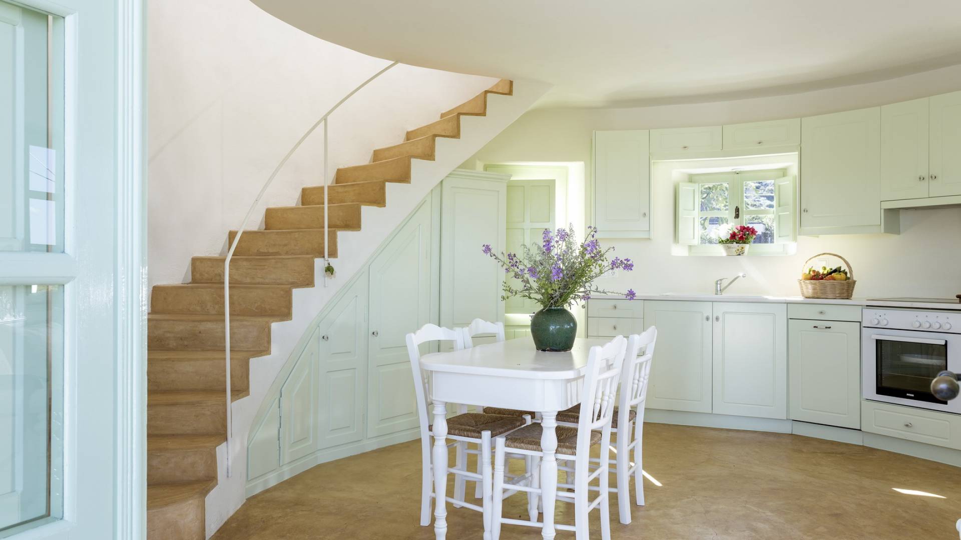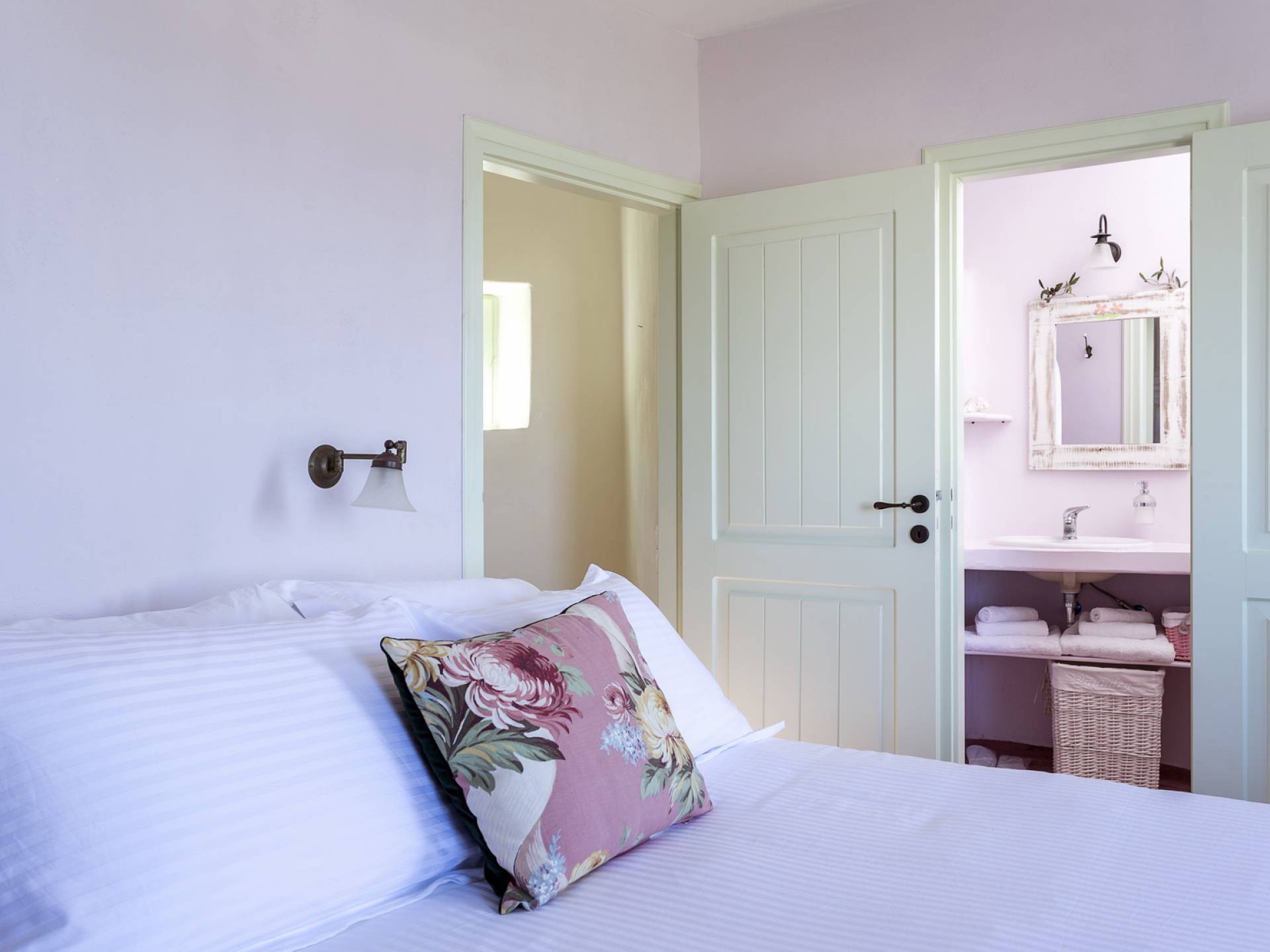 The ground floor with the small luminous windows and the panoramic view of the vineyards, the sea, and the swimming pool consists of a living room, a dining room, and a fully equipped kitchen. The first-floor bedroom with a romantic ambiance features a built double bed and a wonderful en-suite bathroom. The second-floor bedroom is a fabulous cone-shaped room with an en-suite bathroom. This room includes a double-built bed and a single one, which can be used as also a couch.