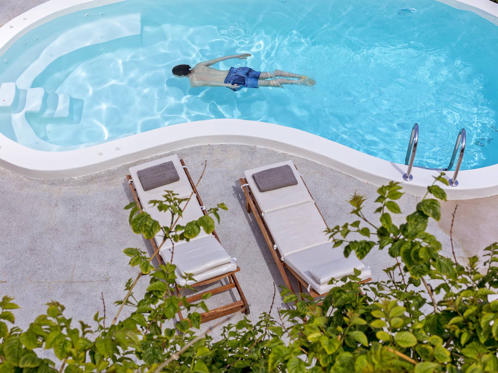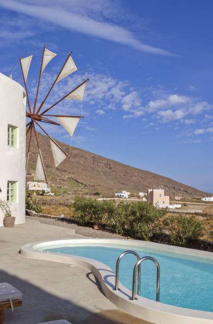 Each Santorini Windmill Villa is totally independent, equipped with a private pool, jacuzzi tubes, terrace, flower garden, private entrance, parking space. It can accommodate up to 5 persons and it is the ideal resort for honeymoon couples, groups of friends, as well as perfectly safe for families with children.