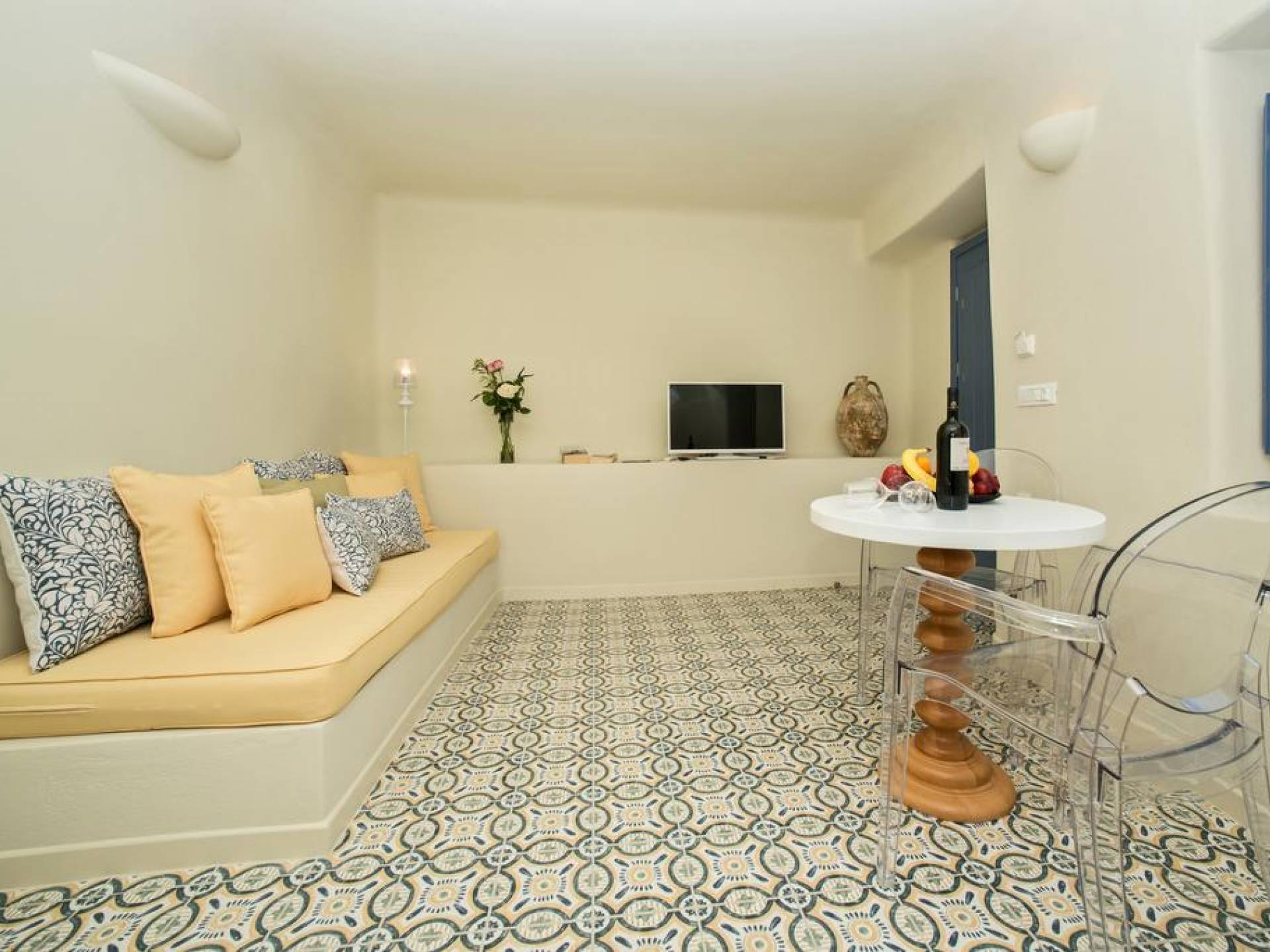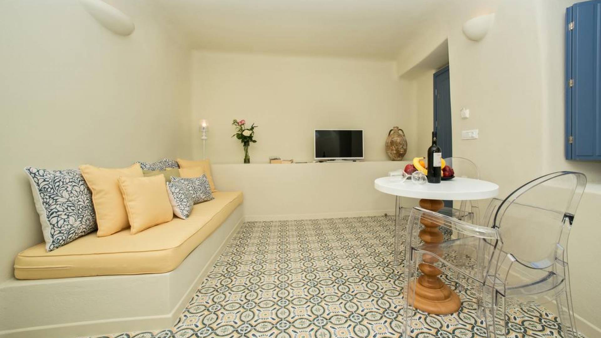 Decorated in hues of beige and blue, the 35 sqm. Luna Pearl Suite offers a range of quality amenities and elegant decoration, a comfortable living room, a separate bedroom with a king-size bed, a kitchenette with a small fridge, and a uniquely designed bathroom, equipped with luxury amenities. Luna Pearl Suite opens to a private patio with a dining table and chairs, sunbeds, umbrella, and a heated outdoor jacuzzi. Ideal for those who seek comfort and tranquility.