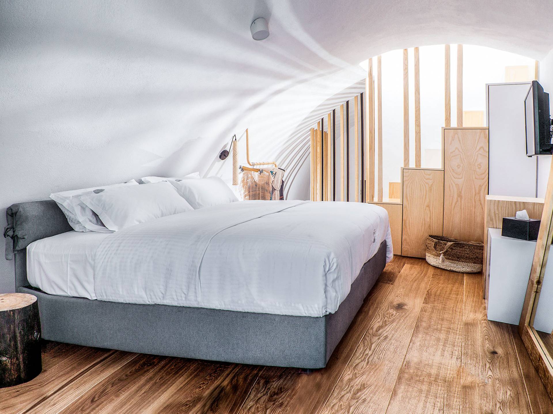 On the First Floor, the U Villa of Santorini Soul features a master bedroom, air-conditioned, with a double bed with a mattress designed for a unique sleeping experience. The bedroom leads to a private balcony with sundecks and an outdoor Jacuzzi overlooking the breath-taking beauty of the island, from volcano to Kamari. This carefully curated outdoor experience provides ultimate leisure to the villa’s guests.