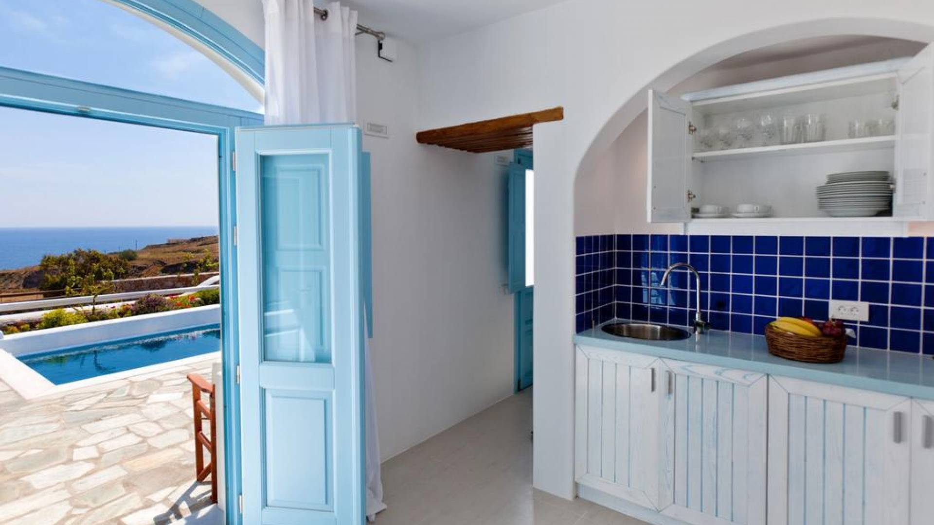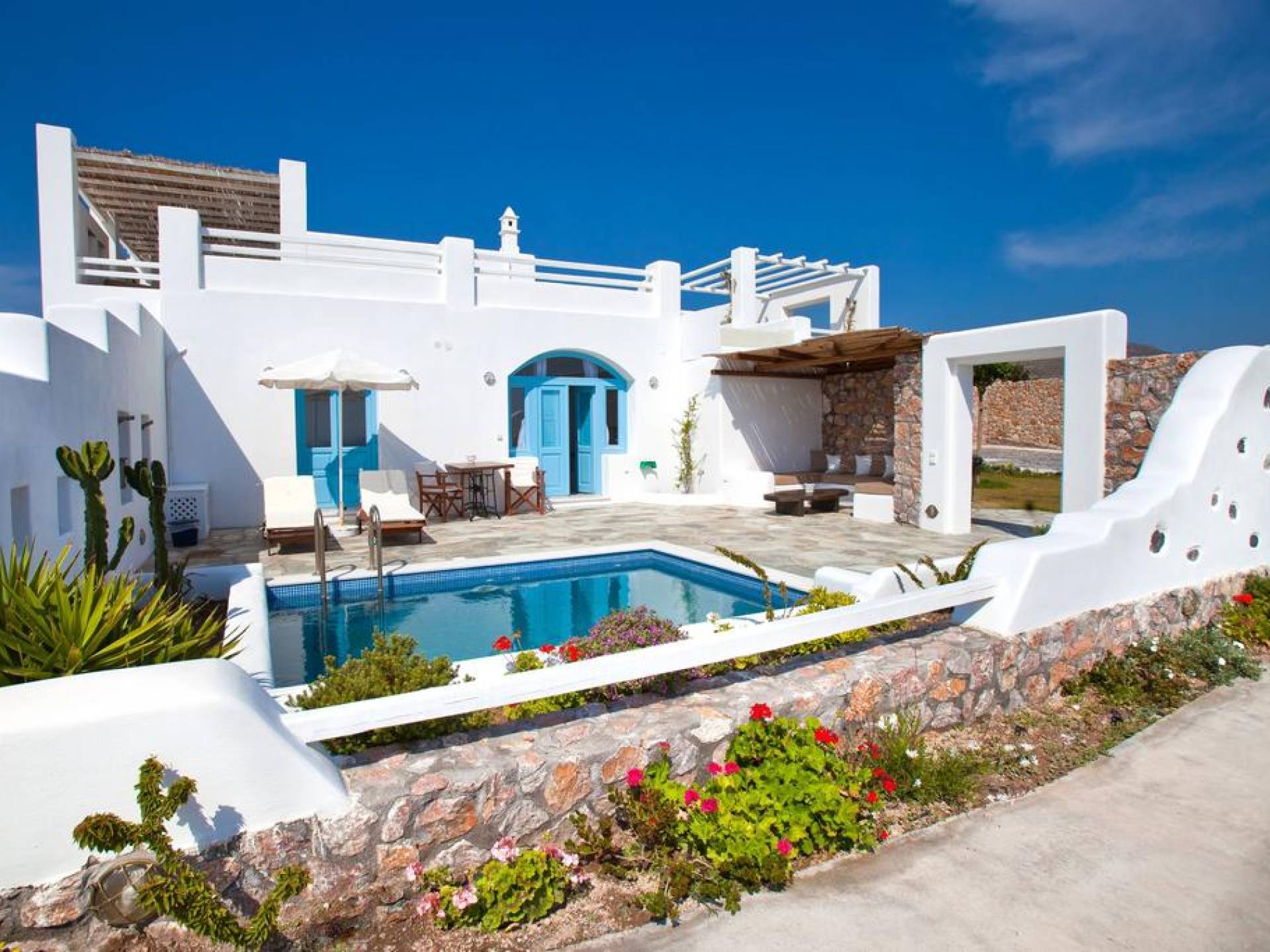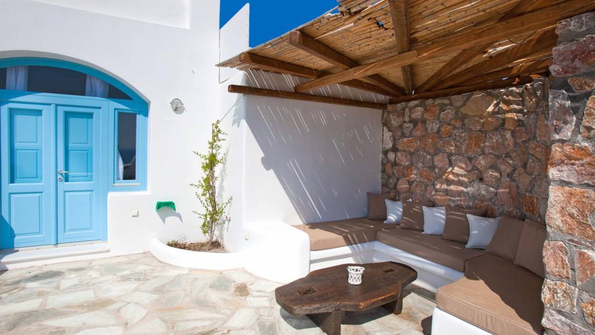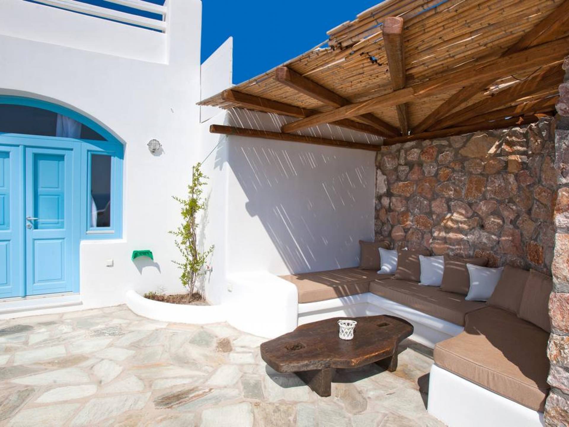 Anema Residence of Santorini is a 6000 square meter, private villa property, overlooking the Aegean Sea and stunning views of the islands of Anafi and Amorgos. Located in the Santorini countryside and surrounded by vineyards and farms, and only 400 meters from the black pebble beach of Vourvoulos. Its panoramic position offers views of the surrounding farms, fields, and the sea, offering a true feeling of nature and serenity.