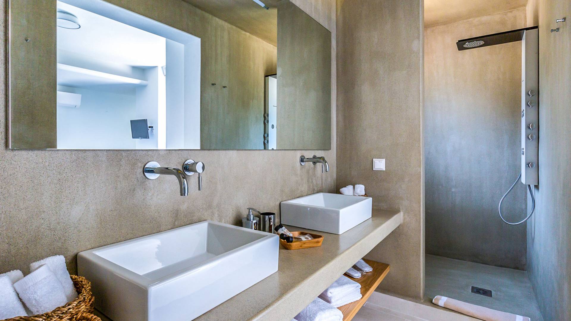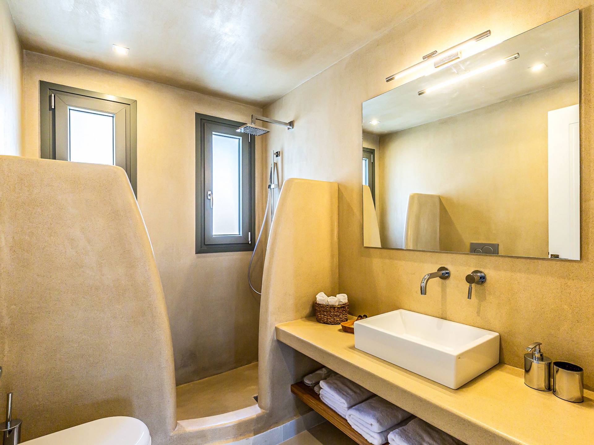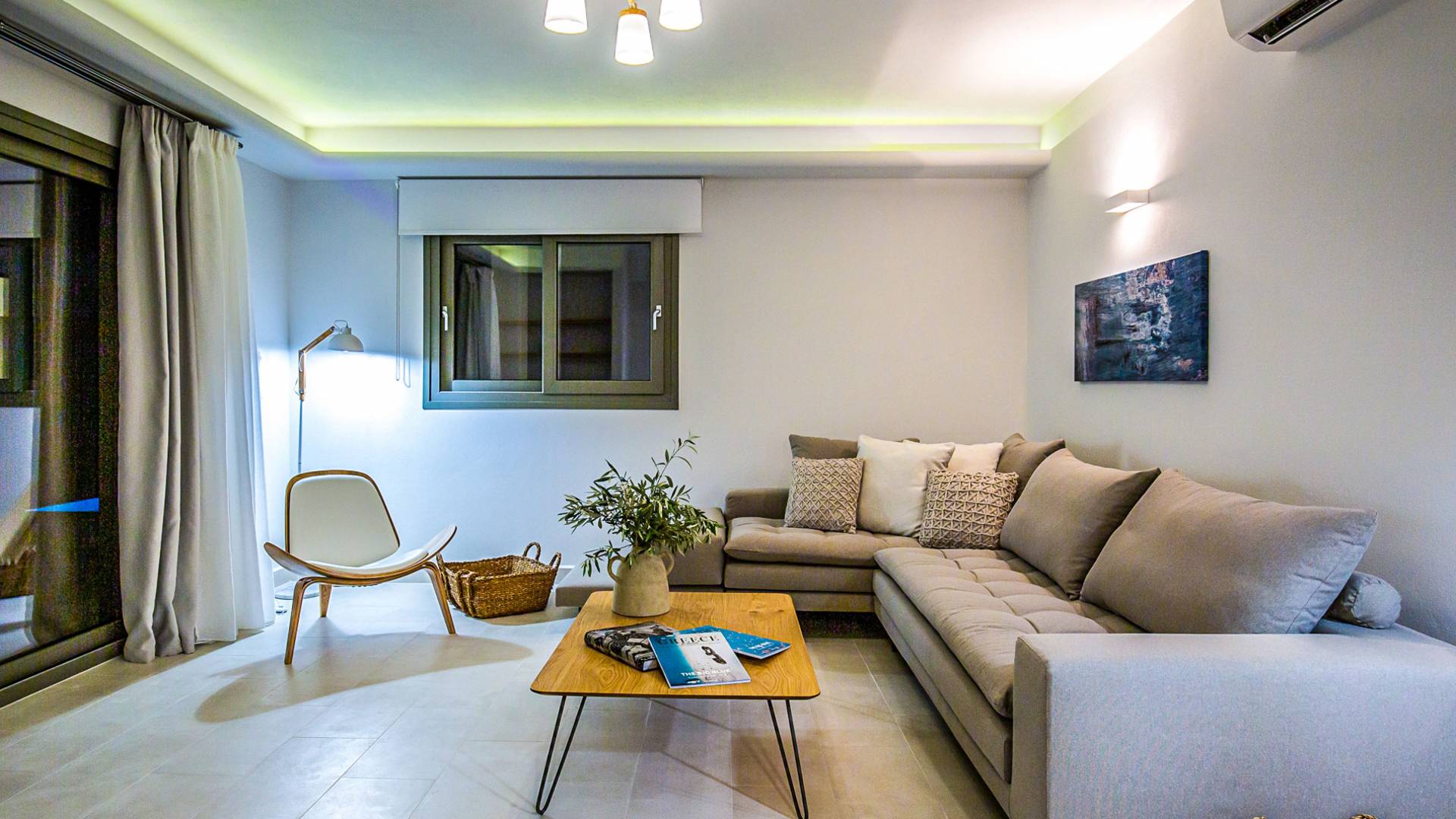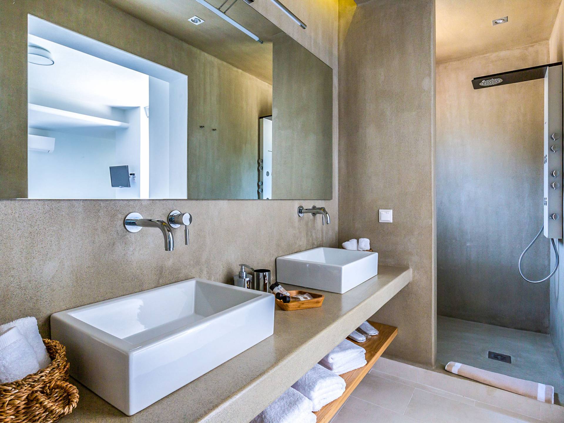 Elios Private Living Villa has a total area of 188sq.m which develops on two levels. On the ground floor, there is a living room with a fully equipped kitchen with a dishwasher and a dining area. Also, on the same floor, you can find a room and two bathrooms. The internal wooden staircase leads to the first floor where the visitor meets three bedrooms with two bathrooms. The usage of stone and the natural coatings in earthy colours combined with the furnishings and the unique quality beds and the Coco-mat sleep system creates a sense of familiar and warm space.