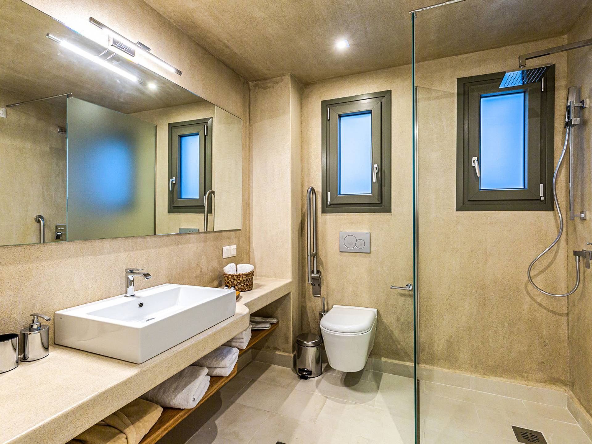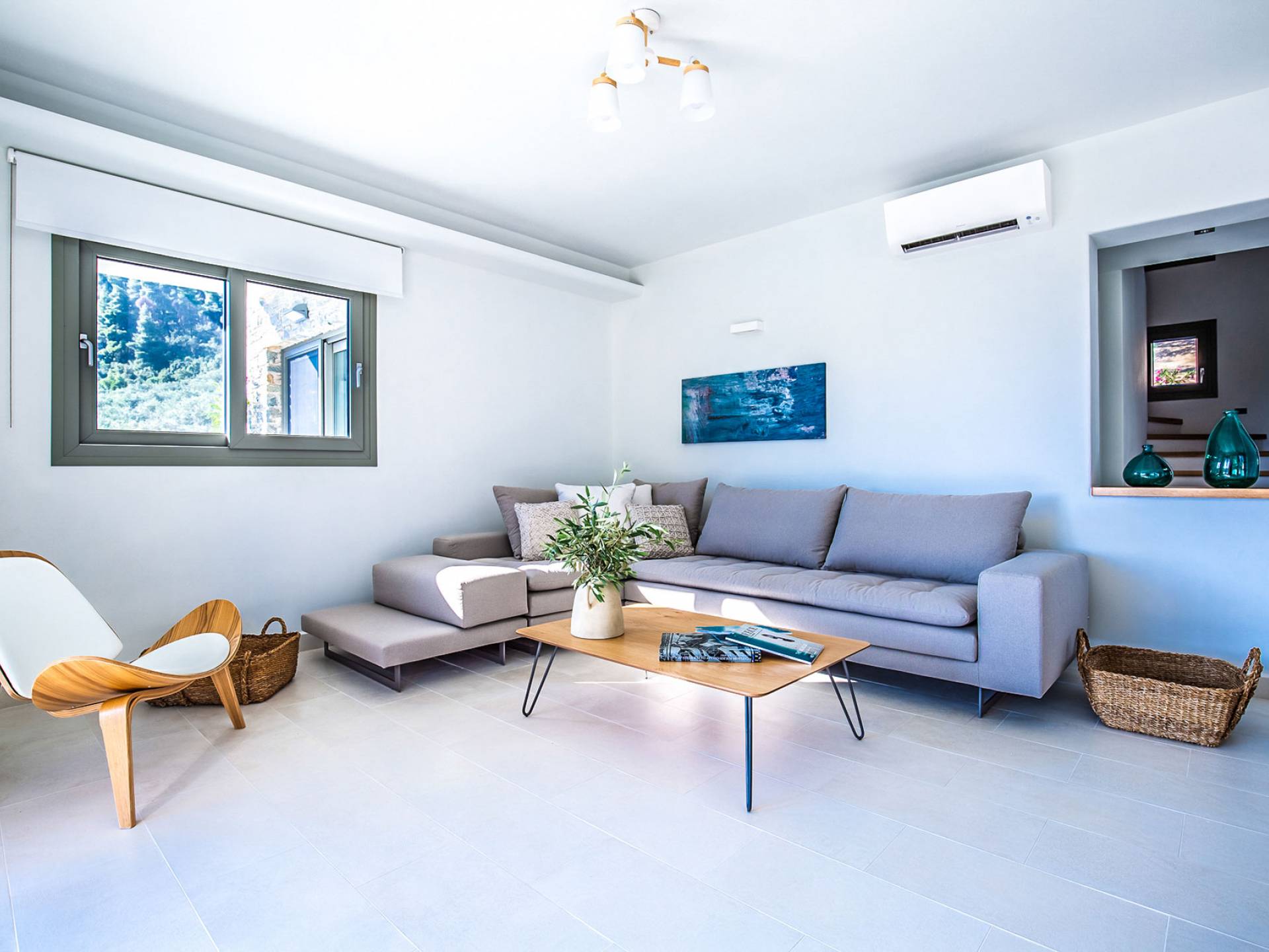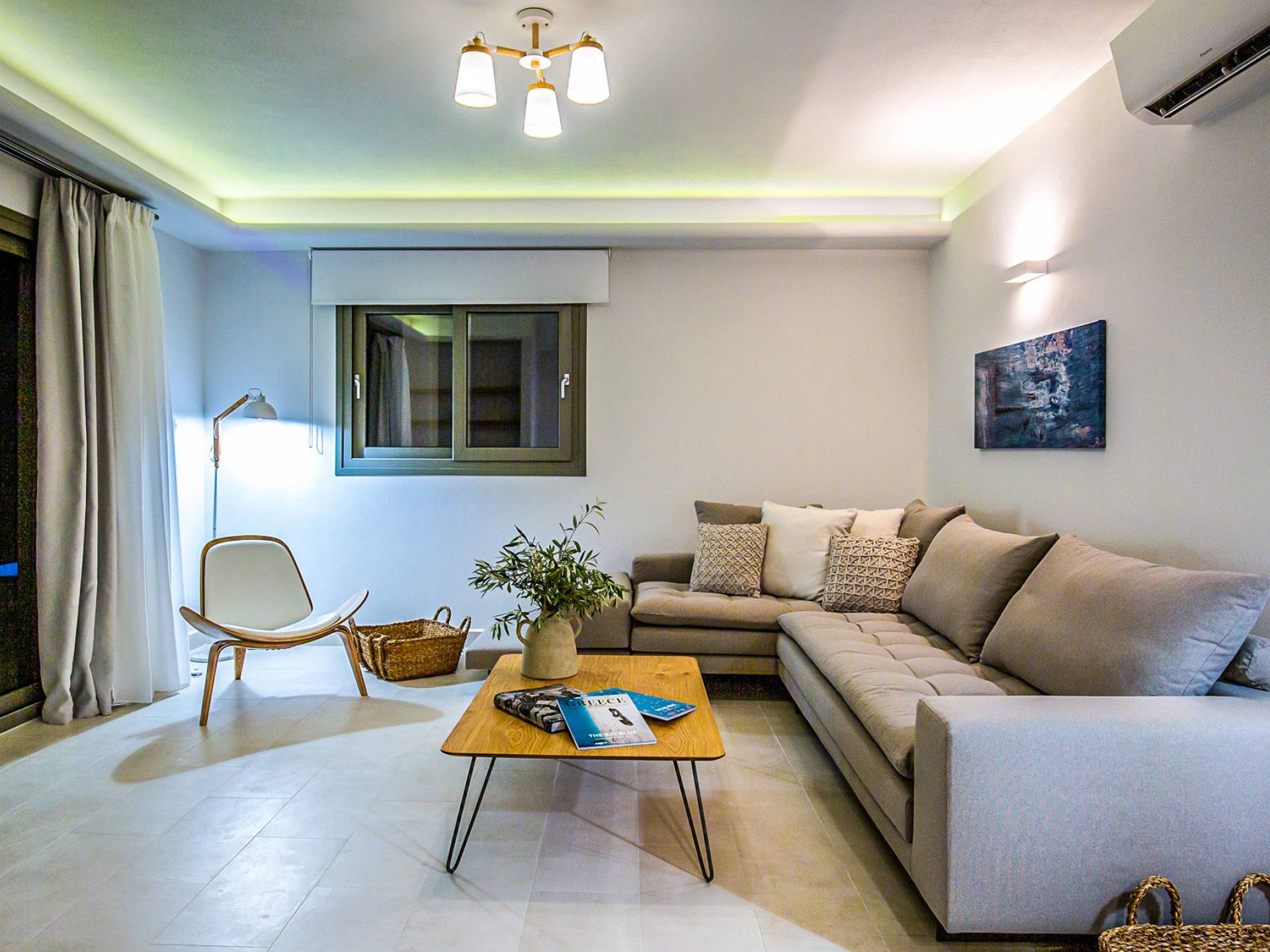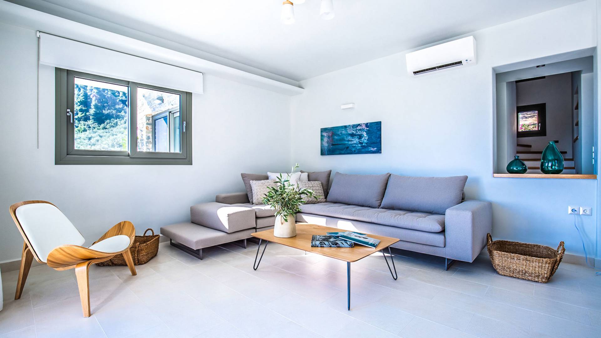 Elios Private Living Villa has a total area of 188sq.m which develops on two levels. On the ground floor, there is a living room with a fully equipped kitchen with a dishwasher and a dining area. Also, on the same floor, you can find a room and two bathrooms. The internal wooden staircase leads to the first floor where the visitor meets three bedrooms with two bathrooms. The usage of stone and the natural coatings in earthy colours combined with the furnishings and the unique quality beds and the Coco-mat sleep system creates a sense of familiar and warm space.
