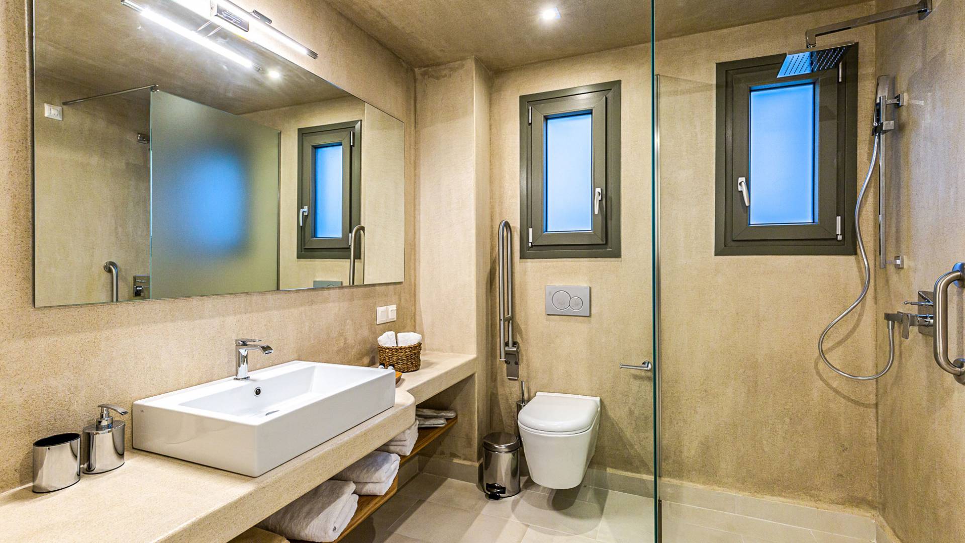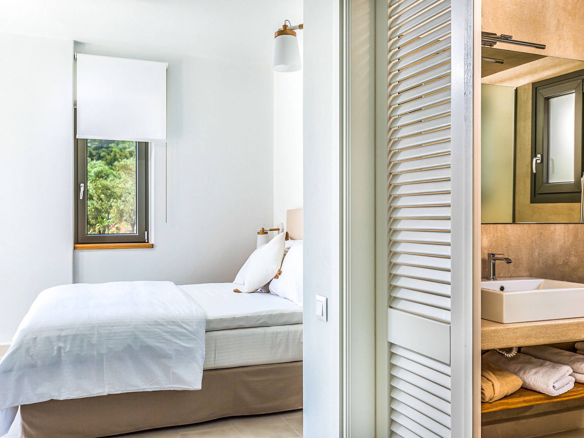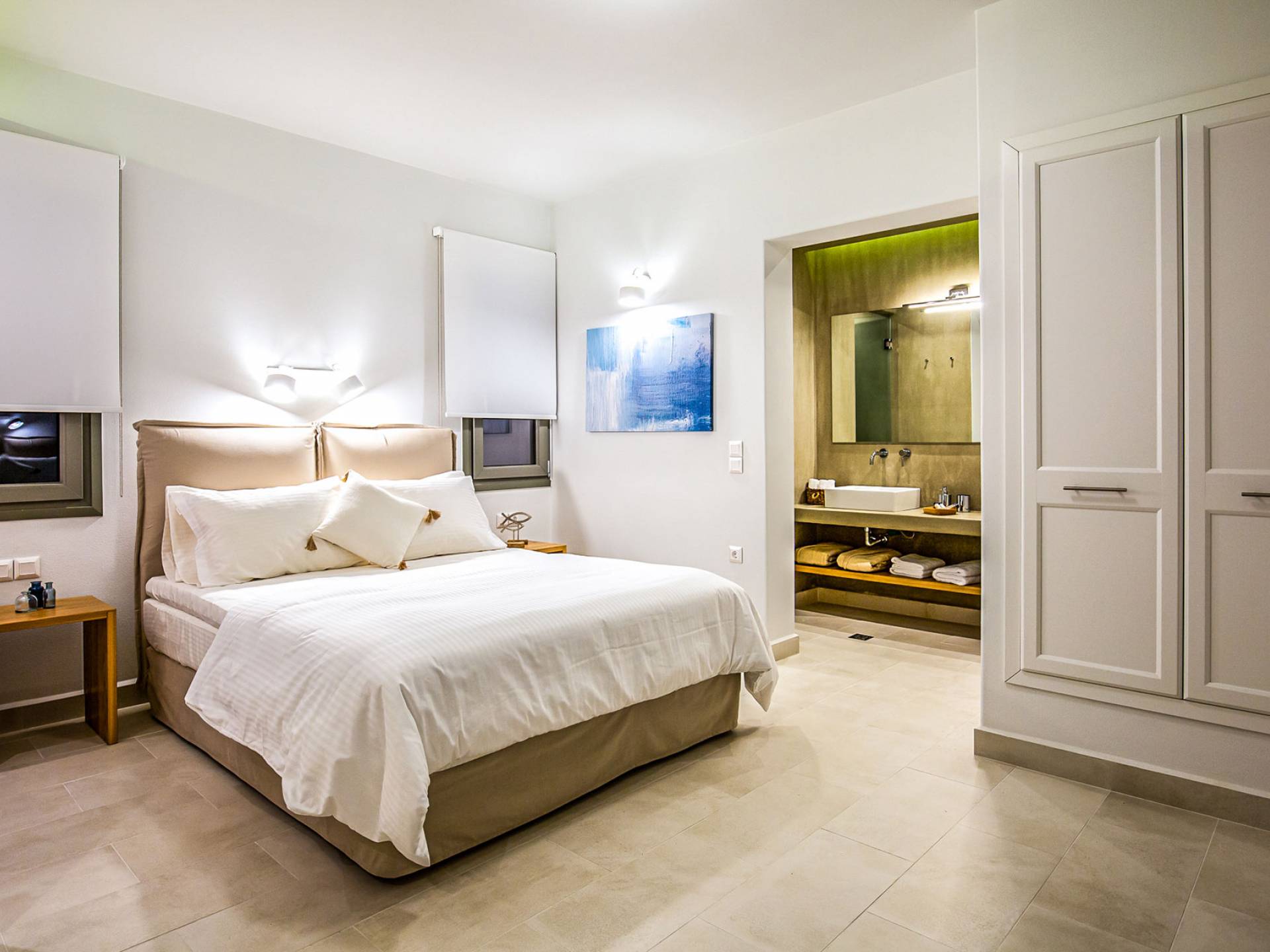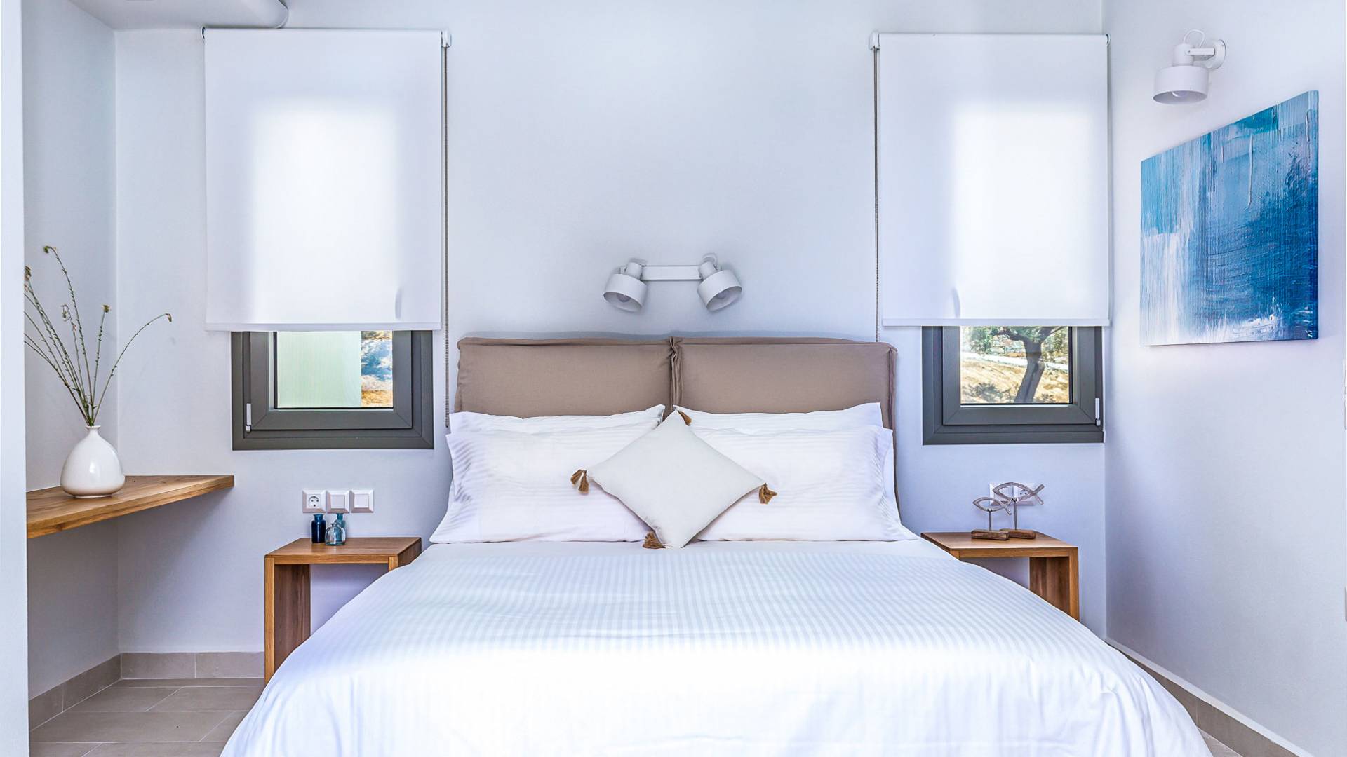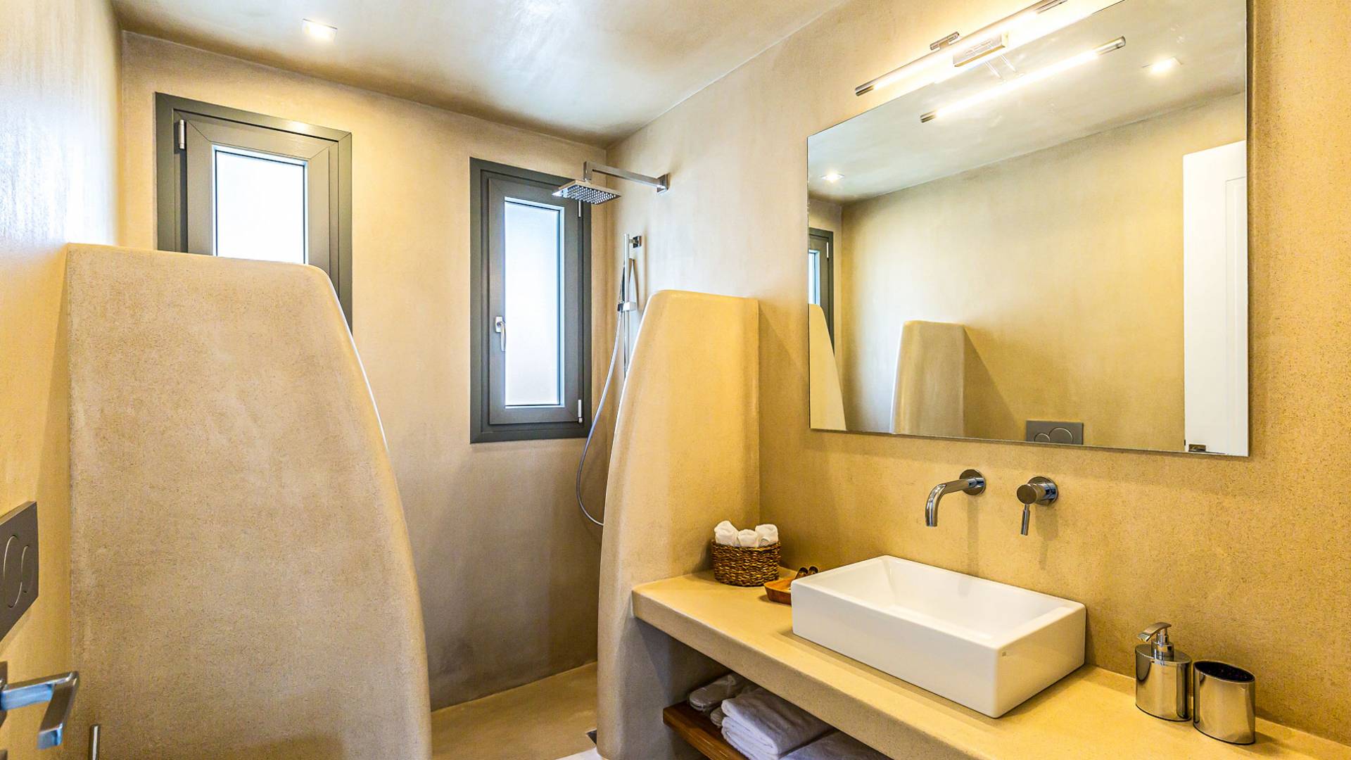 Elios Private Living Villa has a total area of 188sq.m which develops on two levels. On the ground floor, there is a living room with a fully equipped kitchen with a dishwasher and a dining area. Also, on the same floor, you can find a room and two bathrooms. The internal wooden staircase leads to the first floor where the visitor meets three bedrooms with two bathrooms. The usage of stone and the natural coatings in earthy colours combined with the furnishings and the unique quality beds and the Coco-mat sleep system creates a sense of familiar and warm space.