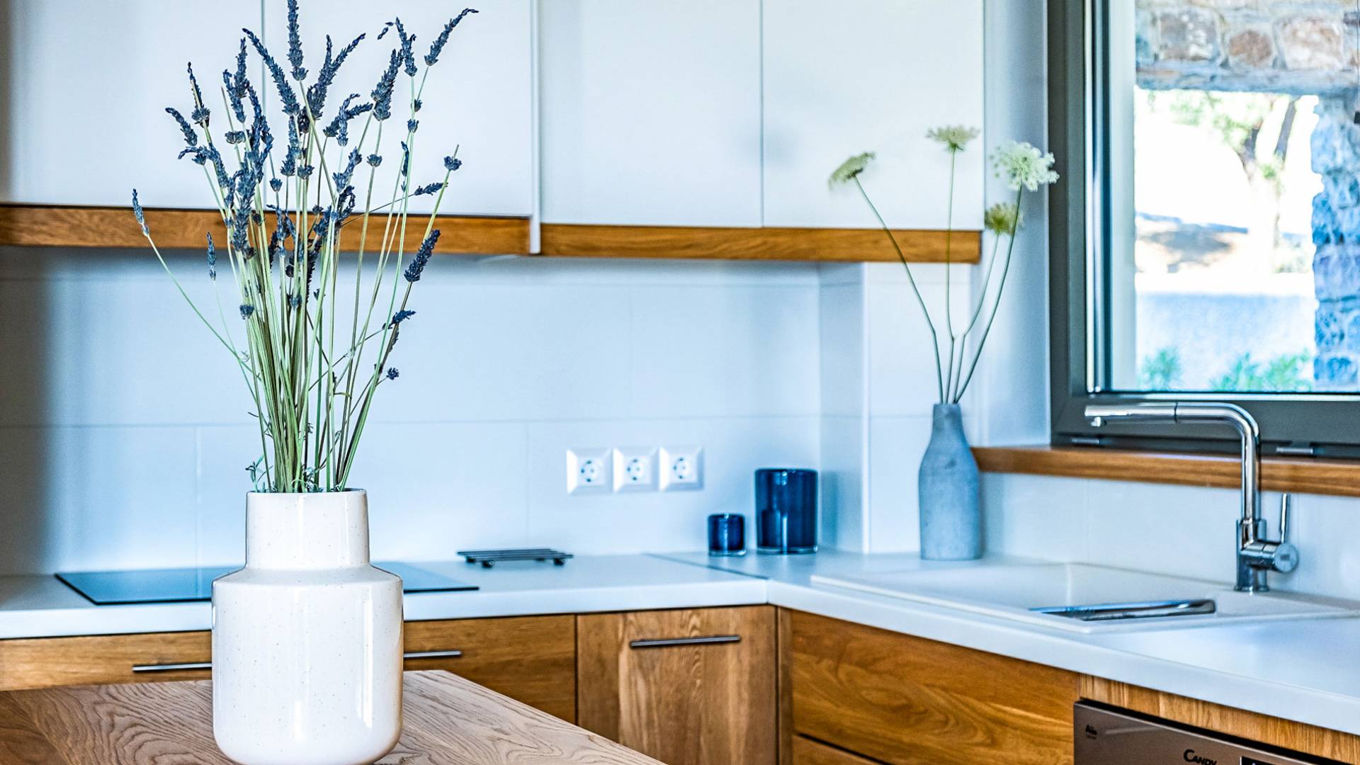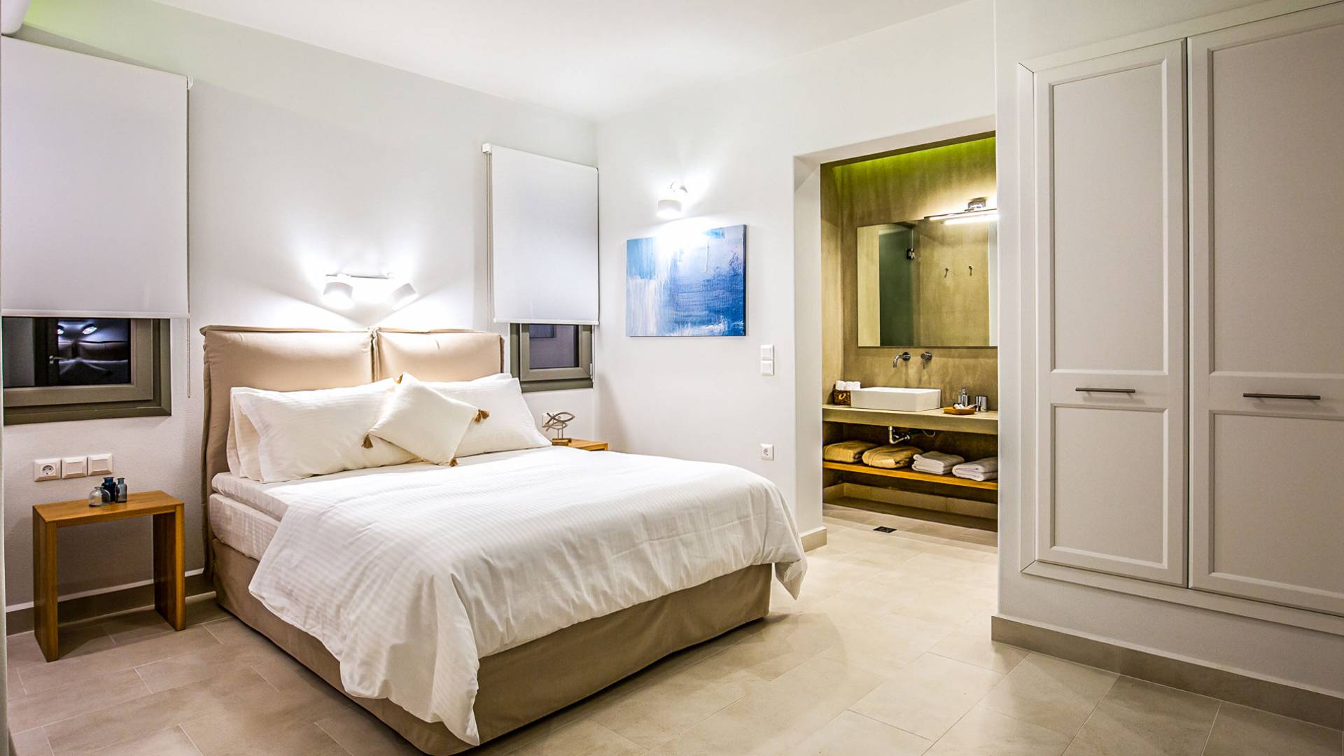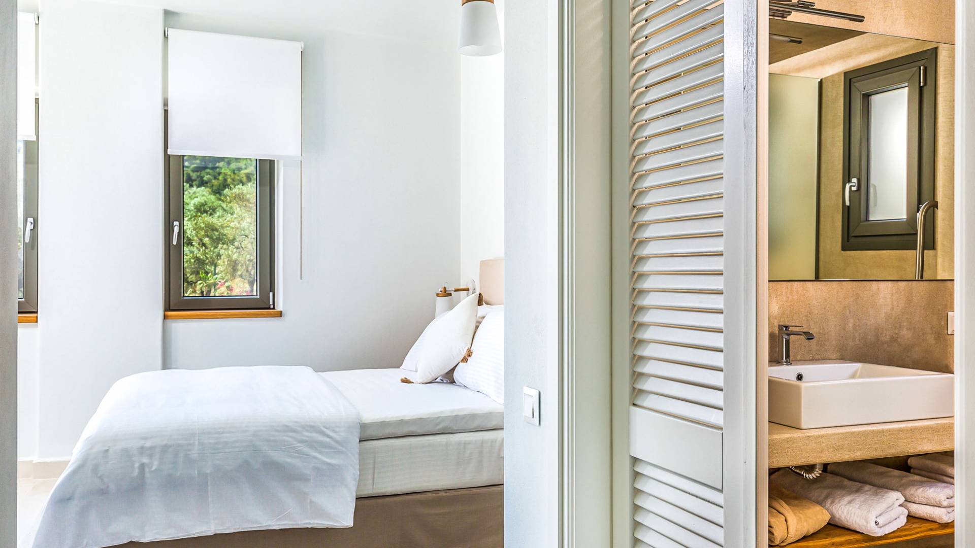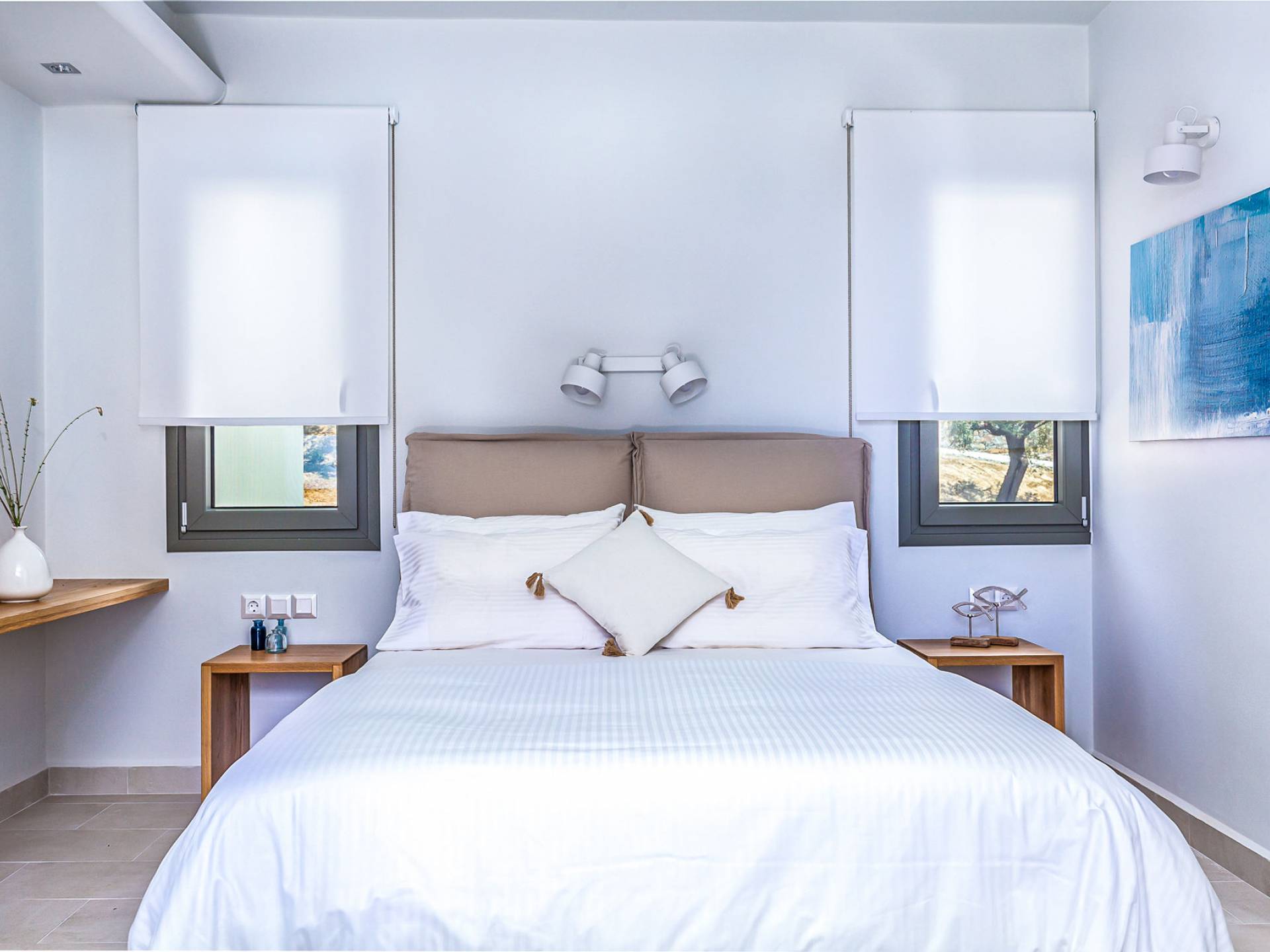 Elios Private Living Villa has a total area of 188sq.m which develops on two levels. On the ground floor, there is a living room with a fully equipped kitchen with a dishwasher and a dining area. Also, on the same floor, you can find a room and two bathrooms. The internal wooden staircase leads to the first floor where the visitor meets three bedrooms with two bathrooms. The usage of stone and the natural coatings in earthy colours combined with the furnishings and the unique quality beds and the Coco-mat sleep system creates a sense of familiar and warm space.