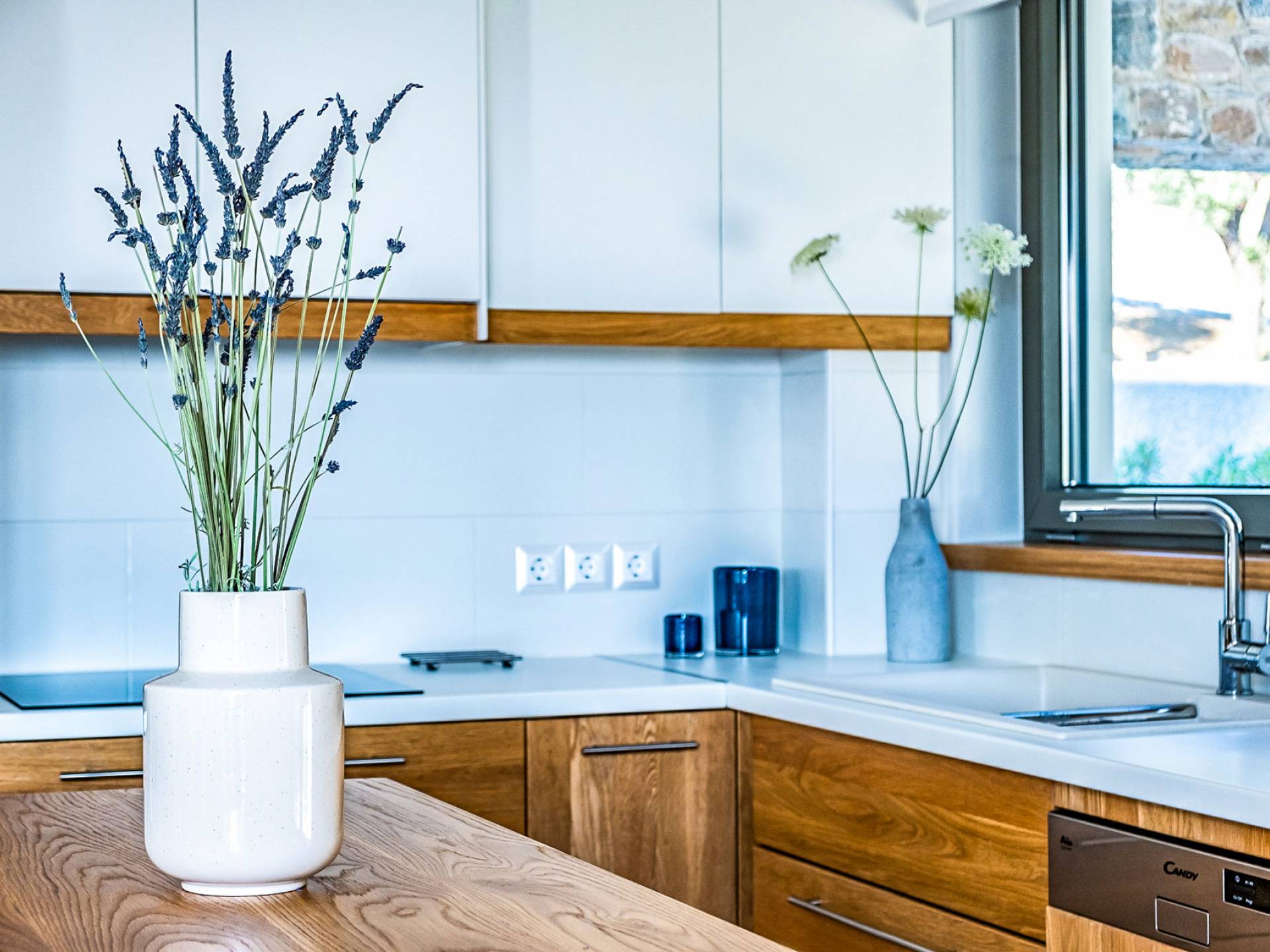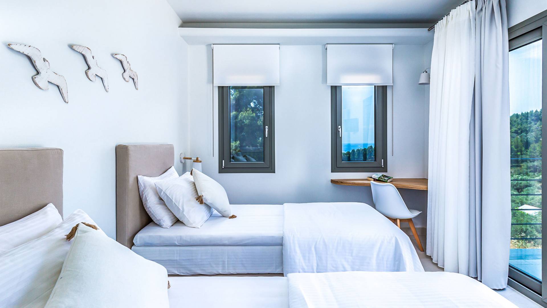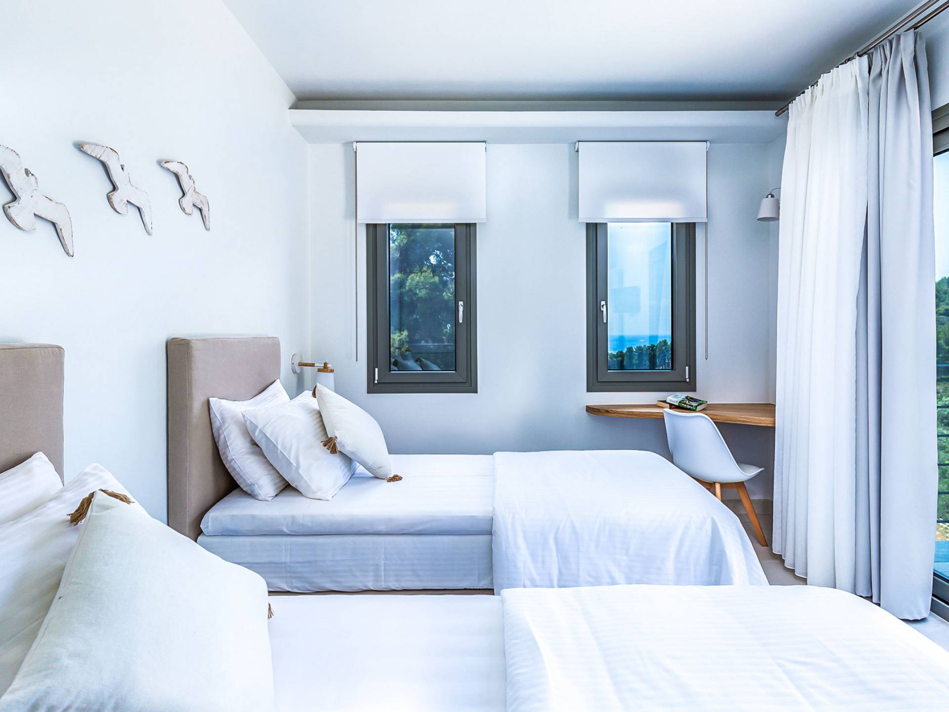 The villa can accommodate up to 8 people while it has four suite size bedrooms, a large common area with a full equipped kitchen and a living room, a private pool, private parking and a mountain and sea view. Also, the villa complies with the requirements for disabled people.