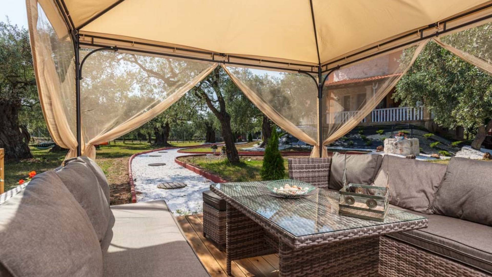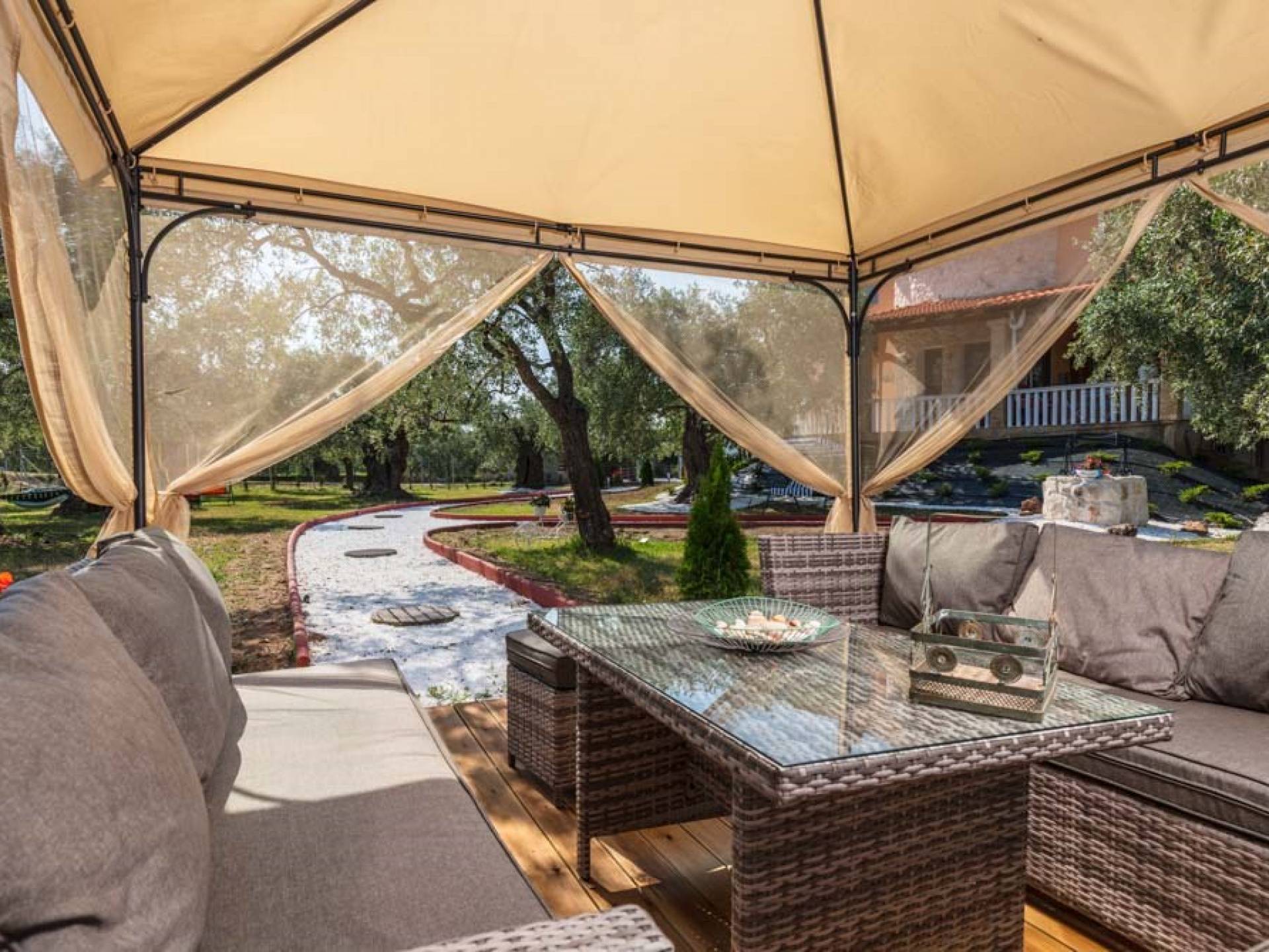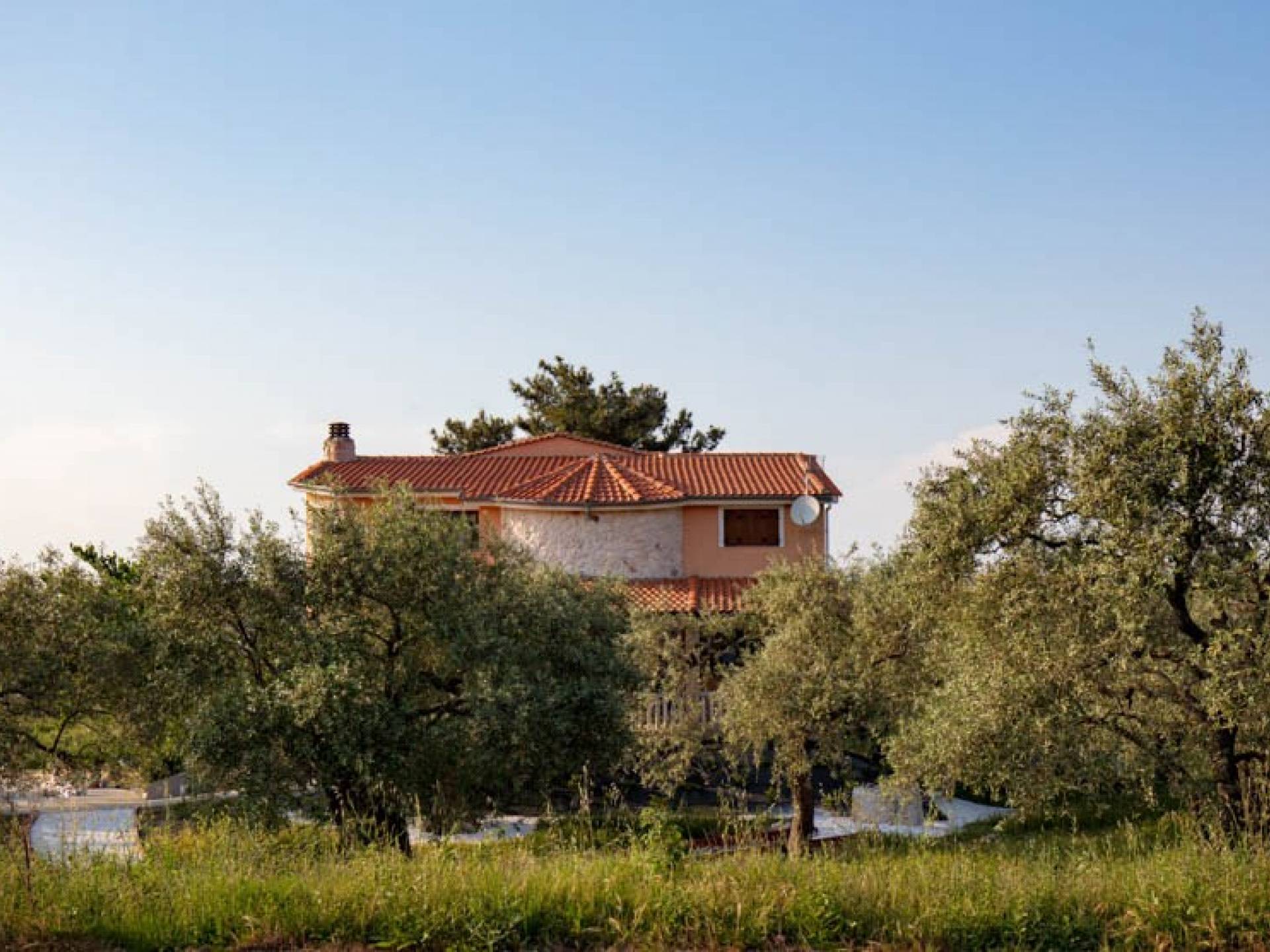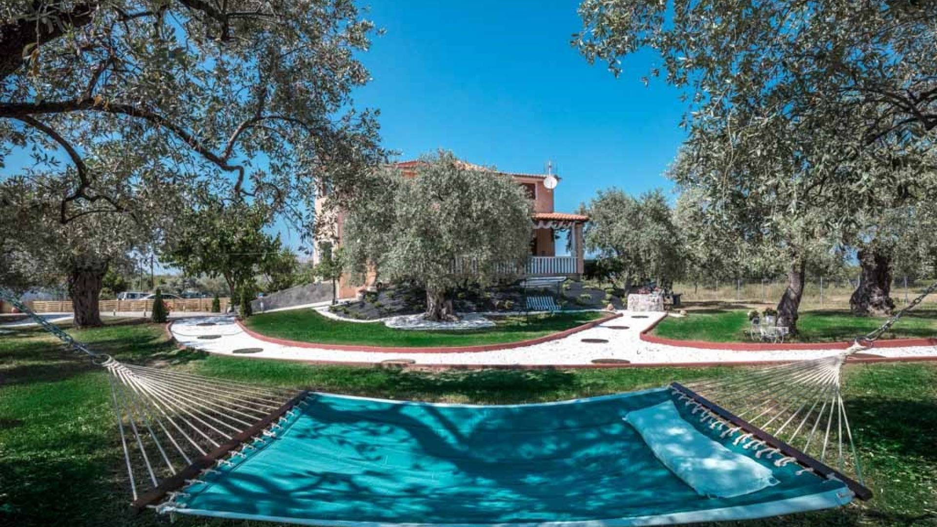 Fokas Luxury Villa in Thasos is surrounded by an olive grove and has a big garden with fragrant flowers and leafy trees. You can have a great time in the garden, having fun, relaxing or making a barbeque. There is also private big parking for your cars in the manor.