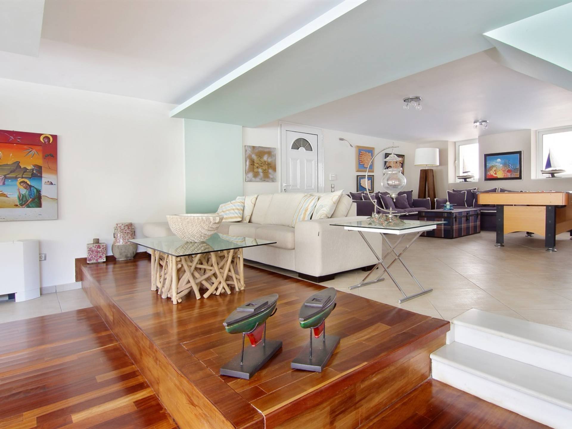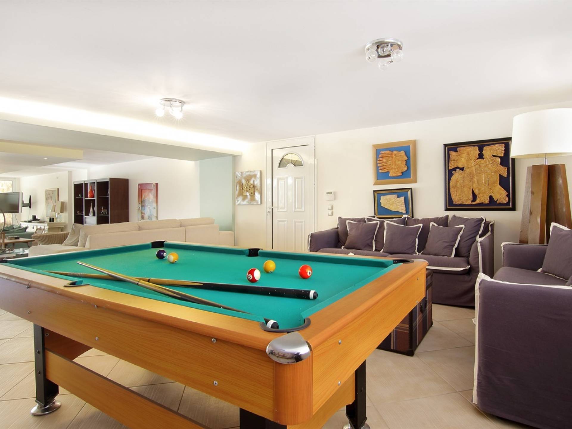 On the ground floor, there is a living room with comfortable sofas and large front windows overlooking the pool (in summer the windows open and the living room becomes a single area with a veranda of the pool, in the back of the hall there is a dining room and a billiard room, and on the ground floor there is one bedroom with two double beds (for the elderly family members), a shower room with a toilet and a fully equipped summer kitchen.