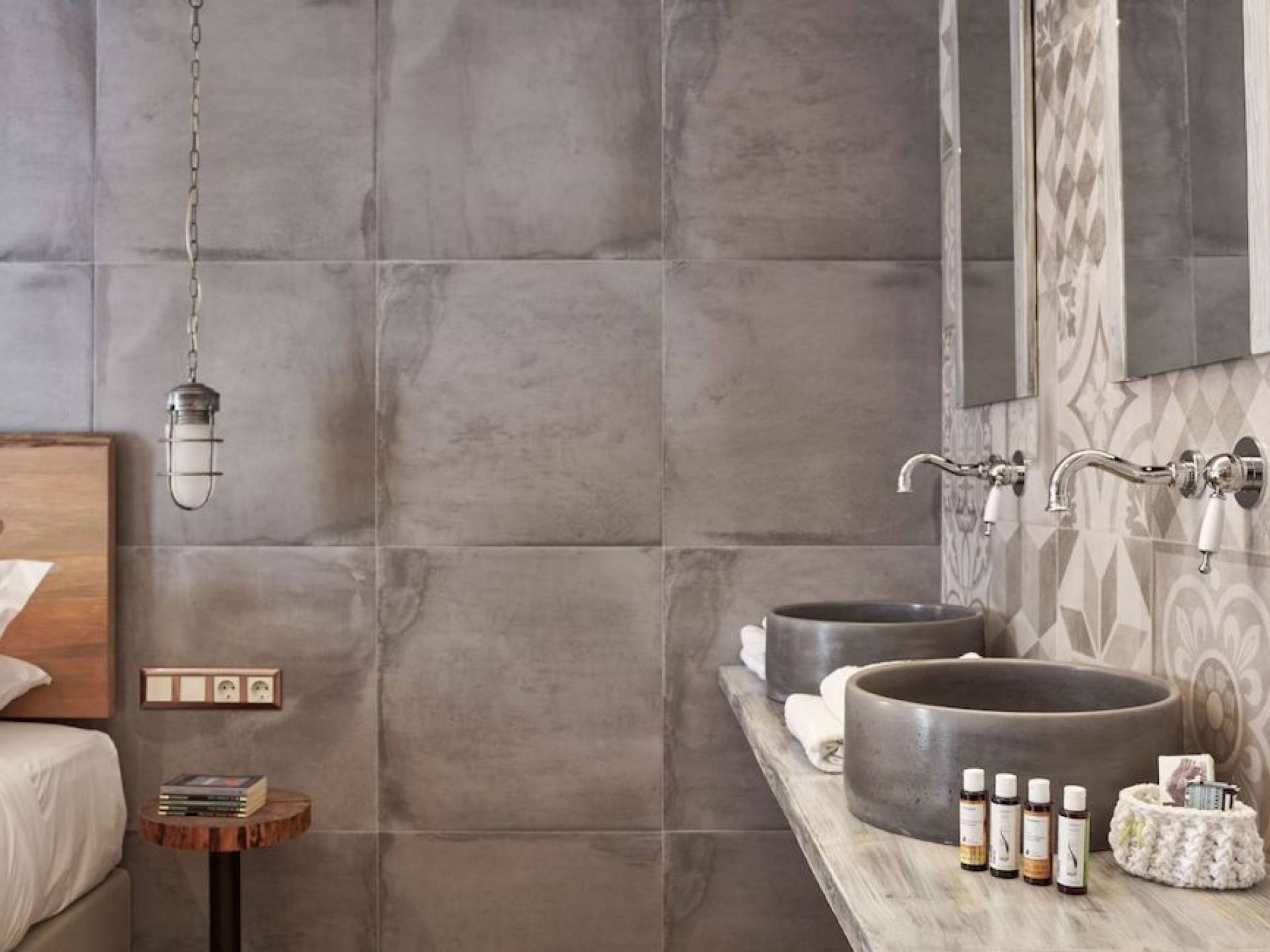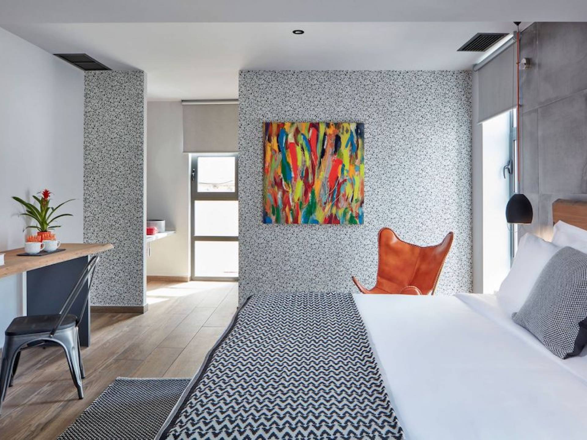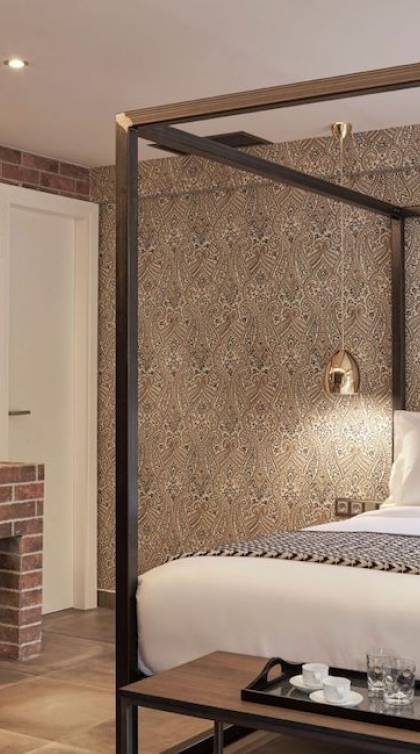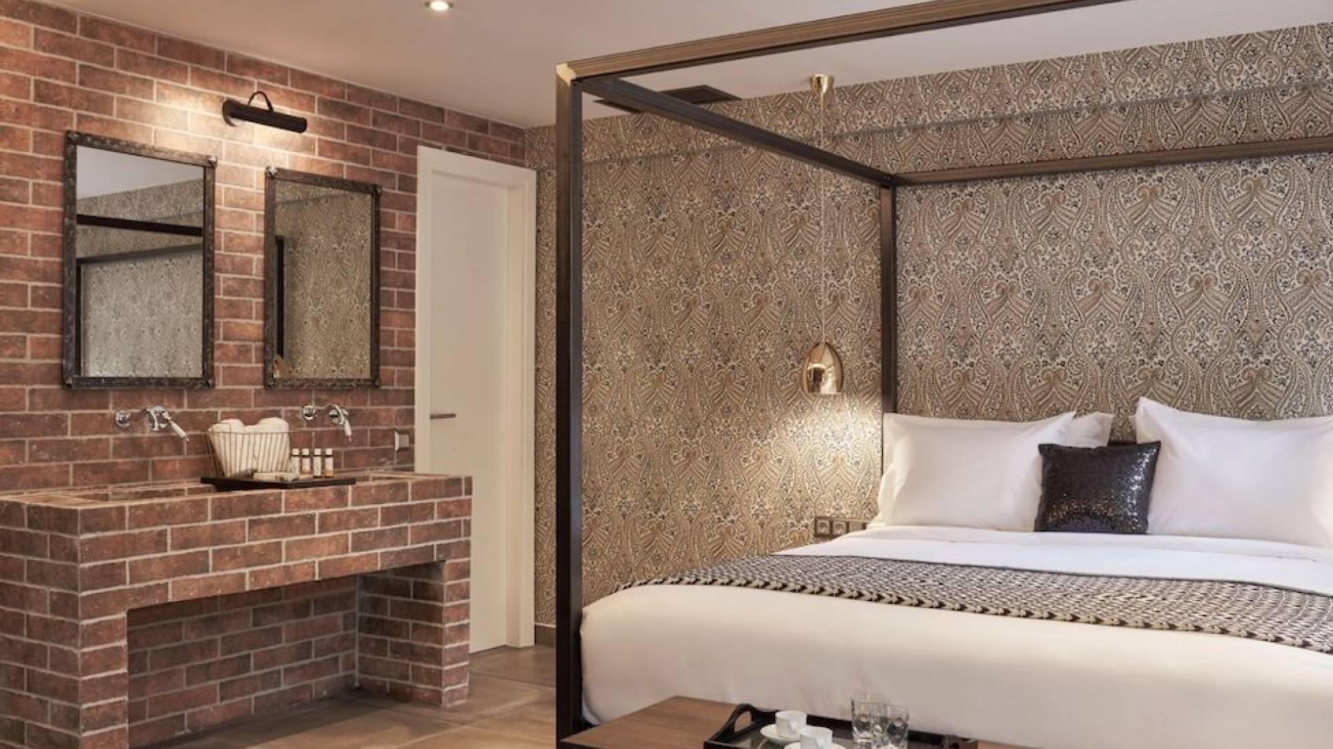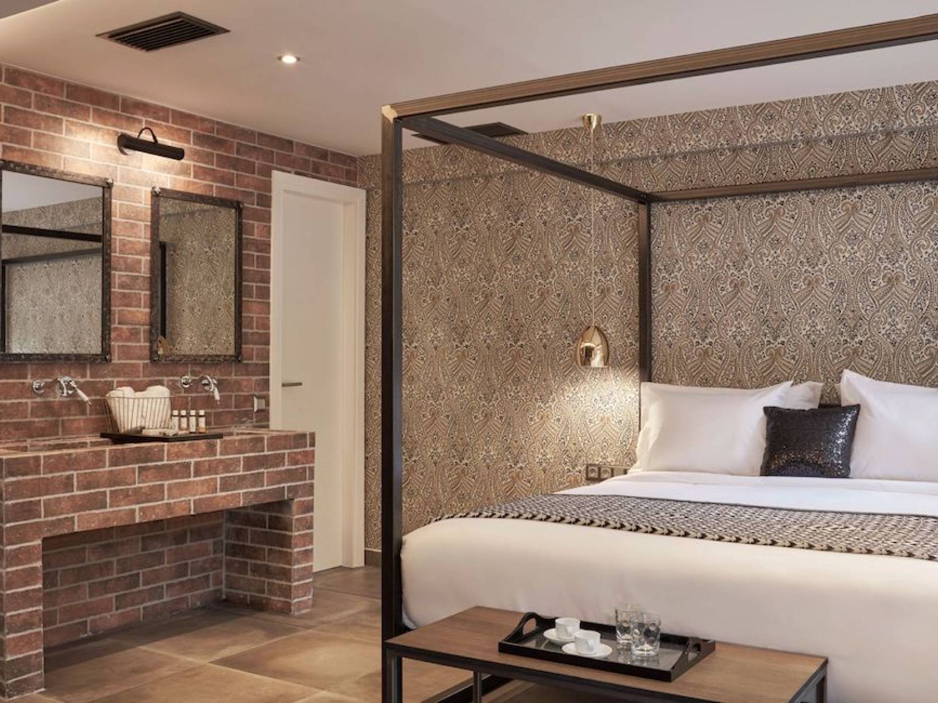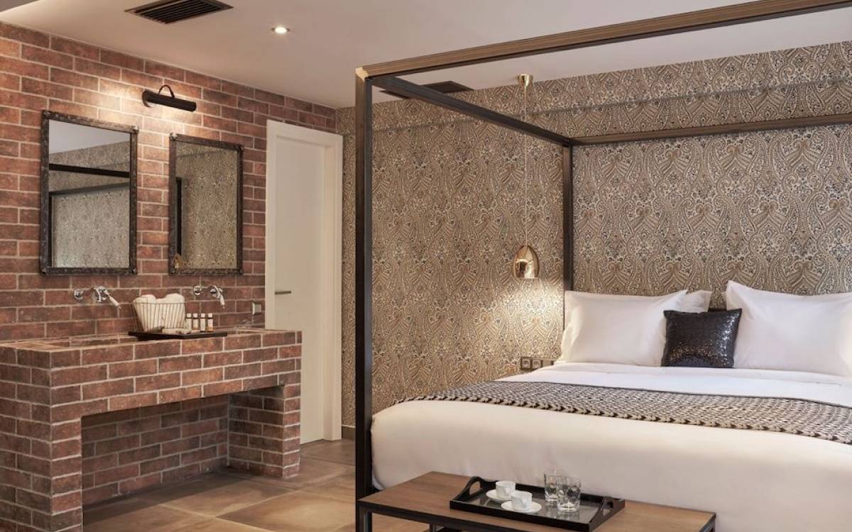 The junior suites feature an open design concept which creates a feeling of connection. A combination of decorative wallpaper and cement or brick is accented by locally handcrafted furniture and industrial-style windows. The designer's thoughtful details in each room foster a personalized experience making you feel at home.
