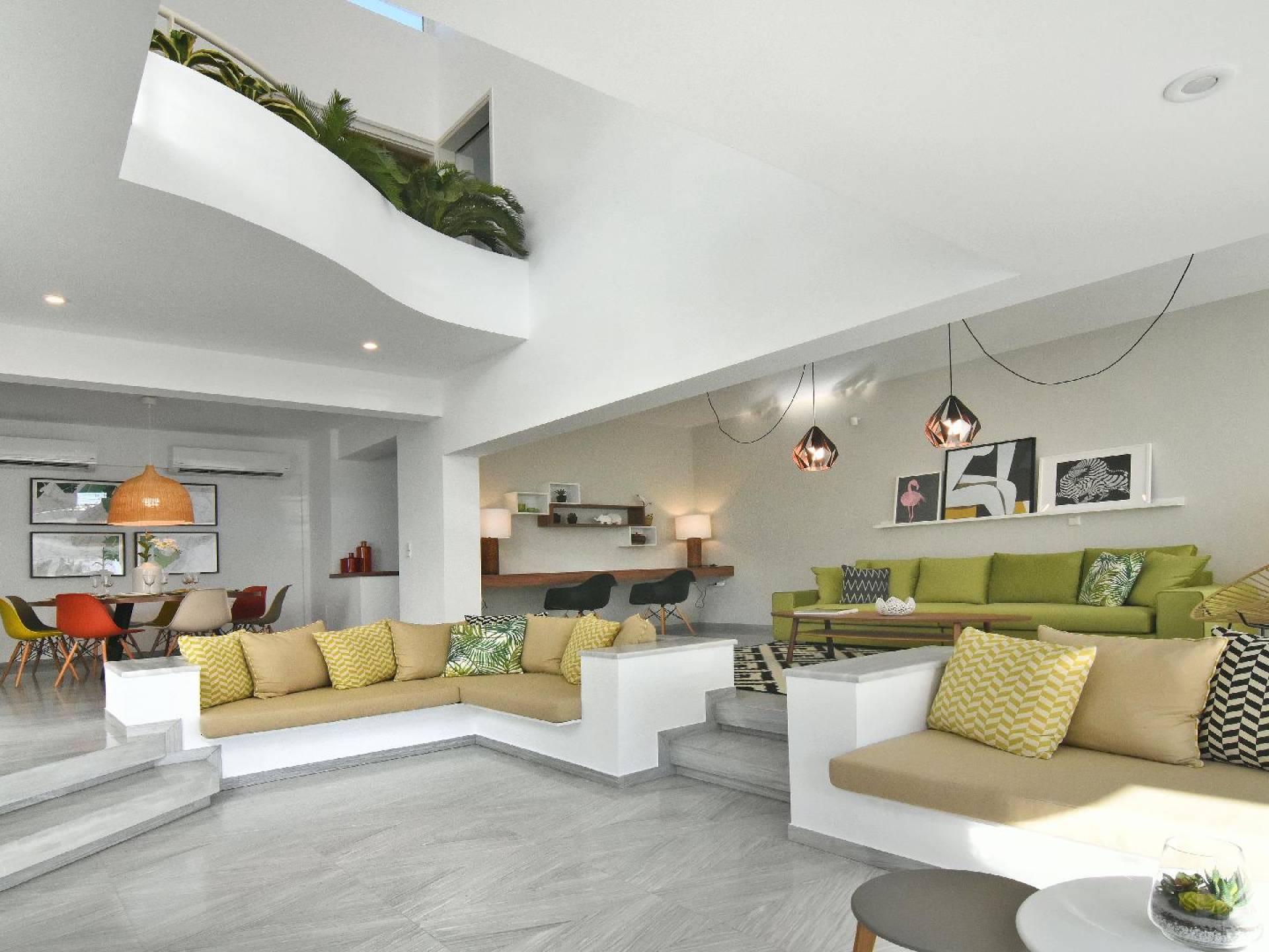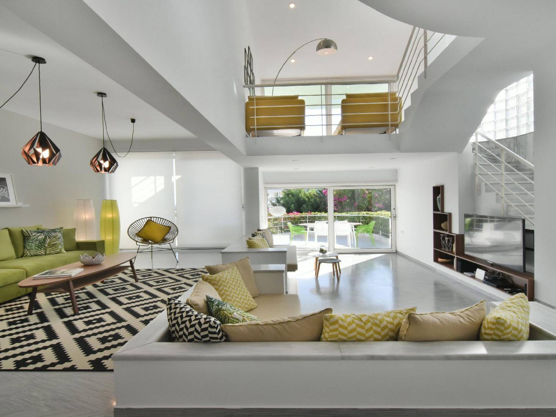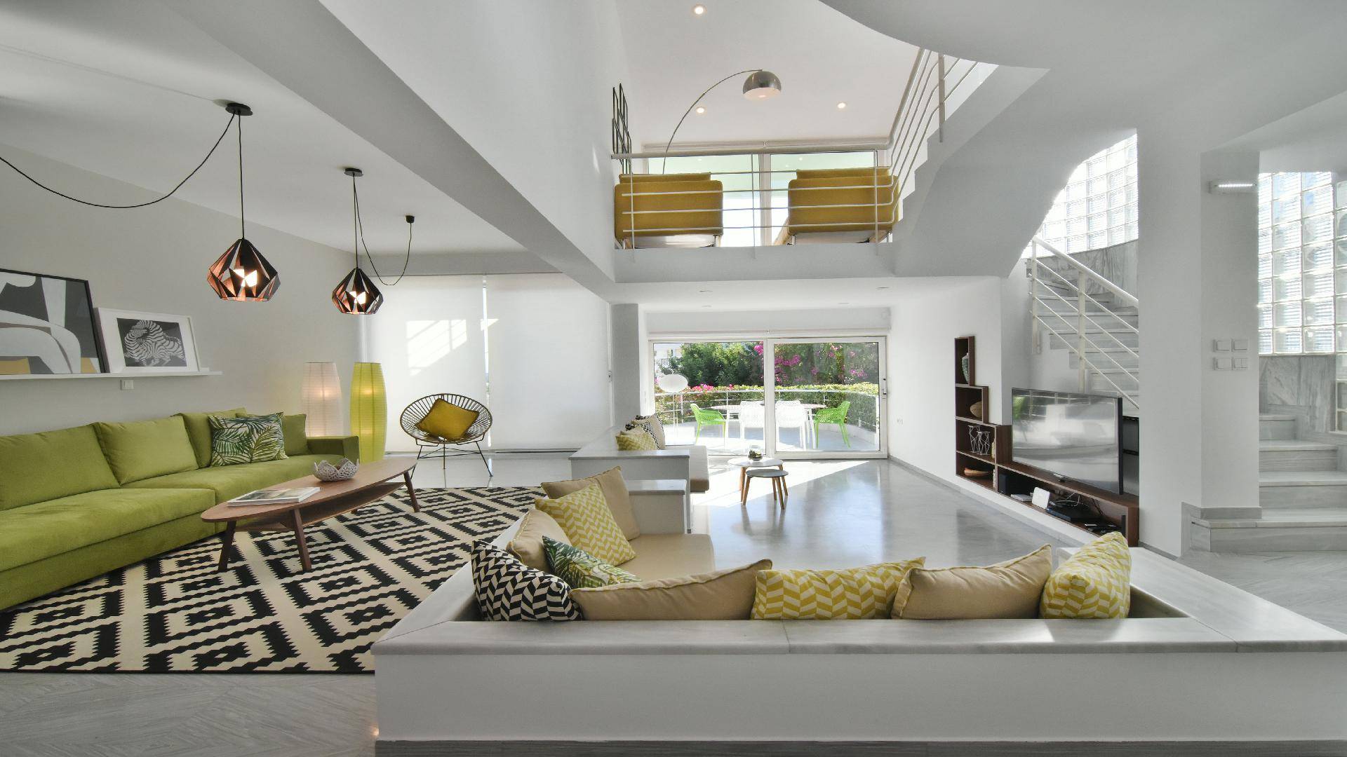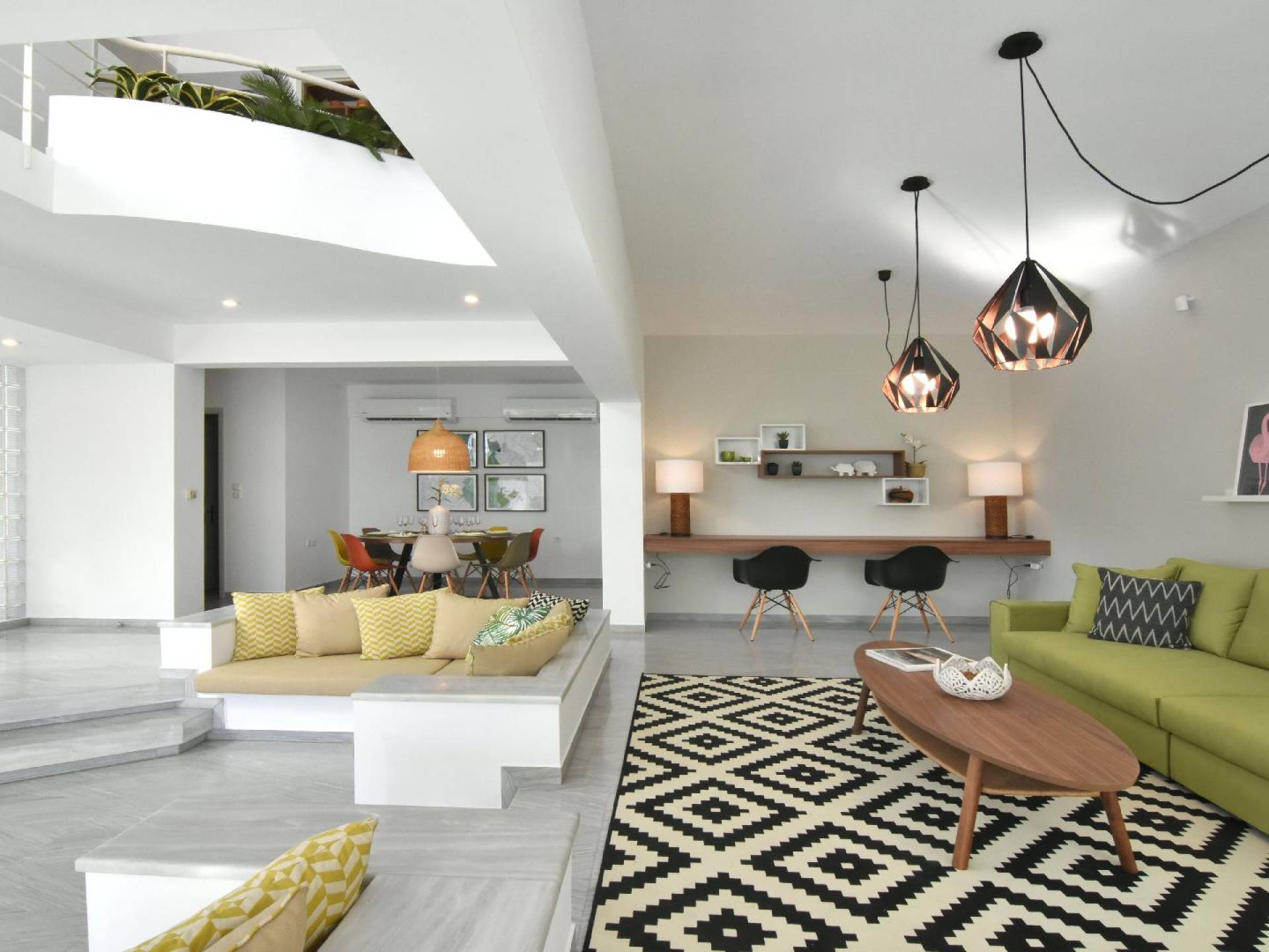 Coconut Villa is a luxury villa in Athens of 300sqm built in three levels and can accommodate up to eight guests. The architecture lines are simple, strict and manage to create an overall feeling of modern elegance. The light-colored walls blend harmoniously with the unique pieces of furniture, the wooden surfaces, and the various colorful decorating details.