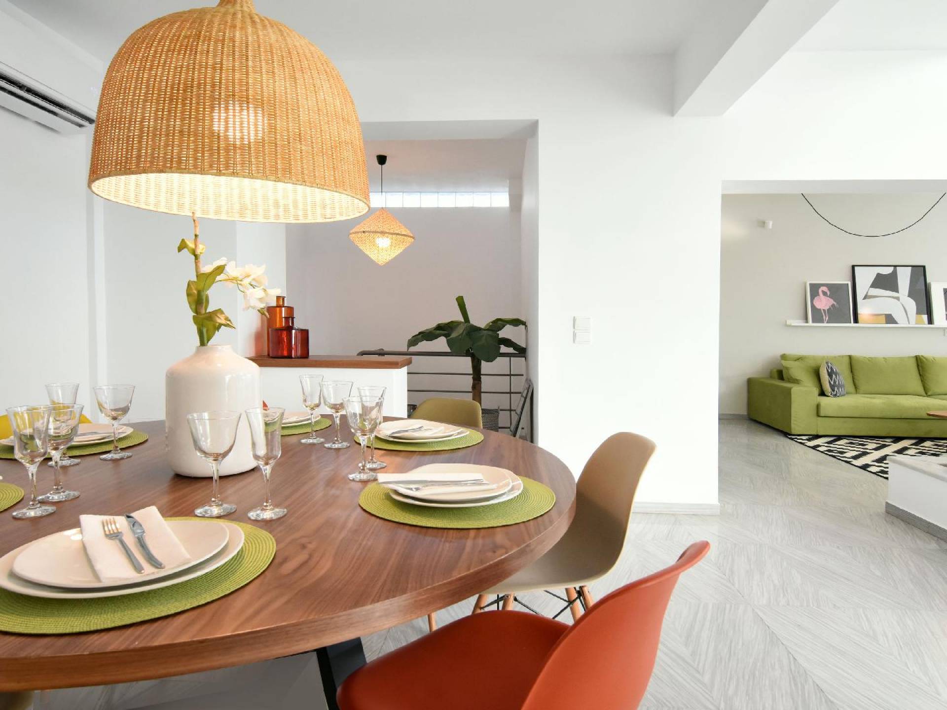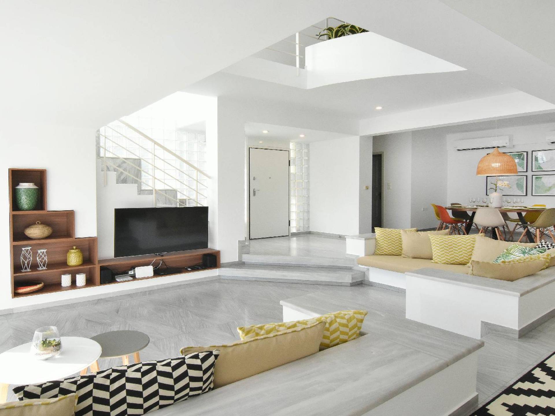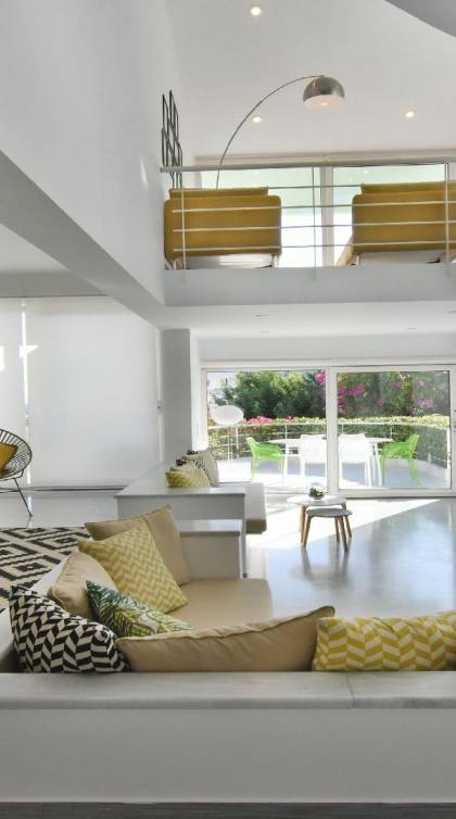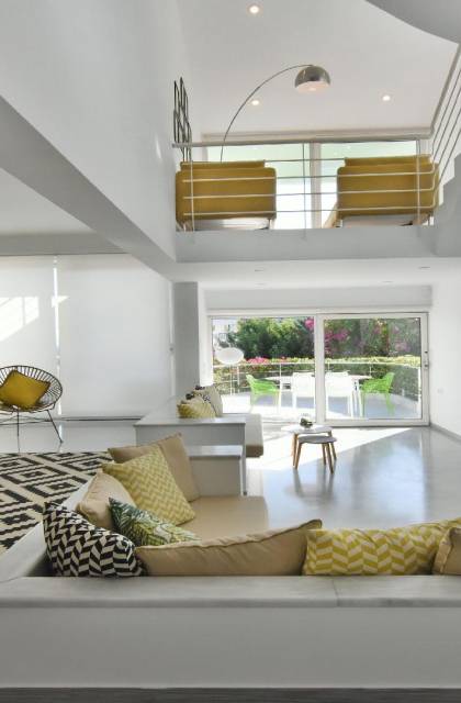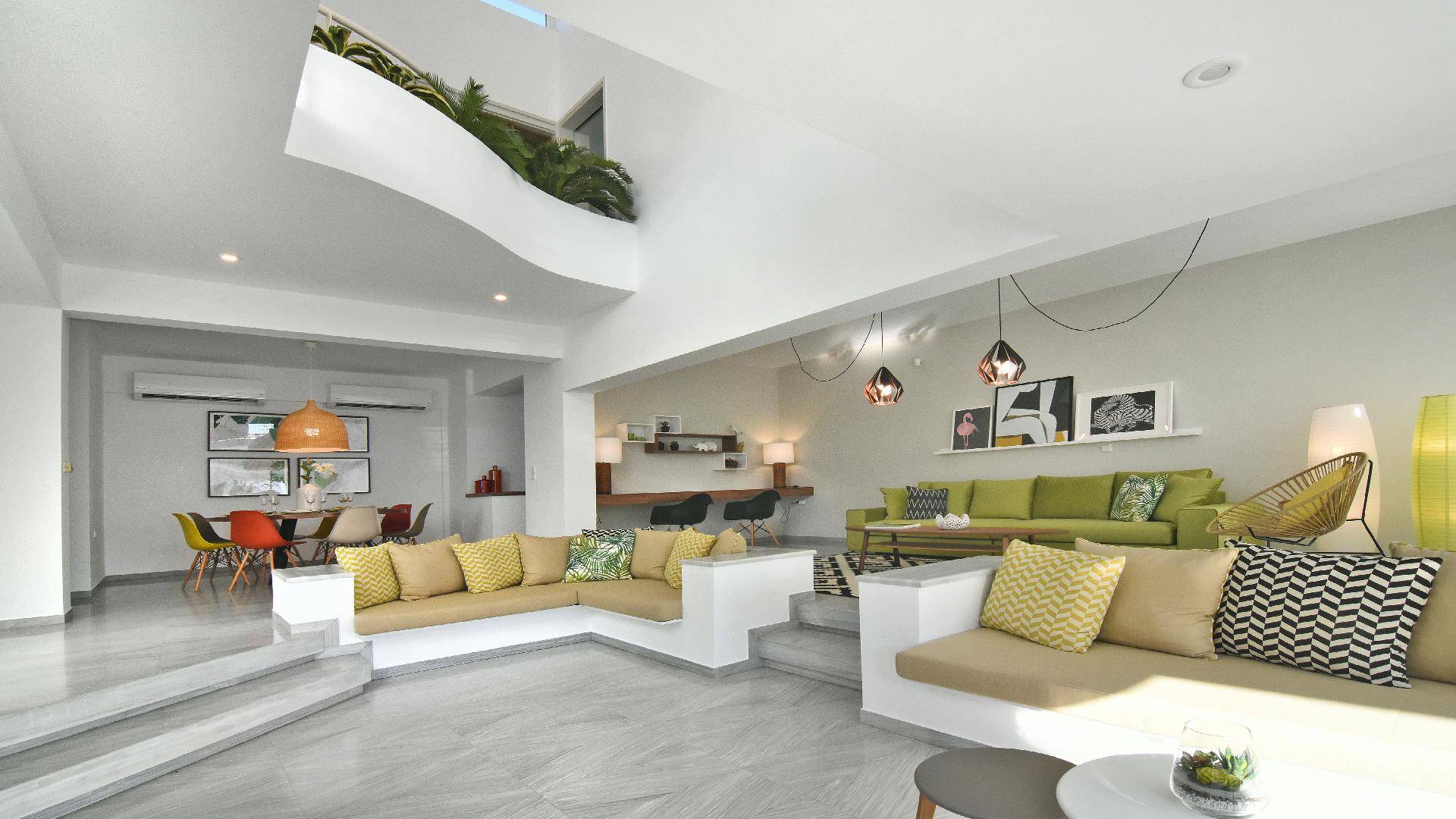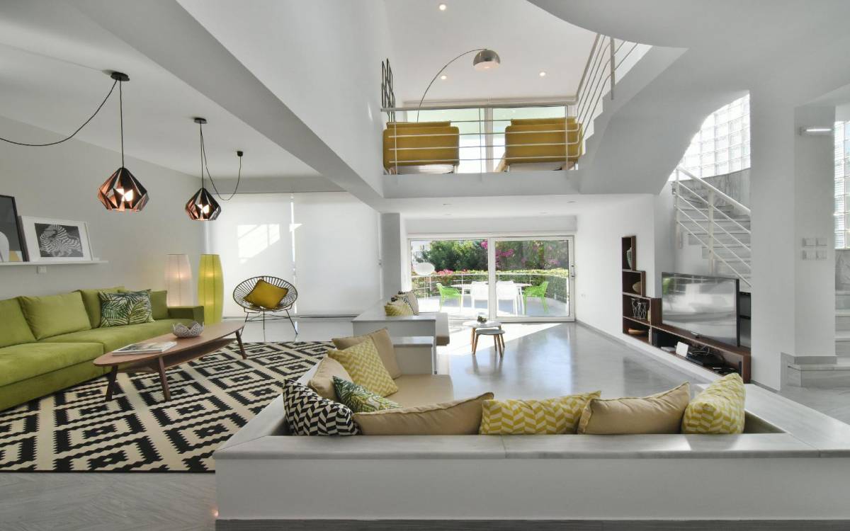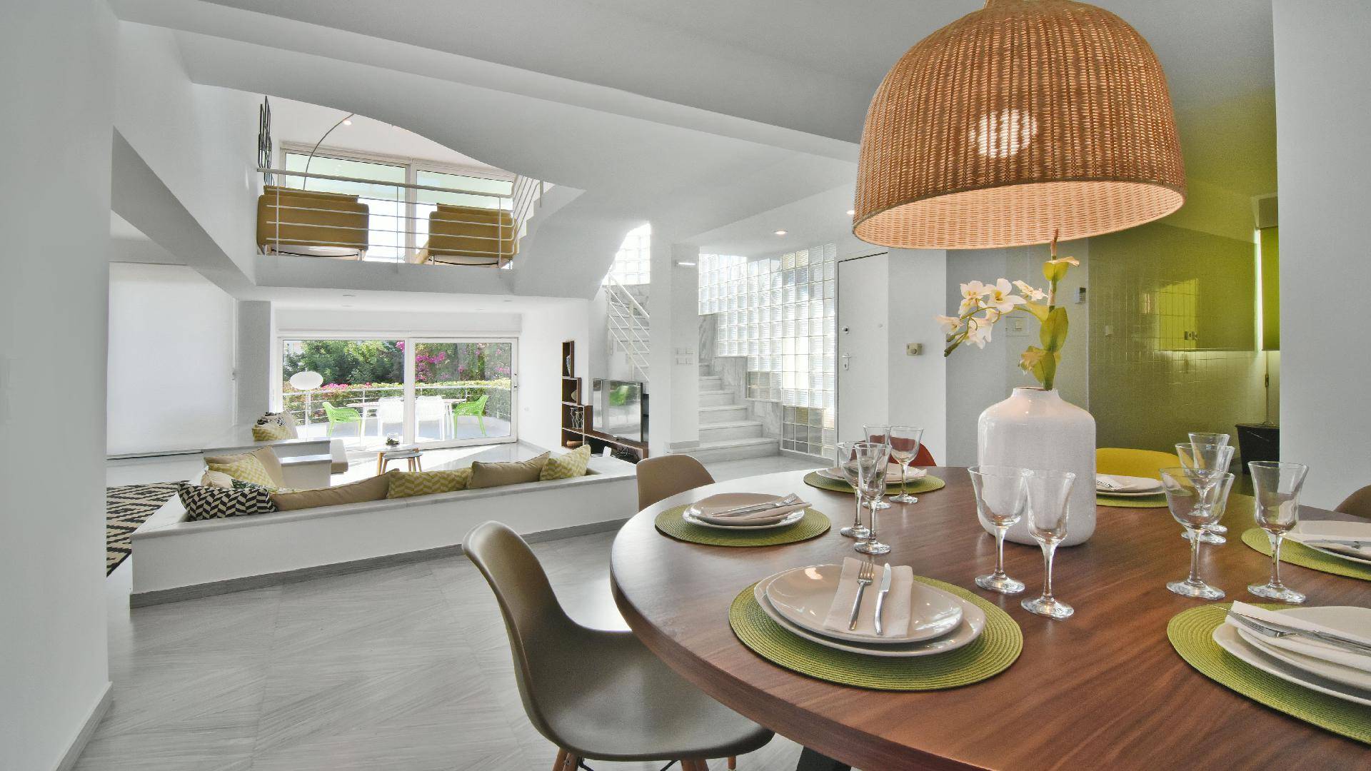 Coconut Villa is a luxury villa in Athens of 300sqm built in three levels and can accommodate up to eight guests. The architecture lines are simple, strict and manage to create an overall feeling of modern elegance. The light-colored walls blend harmoniously with the unique pieces of furniture, the wooden surfaces, and the various colorful decorating details.