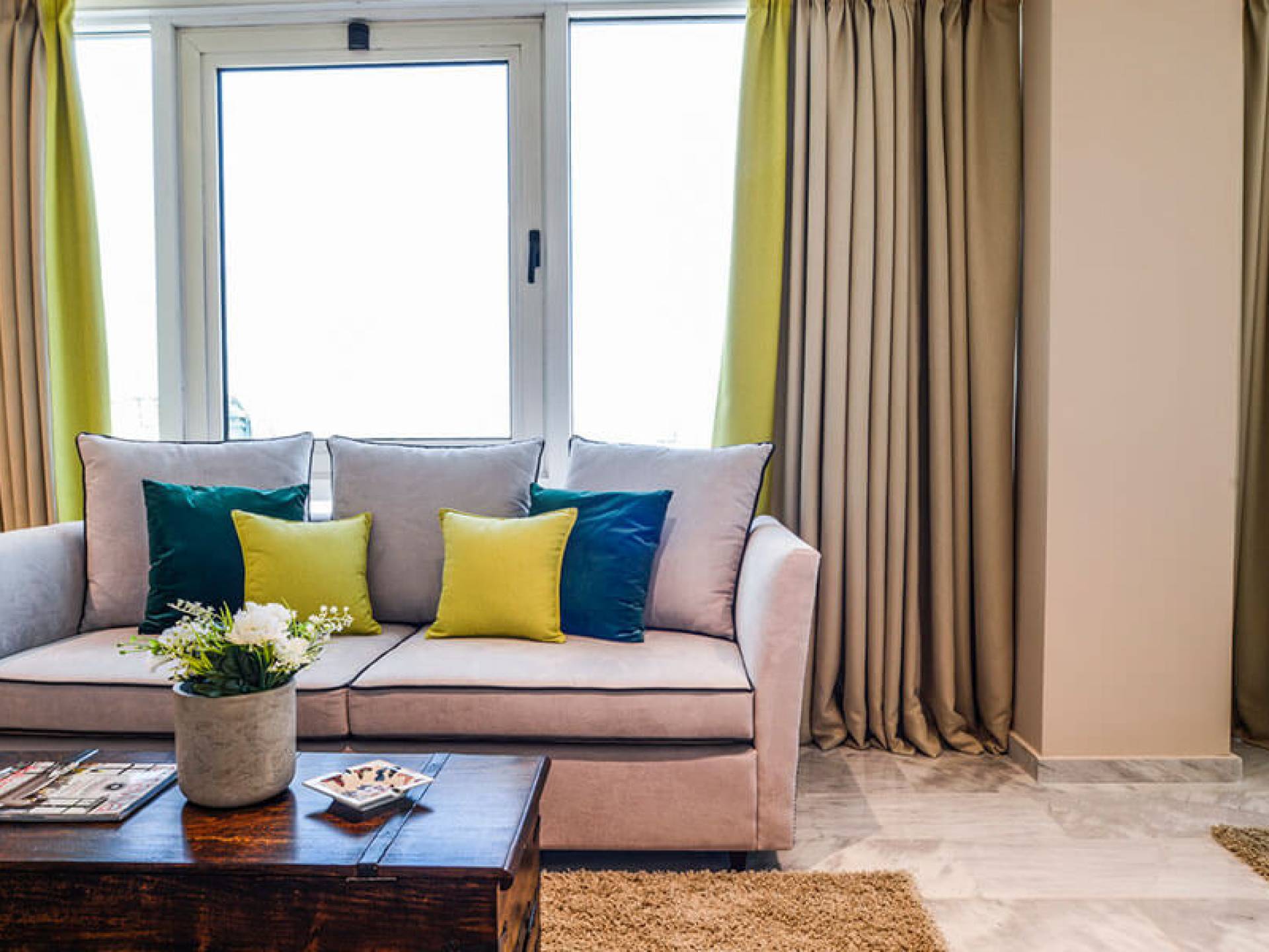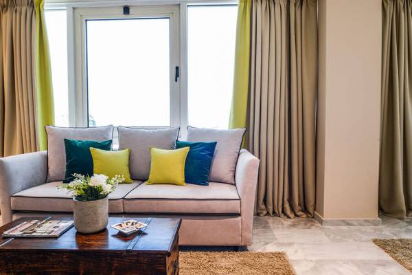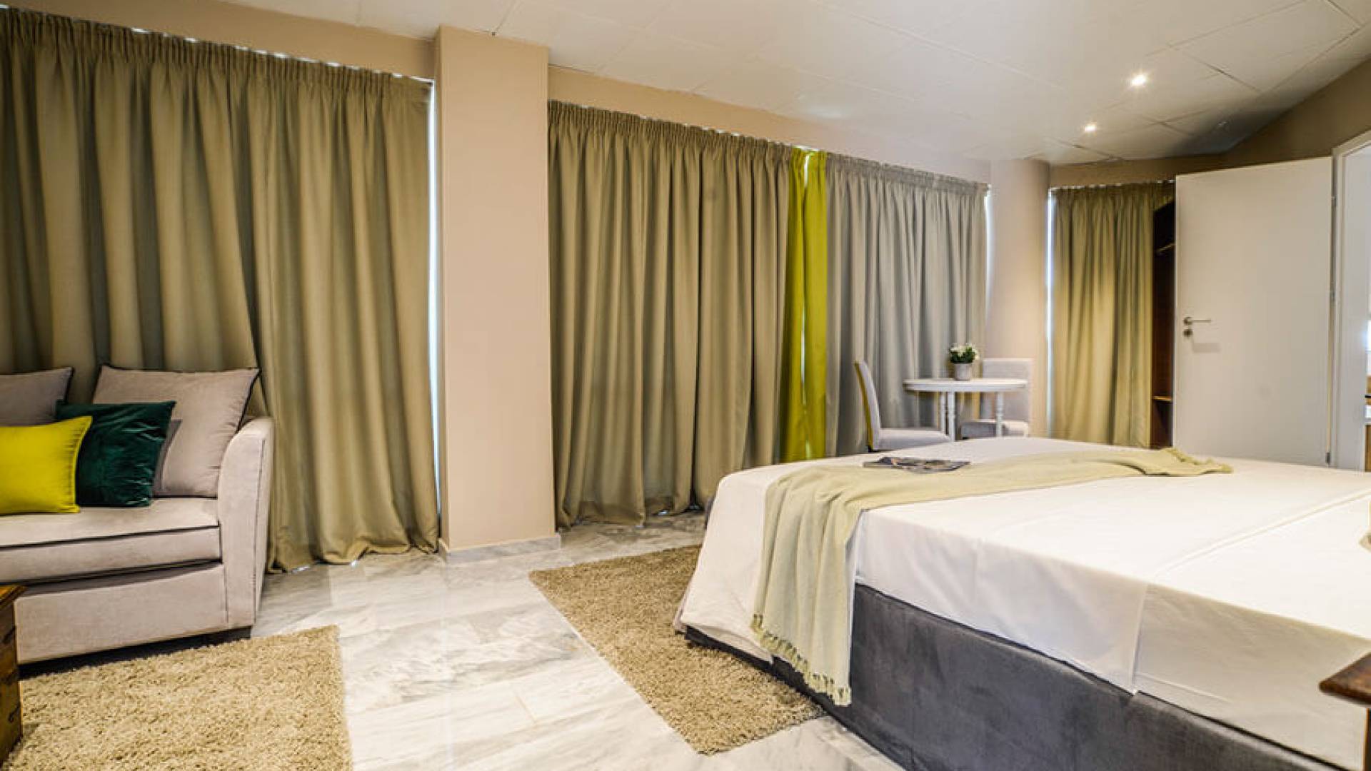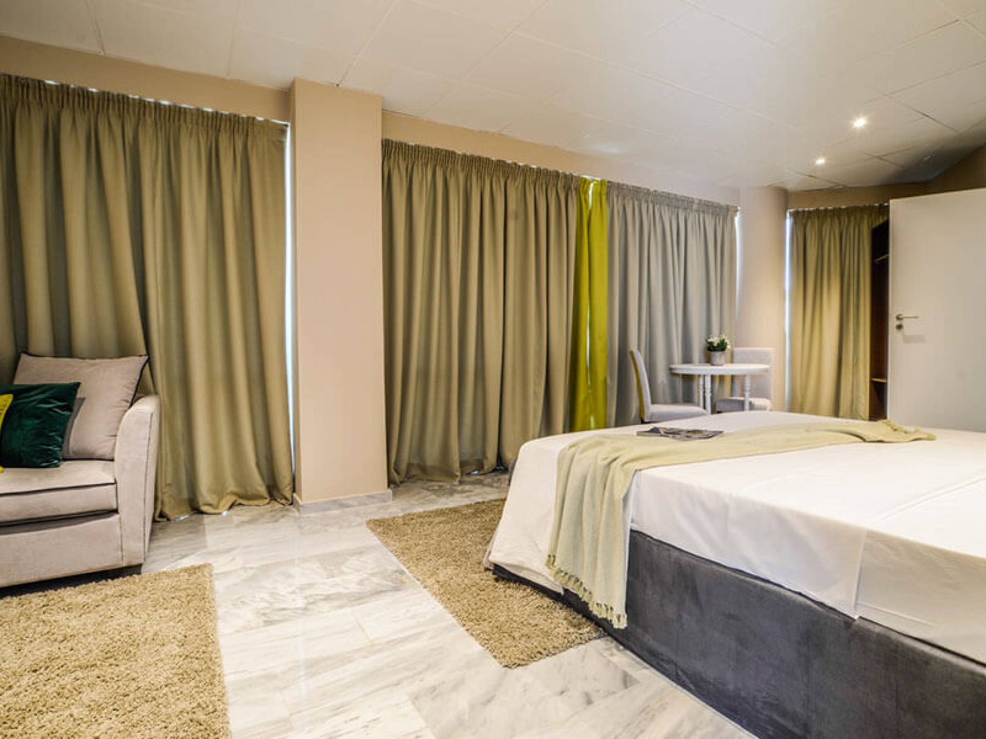 Unique luxury apartments, each individually designed provide visitors home with privacy and quiet surroundings. Your true home away from home during your stay, with peace of mind regarding linen cleaning, housekeeping, utilities such as internet, satellite tv, washing facilities. Our unique Luxury Apartments have a separate living room with beautifully designed furniture, a dining area with a TV, and a fully equipped kitchen. They are spacious and light with a king-size bed or single beds. In the building, you will find independent laundry including a washing machine and a tumble dryer. (Current Room Size: 46 sqm).