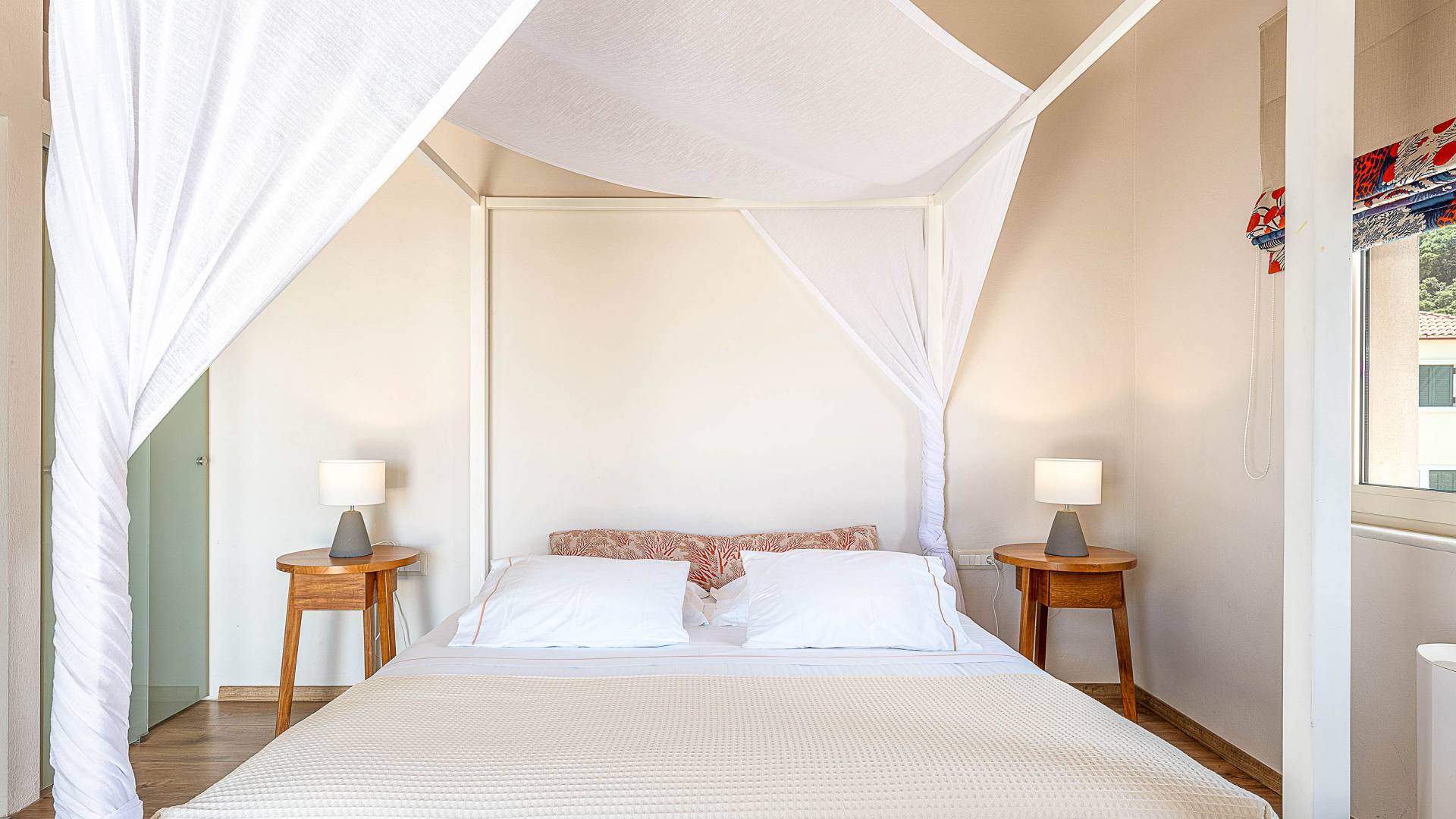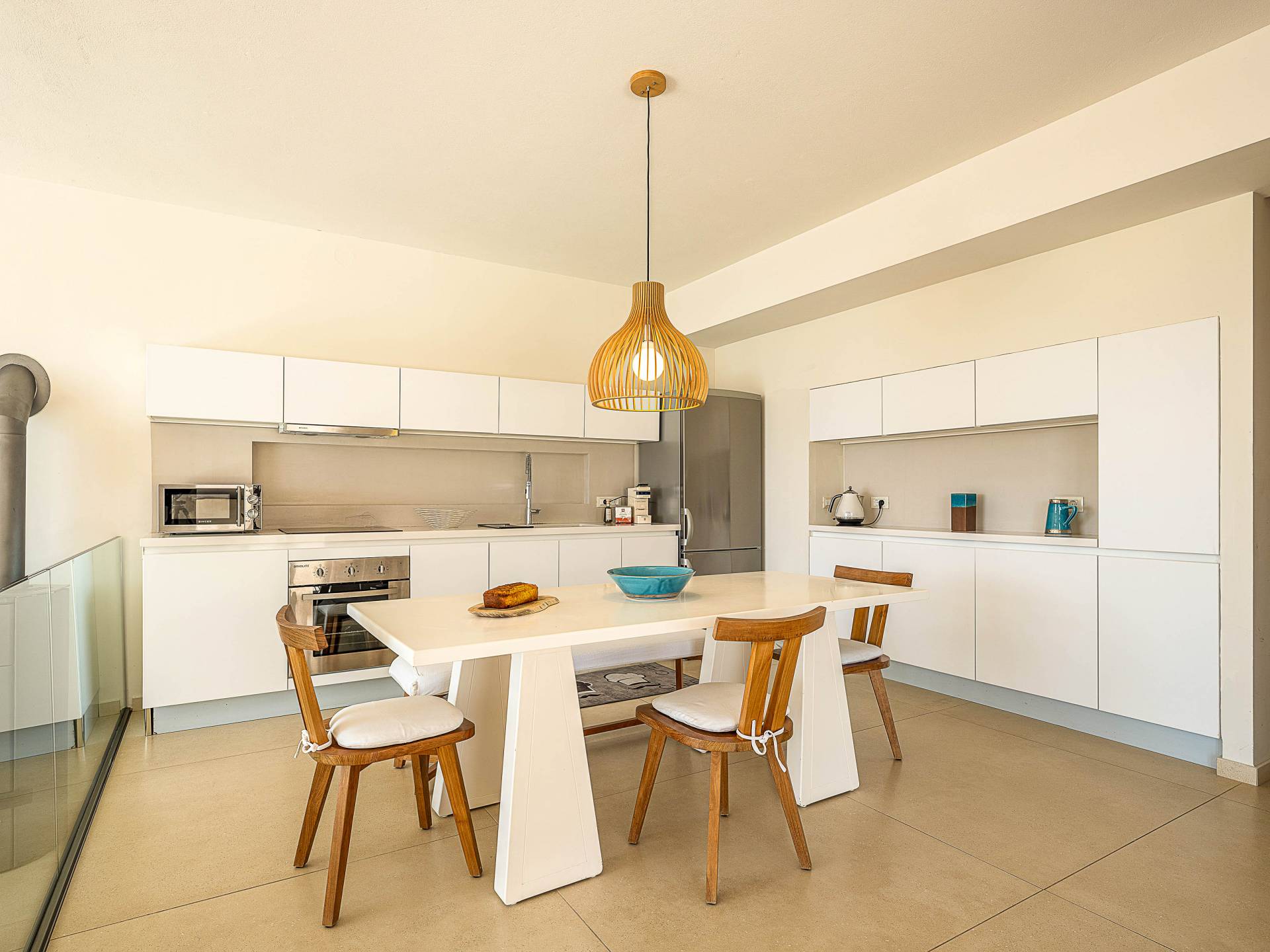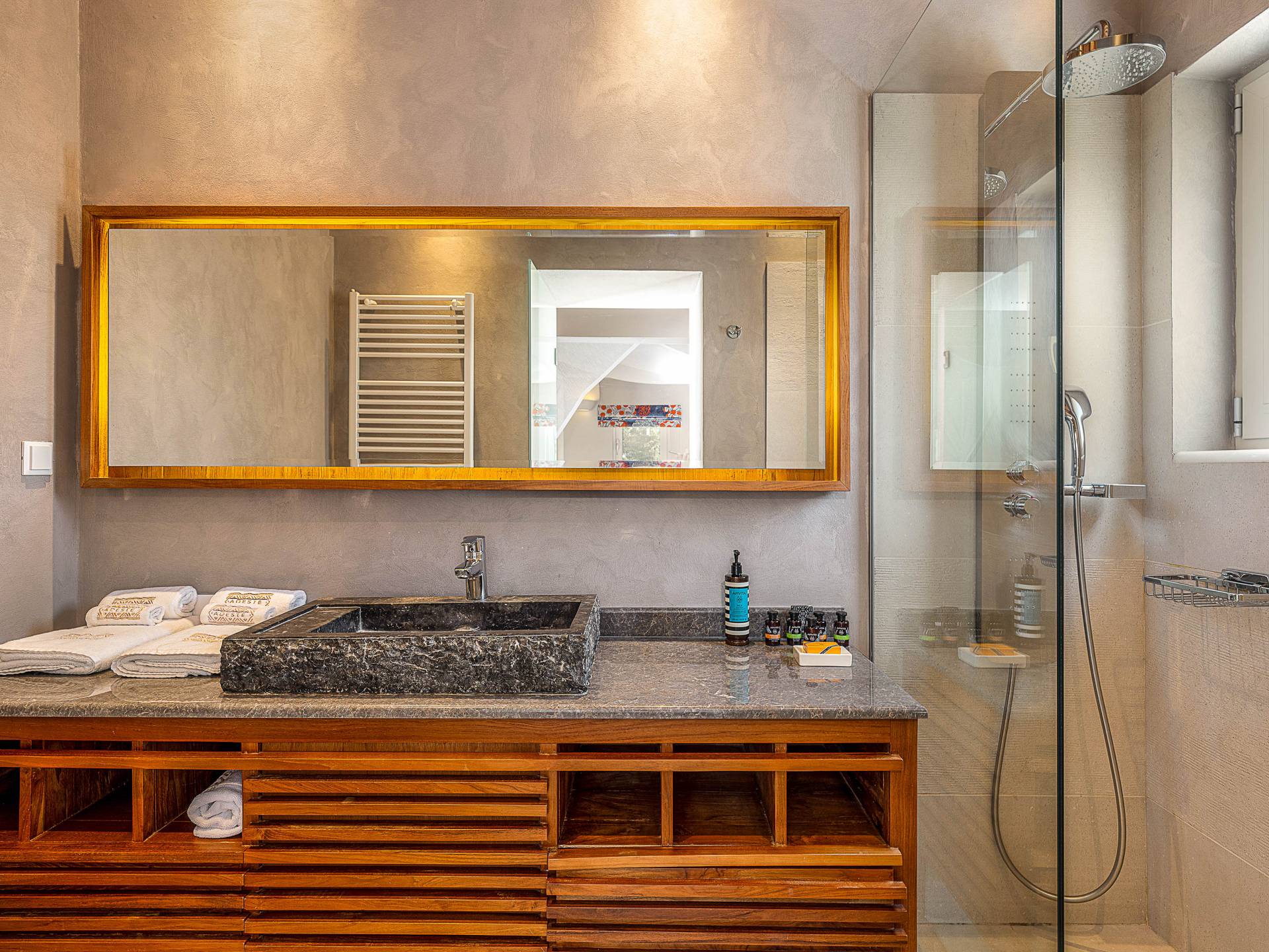 On the ground floor, there is an open-plan living room, an energy fireplace, satellite LED TV and Apple TV, Docking station, linen sofa. Large window doors open onto a shaded lounge terrace with direct access to the pool area, a fully-equipped modern kitchen and dining area, a laundry room (washer/dryer and iron/iron board). Last but not least there is a private balcony with a sea and garden view.