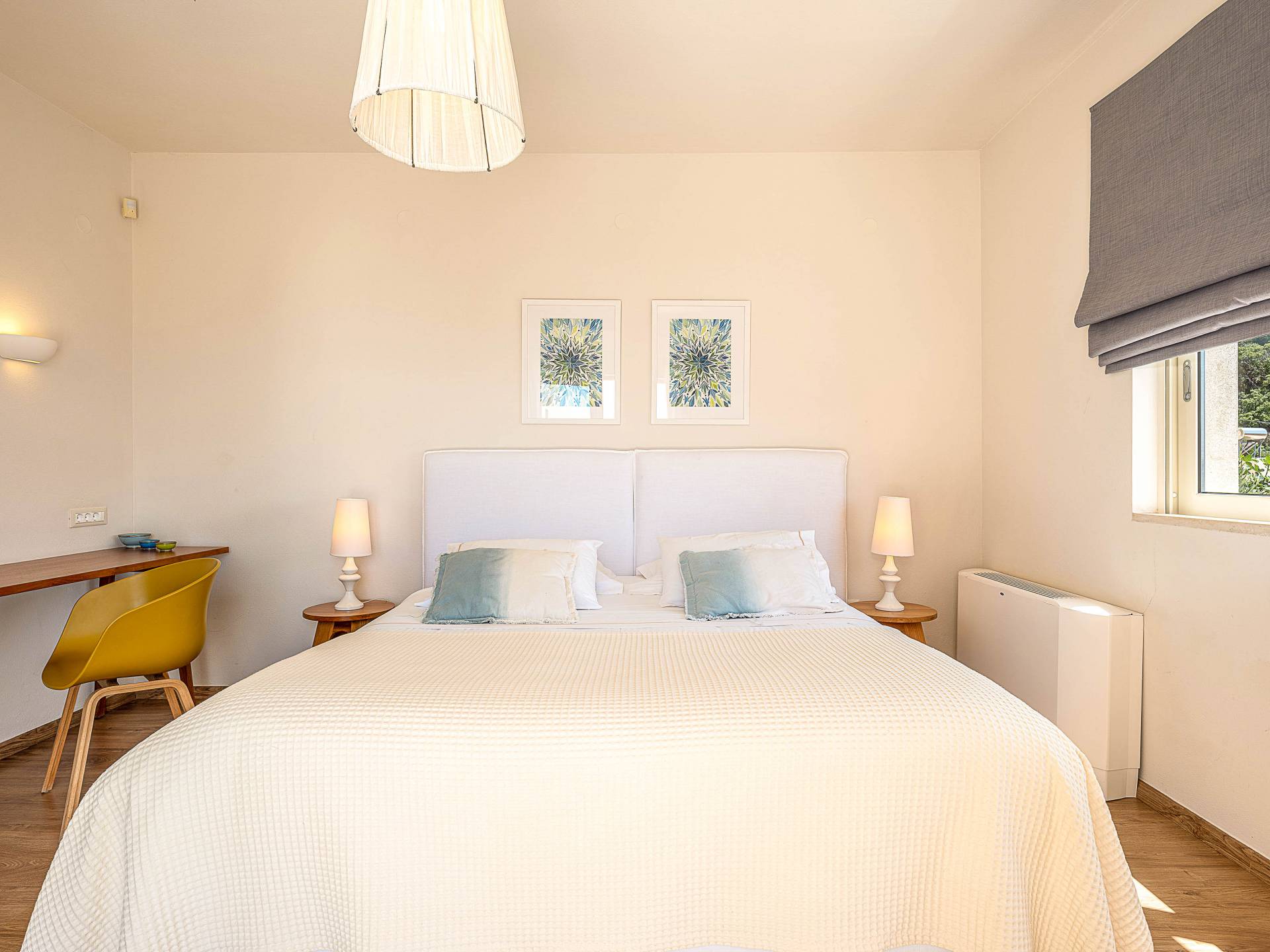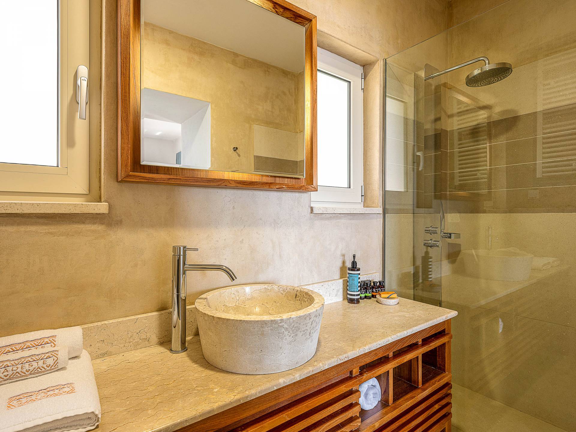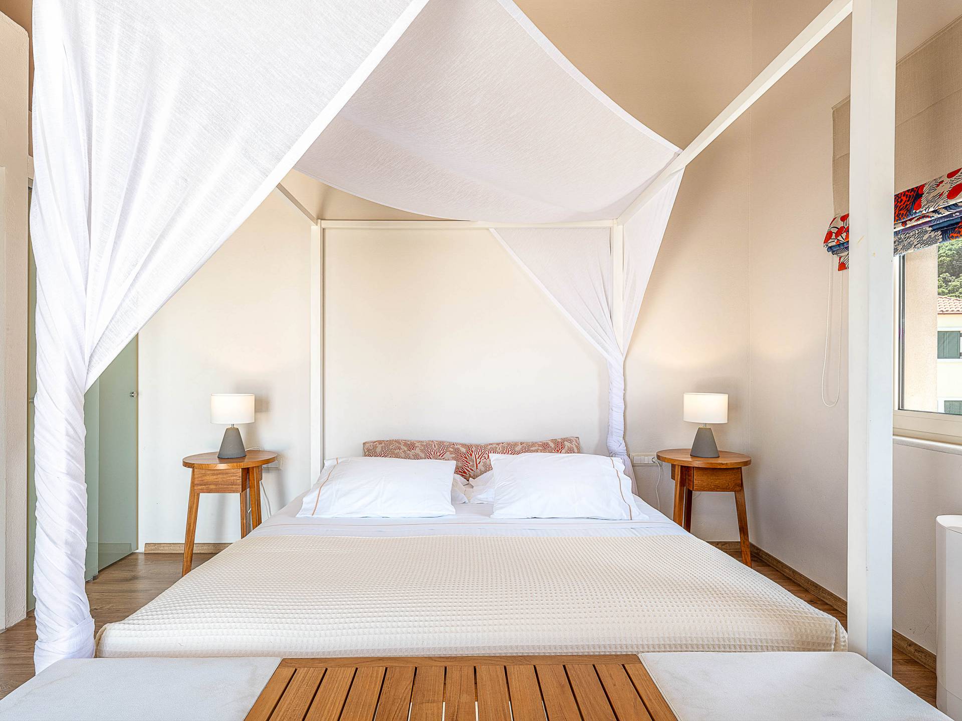 On the ground floor, there is an open-plan living room, an energy fireplace, satellite LED TV and Apple TV, Docking station, linen sofa. Large window doors open onto a shaded lounge terrace with direct access to the pool area, a fully-equipped modern kitchen and dining area, a laundry room (washer/dryer and iron/iron board). Last but not least there is a private balcony with a sea and garden view.