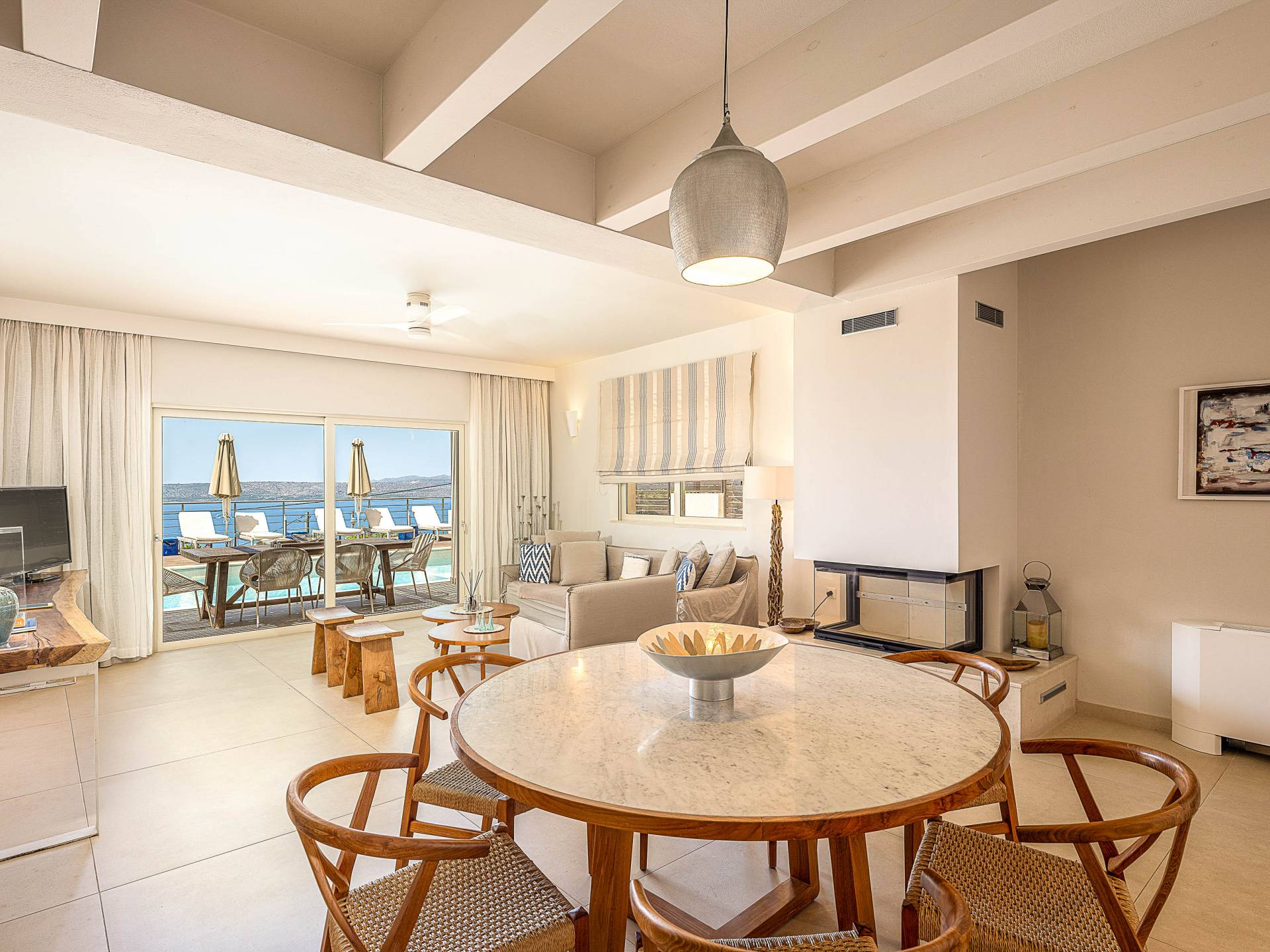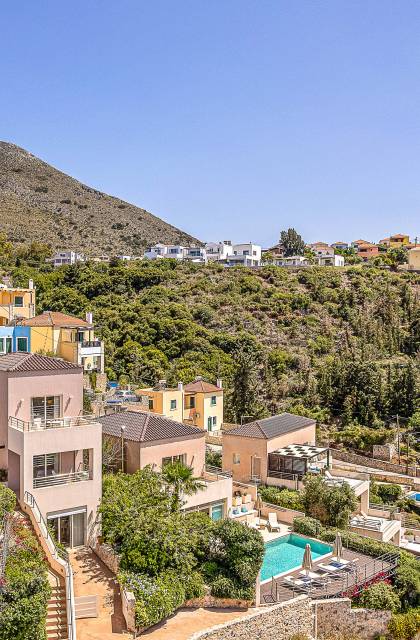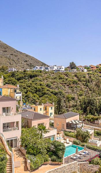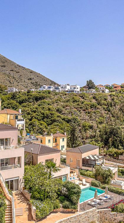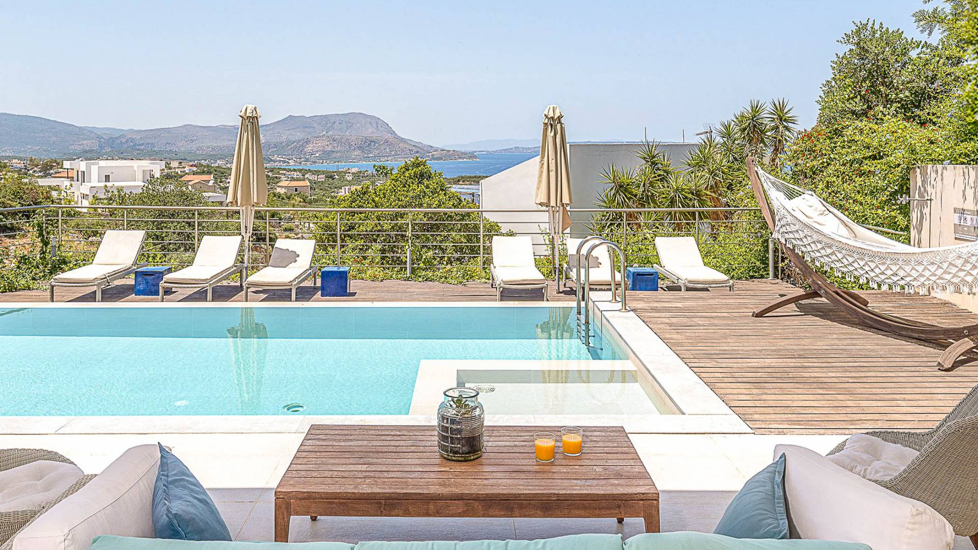 On the ground level there is a living room with fully-equipped kitchen & dining area (seats 6-8), one bedroom with 1.60m bed and en-suite bathroom with shower and a guest bathroom On the first floor there is one master bedroom with 1.80m canopy bed and en-suite bathroom, a large terrace with sun loungers and panoramic view, one large bedroom with twin beds (convertible into a king) and en-suite bathroom and a private balcony with sitting set and sea/mountain views. On the upper floor there is one master bedroom with 1.80 canopy bed and en-suite bathroom room, large window doors open to private balcony with sitting set, a large terrace with pergola and outdoor hot tub/jacuzzi. Outdoors there is a large pool with children’s area, sunloungers, umbrellas, hammock a dining / sitting area and a state-of-the-art gas grill.