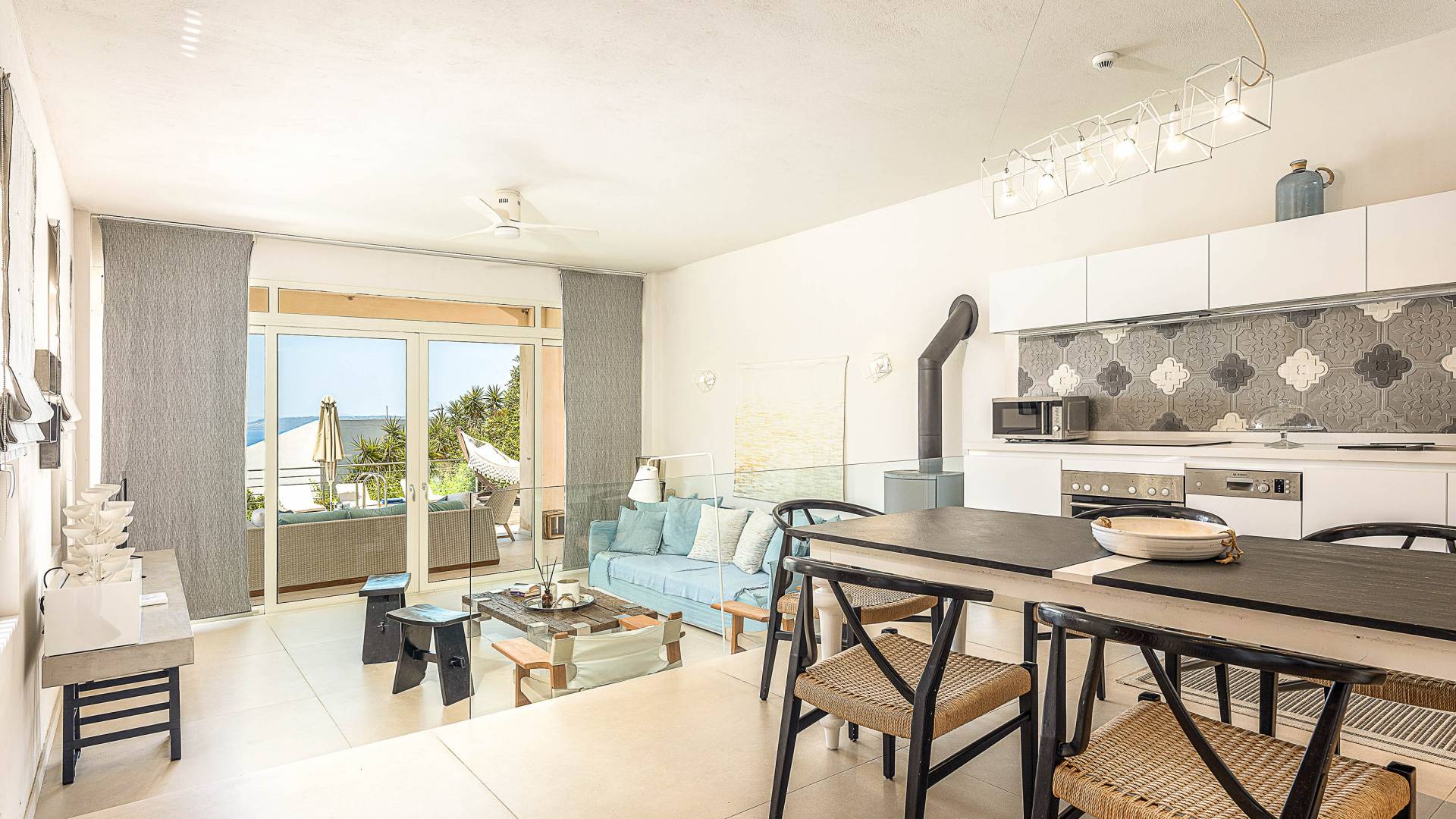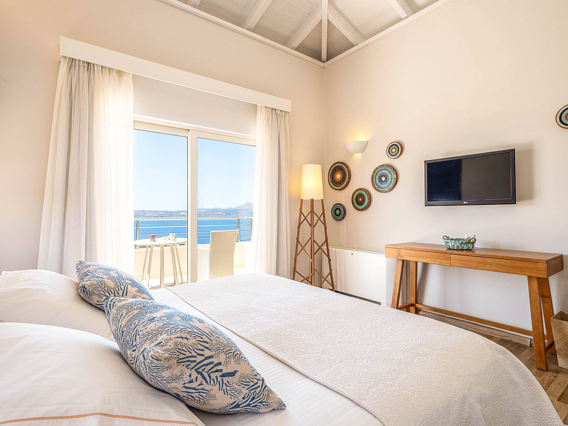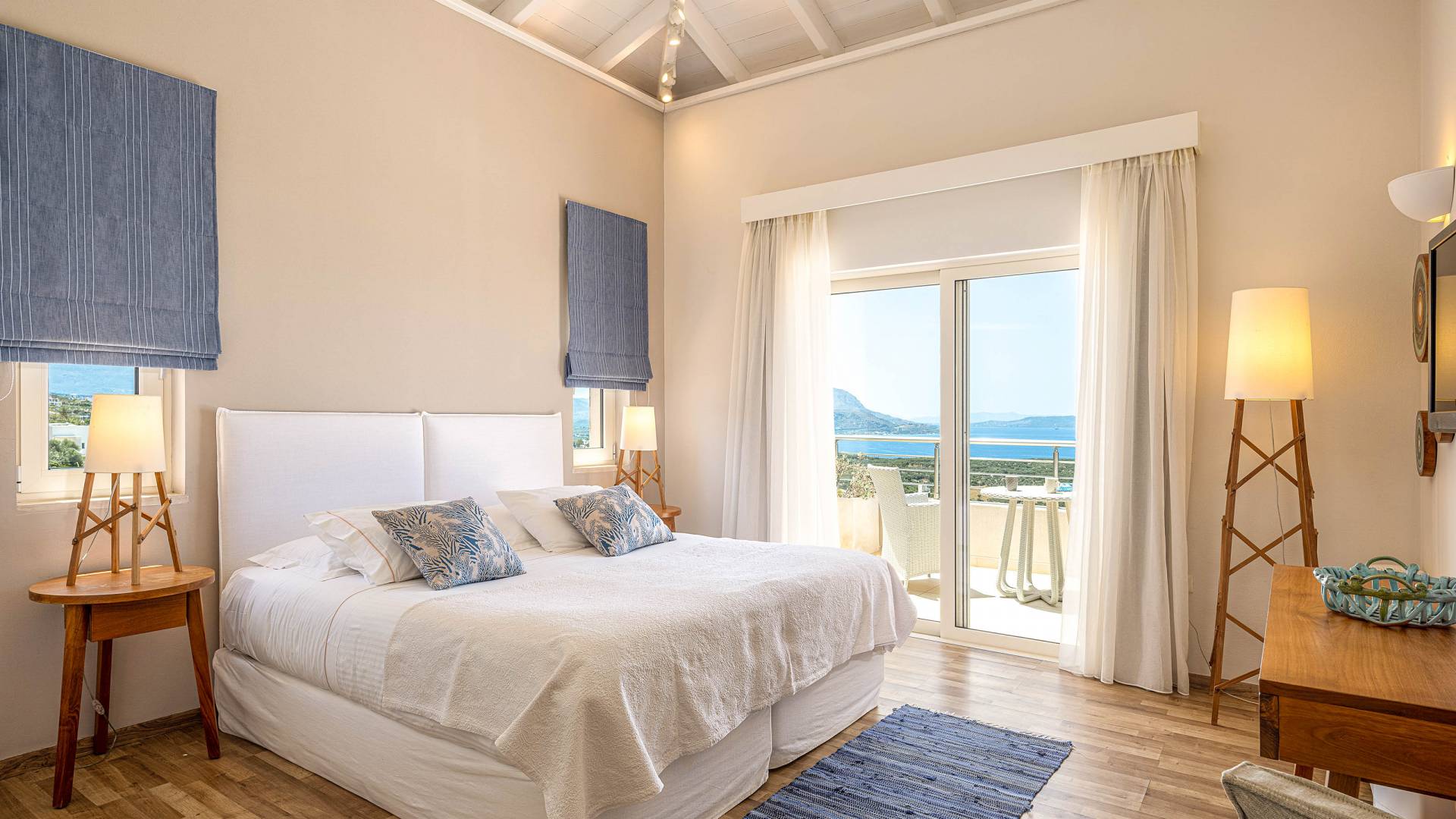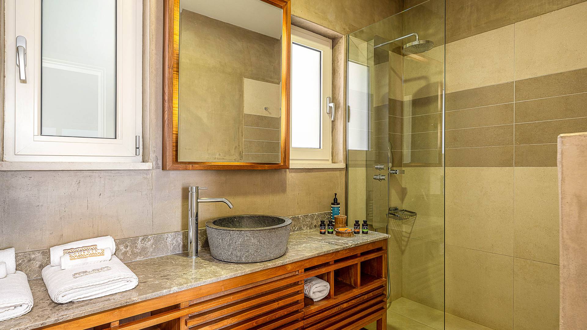 On the first floor there is a second bedroom with 180cm canopy bed and en-suite bathroom with rain shower, a large terrace with sun loungers, sofa and panoramic views and a third bedroom with twin beds (convertible into a King) and en-suite bathroom with bath. You have access to a private balcony with a sitting set and a wonderful sea view
