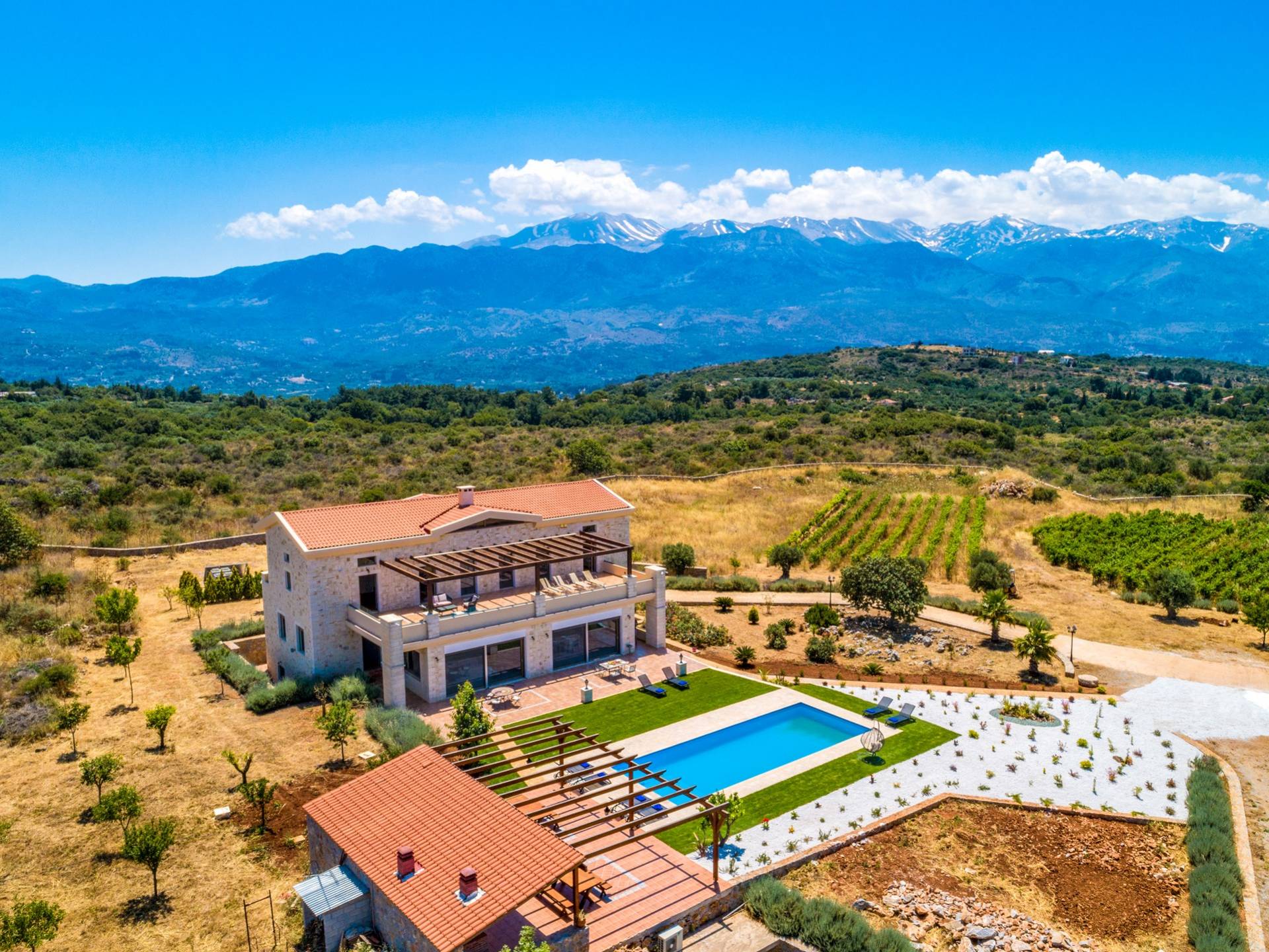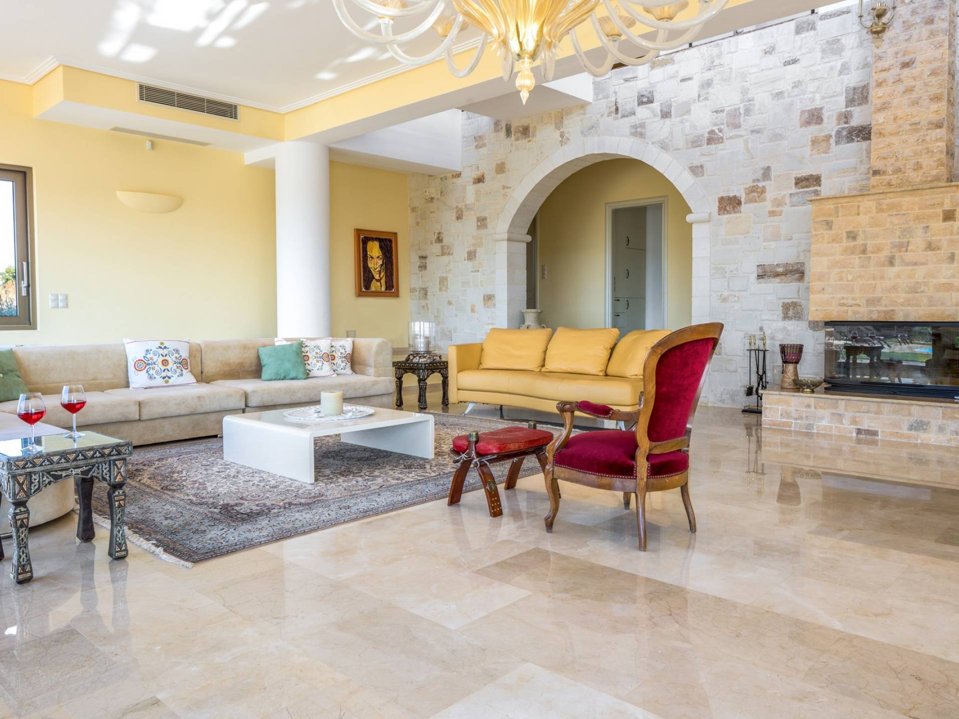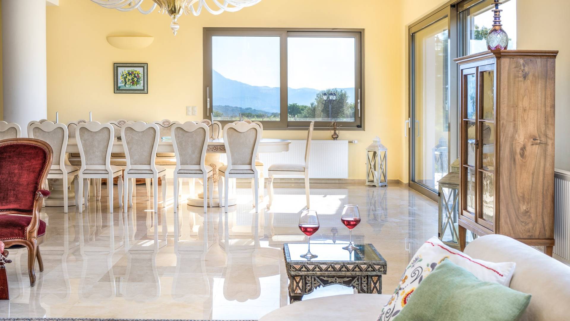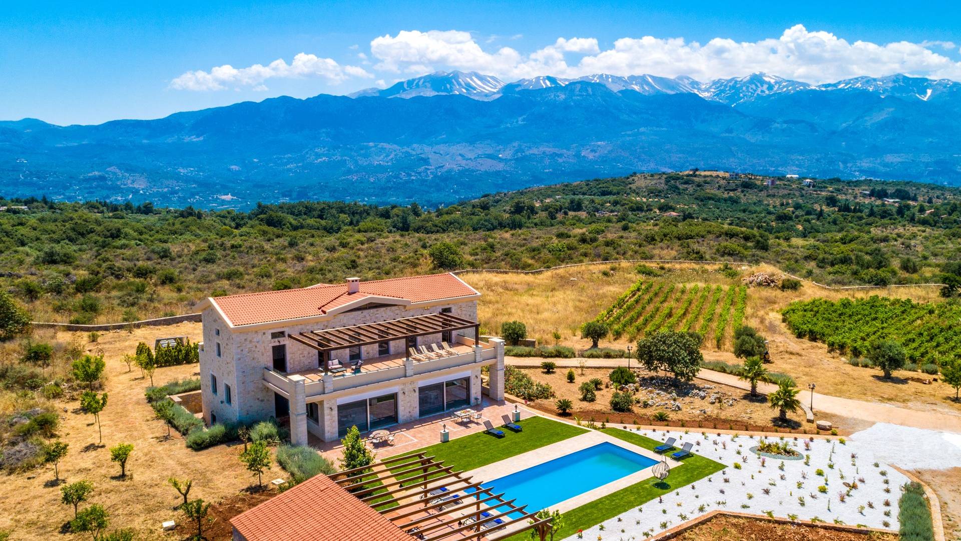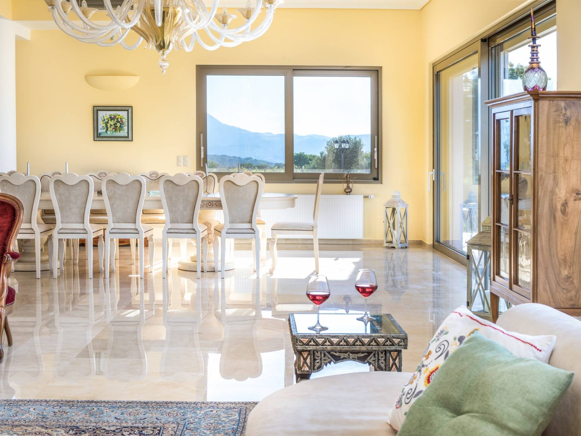 Surrounded by lush olive groves and multi varieties of vineyards, Villa Aphrodite sits dominant, elegant, and spacious at the center of a large, well-maintained land brimming with fragrant rosemary and lavender, providing complete tranquility and privacy in the heart of a truly Mediterranean landscape. Built to comply with the standards of bioclimatic architecture in its functioning, its design, layout, and decor were an inspiration to its owners so that the home would harmoniously blend in with its natural surroundings.