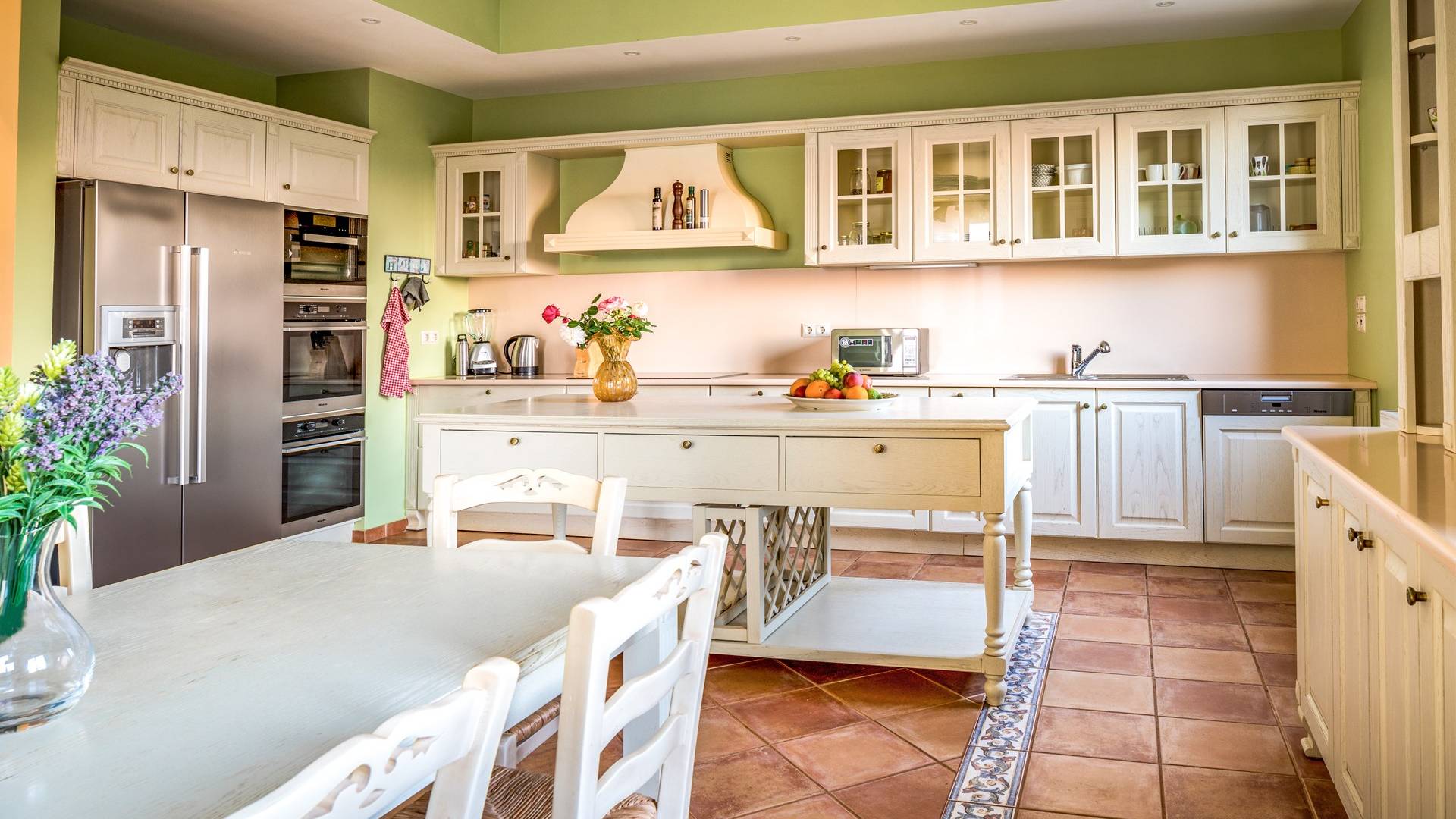 At the entry hall, there is a large open living space with an energy-efficient fireplace, a dining space with a rustic dining table for 14 persons, a modern rustic-styled kitchen with 10 seat dining table, 2 large bedrooms, 2 room bathroom with shower and storage cabinets, direct access to the pool. On the First Floor - 2 luxurious Bedrooms with a walk-in closet each, 1 large luxurious bathroom with a bathtub and a shower cabin, an auxiliary kitchen for breakfast, a large veranda with pergola, and comfortable furniture to enjoy the magical sunsets and full moon nights.
