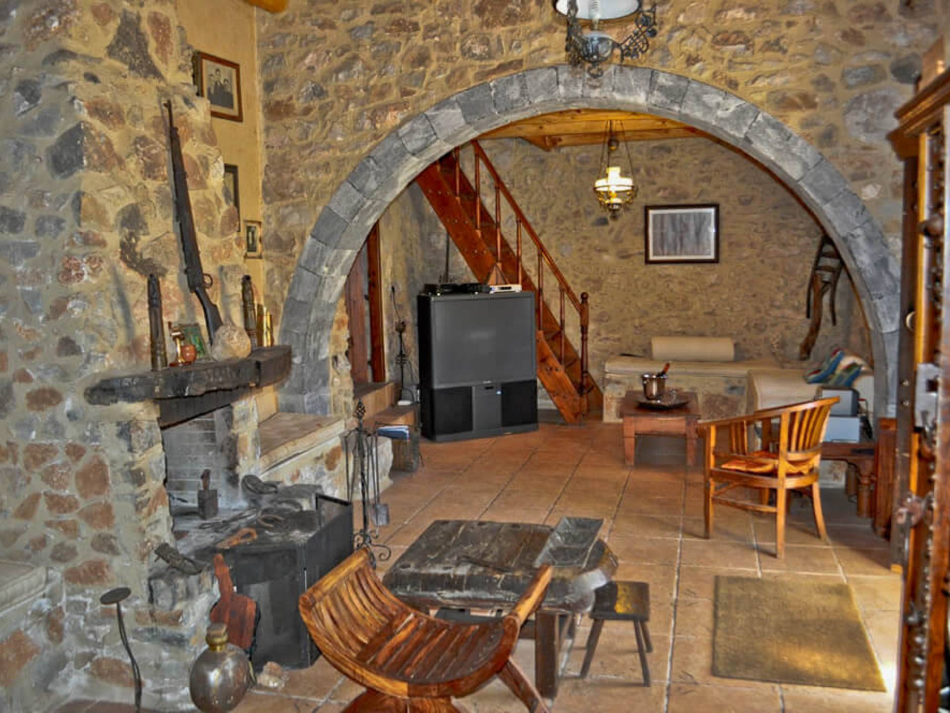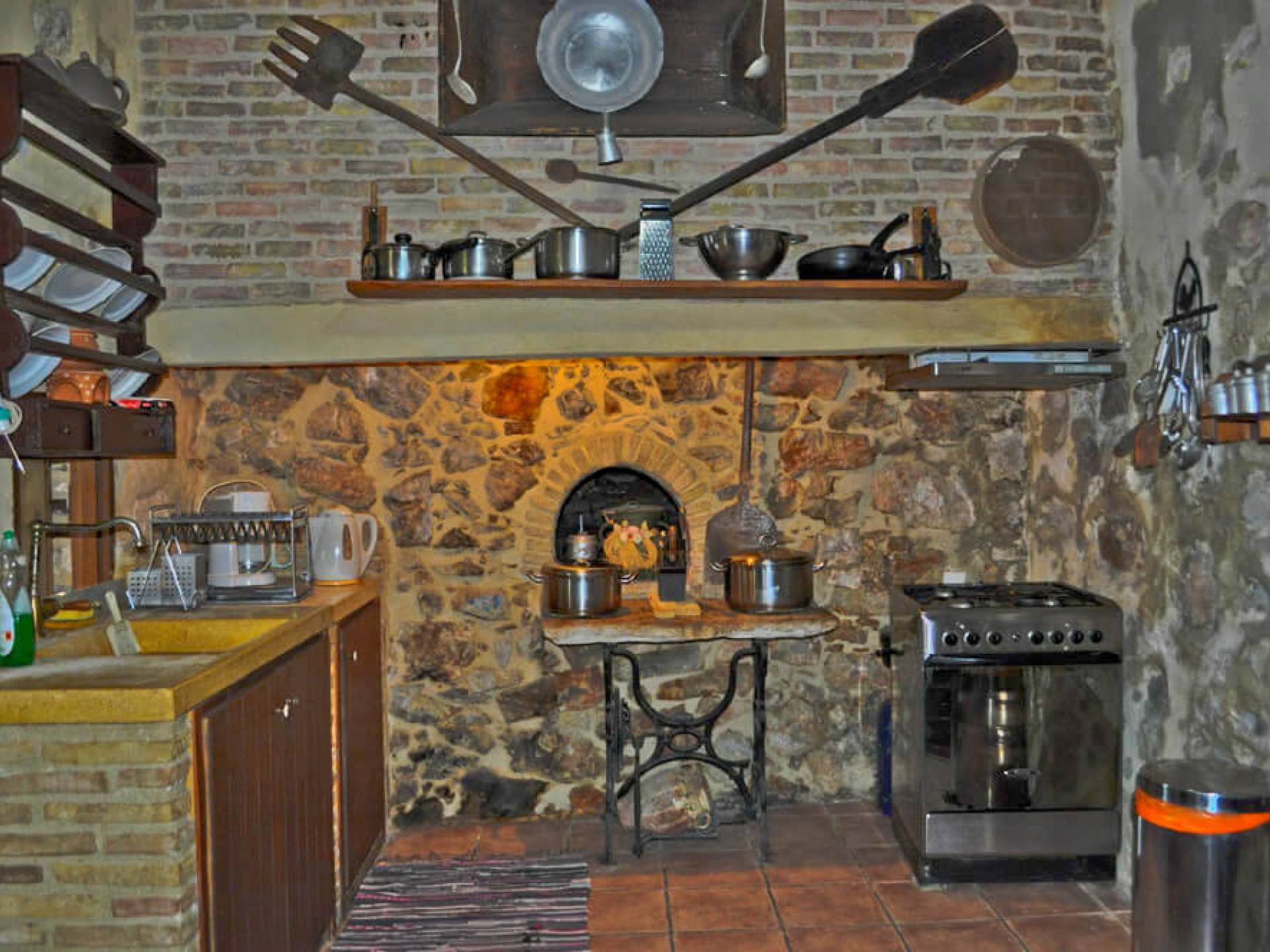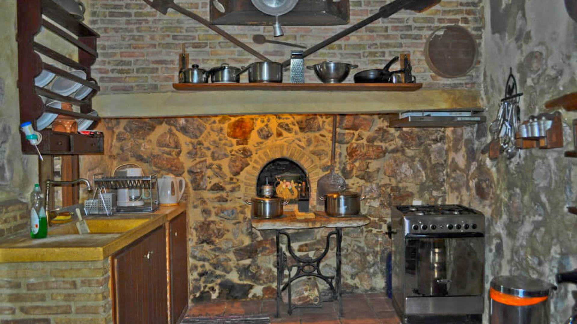 The arch is the main element of the common area, where there is a satellite TV, a HiFi and stone-built sofas. A fireplace in the middle of the room and a dining table next to it are also included. The room is connected with the kitchen, which is fully equipped with all appliances and has got a stone-built oven, too.